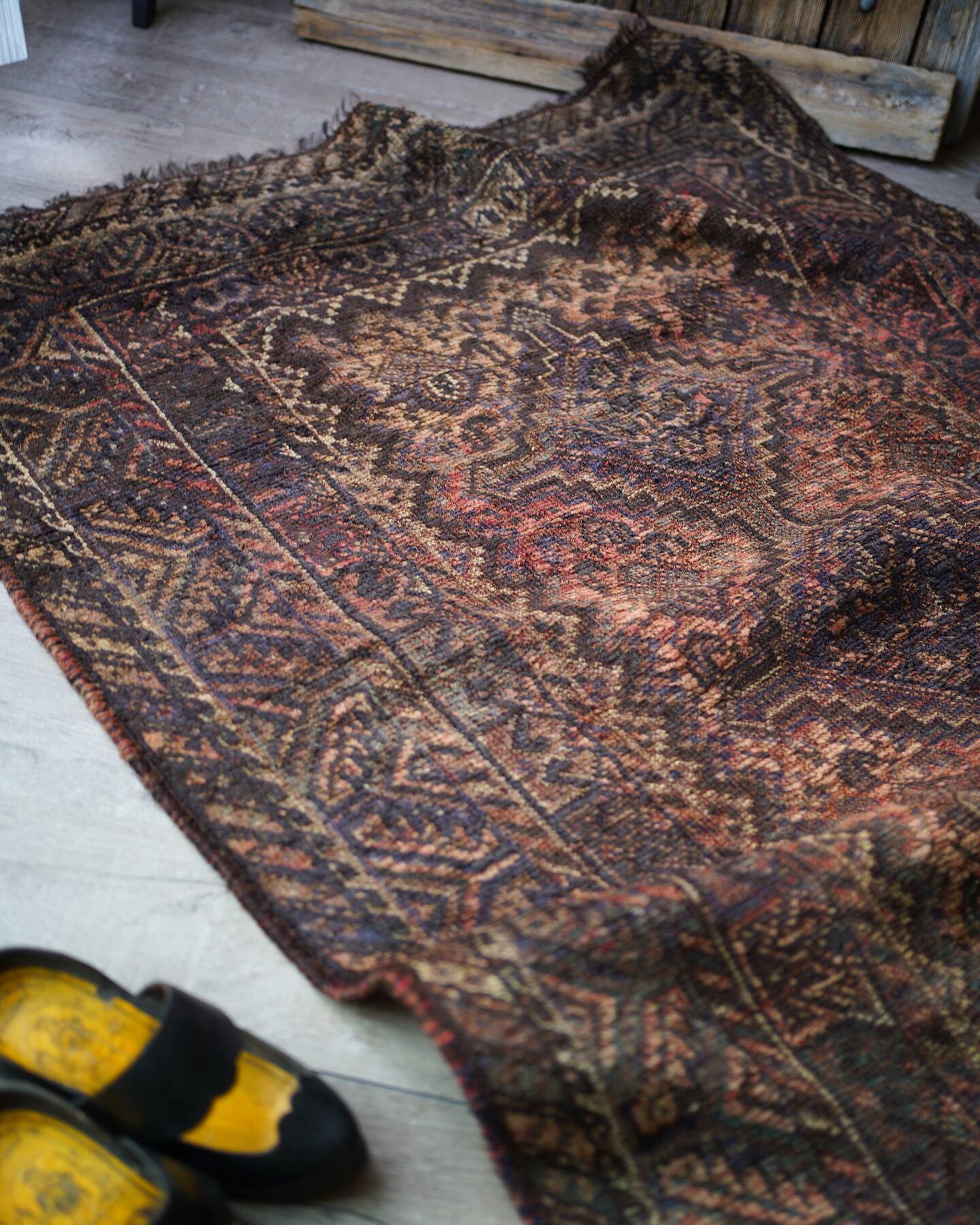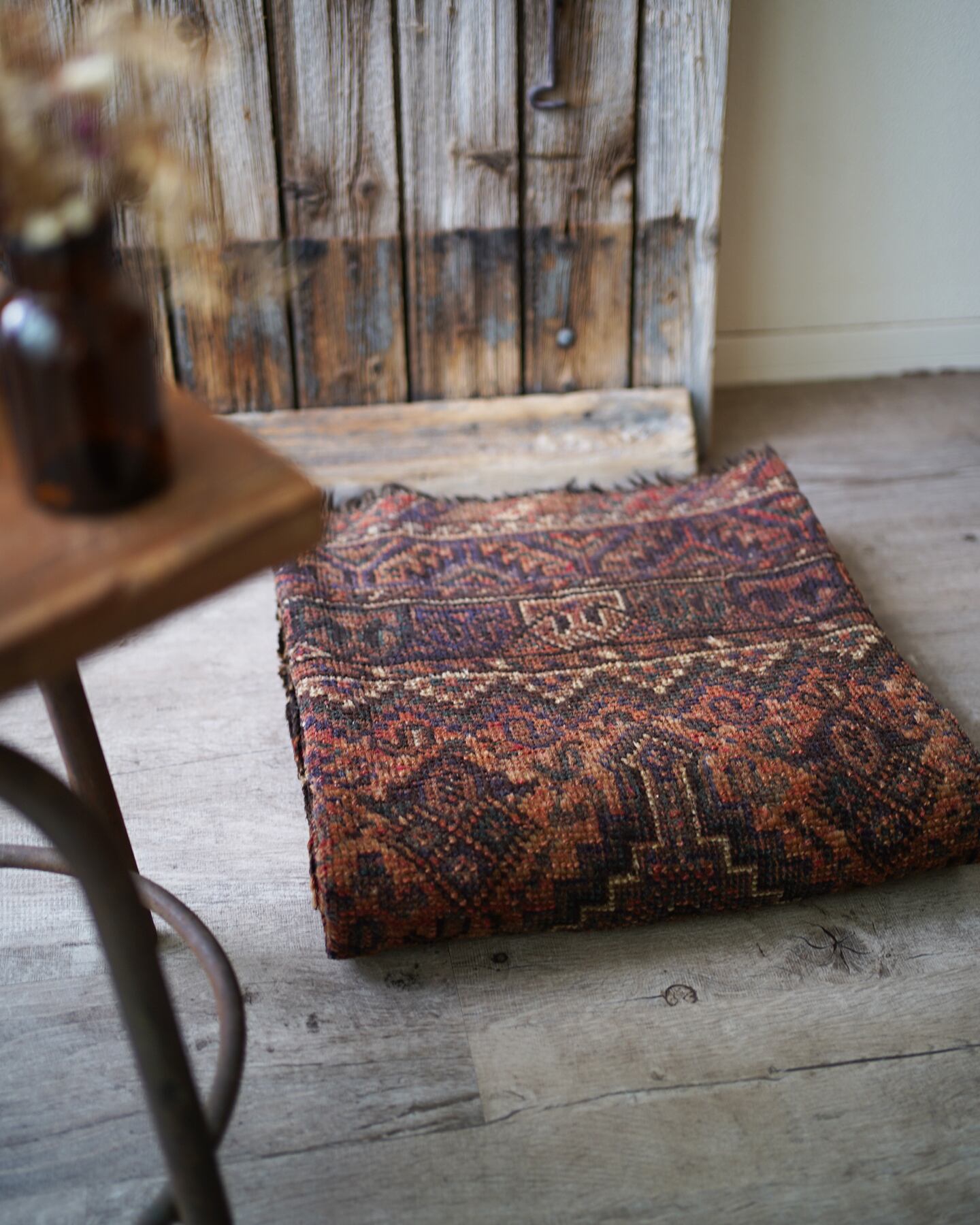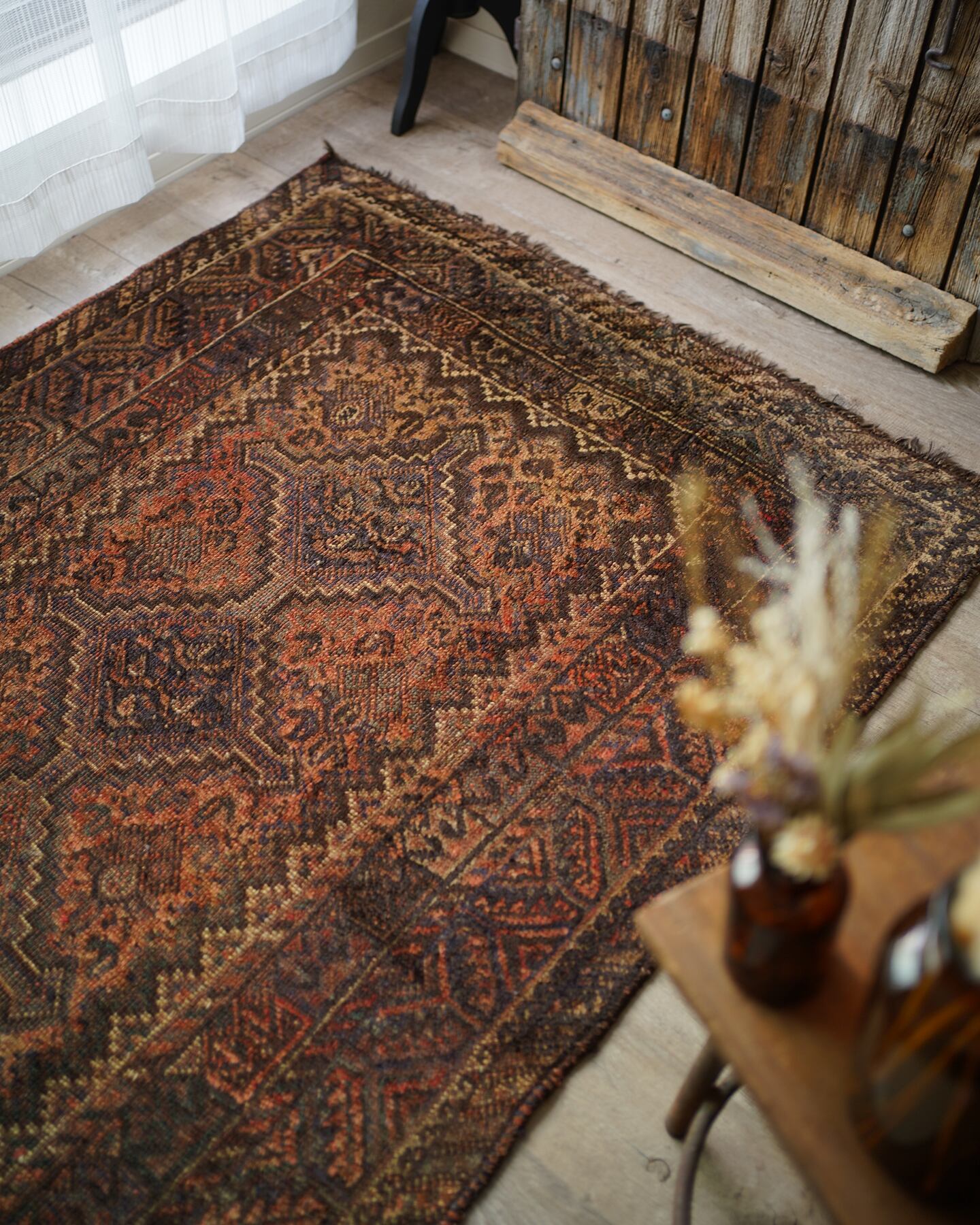 経年80年のセミアンティークのカシュガイラグ。焦茶と深いオレンジ色の色味が近く、全体的に統一感のある配色となっています。サラッとした肌触りで、7mmほどの厚みです。小さい補修跡が数カ所ありますが、目を凝らして探さないとわからないほど、綺麗に修繕されています。落ち着いた色味のラグなので、場所を問わずいろんな場所に馴染んでくれそうです♫