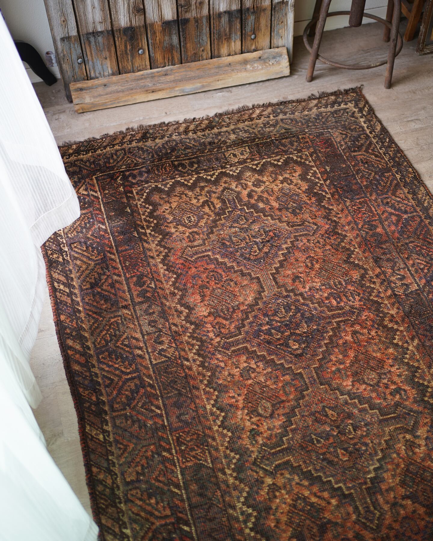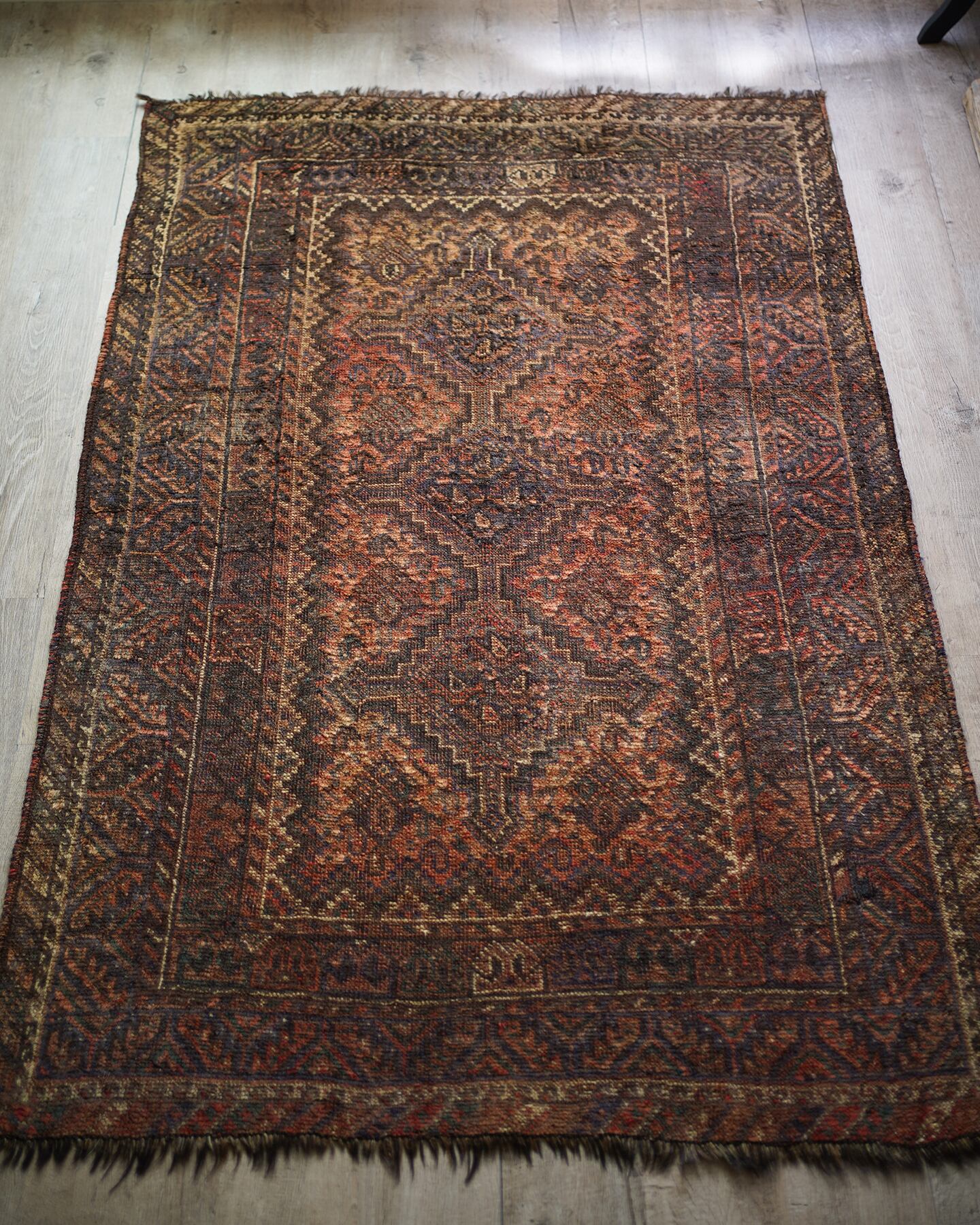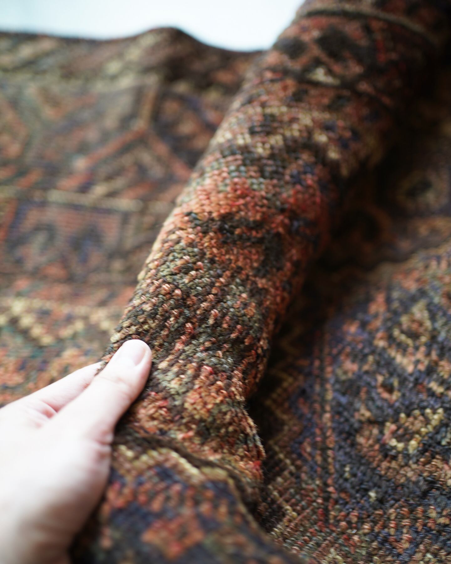経年80年のセミアンティークのカシュガイラグ。焦茶と深いオレンジ色の色味が近く、全体的に統一感のある配色となっています。サラッとした肌触りで、7mmほどの厚みです。小さい補修跡が数カ所ありますが、目を凝らして探さないとわからないほど、綺麗に修繕されています。落ち着いた色味のラグなので、場所を問わずいろんな場所に馴染んでくれそうです♫