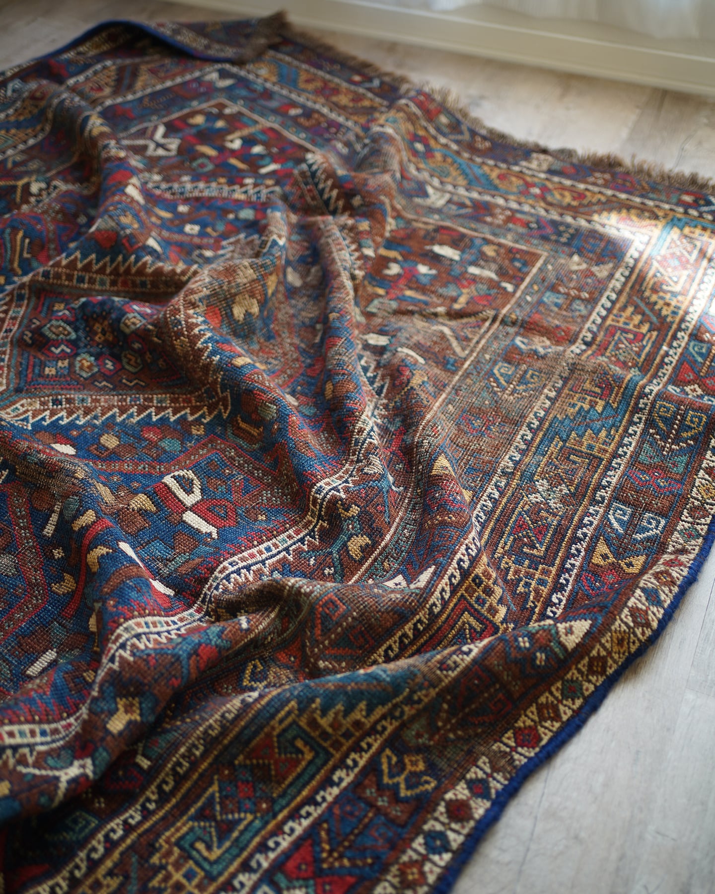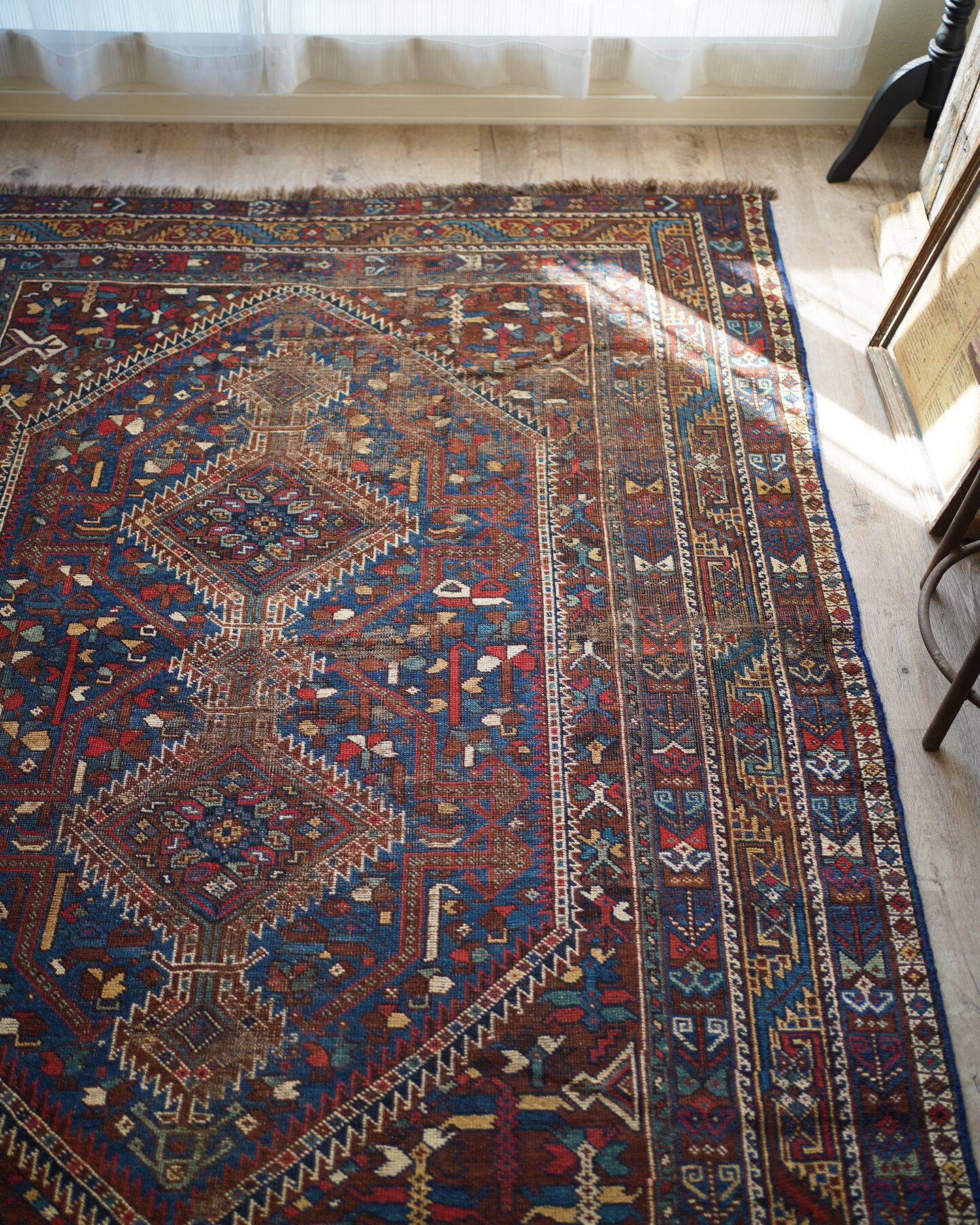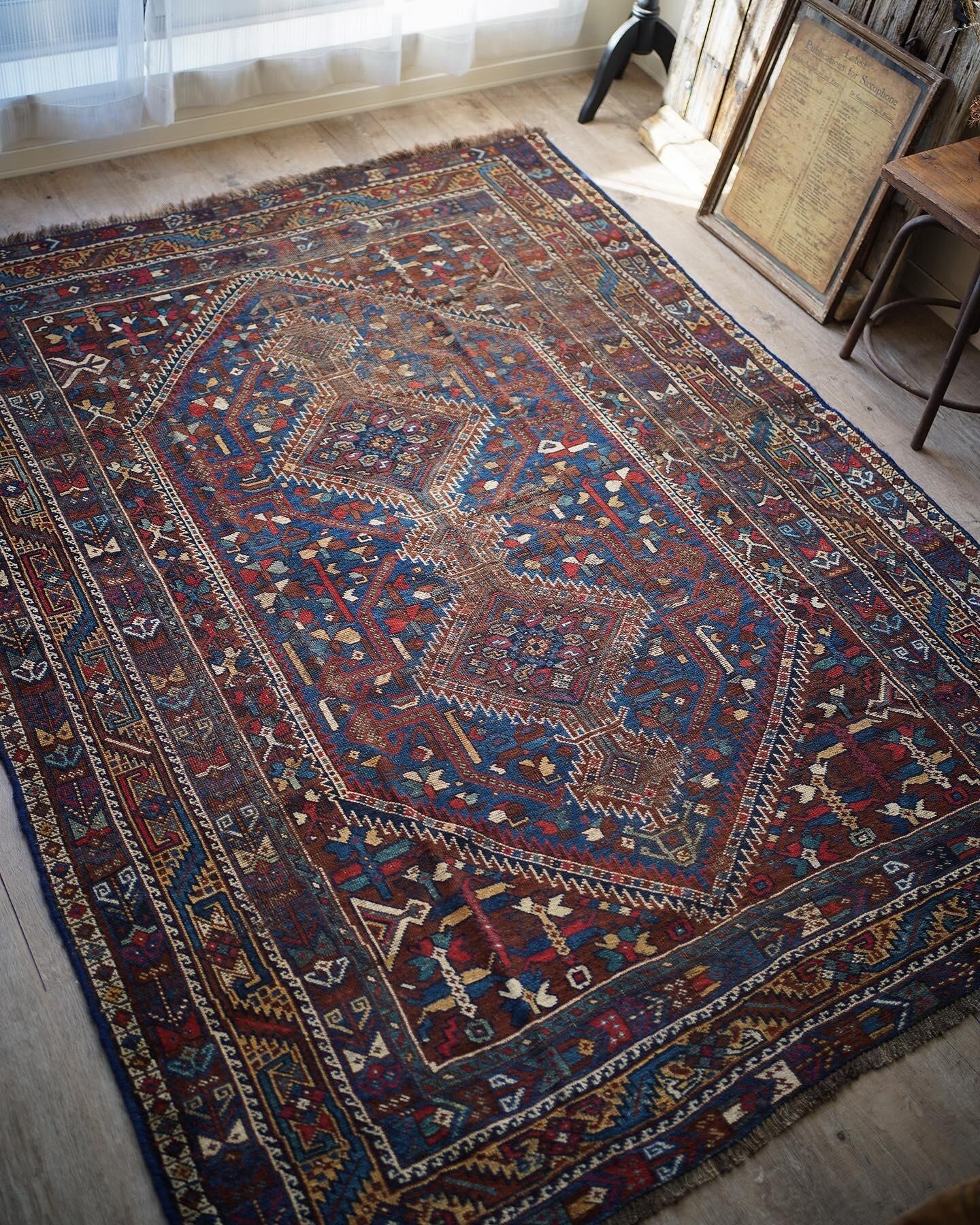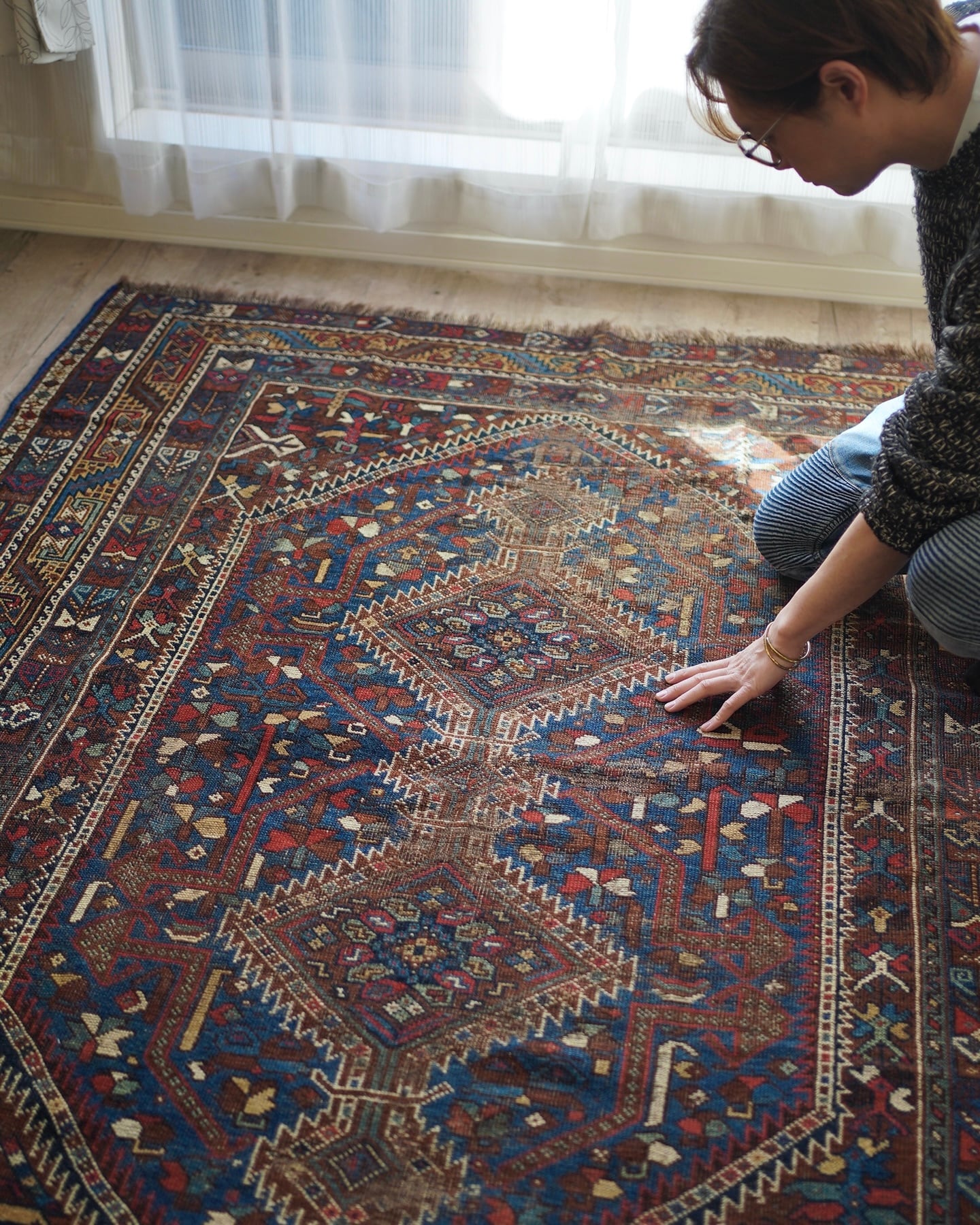 ハムセ連合によって90年前に織り込まれたセミアンティークのラグ。配色はブラウン、ネイビー、レッド、ベージュ、黄土色、ブルーグリーンとハムセ連合らしく多様なカラーを使いつつも、落ち着いた雰囲気の一枚。褐色と絶妙な擦れ具合も素晴らしく、またセルベッジがネイビーなところも素敵です。サラッとした滑らかな肌触り、厚みは5mmほど。いくつか補修跡がありますが、よく見ないとわからないほど綺麗に修繕されており、擦れの部分含めて全体的にとても美しい風合いとなっています(お写真最後、最後から2番目をご参照ください)。リビングやダイニングテーブルの下などに敷けばヴィンテージ・アンティーク感がグッとアップすること間違いなしです。憧れのハムセ連合のラグをお持ちでない方のファーストラグとしてもオススメですよ♪