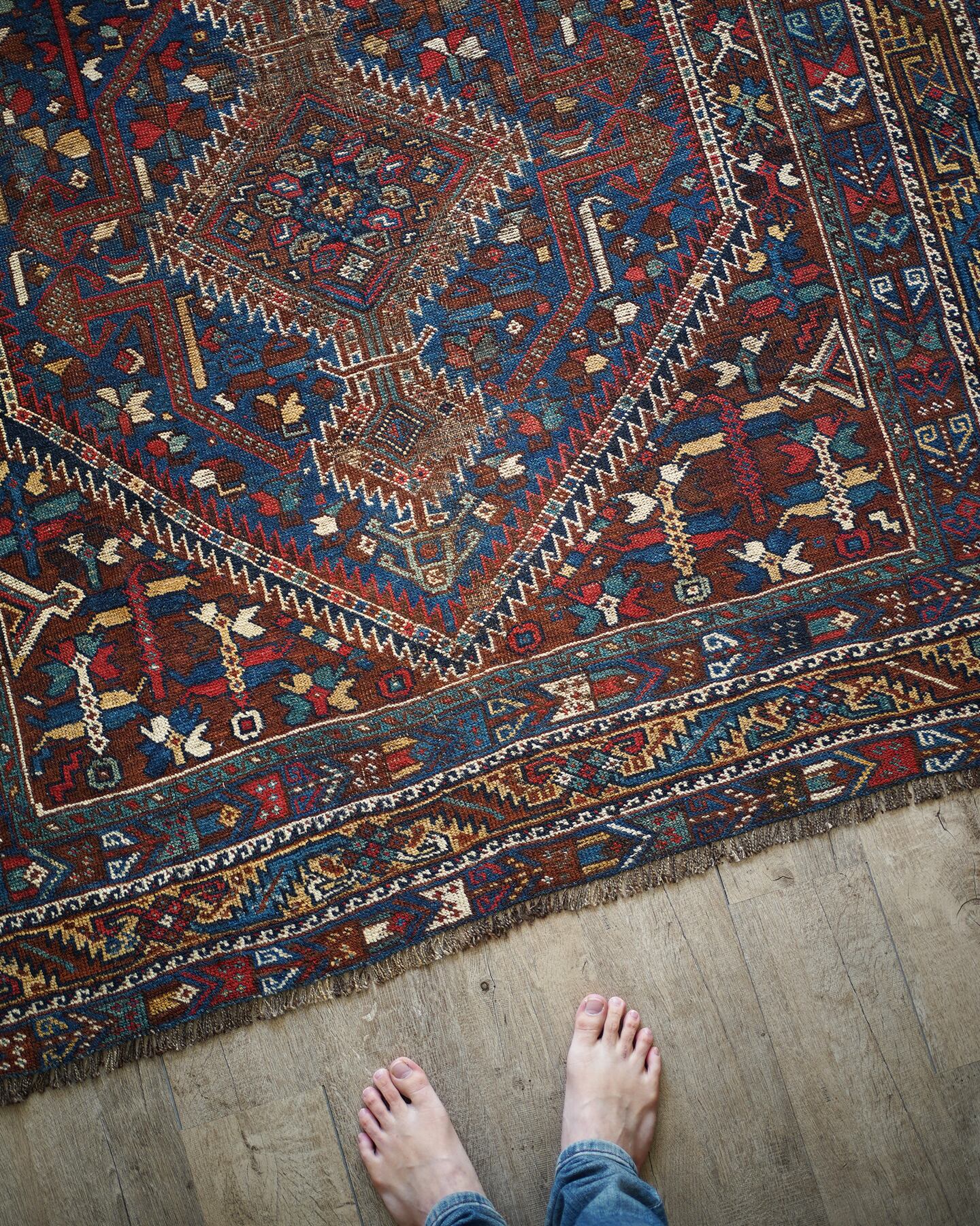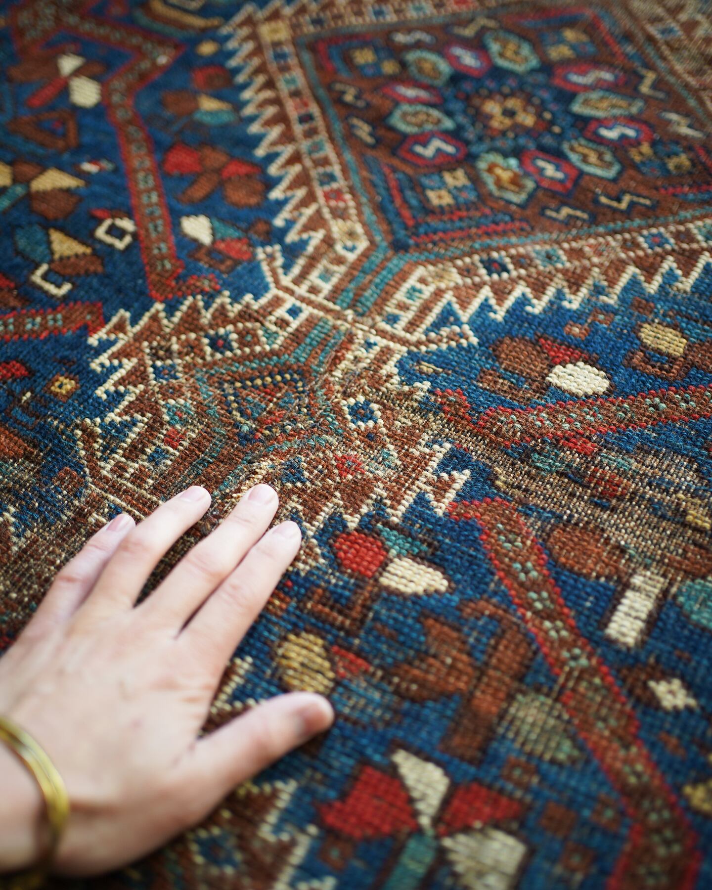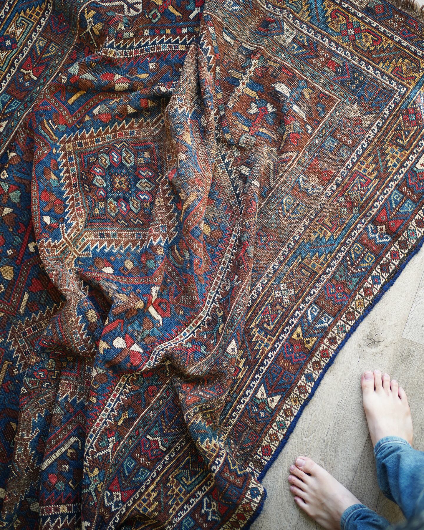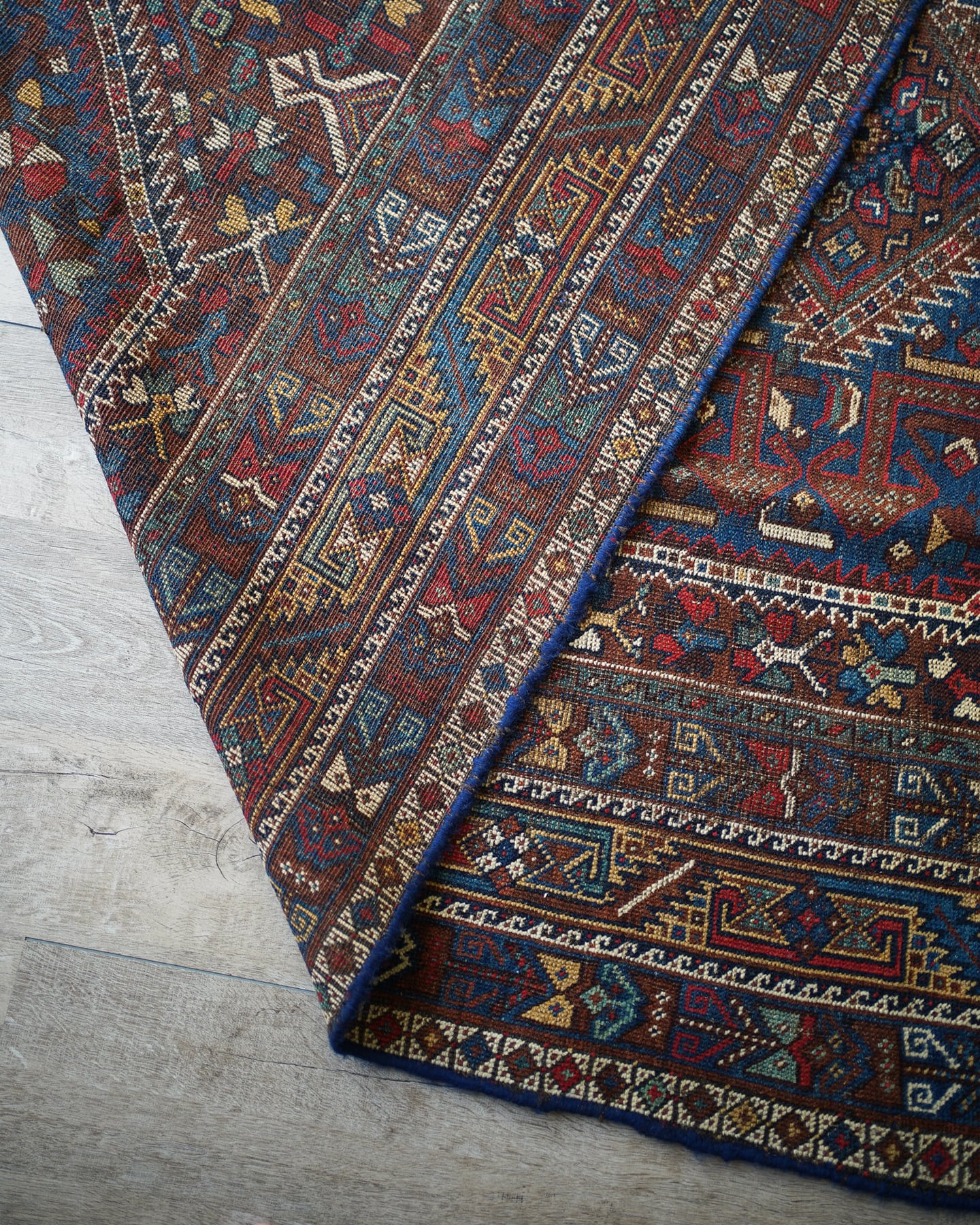 ハムセ連合によって90年前に織り込まれたセミアンティークのラグ。配色はブラウン、ネイビー、レッド、ベージュ、黄土色、ブルーグリーンとハムセ連合らしく多様なカラーを使いつつも、落ち着いた雰囲気の一枚。褐色と絶妙な擦れ具合も素晴らしく、またセルベッジがネイビーなところも素敵です。サラッとした滑らかな肌触り、厚みは5mmほど。いくつか補修跡がありますが、よく見ないとわからないほど綺麗に修繕されており、擦れの部分含めて全体的にとても美しい風合いとなっています(お写真最後、最後から2番目をご参照ください)。リビングやダイニングテーブルの下などに敷けばヴィンテージ・アンティーク感がグッとアップすること間違いなしです。憧れのハムセ連合のラグをお持ちでない方のファーストラグとしてもオススメですよ♪