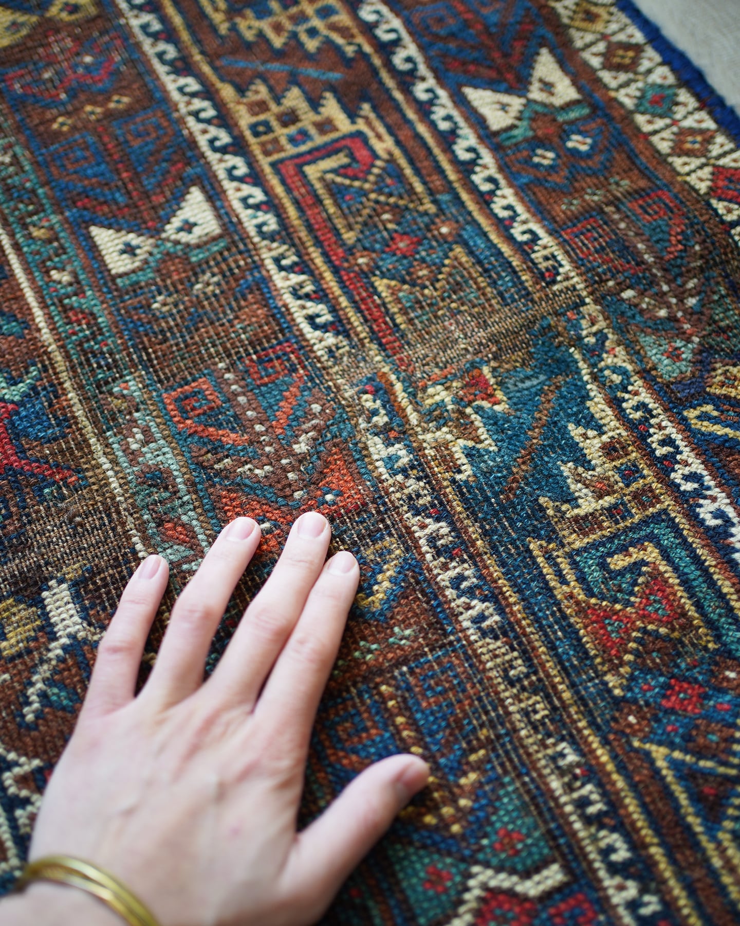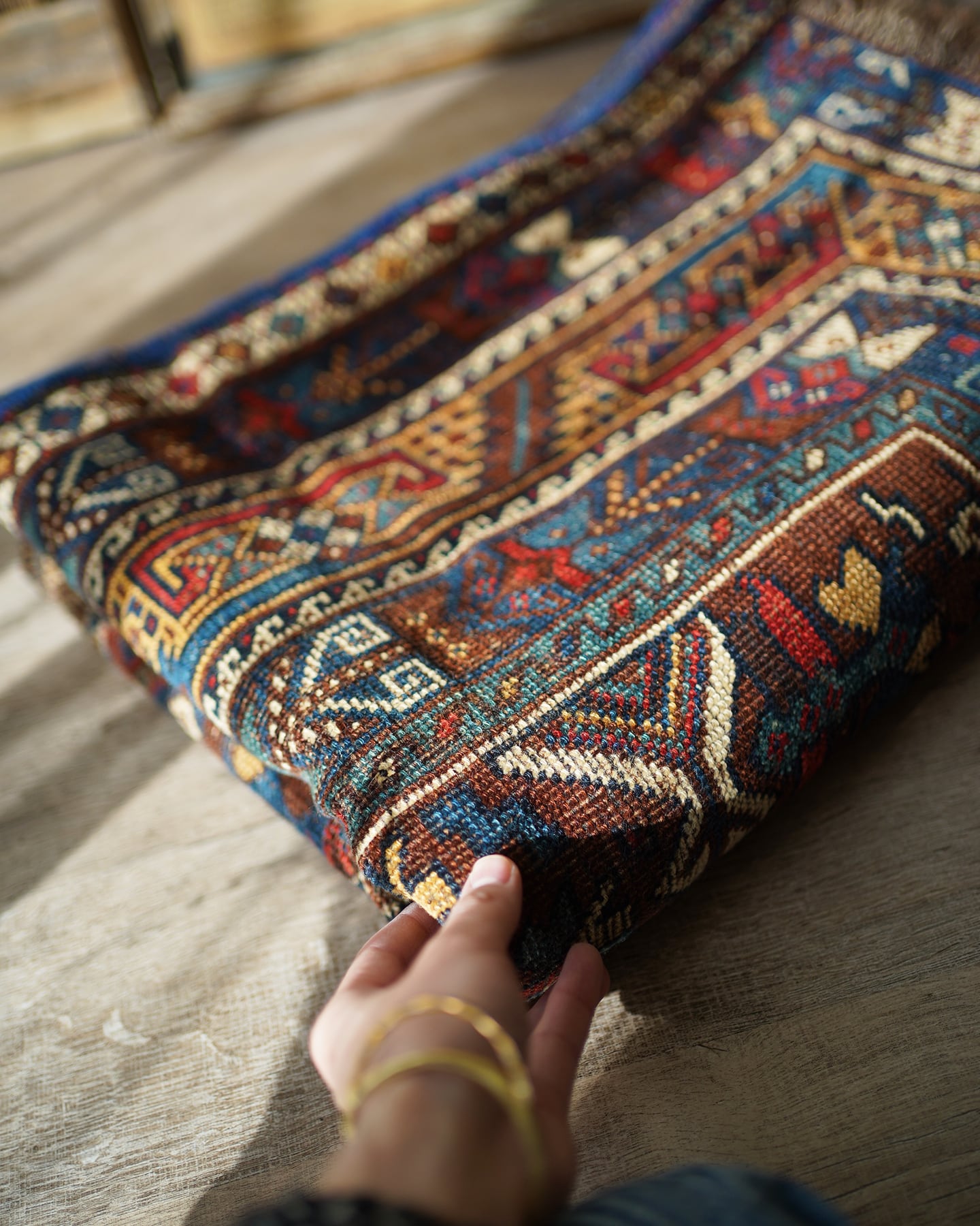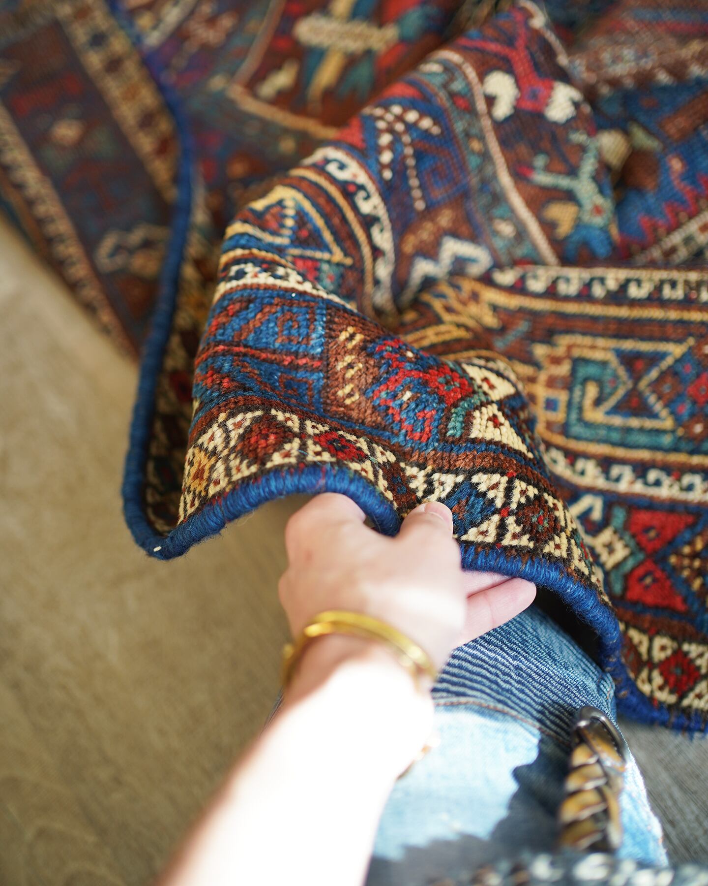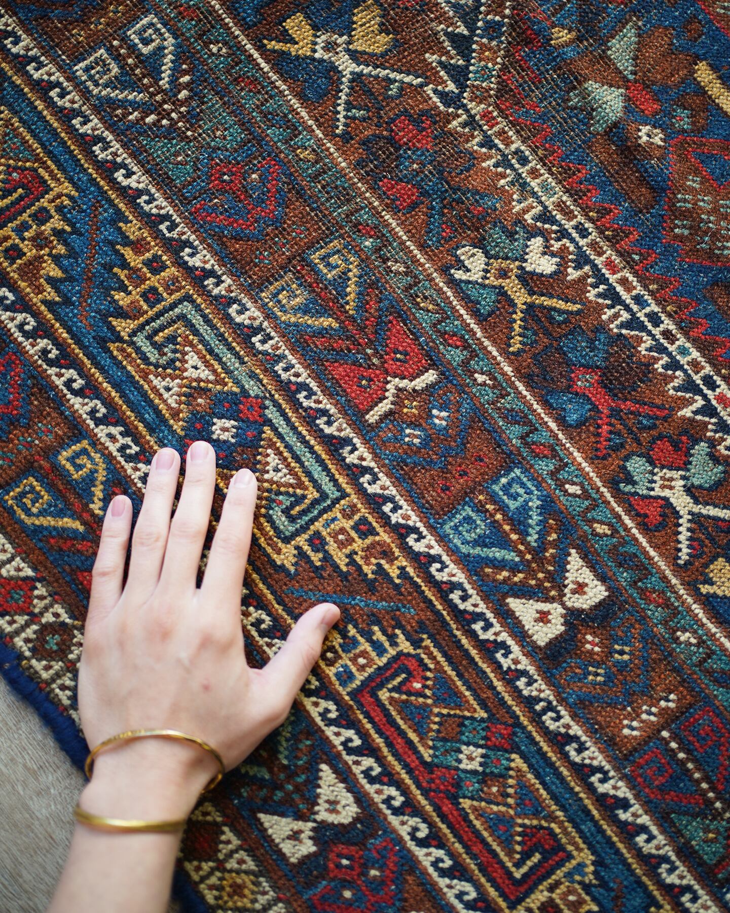 ハムセ連合によって90年前に織り込まれたセミアンティークのラグ。配色はブラウン、ネイビー、レッド、ベージュ、黄土色、ブルーグリーンとハムセ連合らしく多様なカラーを使いつつも、落ち着いた雰囲気の一枚。褐色と絶妙な擦れ具合も素晴らしく、またセルベッジがネイビーなところも素敵です。サラッとした滑らかな肌触り、厚みは5mmほど。いくつか補修跡がありますが、よく見ないとわからないほど綺麗に修繕されており、擦れの部分含めて全体的にとても美しい風合いとなっています(お写真最後、最後から2番目をご参照ください)。リビングやダイニングテーブルの下などに敷けばヴィンテージ・アンティーク感がグッとアップすること間違いなしです。憧れのハムセ連合のラグをお持ちでない方のファーストラグとしてもオススメですよ♪