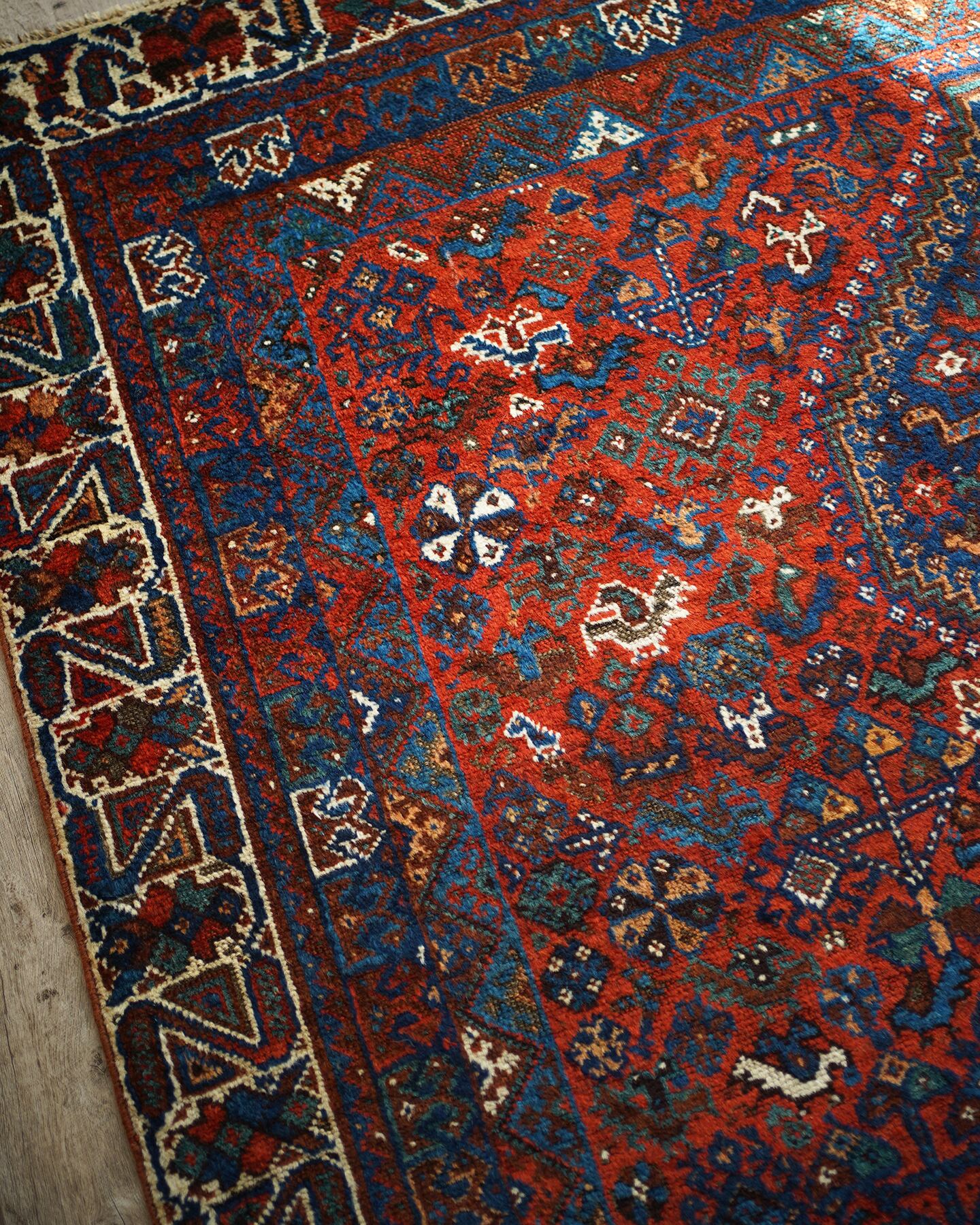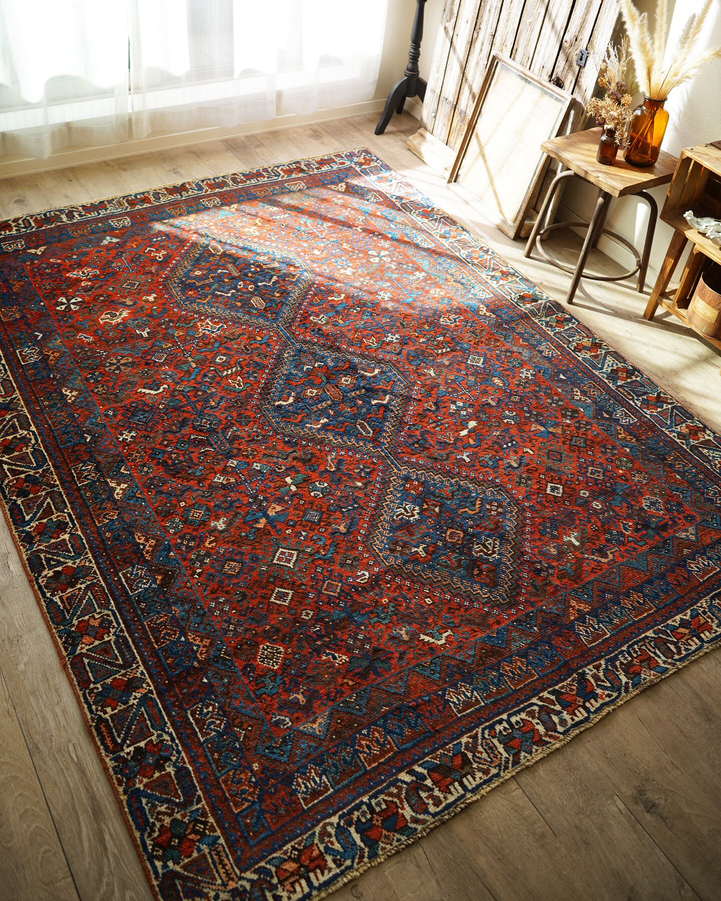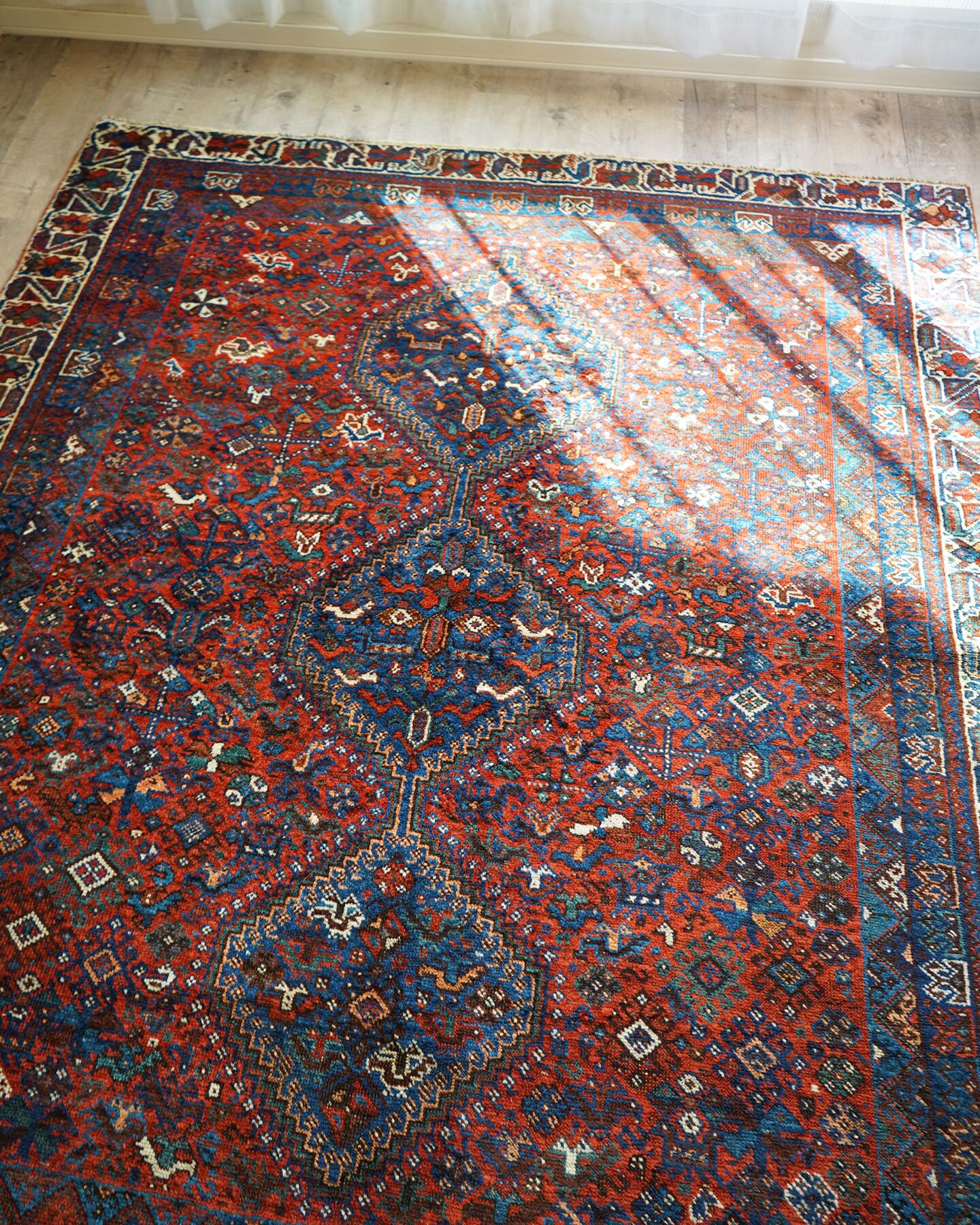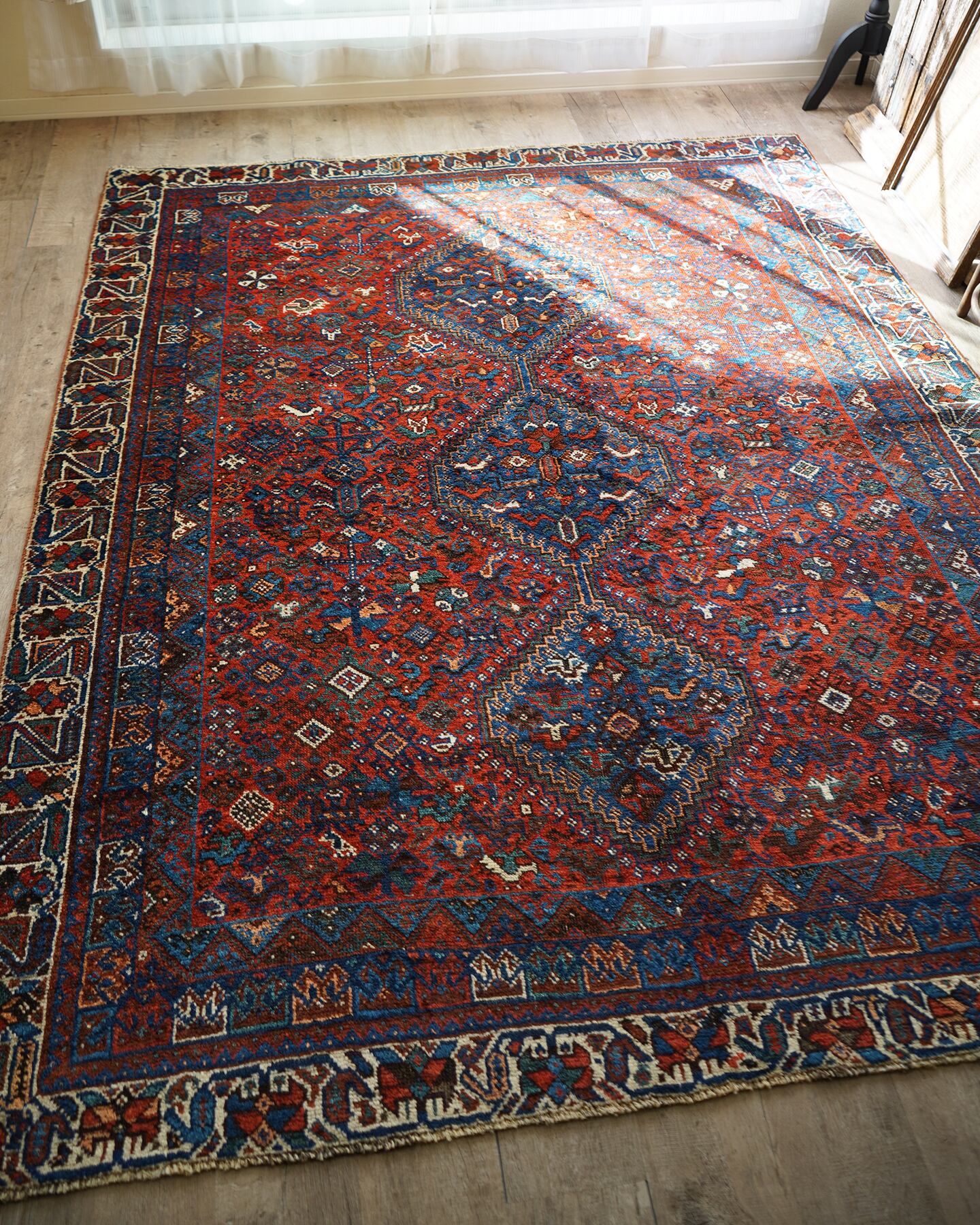 1930年頃〜1940年頃に織られたセミアンティークのシラーズラグ。三連のメダリオン部分とフィールドには様々な色の鳥紋様が数多く織り込まれています。日光に当たると輝くような美しい艶を醸し出すところも大変魅力的です。厚みとしては5mm〜6mm程度、パイルも全体的に程よく残っているため、サラッと滑らかでとても気持ちの良い肌触り。目立った補修跡もなく、状態も良好です。ぜひリビングに主役級の一枚としてお迎えください♪