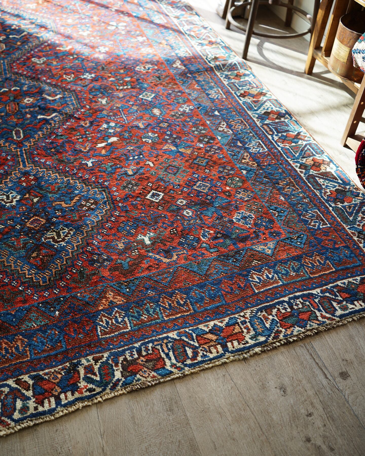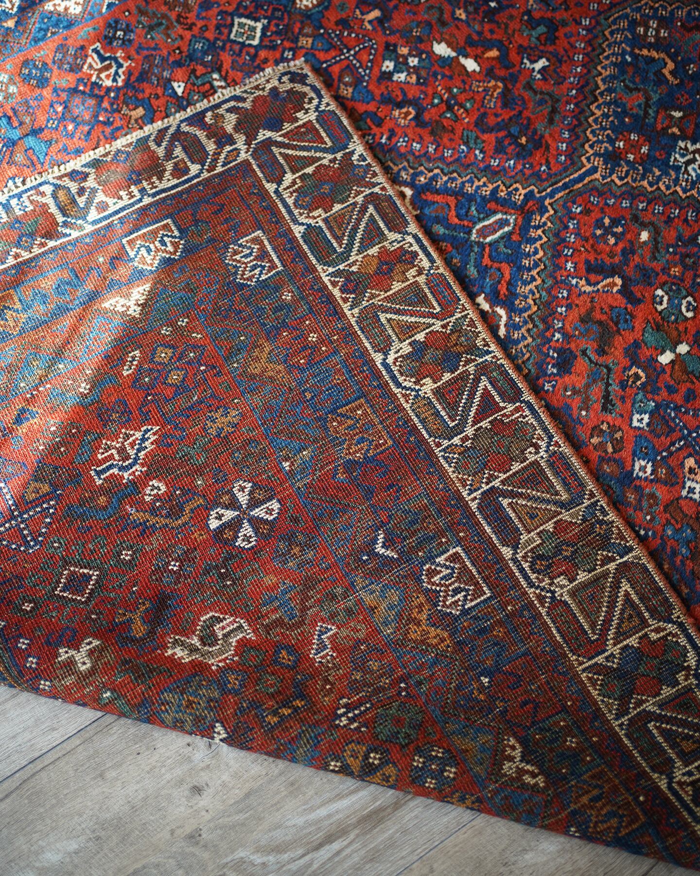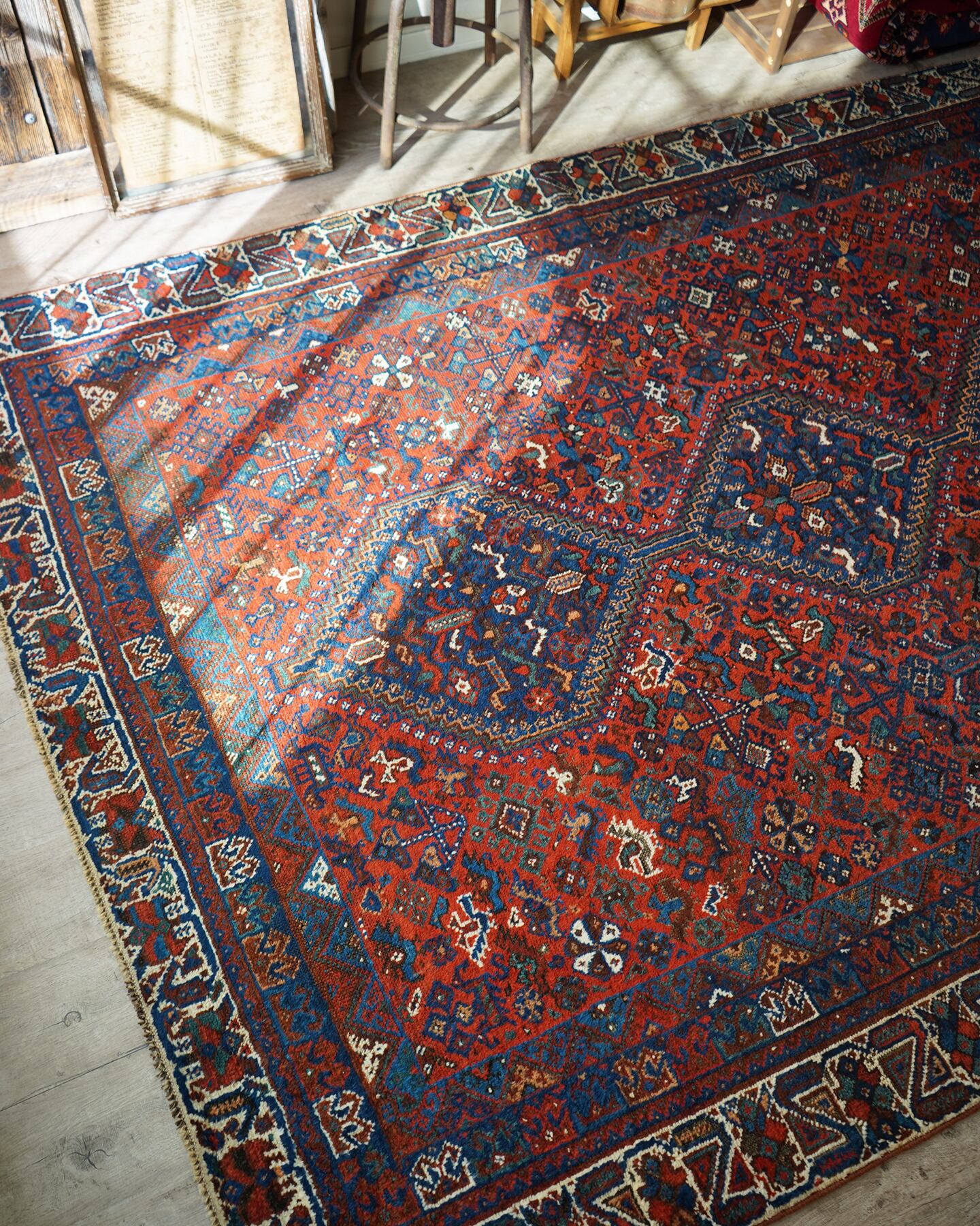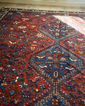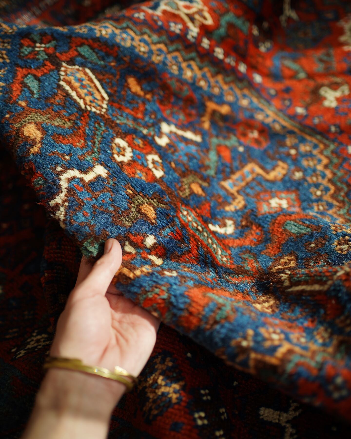 1930年頃〜1940年頃に織られたセミアンティークのシラーズラグ。三連のメダリオン部分とフィールドには様々な色の鳥紋様が数多く織り込まれています。日光に当たると輝くような美しい艶を醸し出すところも大変魅力的です。厚みとしては5mm〜6mm程度、パイルも全体的に程よく残っているため、サラッと滑らかでとても気持ちの良い肌触り。目立った補修跡もなく、状態も良好です。ぜひリビングに主役級の一枚としてお迎えください♪