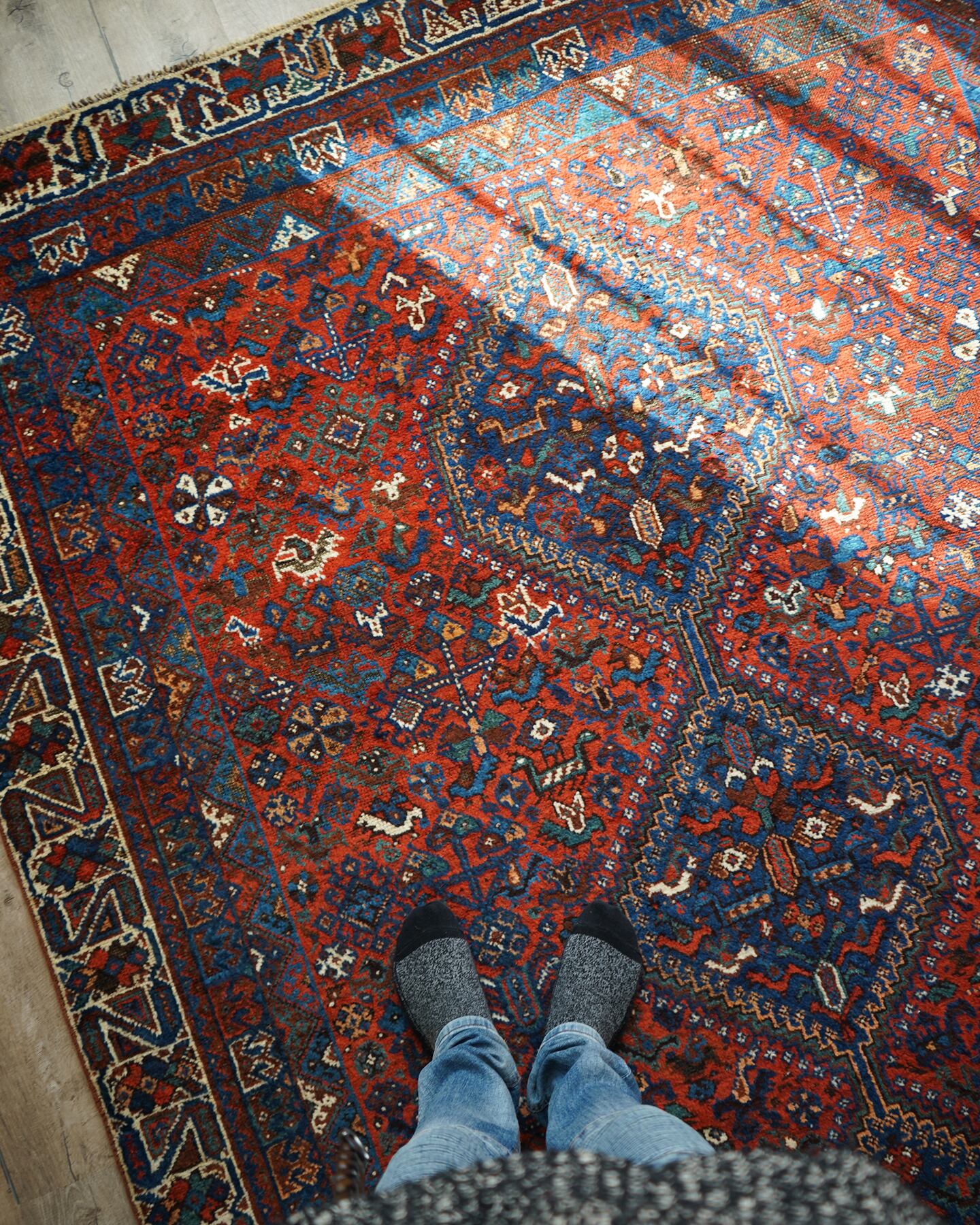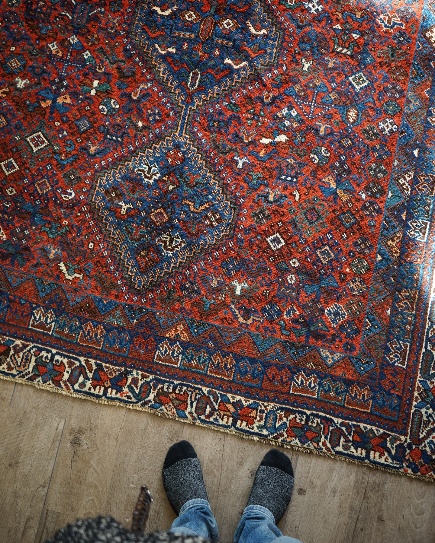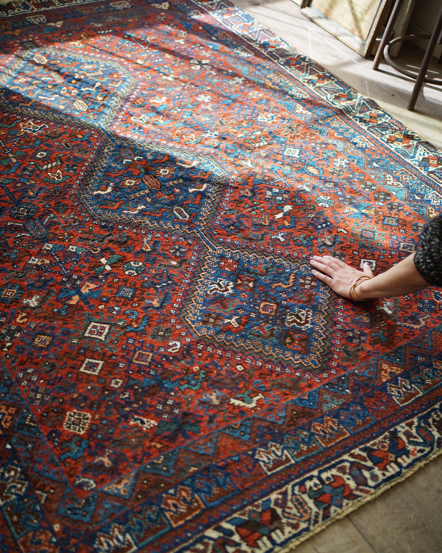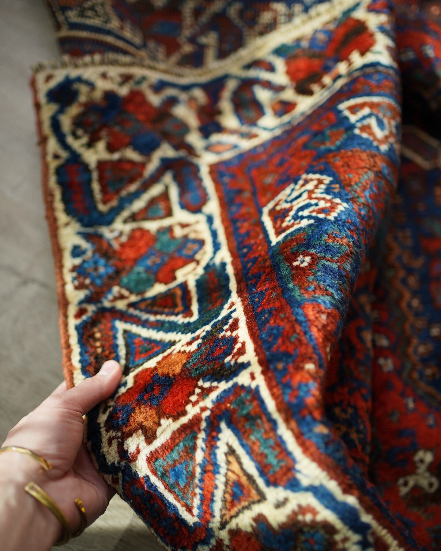 1930年頃〜1940年頃に織られたセミアンティークのシラーズラグ。三連のメダリオン部分とフィールドには様々な色の鳥紋様が数多く織り込まれています。日光に当たると輝くような美しい艶を醸し出すところも大変魅力的です。厚みとしては5mm〜6mm程度、パイルも全体的に程よく残っているため、サラッと滑らかでとても気持ちの良い肌触り。目立った補修跡もなく、状態も良好です。ぜひリビングに主役級の一枚としてお迎えください♪