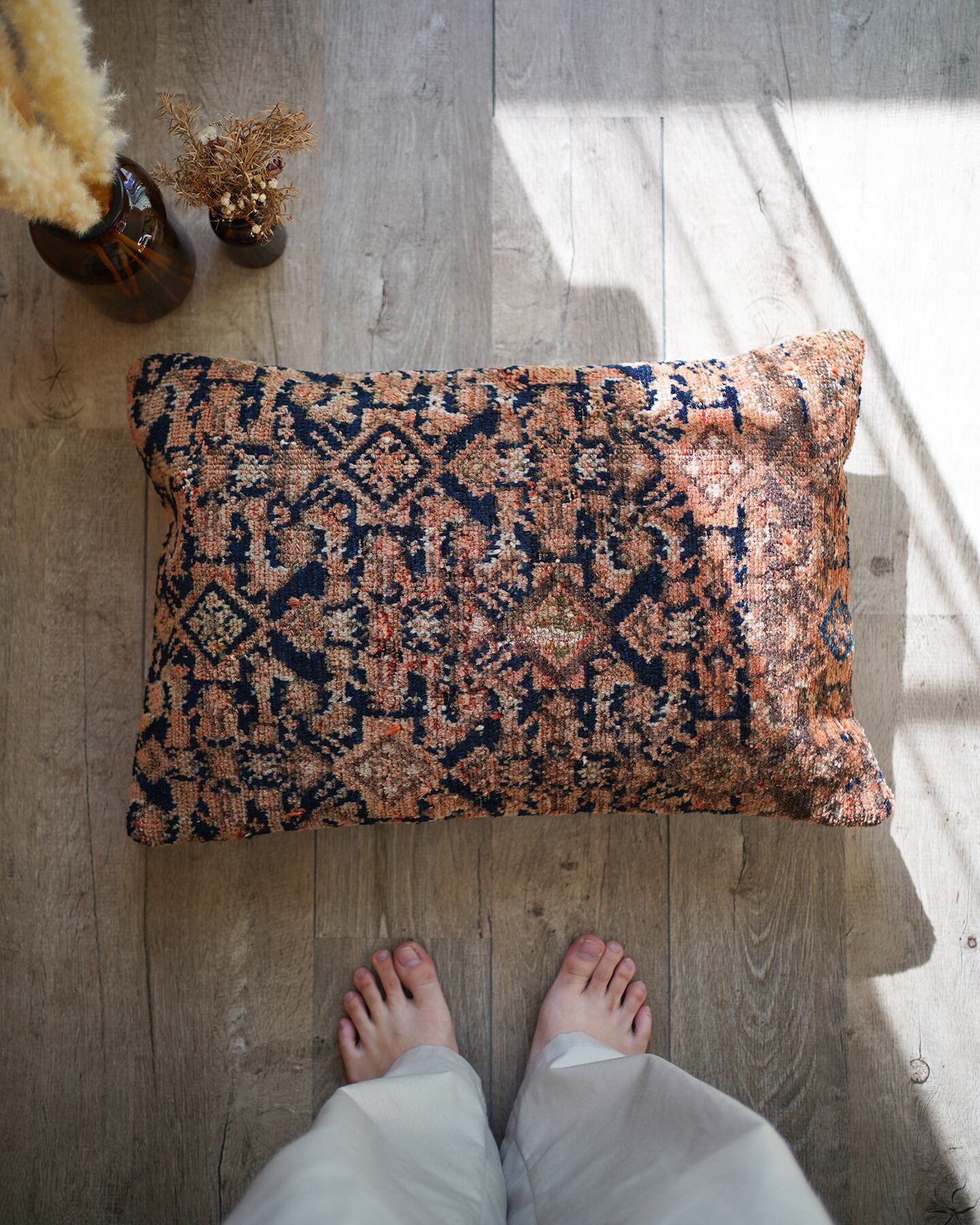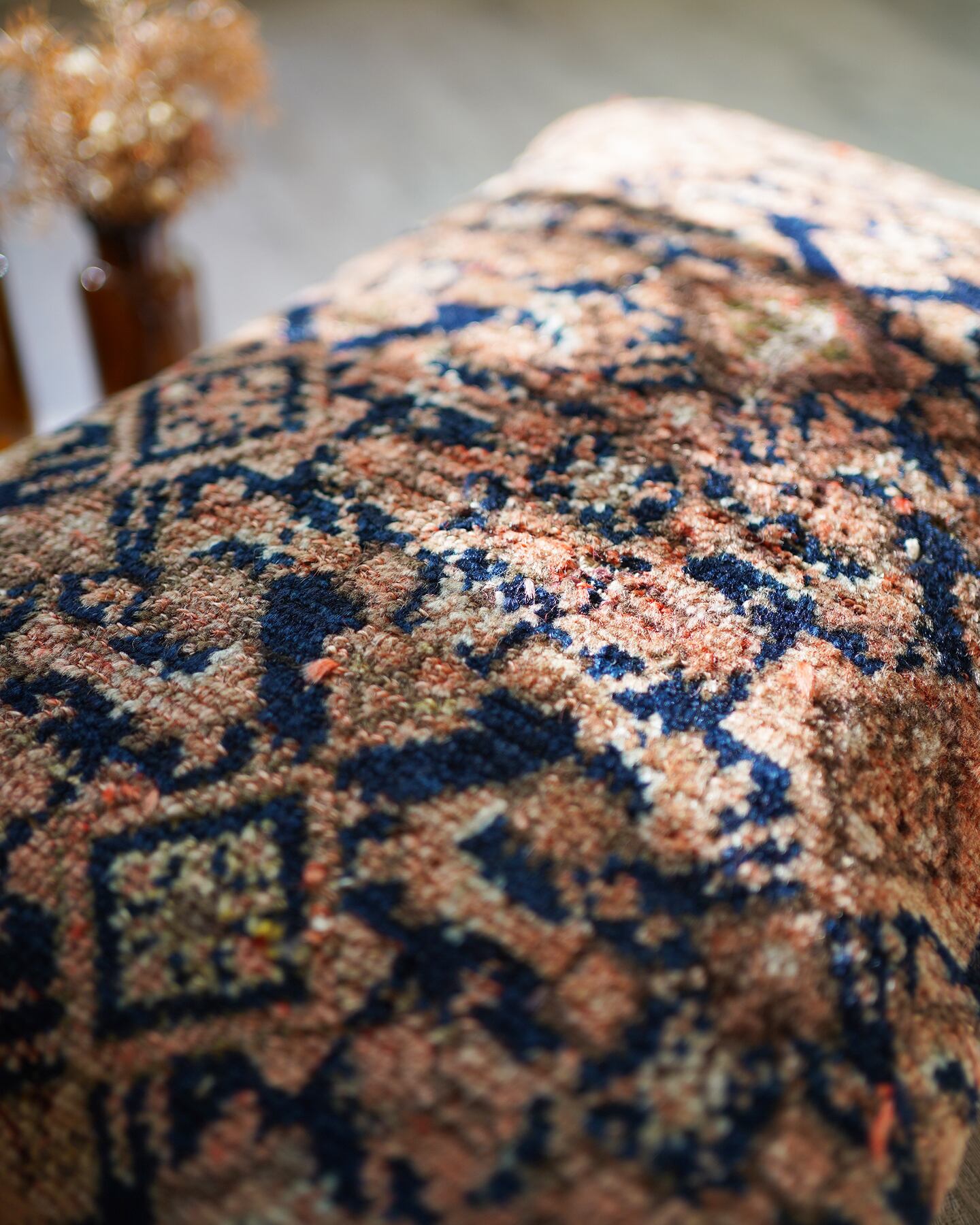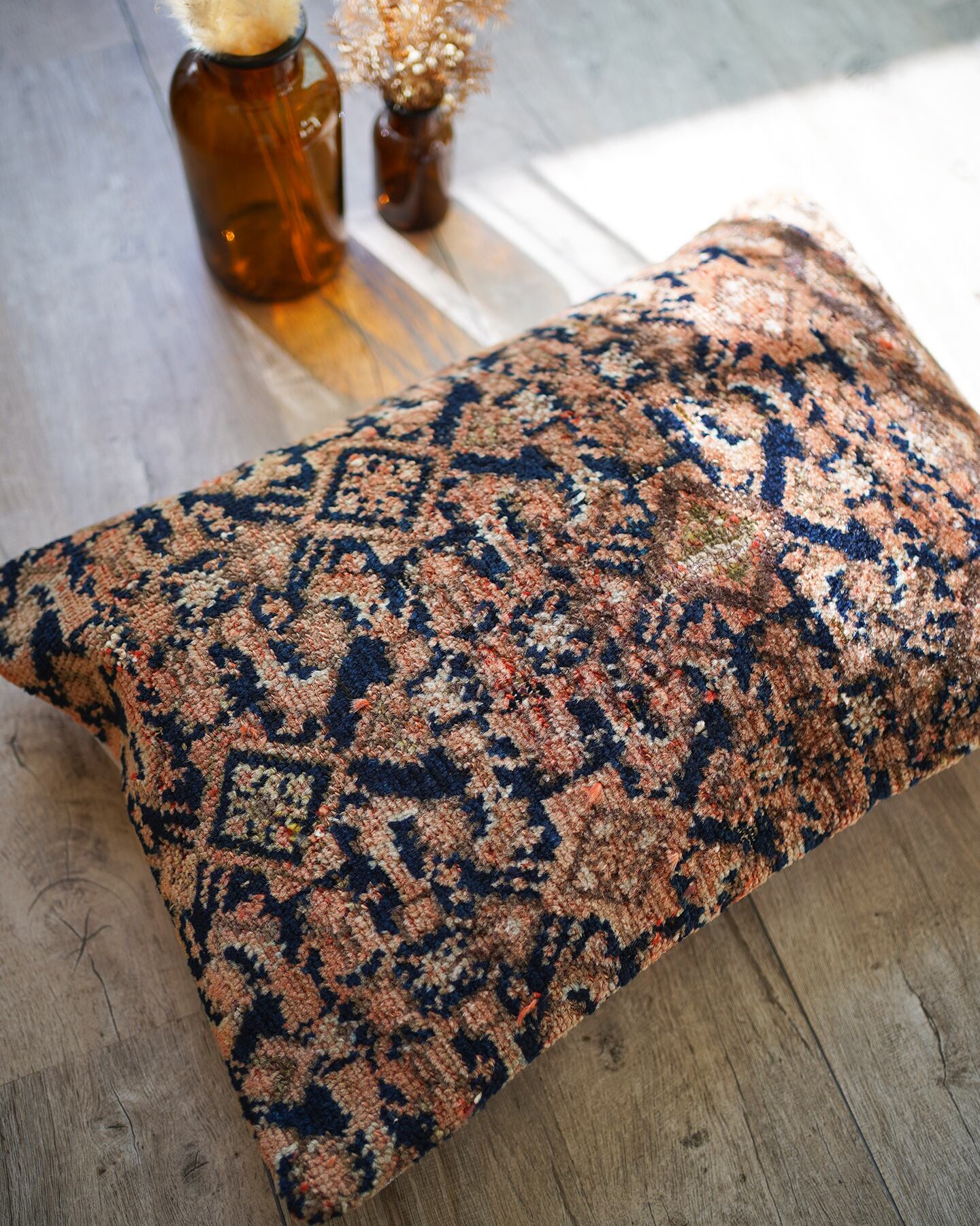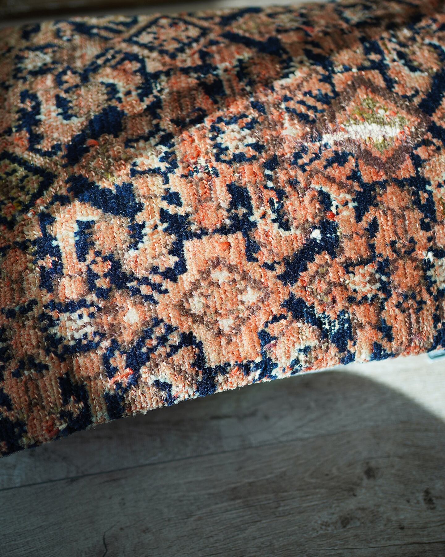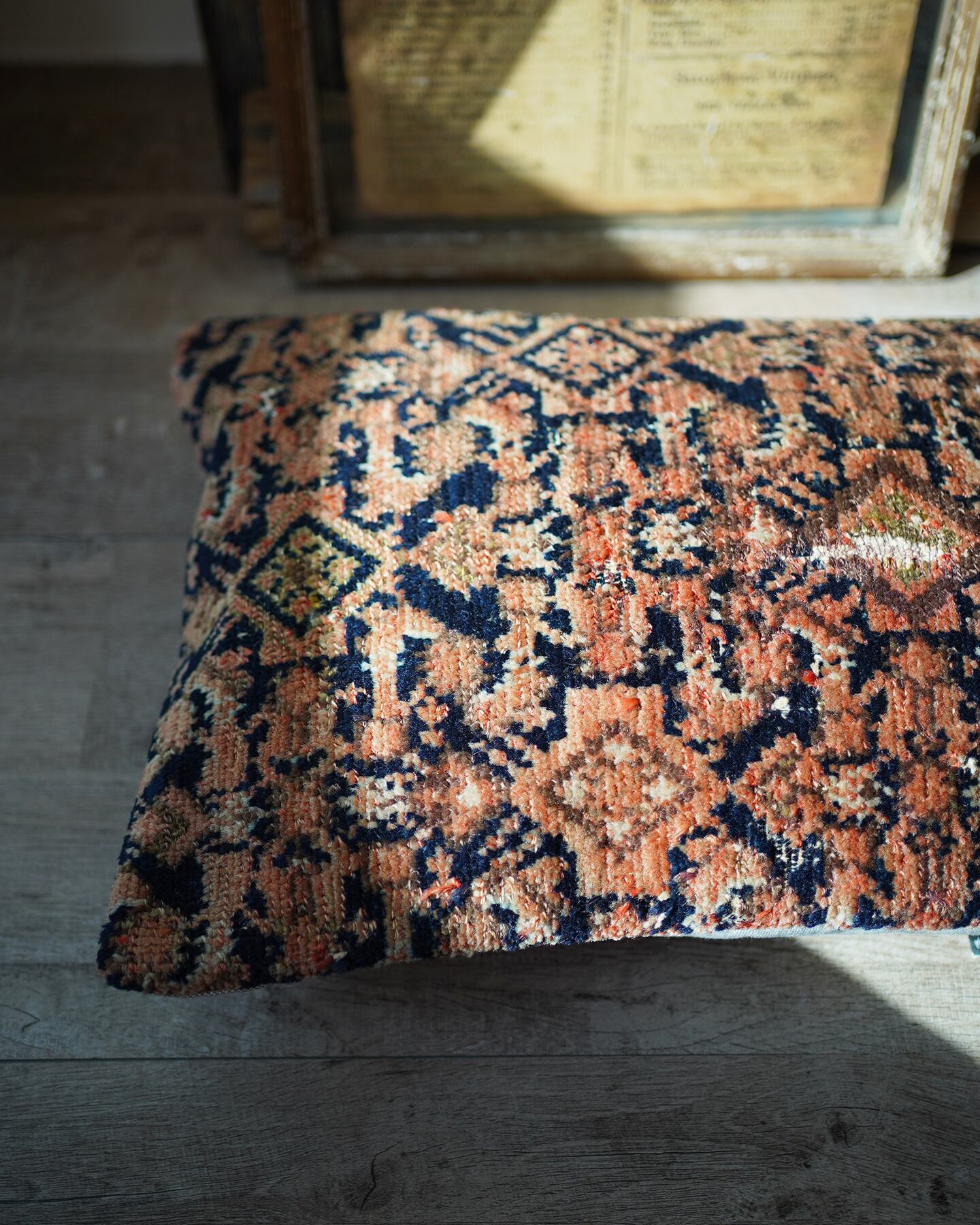 おおよそ100年〜120年前にイラン西部地域に位置するマラーイェルで織られたラグから作製されたクッションカバー。柔らかい雰囲気のピンクとネイビーの配色が美しい一枚。真ん中あたりに補修跡がありますのでお写真最後をご参照ください。サラっと滑らかな気持ちの良い肌触りです♪