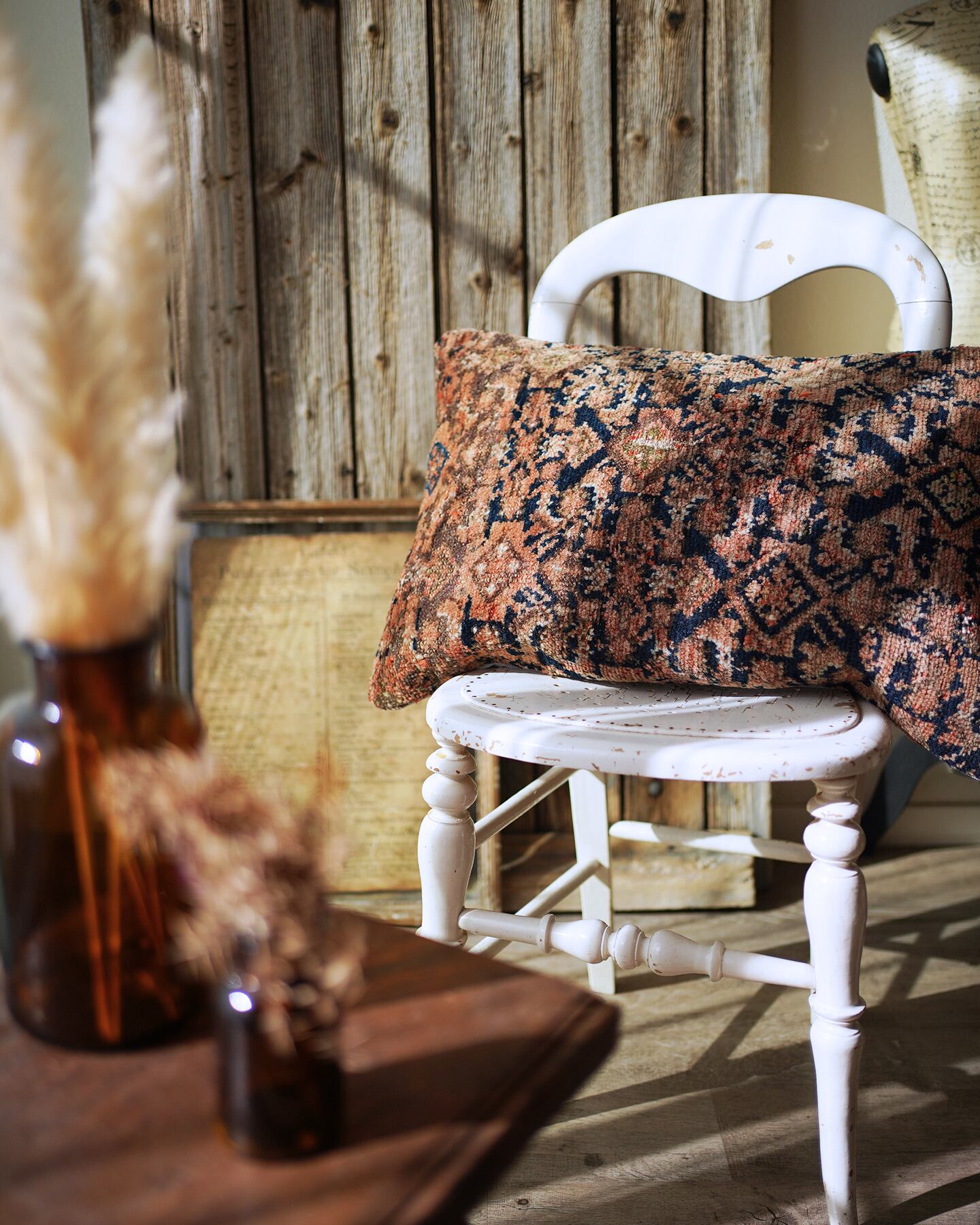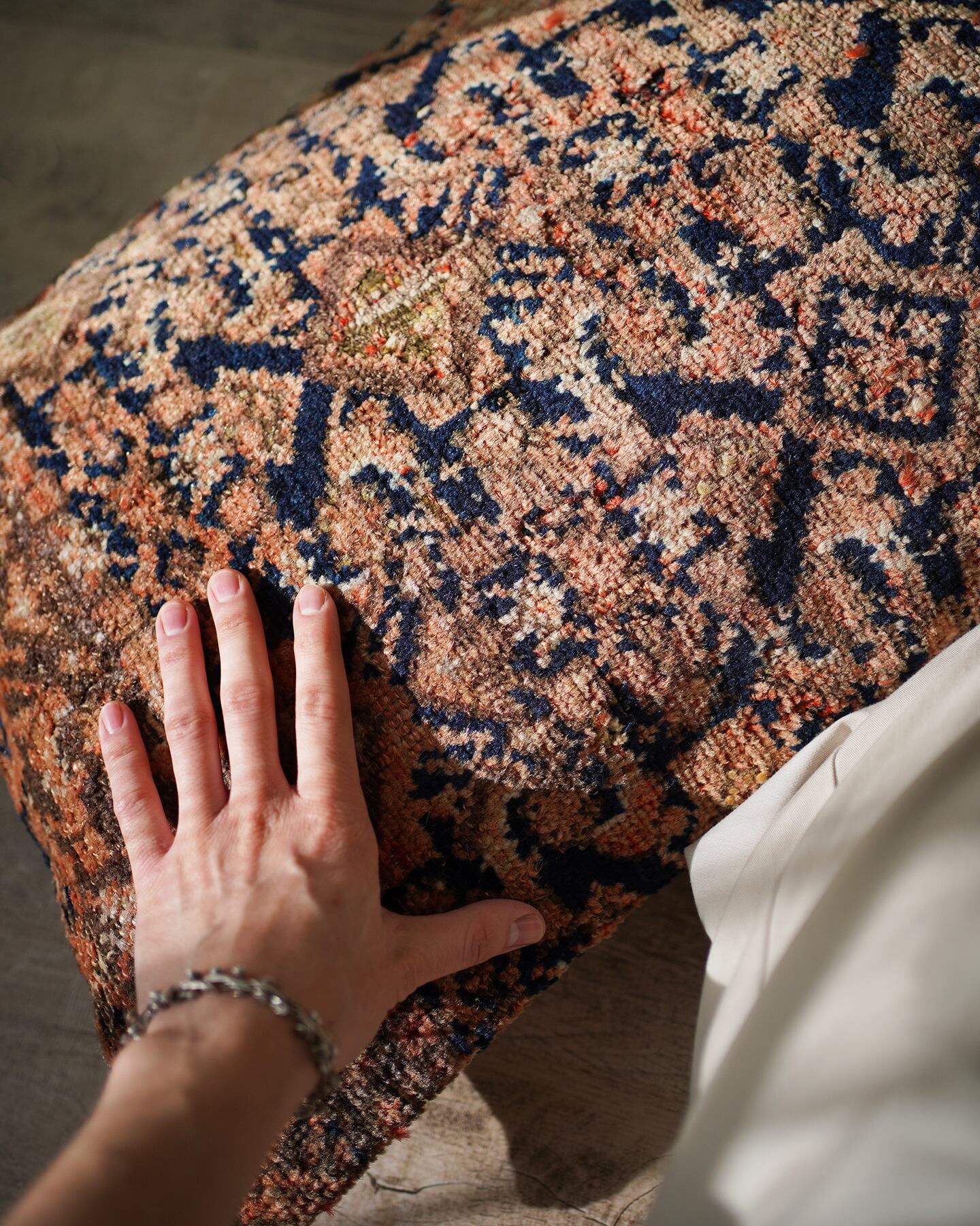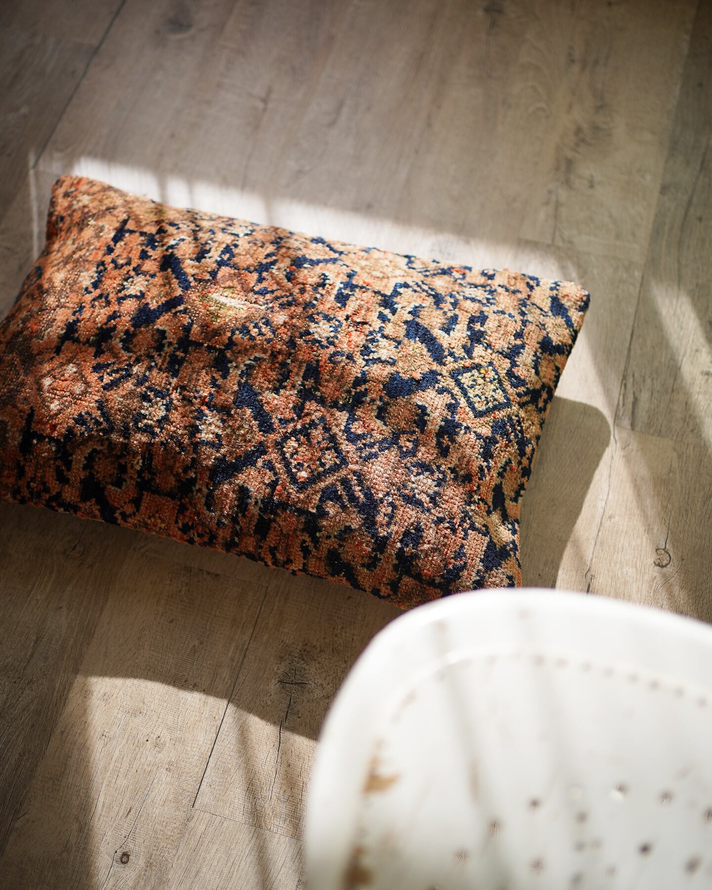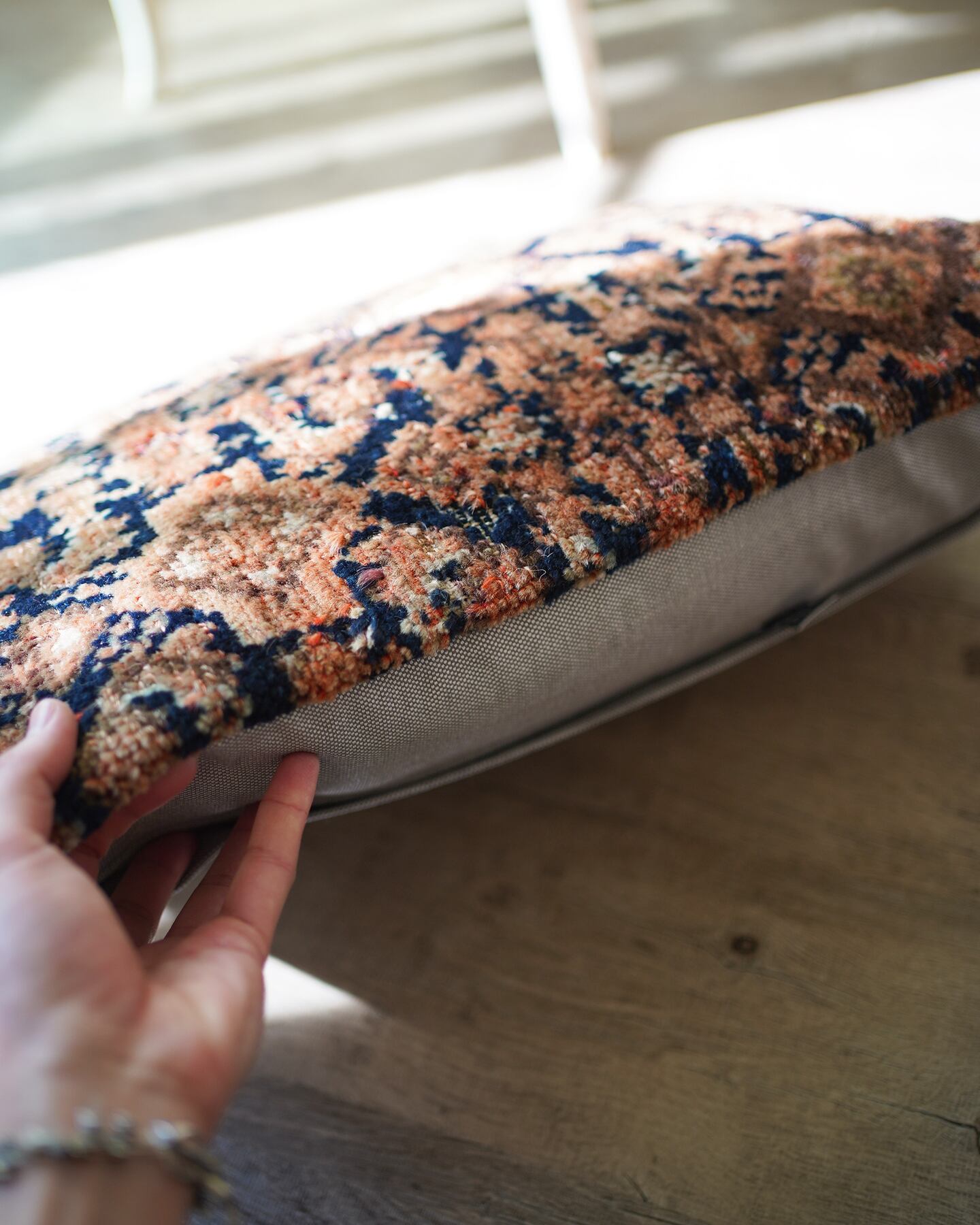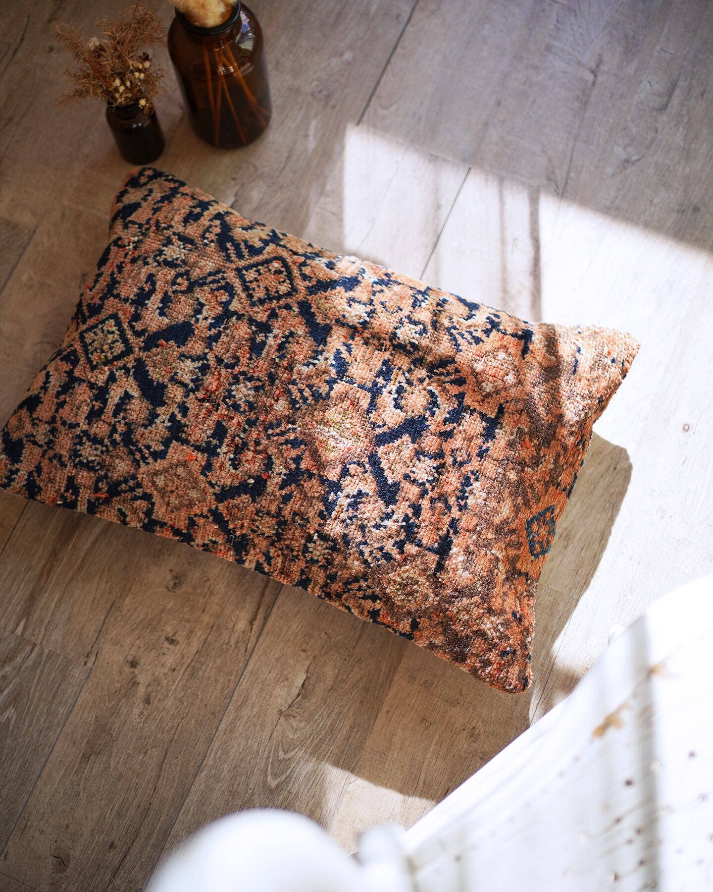 おおよそ100年〜120年前にイラン西部地域に位置するマラーイェルで織られたラグから作製されたクッションカバー。柔らかい雰囲気のピンクとネイビーの配色が美しい一枚。真ん中あたりに補修跡がありますのでお写真最後をご参照ください。サラっと滑らかな気持ちの良い肌触りです♪
