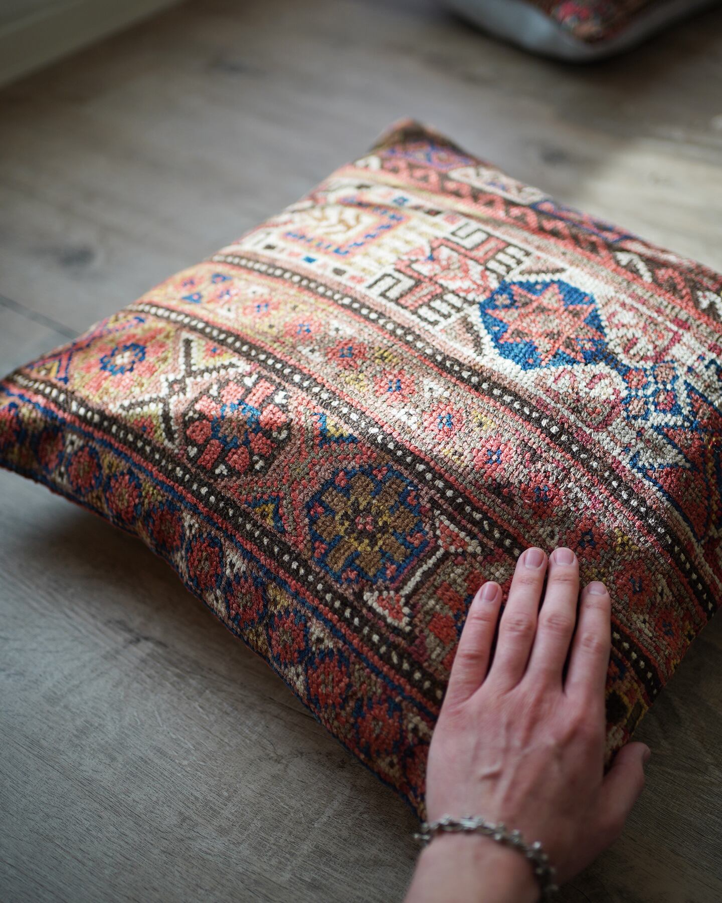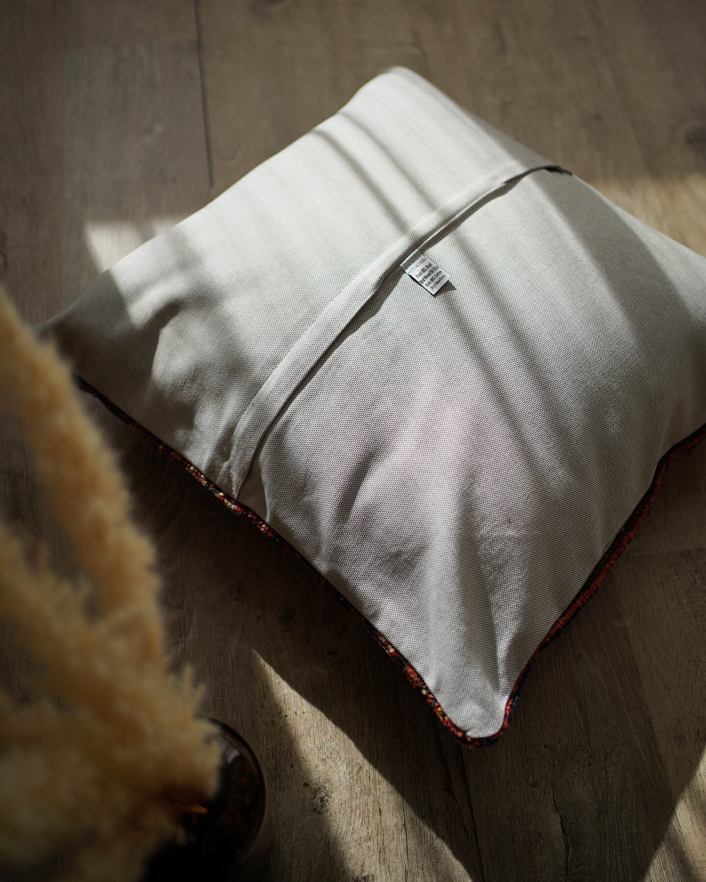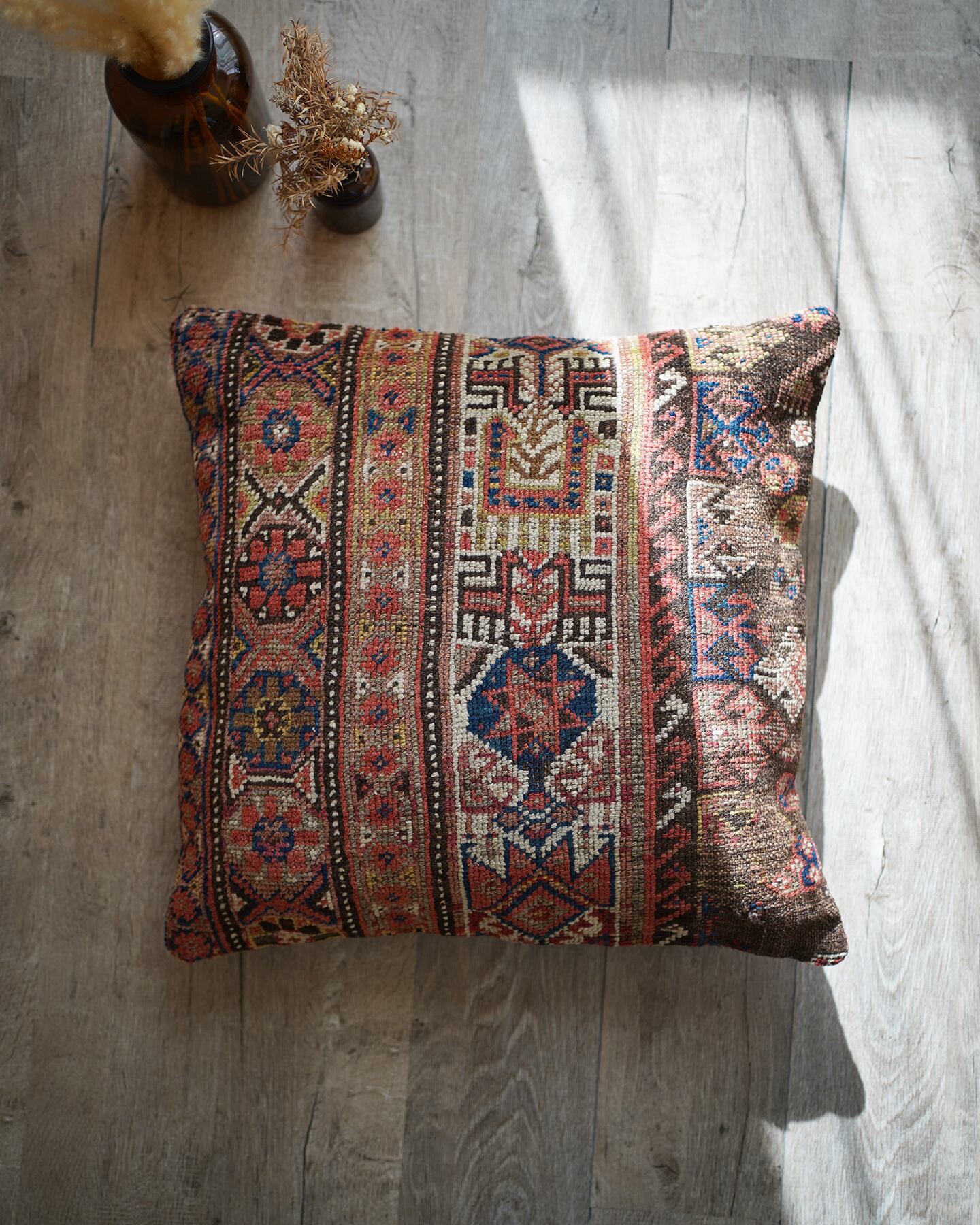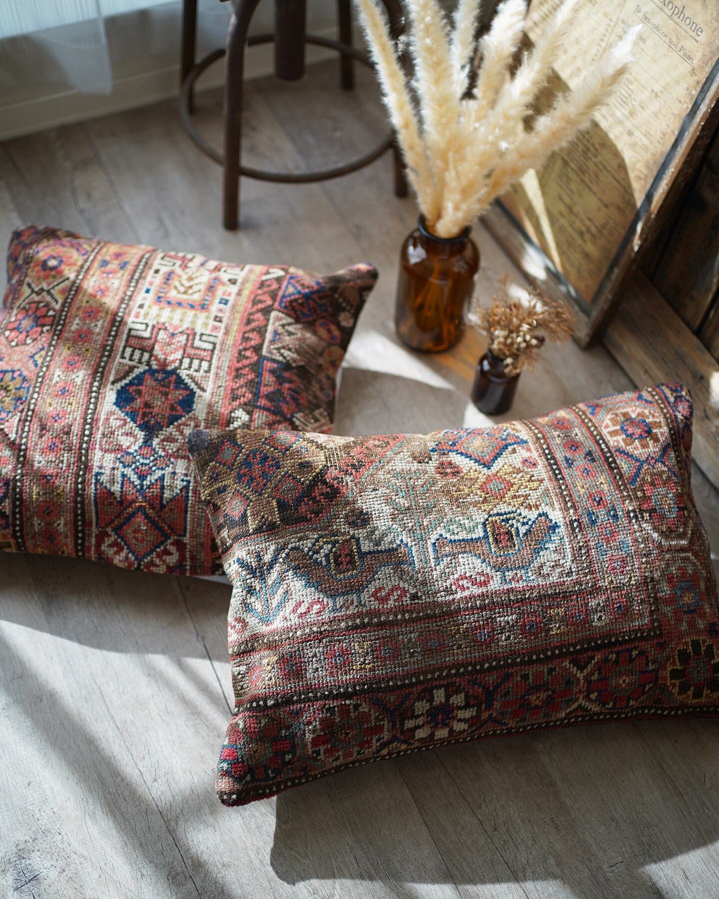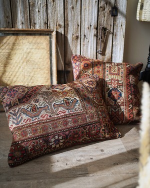 ハムセ連合によって100年〜120年前に織られた希少なアンティークのラグから作製されたクッションカバー。ブラウンとくすんだピンク色をベースにネイビーの差し色が大変美しい配色です。目立った補修跡はなく、全体的に馴染んでいます。サラッとした肌触り♪