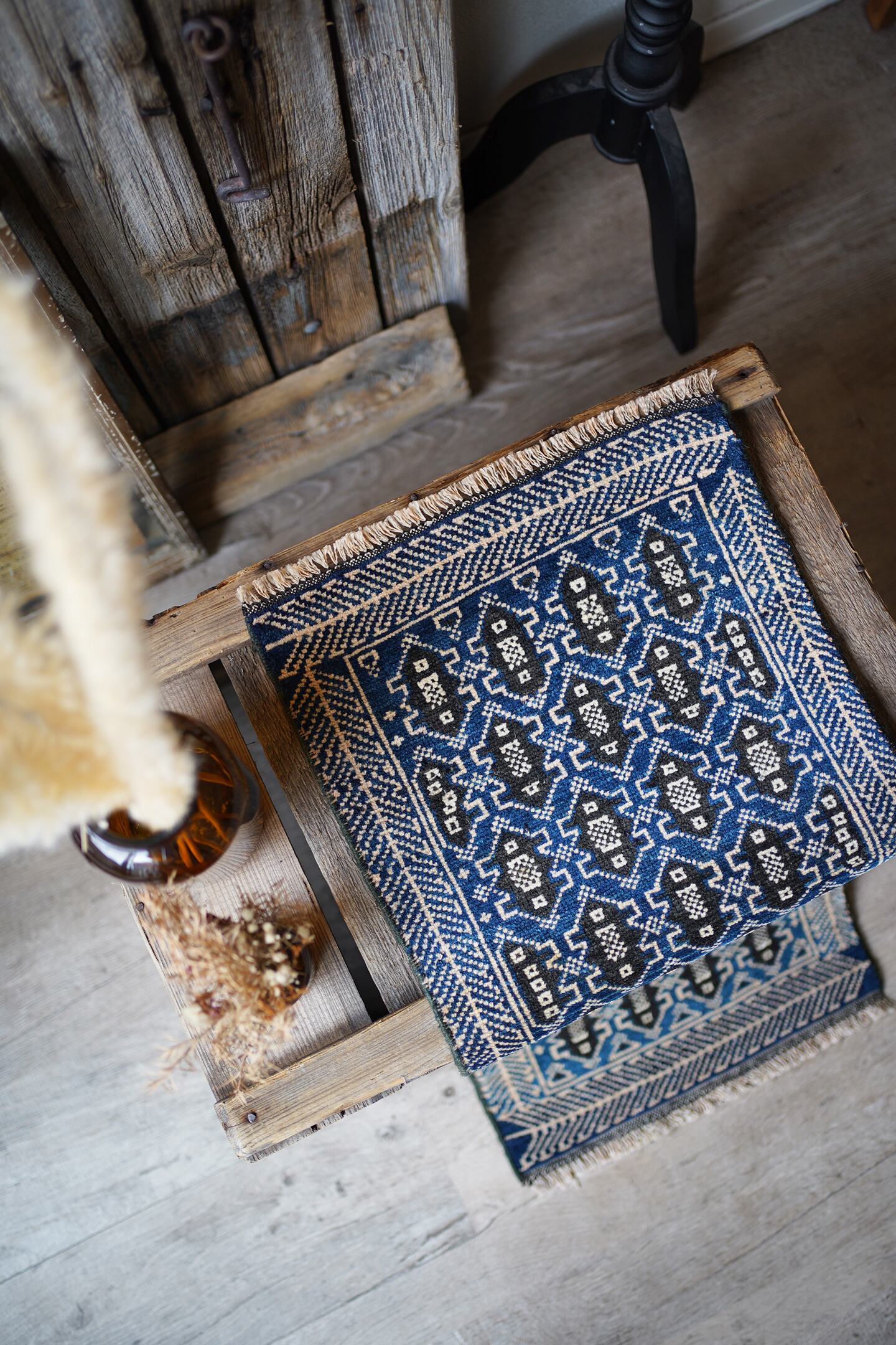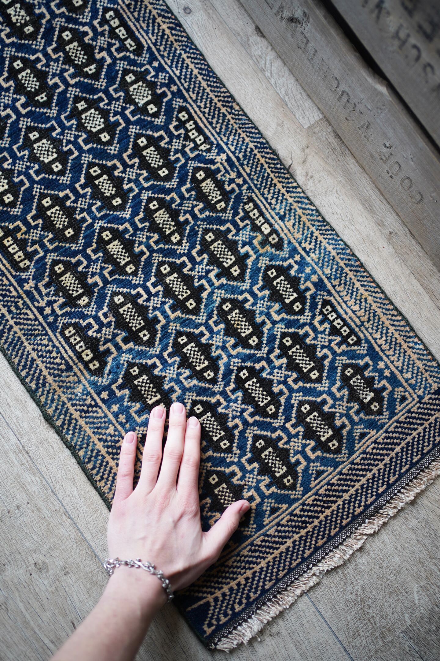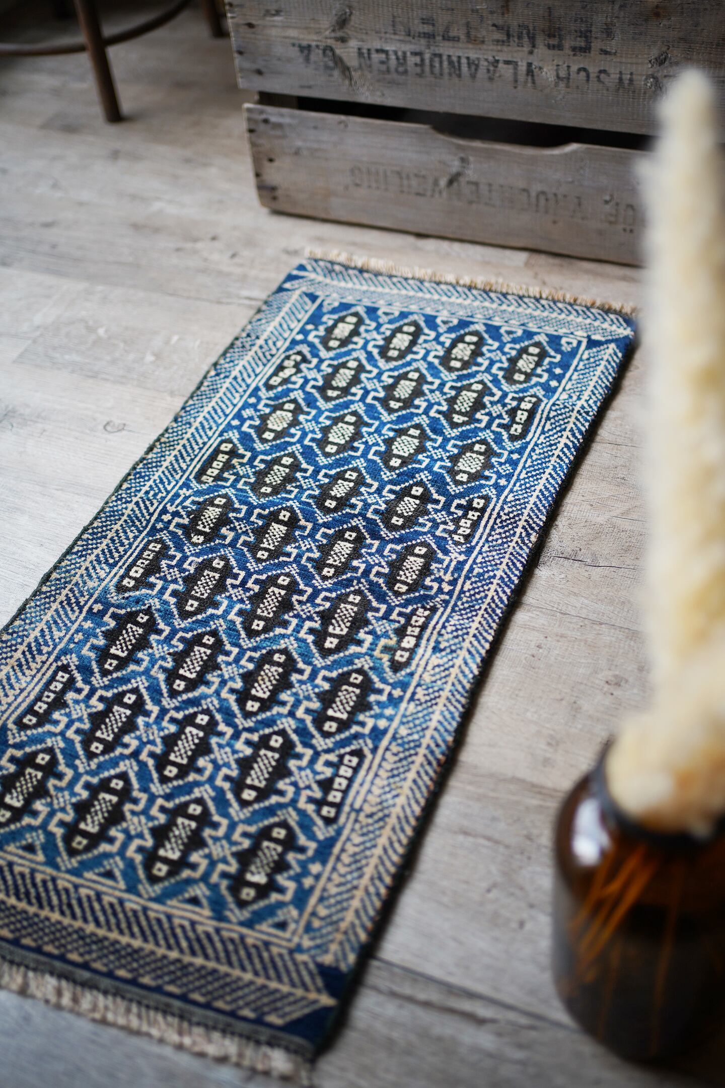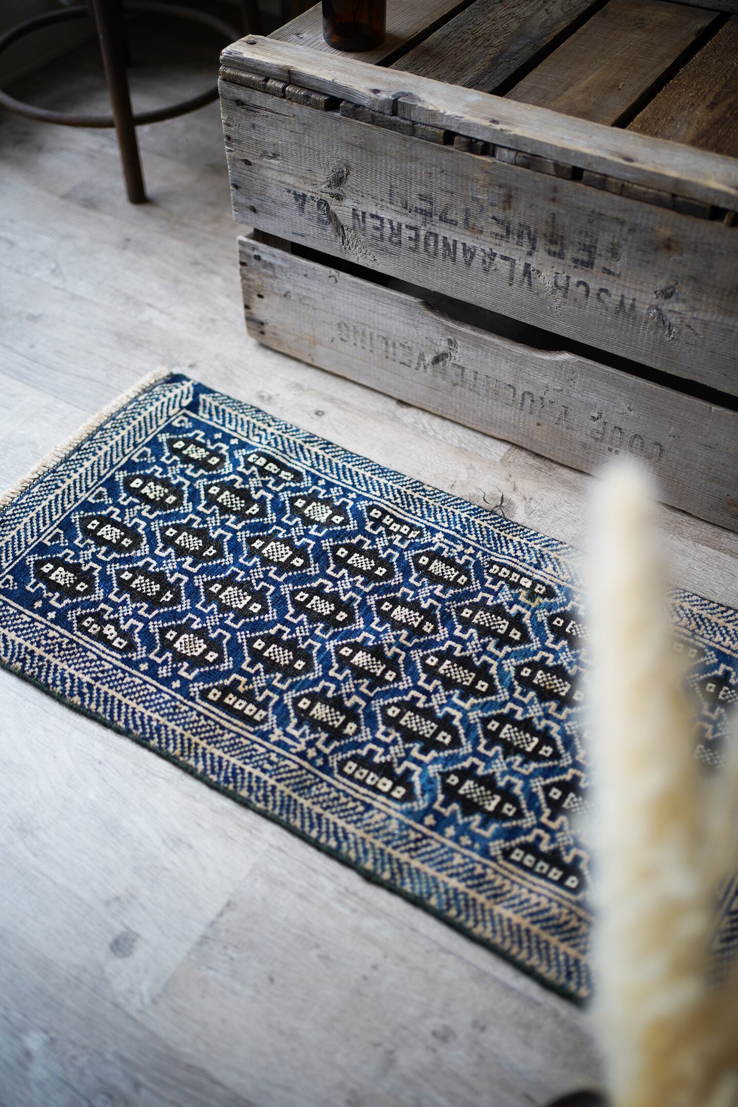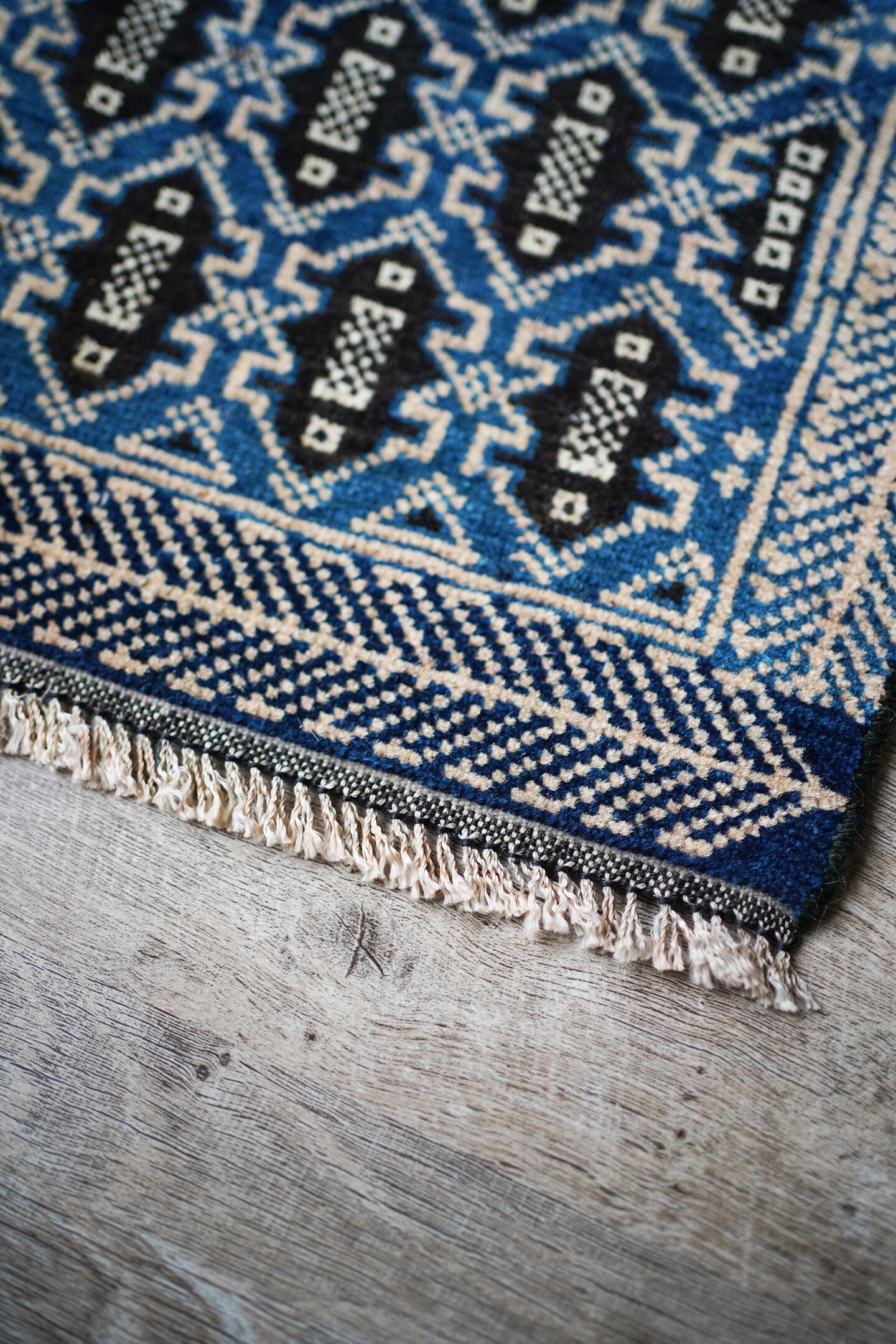 アフガニスタン北西部の都市ヘラート地域で織られた経年50年のヴィンテージラグ。青に近い色味のブルーグリーンが鮮やかで美しいフィールドに"ミフラーブ"と呼ばれるお祈りをするときの屋根のドームのような紋様がたくさん織り込まれています。サラッとしつつも滑らかな質感で、厚みは4〜5mm程度となります。補修跡なく状態も大変良好。ちょっとしたスペースに敷いたりと使い勝手の良いサイズ感です♪