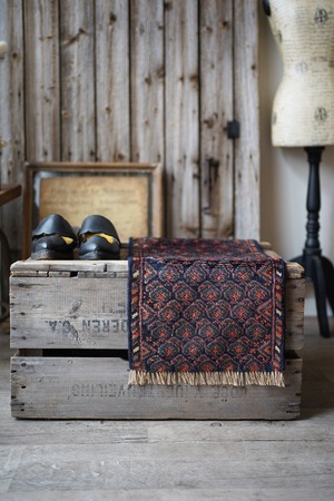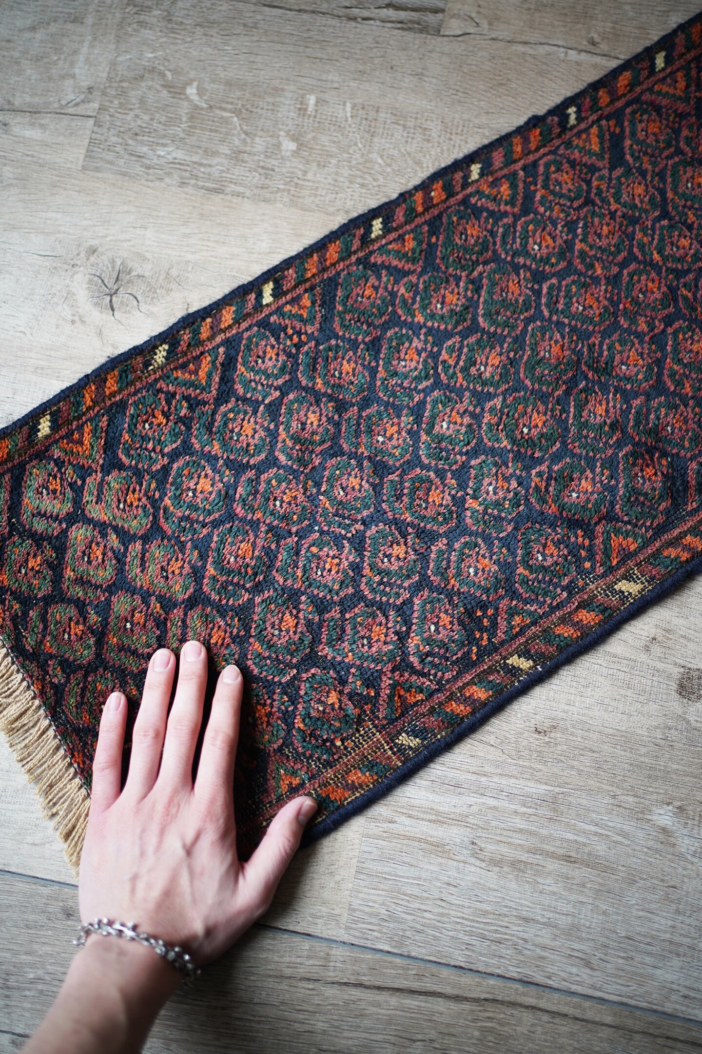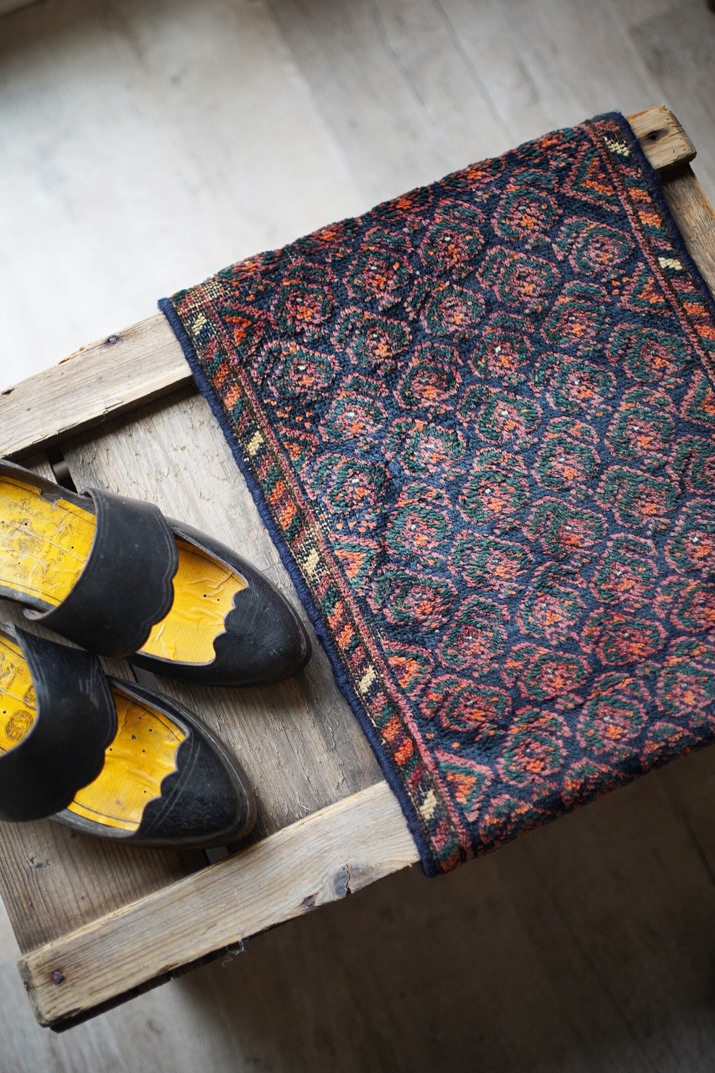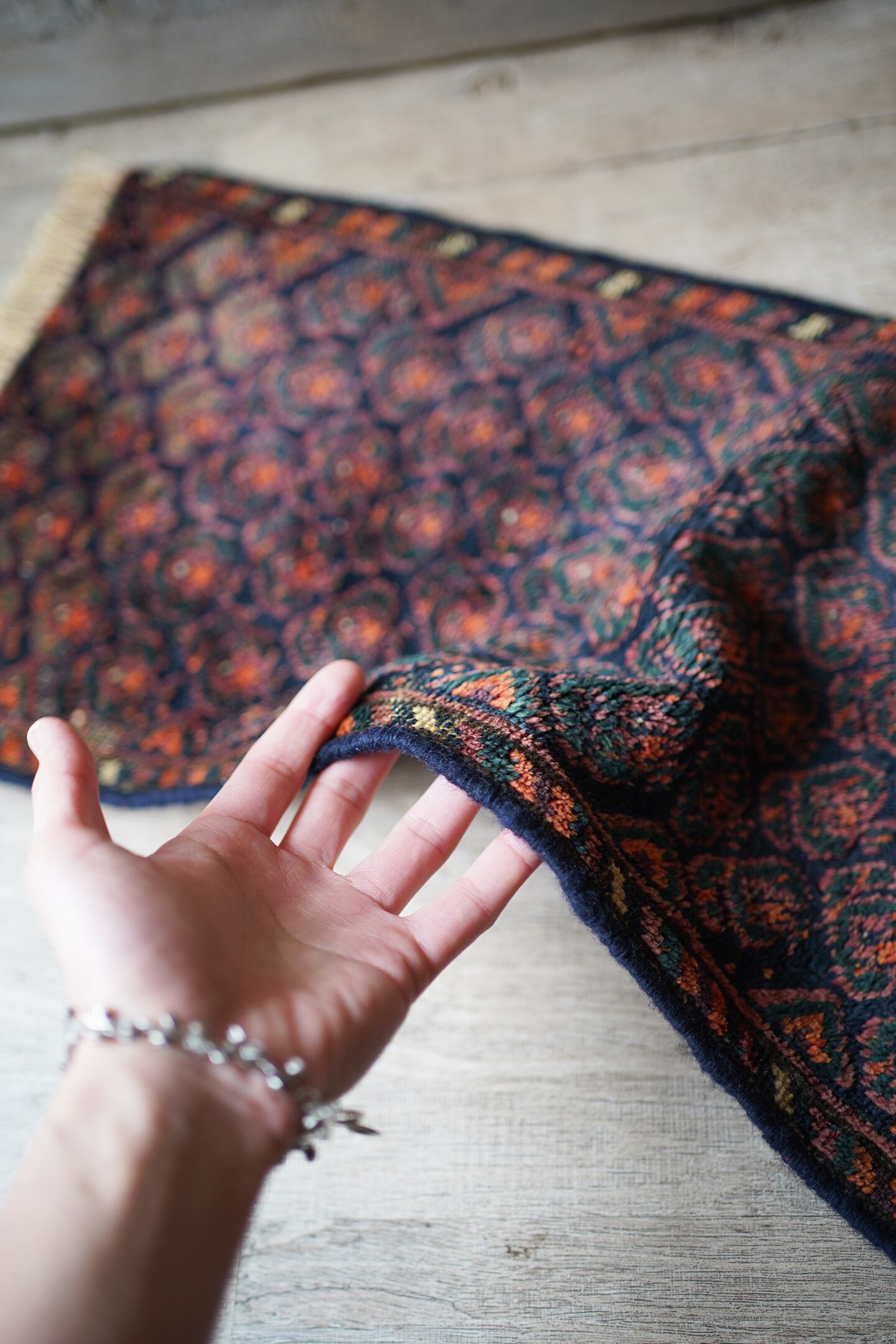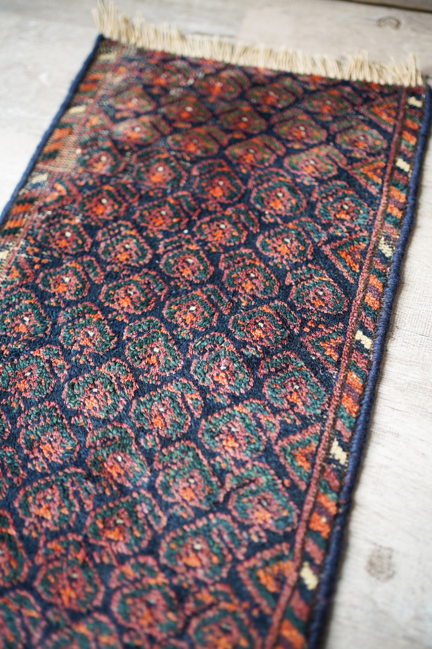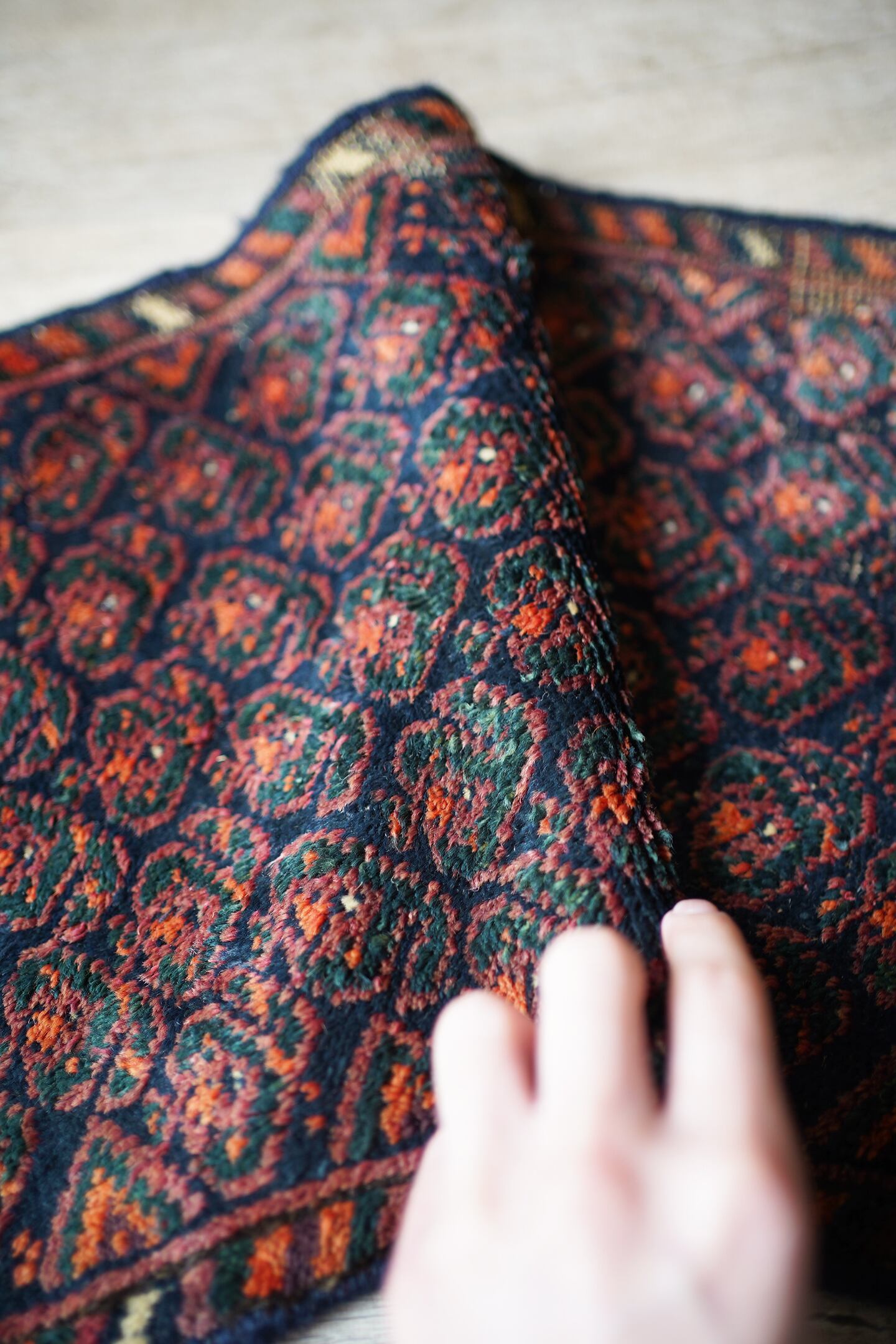 1930年〜1940年頃に織られたセミアンティークのバルーチラグ。草木染めで染色された落ち着いた配色の深緑とオレンジ、ボーダー部分のストライプのデザインも可愛らしいです。フィールドにはボテのような紋様が連続して織り込まれており、紋様部分が少しポコポコとした感触で気持ち良い質感です。滑らかで優しい肌触りで厚みは5mm程度となります。所々経年によりパイルが擦り減ってなくなっている部分がありますがホール(穴)はありません。棚の上に敷いてお気に入りの小物を置いたりするのに良さそうです♪