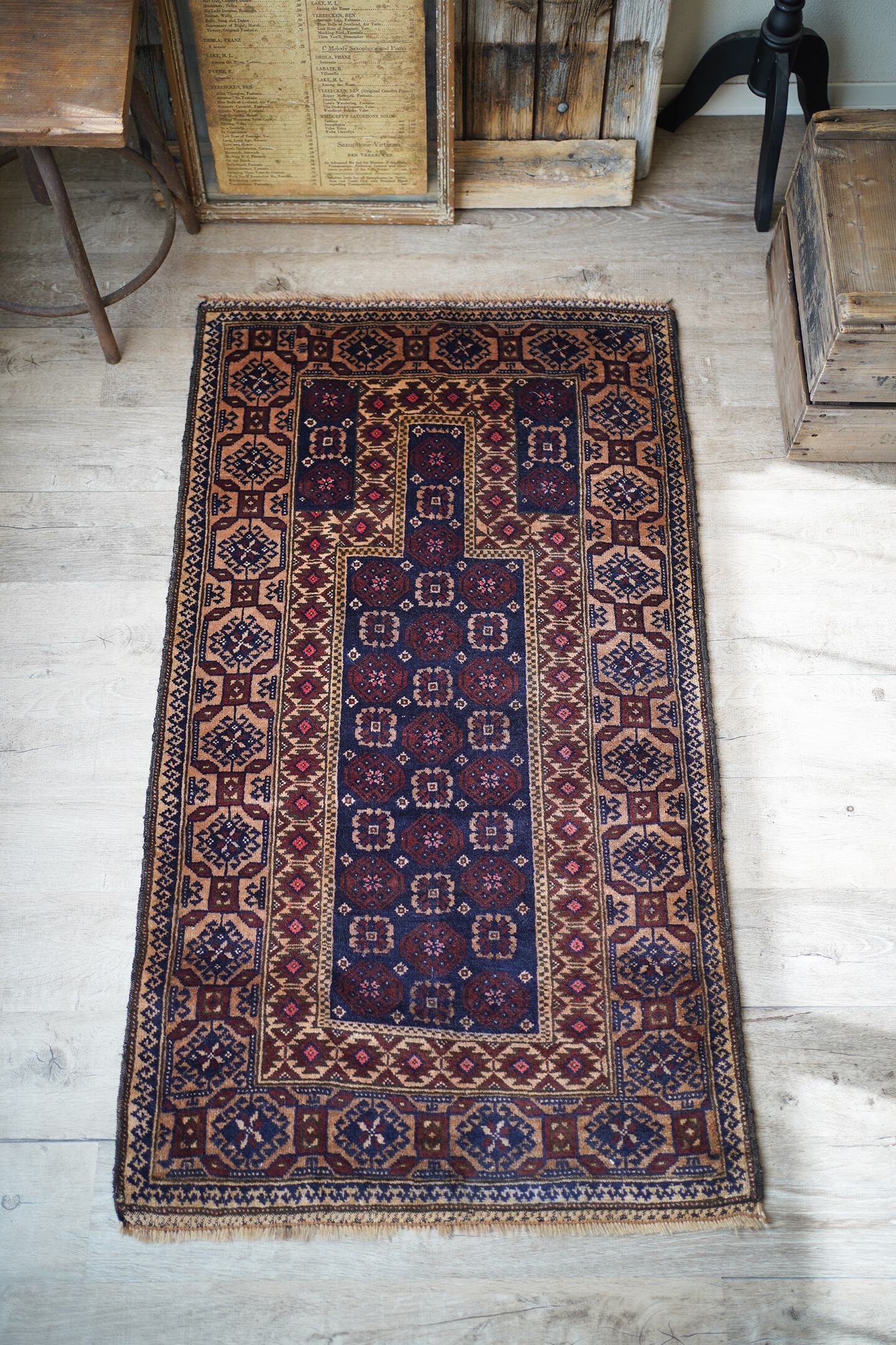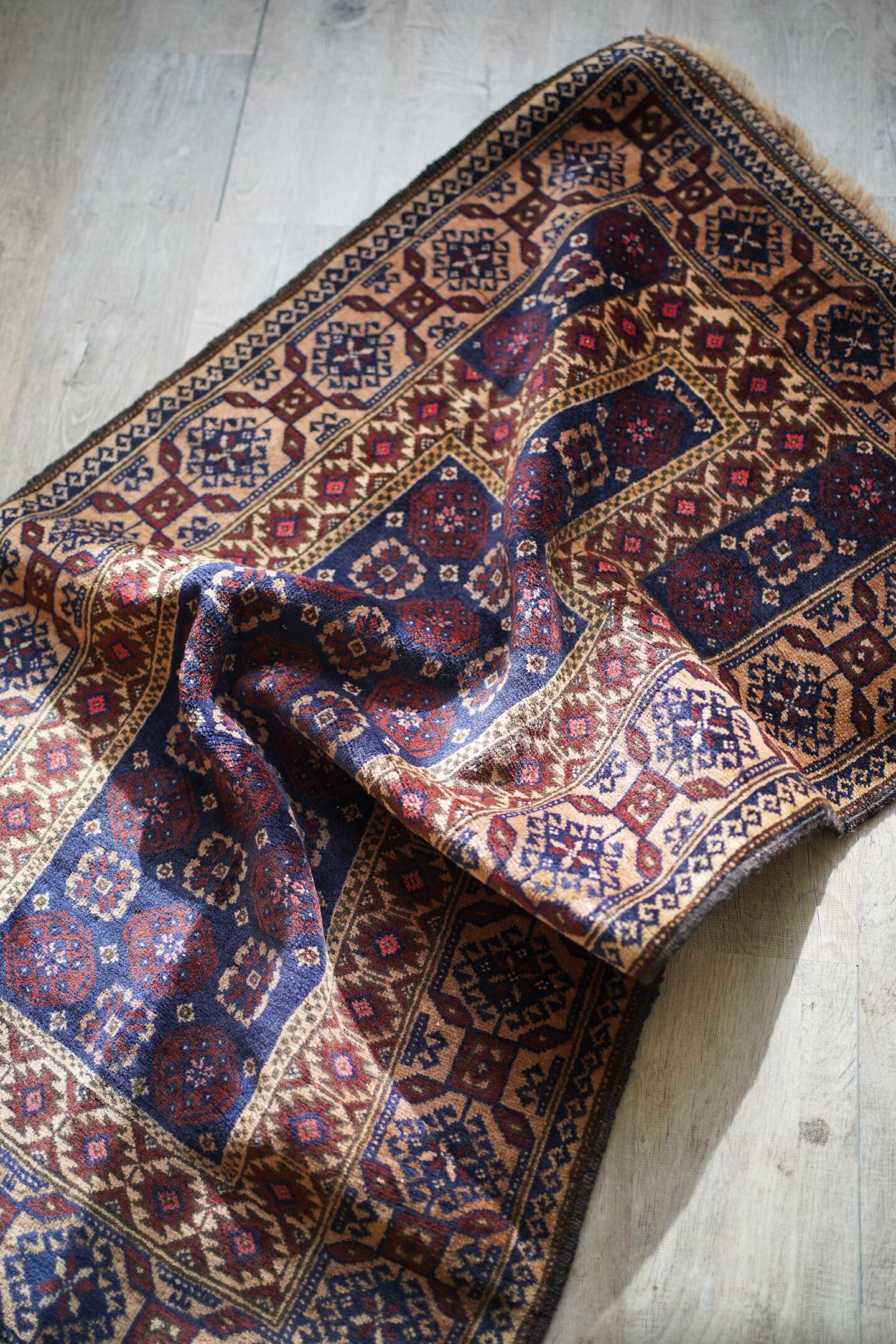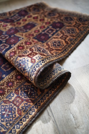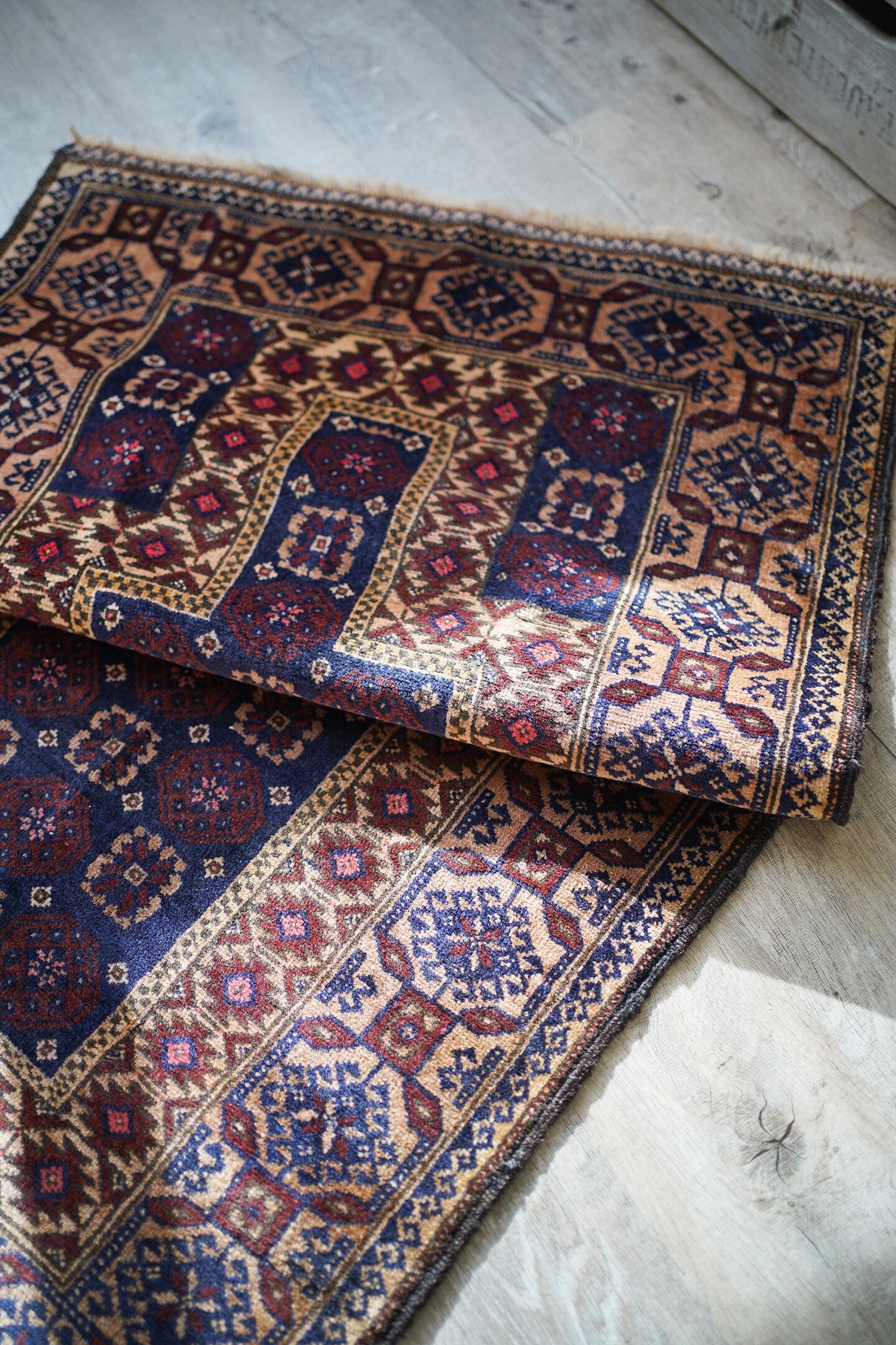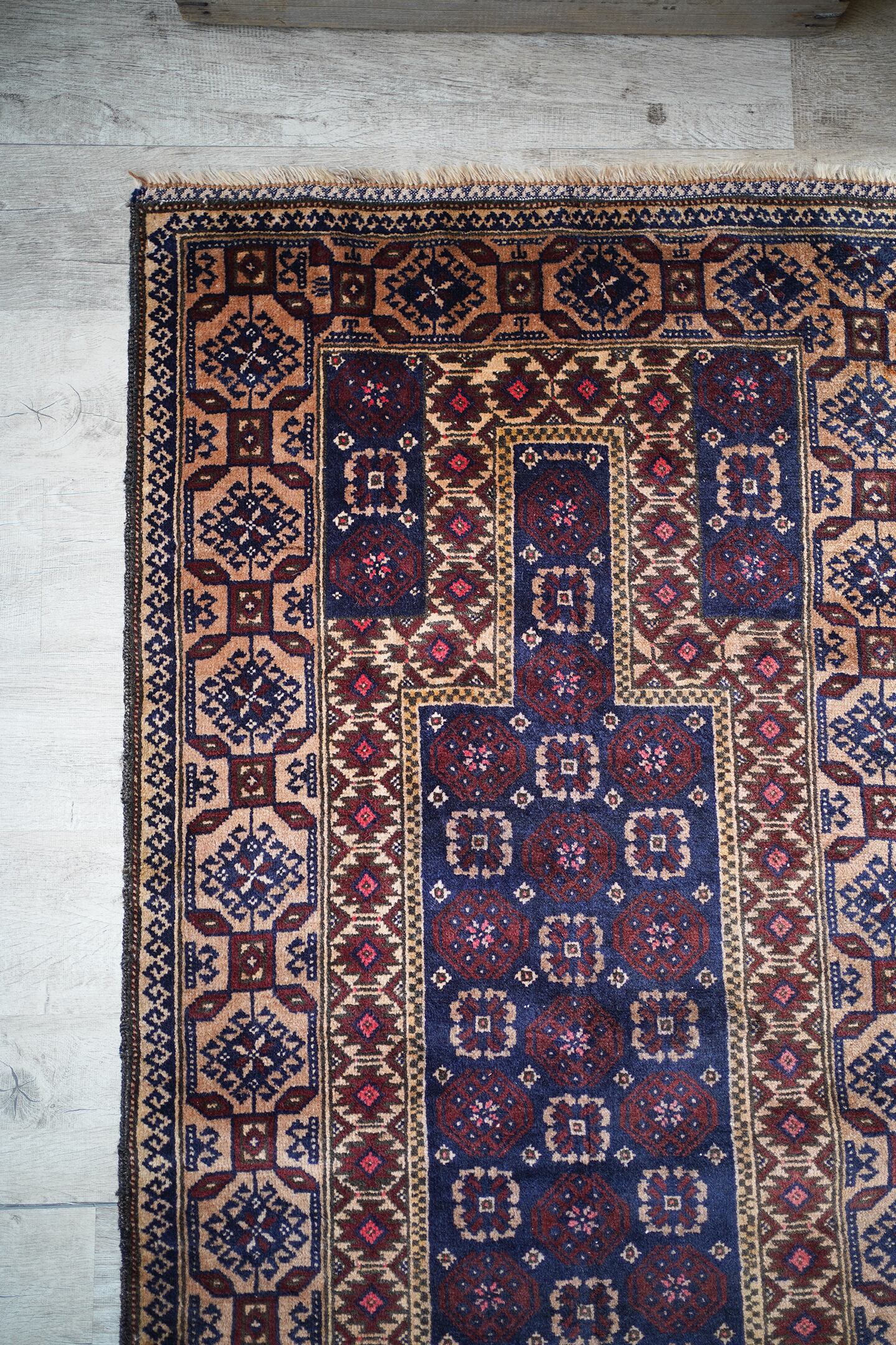 経年50年ほどのアフガニスタン産のバルーチラグ。薄めと濃いめのブラウン×ネイビーの配色に差し色でピンクのカラーリングです。ボーダーに織り込まれた菱形を雄羊の角のような柄で囲われた紋様はドラゴンを表しているとも言われています。また両サイドは短いながらもキリムエンドになっています。サラッと滑らかな肌触り、厚みは5mm〜6mm程度です。全体的な質感は柔らかく、裏面は張りがあります。繊細なデザインながら落ち着いた色味なので、どんなお部屋にもスッと馴染んでくれそうな一枚です。