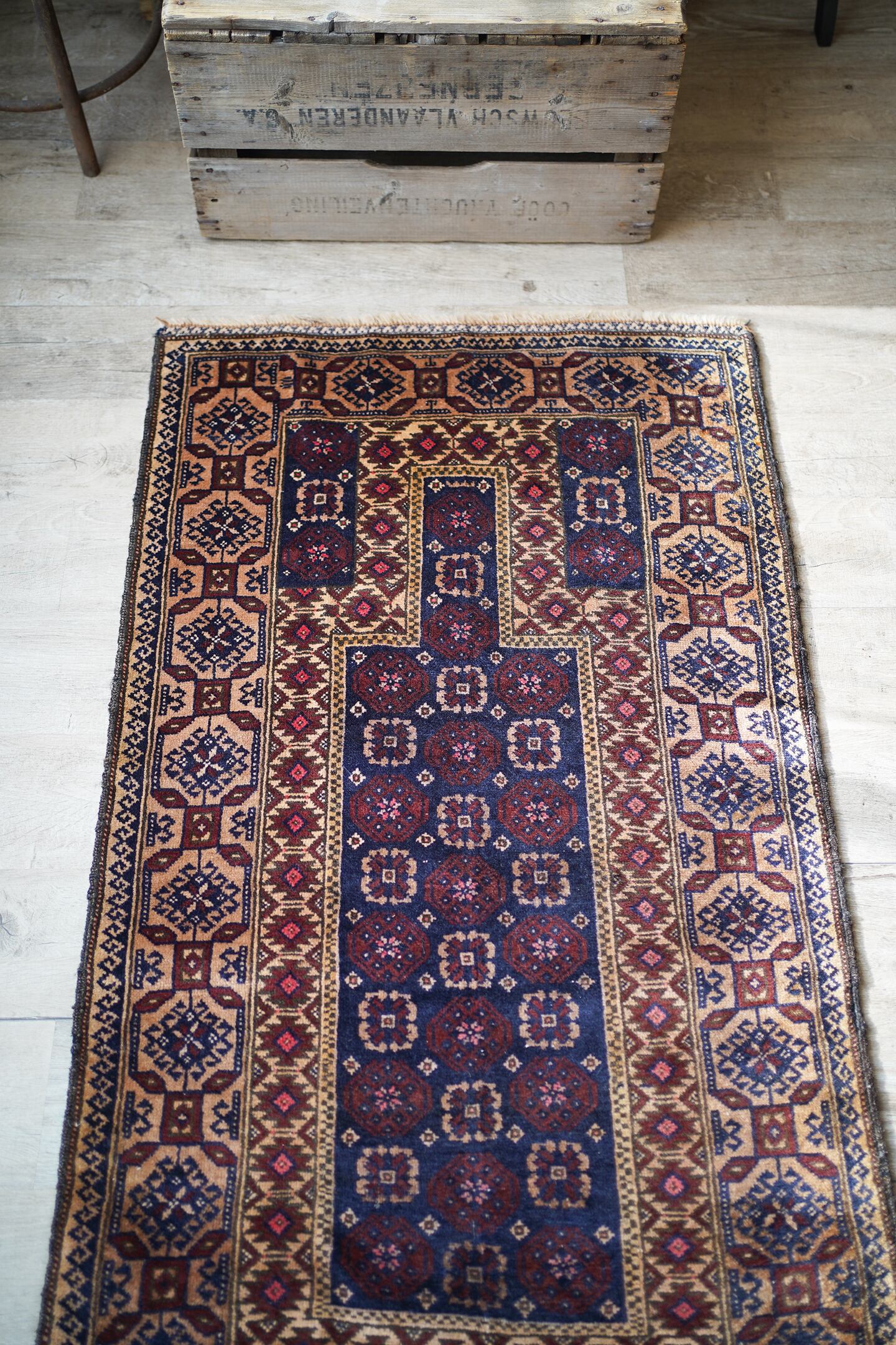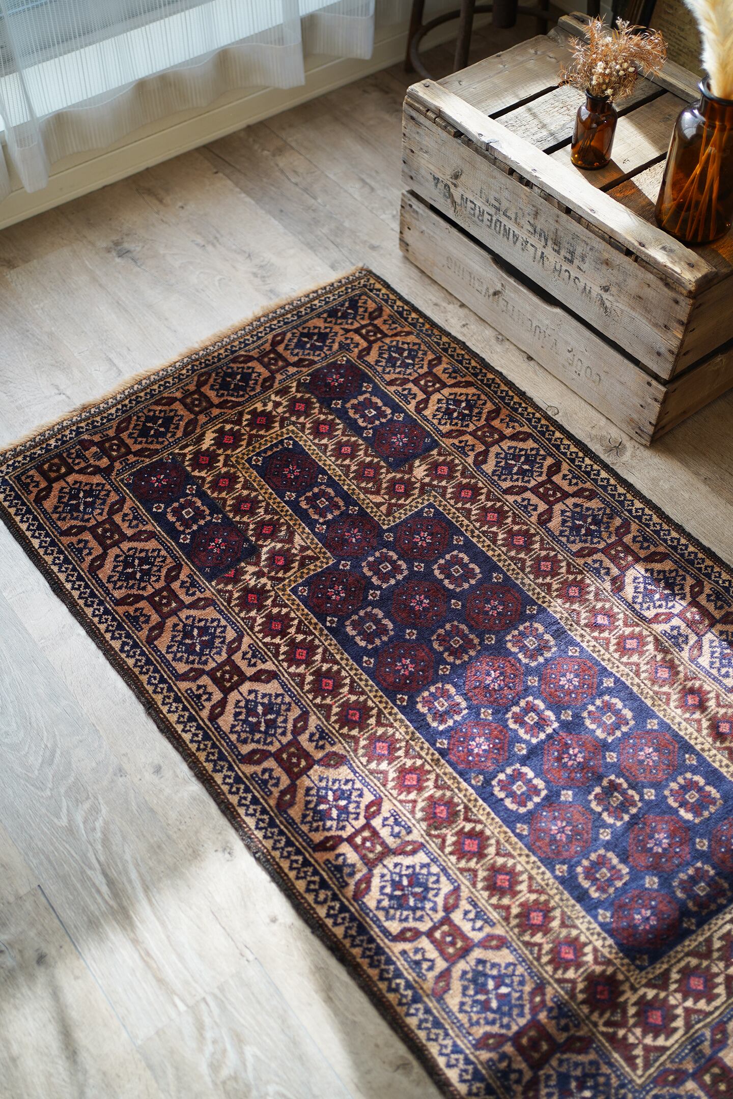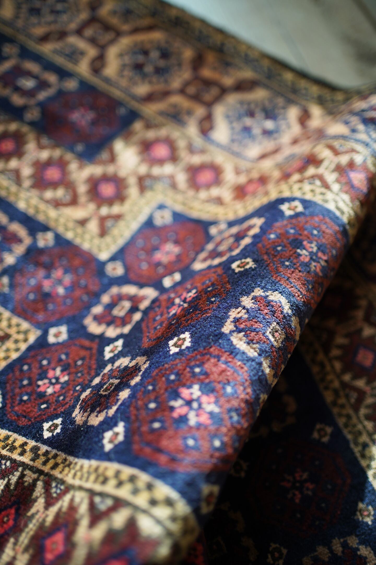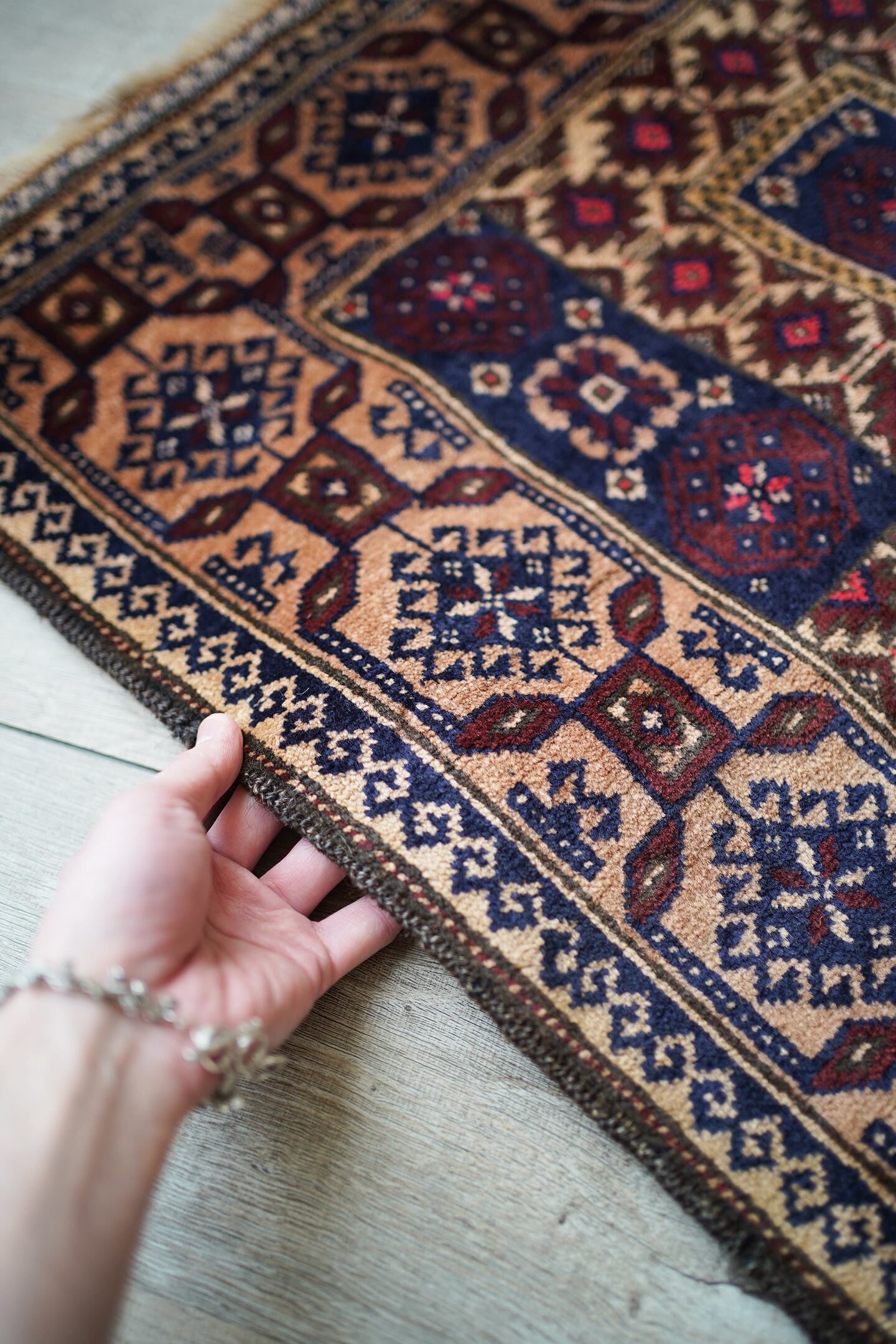経年50年ほどのアフガニスタン産のバルーチラグ。薄めと濃いめのブラウン×ネイビーの配色に差し色でピンクのカラーリングです。ボーダーに織り込まれた菱形を雄羊の角のような柄で囲われた紋様はドラゴンを表しているとも言われています。また両サイドは短いながらもキリムエンドになっています。サラッと滑らかな肌触り、厚みは5mm〜6mm程度です。全体的な質感は柔らかく、裏面は張りがあります。繊細なデザインながら落ち着いた色味なので、どんなお部屋にもスッと馴染んでくれそうな一枚です。