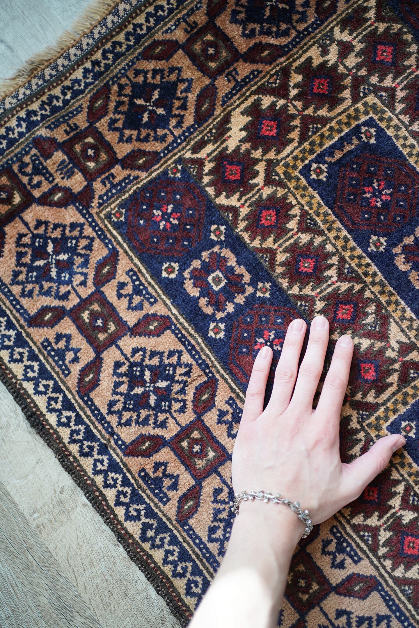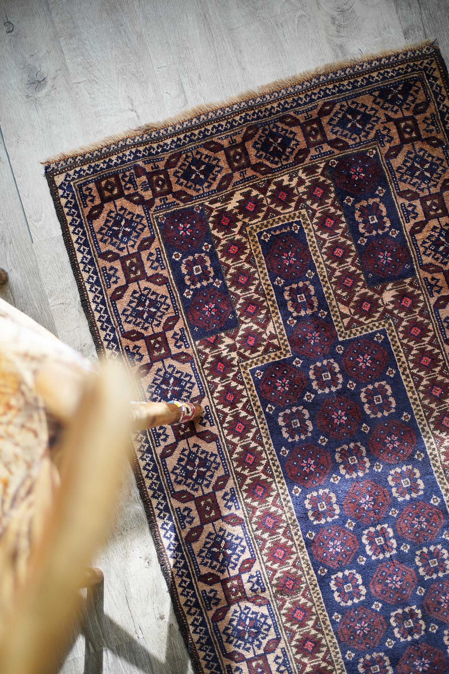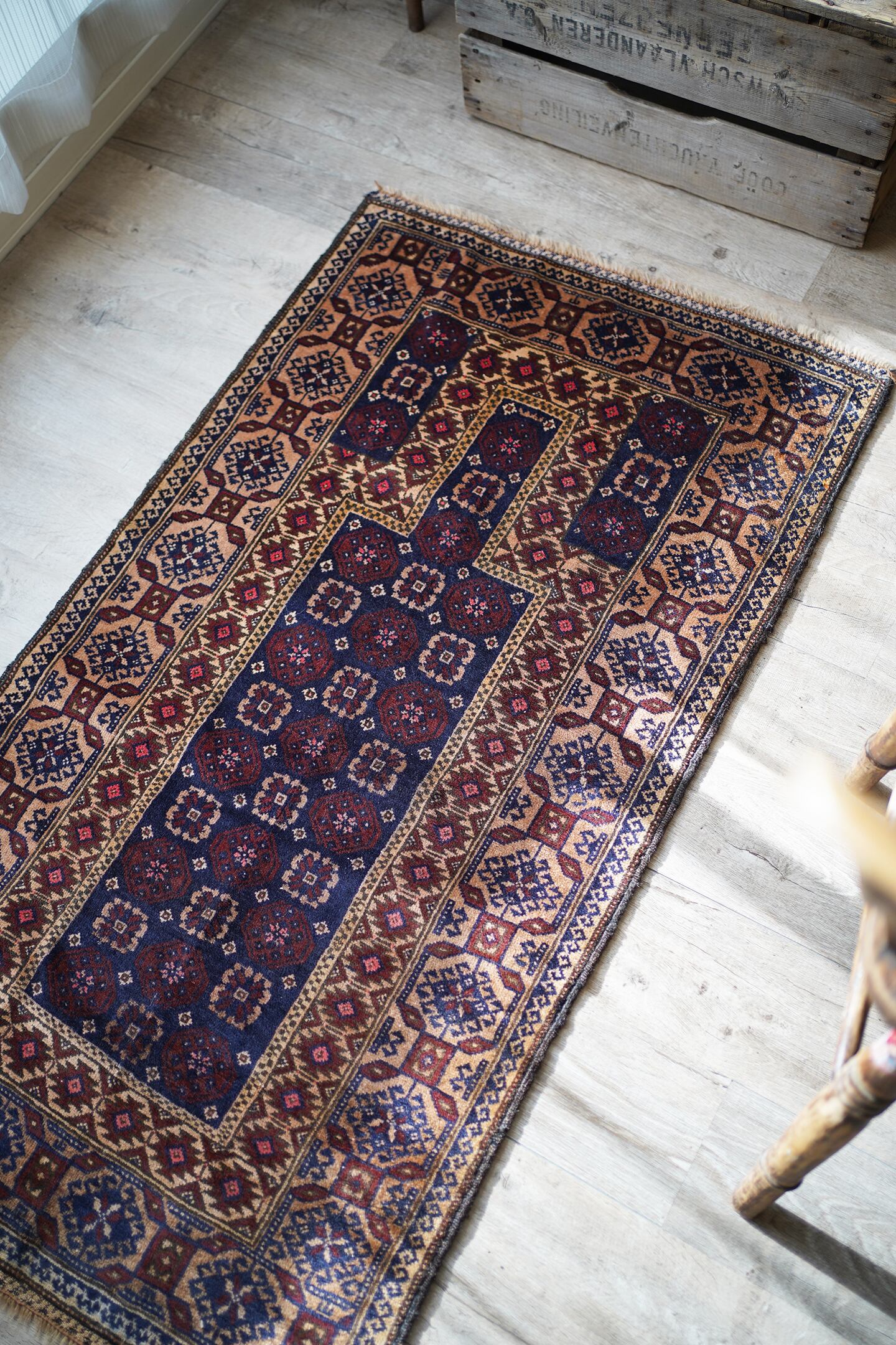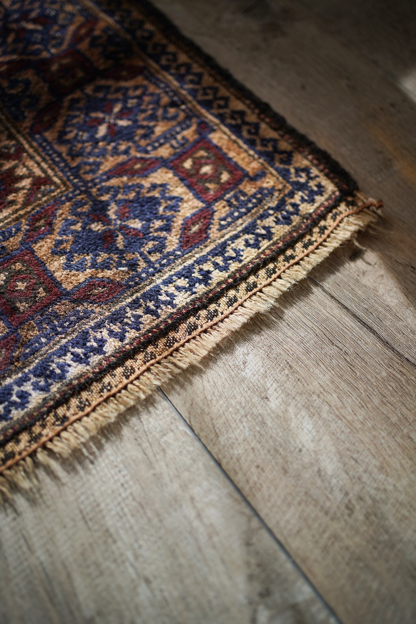 経年50年ほどのアフガニスタン産のバルーチラグ。薄めと濃いめのブラウン×ネイビーの配色に差し色でピンクのカラーリングです。ボーダーに織り込まれた菱形を雄羊の角のような柄で囲われた紋様はドラゴンを表しているとも言われています。また両サイドは短いながらもキリムエンドになっています。サラッと滑らかな肌触り、厚みは5mm〜6mm程度です。全体的な質感は柔らかく、裏面は張りがあります。繊細なデザインながら落ち着いた色味なので、どんなお部屋にもスッと馴染んでくれそうな一枚です。