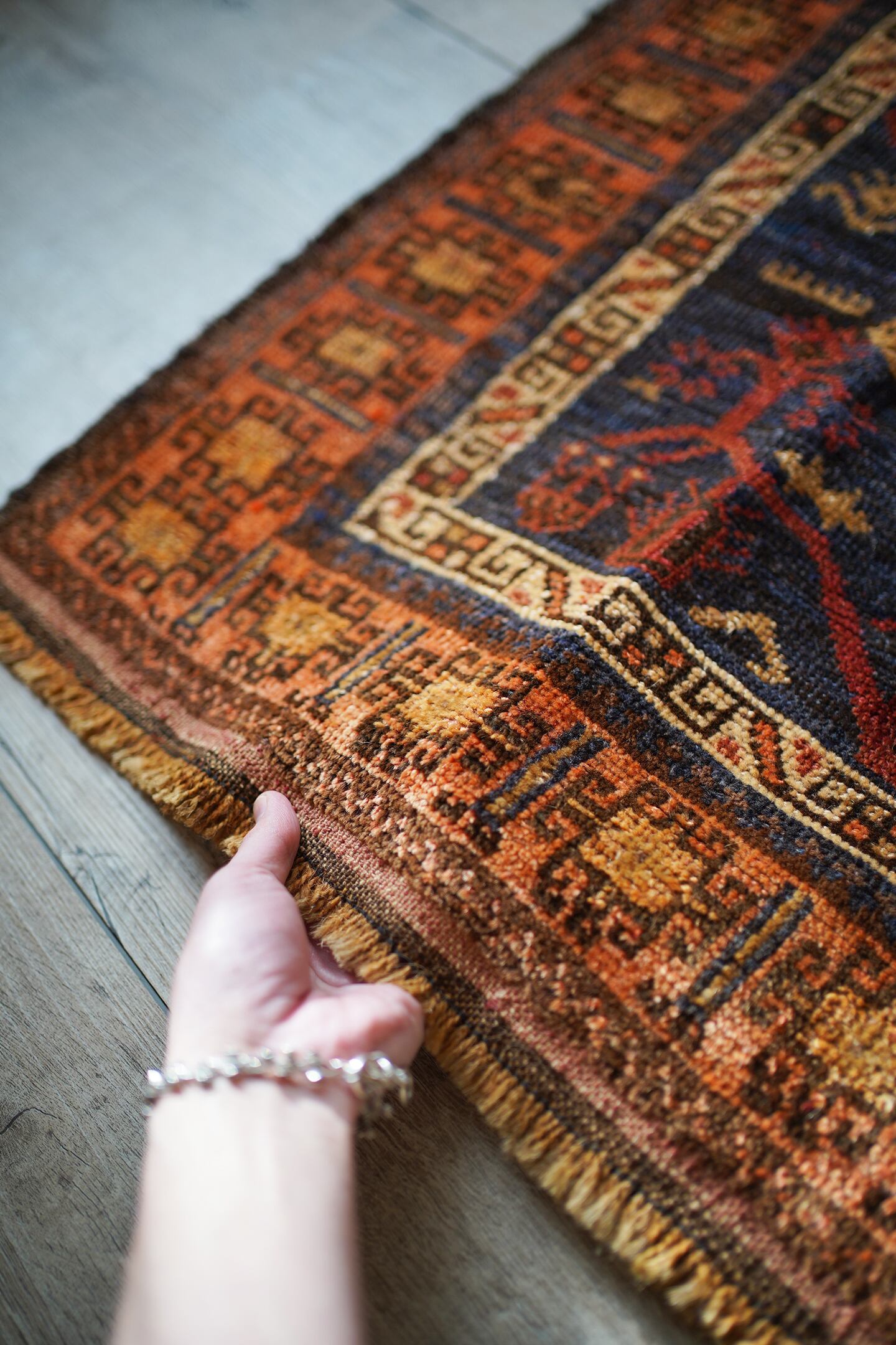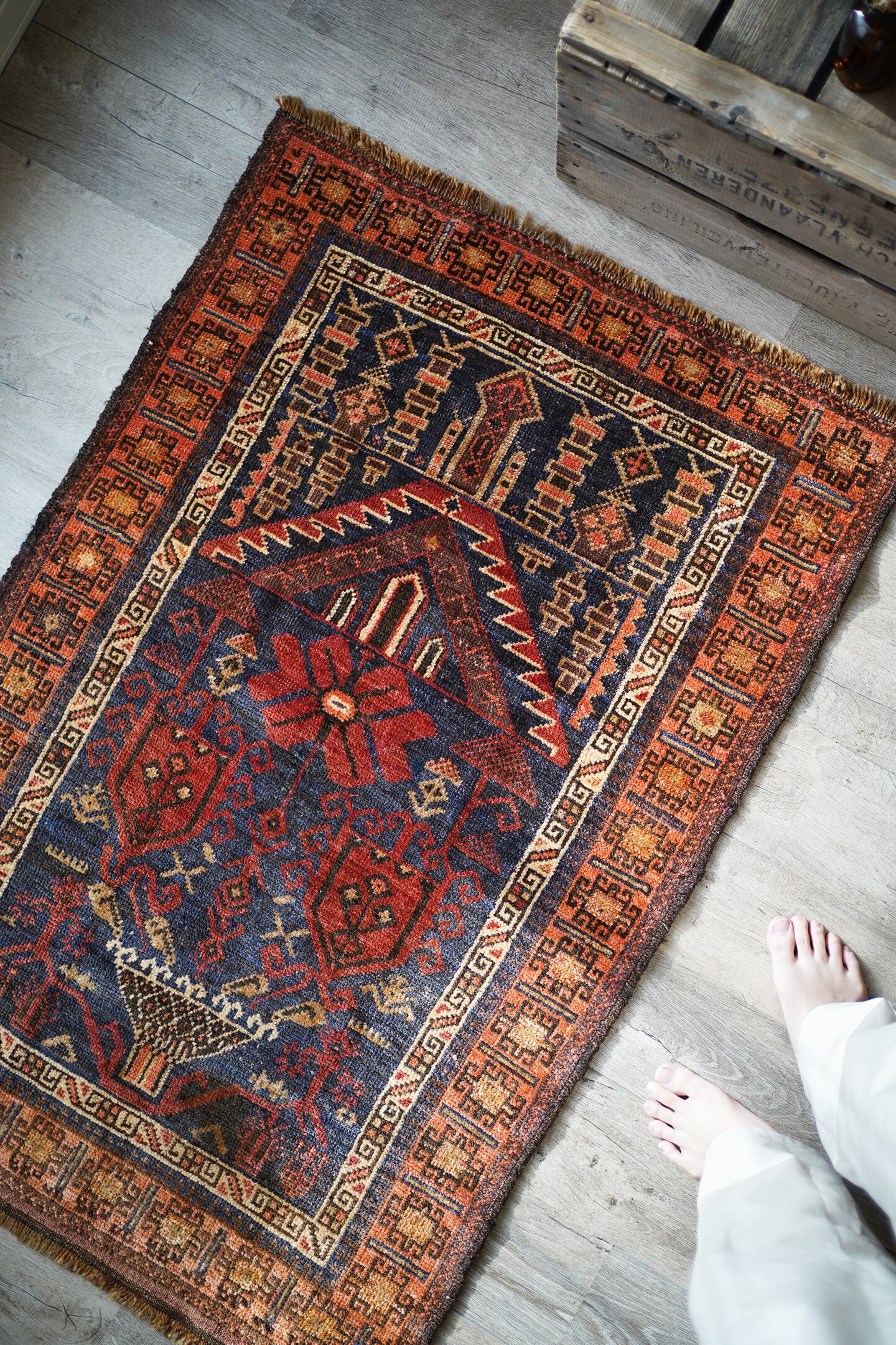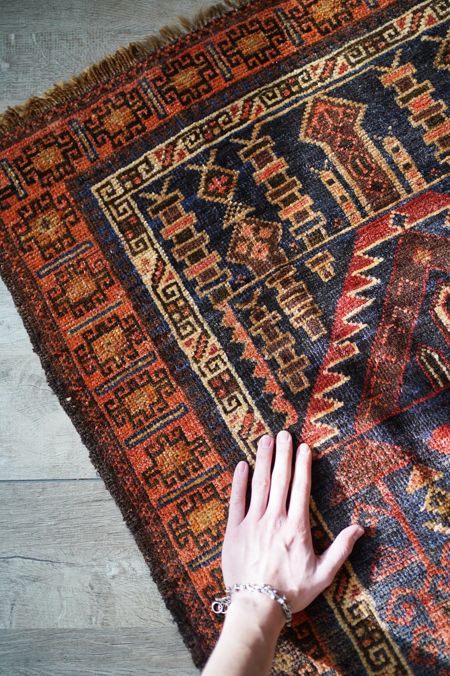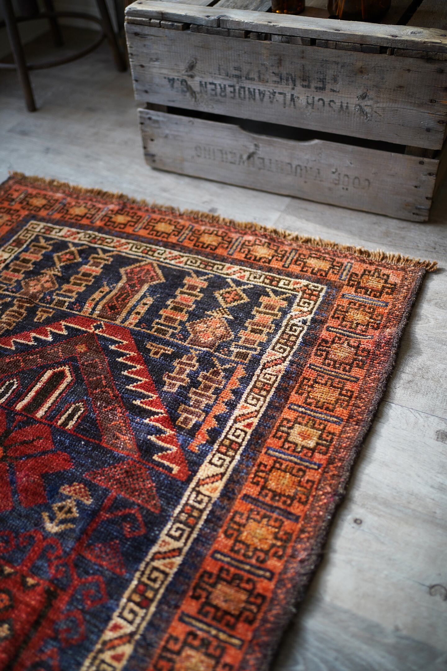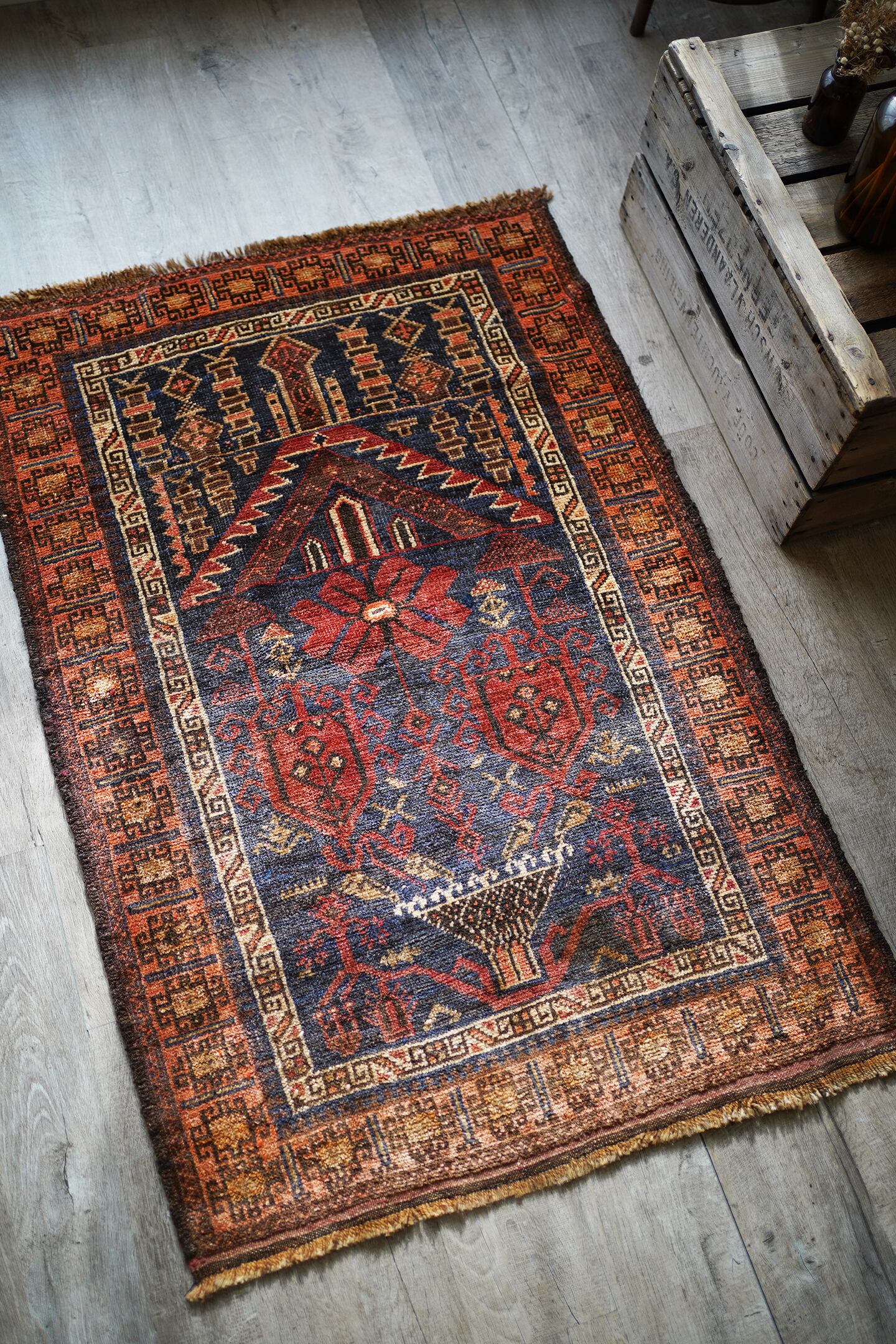 おおよそ70年前のアフガン産のバルーチラグ。印象的なオレンジ色のボーダーに、フィールドには艶のあるネイビー、花瓶に飾られた赤い花の紋様が織り込まれています。ふわっと柔らかい優しい肌触りで、5mm〜6mm程度の厚みです。お気に入りのスペースがパッと明るくなりそうなラグですね♪