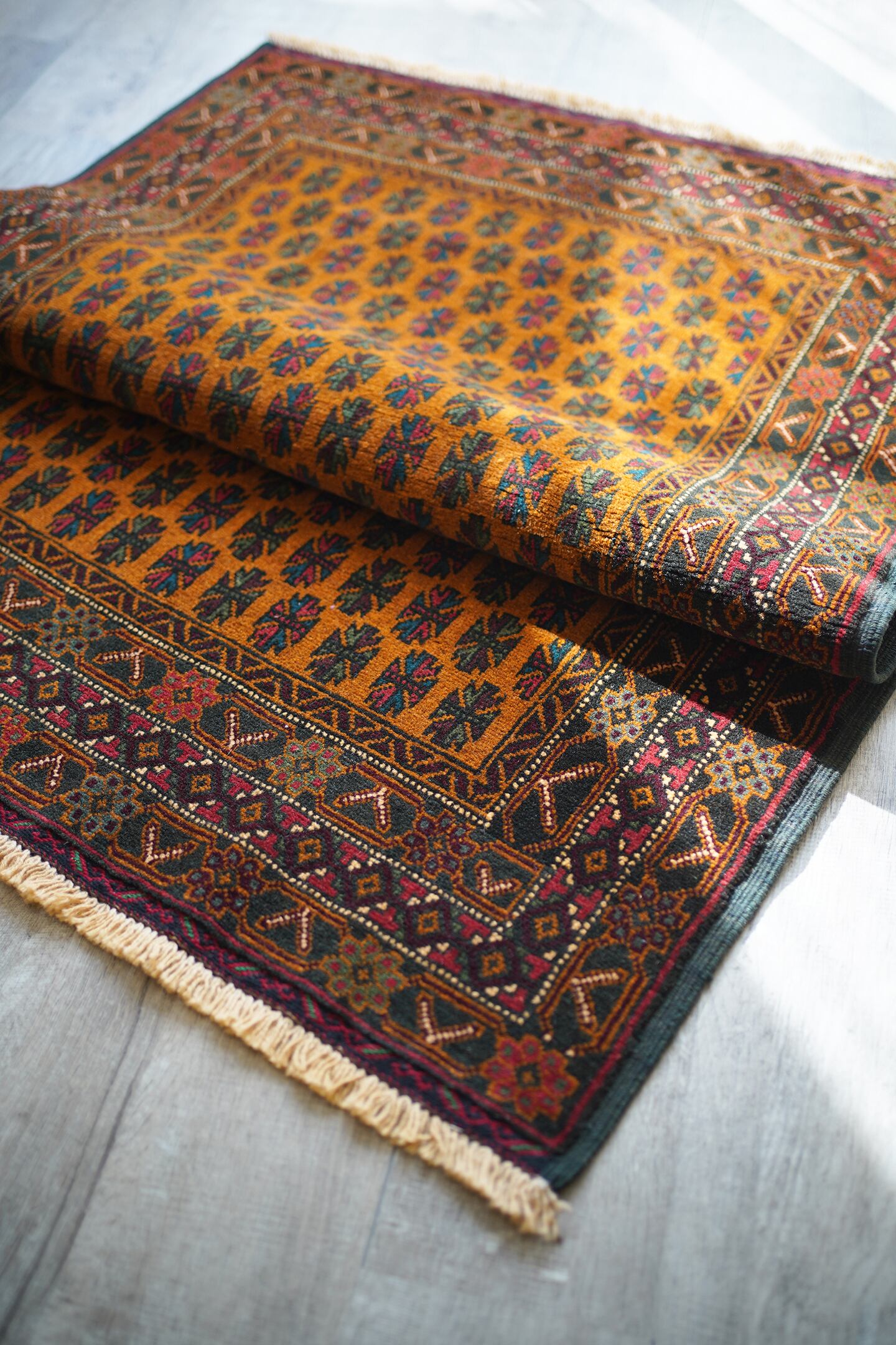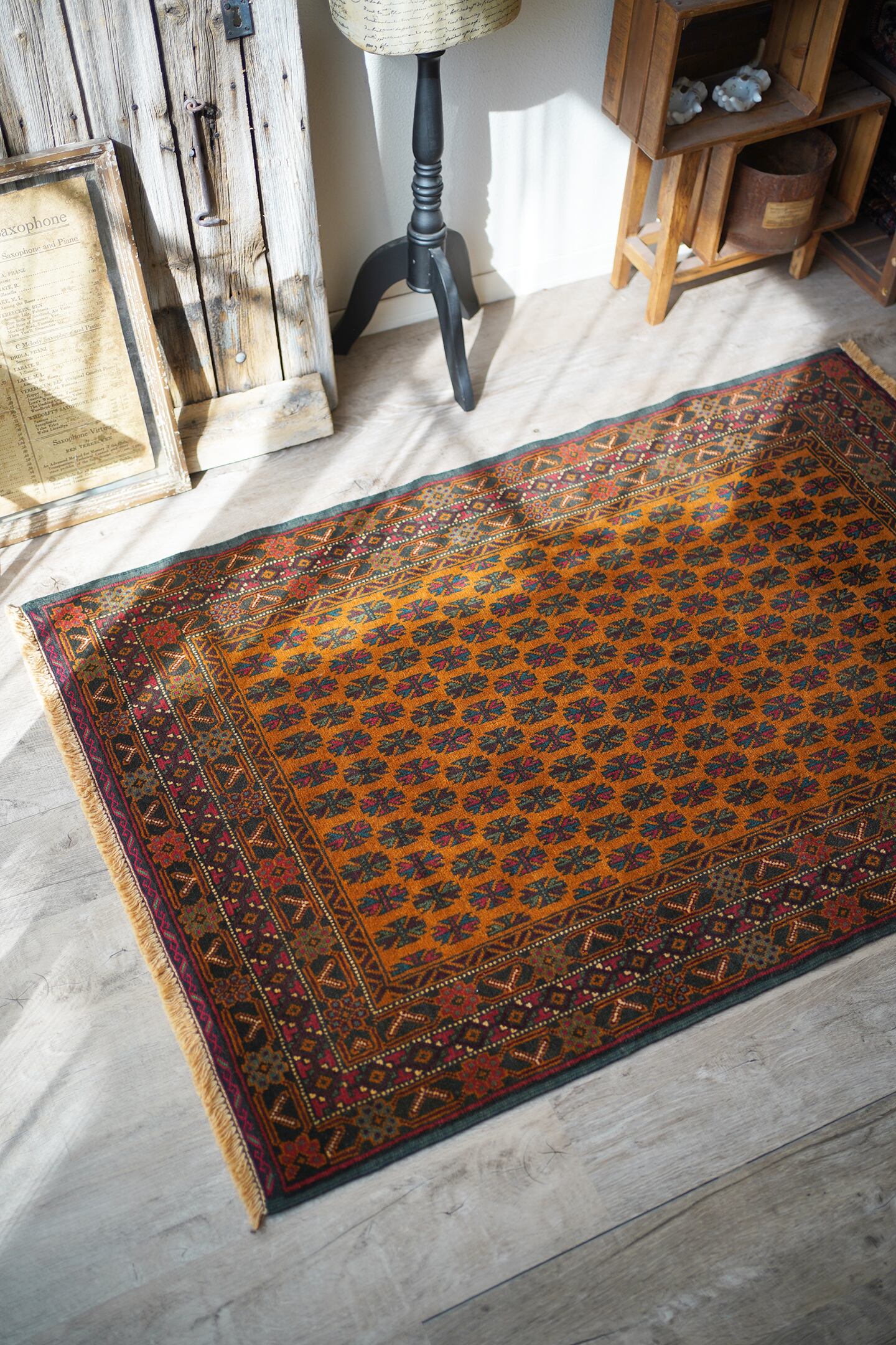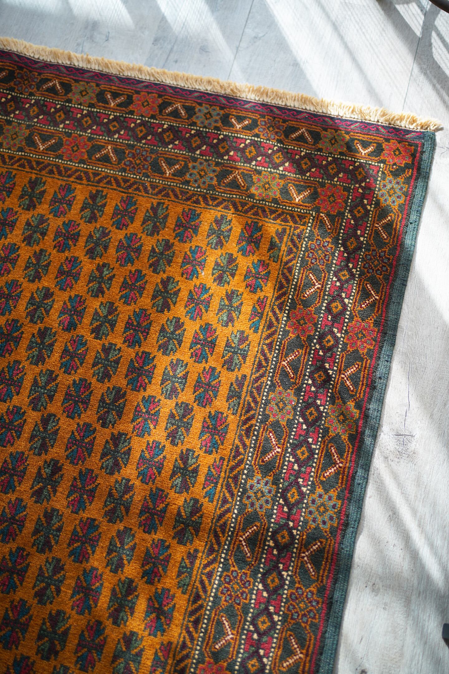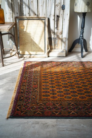 オレンジとブラウンの中間のような色味が特徴的な経年40年ほどのアフガンバルーチ。アフガニスタンに居住するマリキというバルーチ族の家族が織ったラグで、普段は上質なキリムを織っているマリキですが、クオリティの高いラグも作り始めているそうです。フィールドには"チナール"と呼ばれるポプラや楓のような形の葉っぱの紋様が織り込まれています。全体的に状態と仕立てが良く、パイルの長さの均一感含めて上質な一枚。コンディションもパーフェクトです。表面の毛並みはサラッと柔らかで大変気持ちの良い肌触り。6mm〜7mm程度の程よい厚みがあります。リビングや書斎などで机の前に敷いたりしても良さそうな一枚です♪
