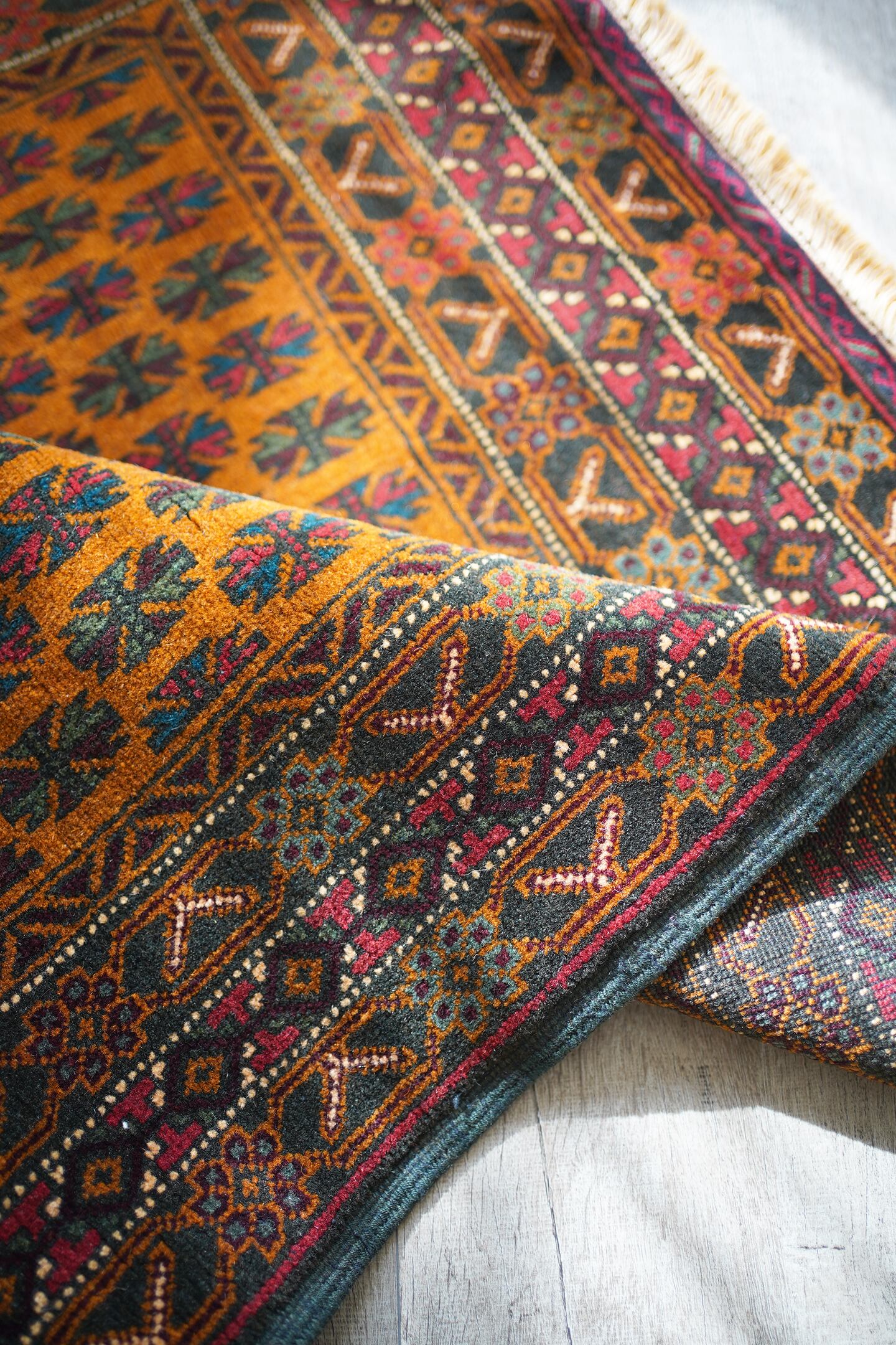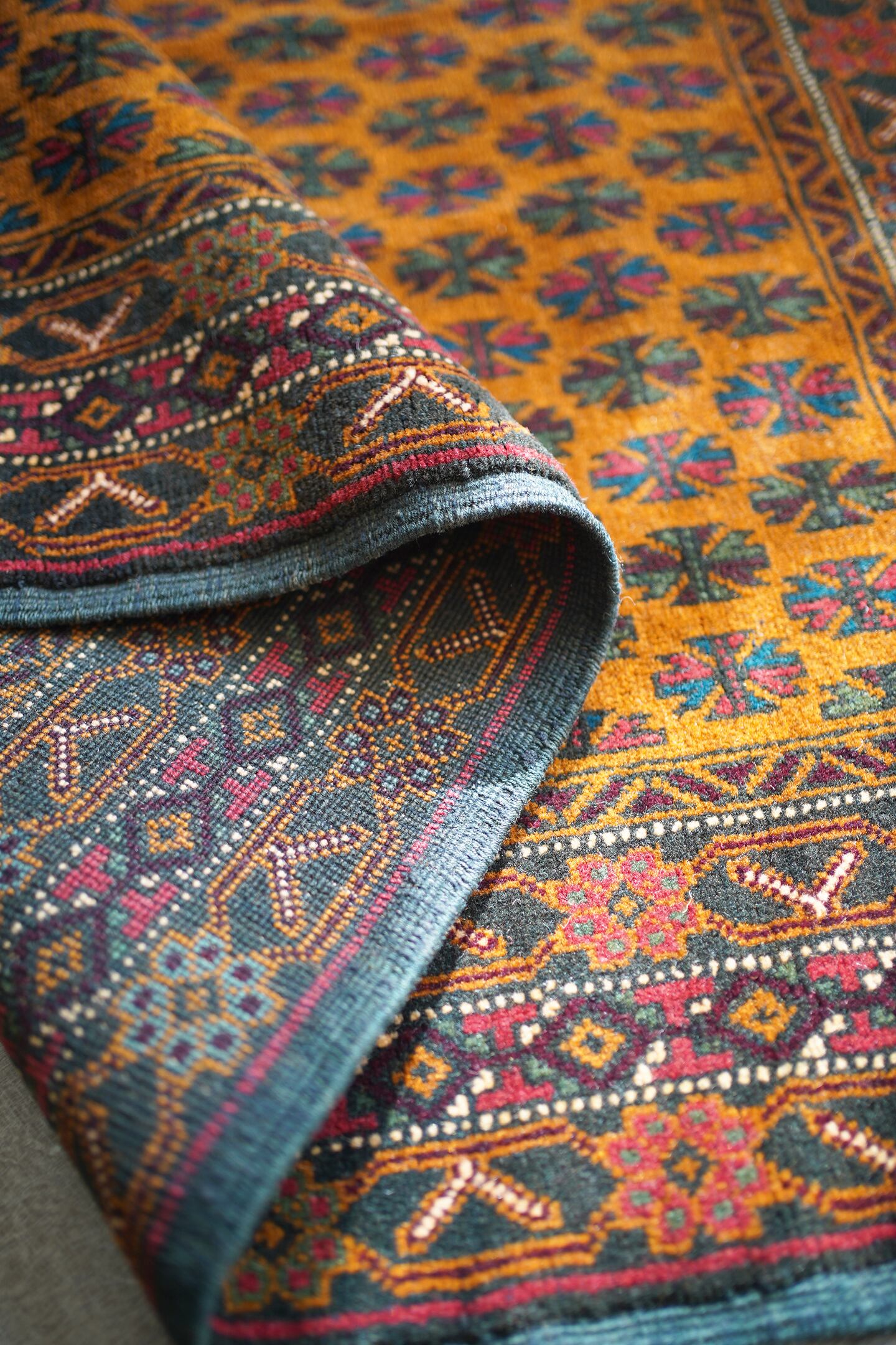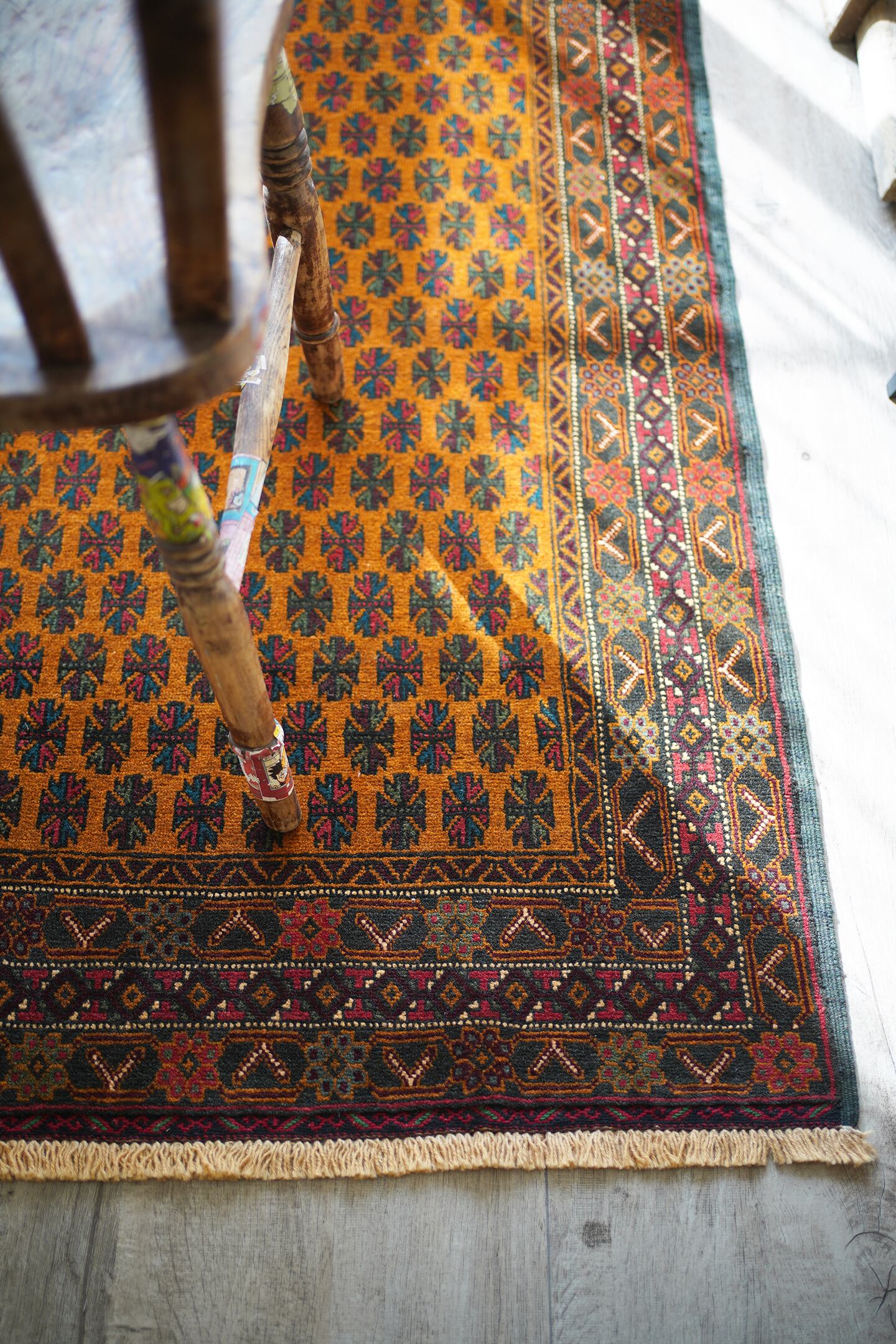 オレンジとブラウンの中間のような色味が特徴的な経年40年ほどのアフガンバルーチ。アフガニスタンに居住するマリキというバルーチ族の家族が織ったラグで、普段は上質なキリムを織っているマリキですが、クオリティの高いラグも作り始めているそうです。フィールドには"チナール"と呼ばれるポプラや楓のような形の葉っぱの紋様が織り込まれています。全体的に状態と仕立てが良く、パイルの長さの均一感含めて上質な一枚。コンディションもパーフェクトです。表面の毛並みはサラッと柔らかで大変気持ちの良い肌触り。6mm〜7mm程度の程よい厚みがあります。リビングや書斎などで机の前に敷いたりしても良さそうな一枚です♪