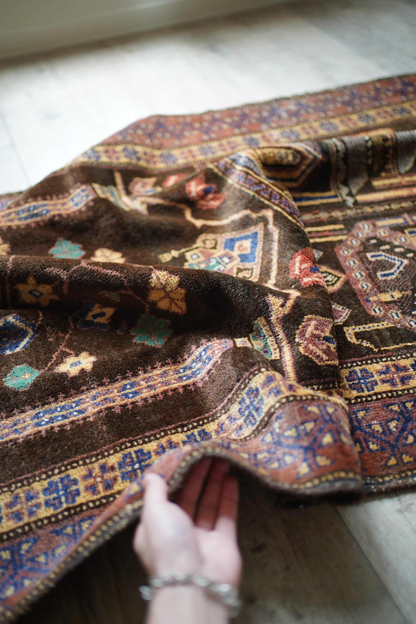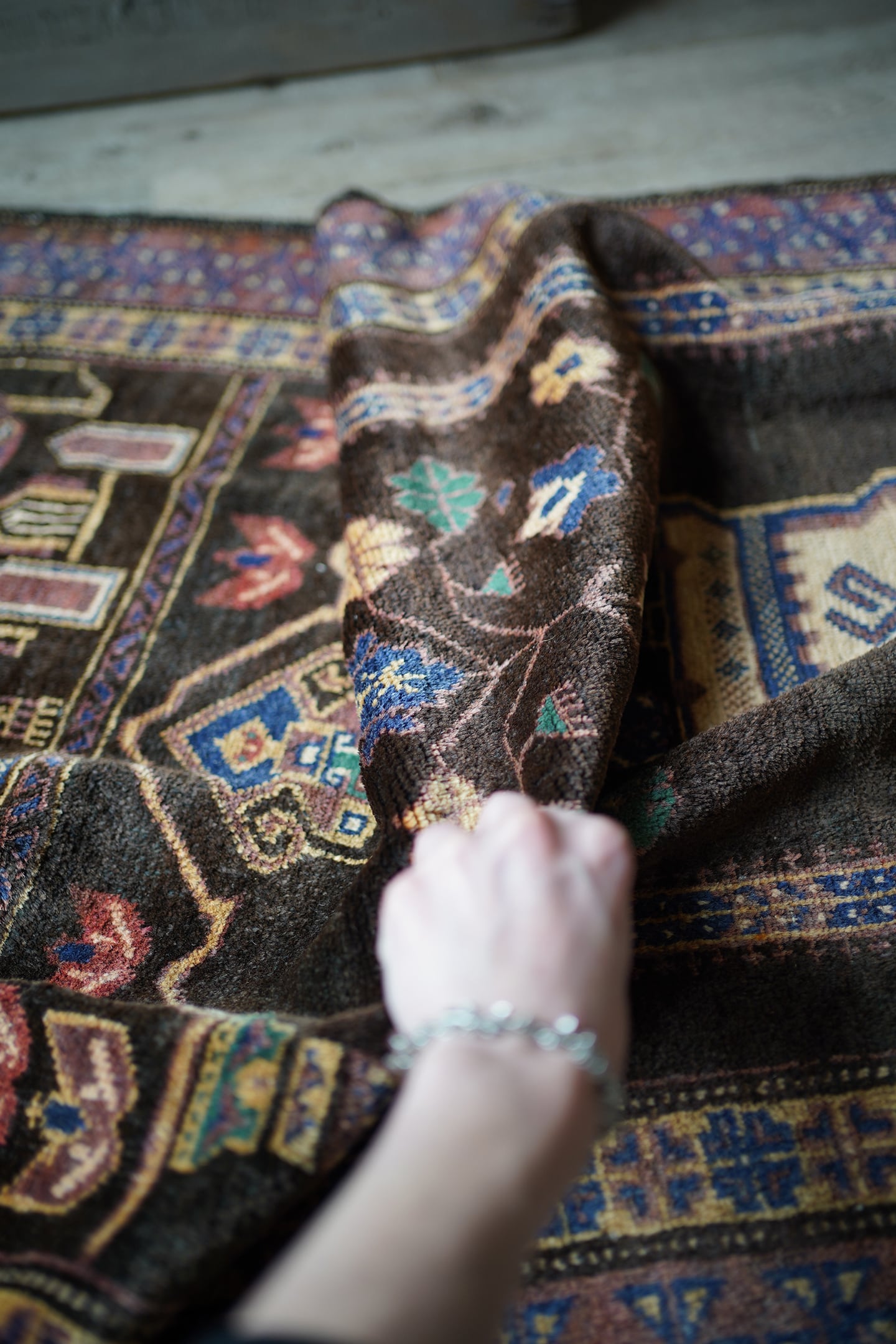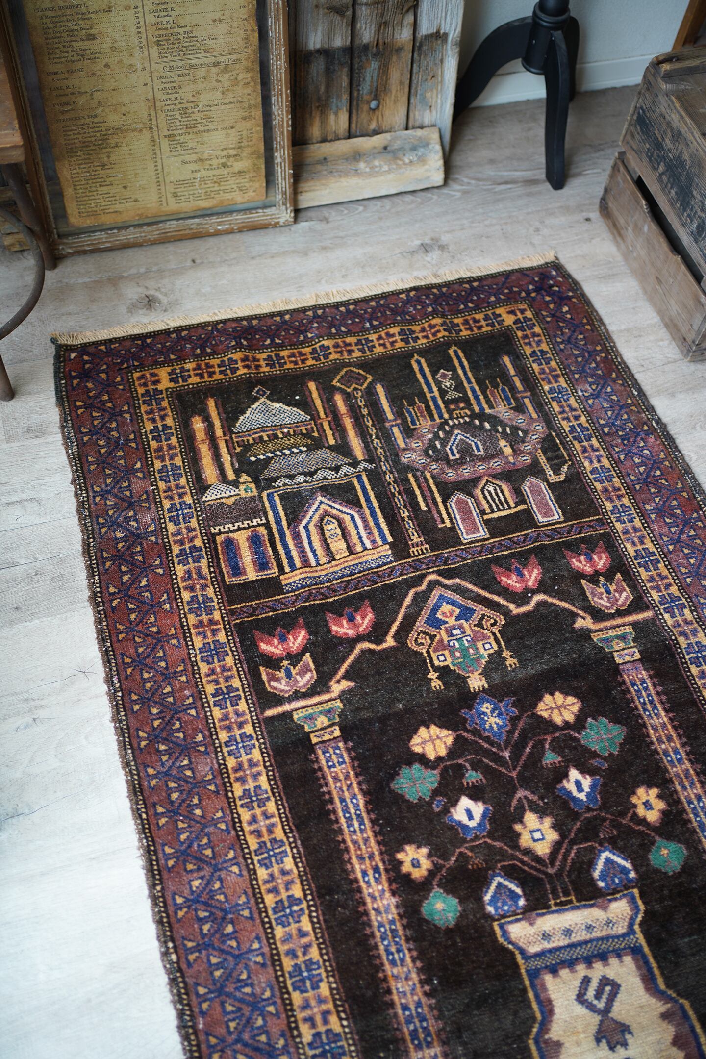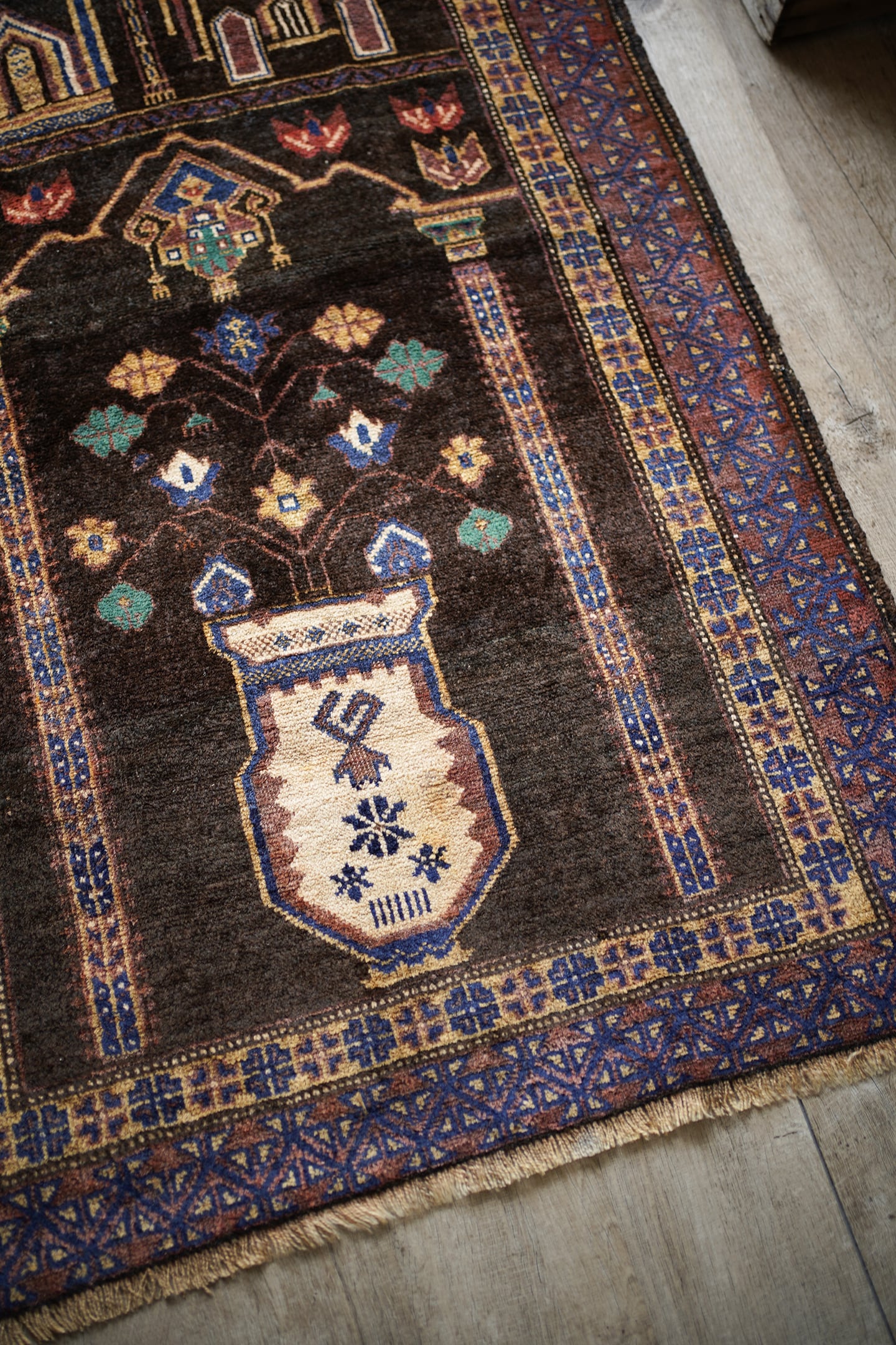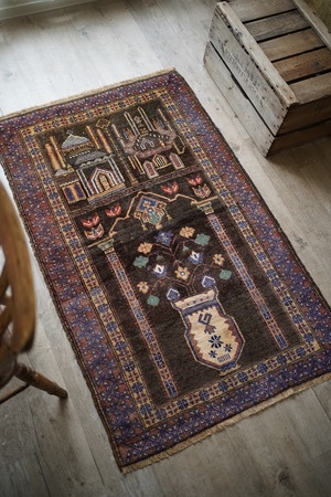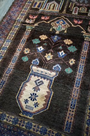 おおよそ50年前のアフガニスタン産のバルーチプレイヤーラグ。艶のあるブラウン色に花瓶に飾られた花が象徴的で、可愛さと渋さを兼ね備えた一枚。エメラルドグリーンやベージュ、ネイビーなどの色とりどりの花がとっても素敵です。しなやかで優しい肌触り、4mm〜5mm程度で比較的薄めの質感です。目立った補修跡もなく状態も良好。落ち着いた色合いなので、様々な家具に合わせやすいラグかと思います。