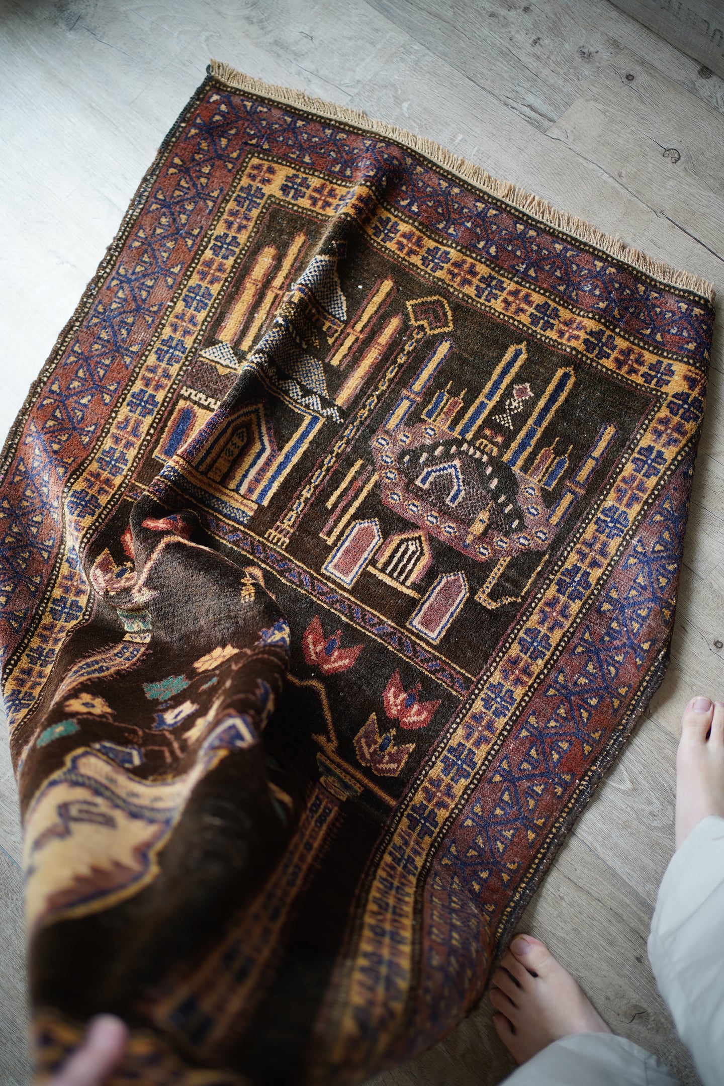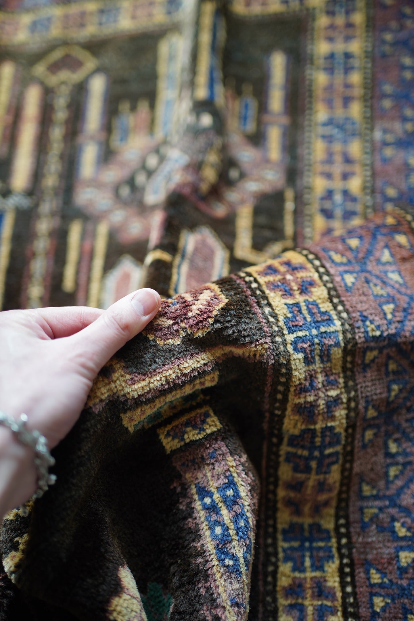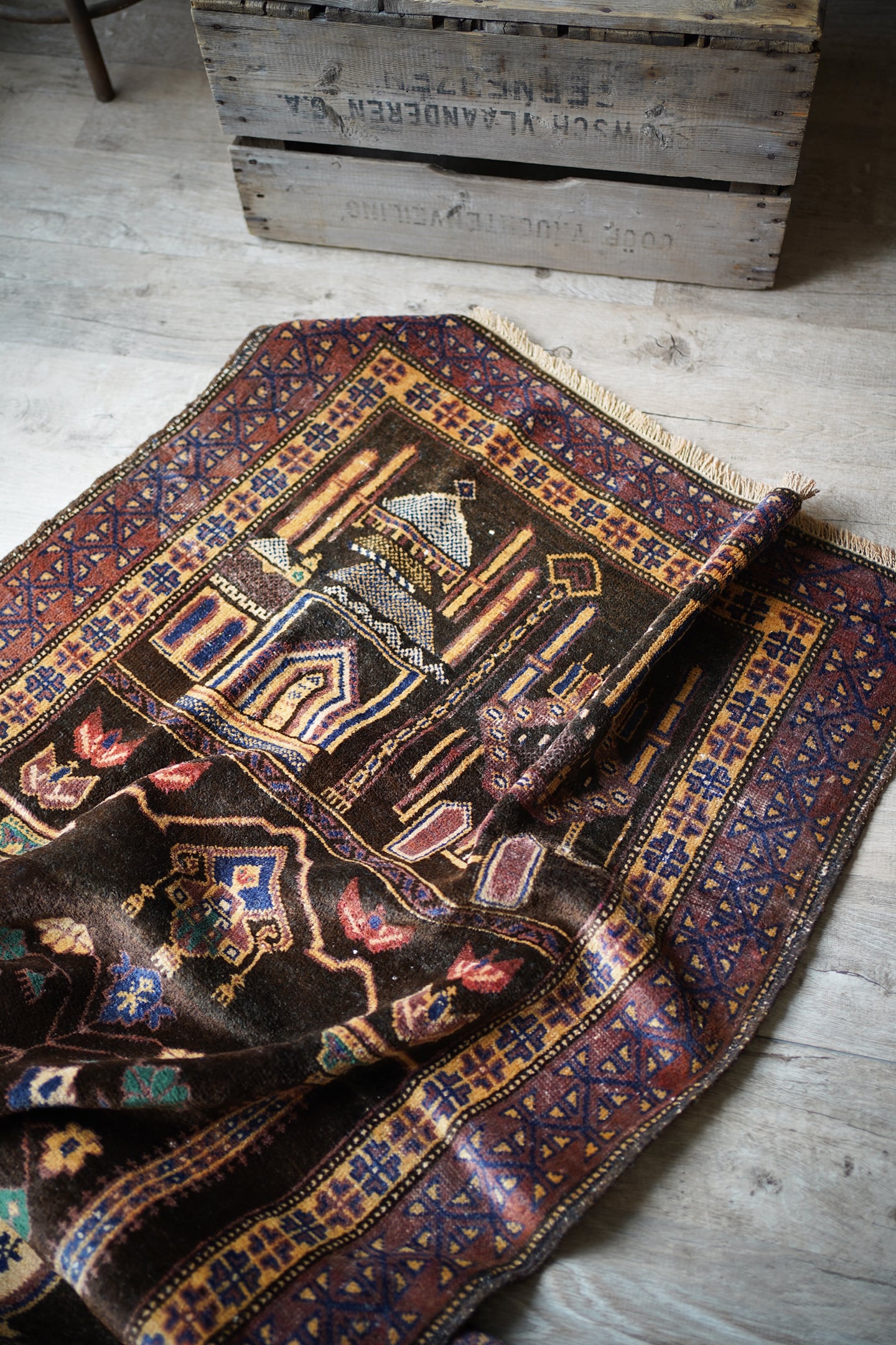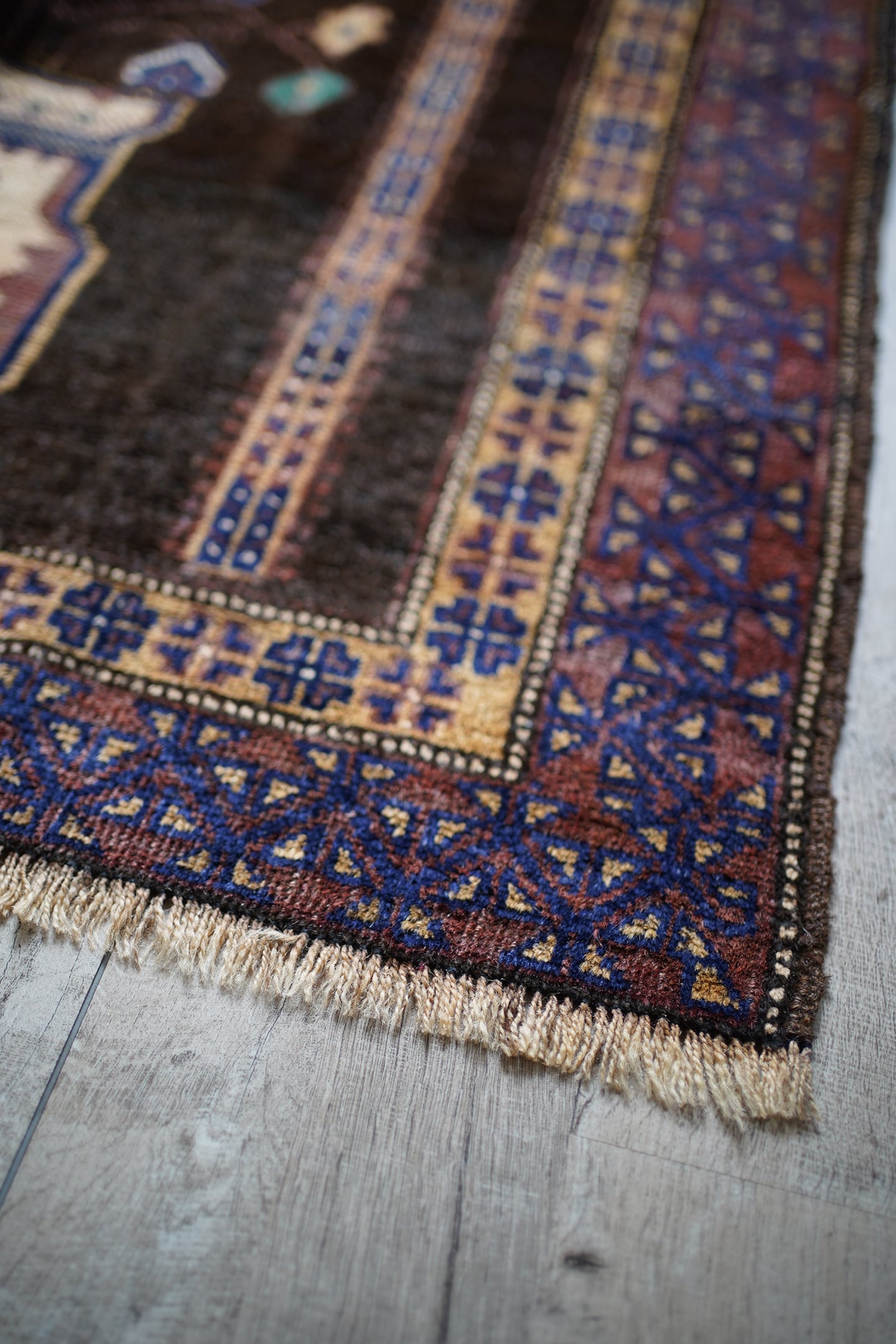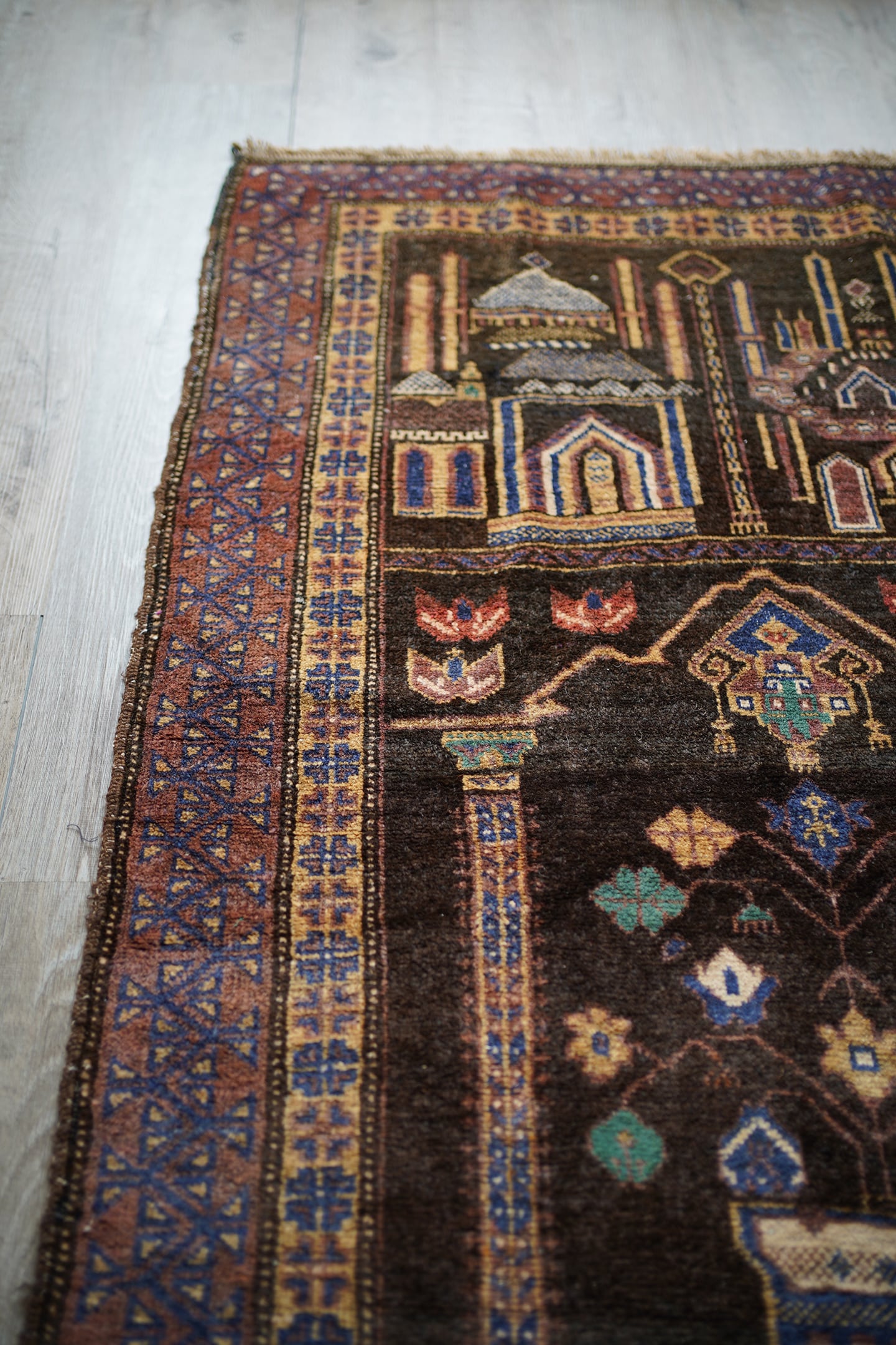 おおよそ50年前のアフガニスタン産のバルーチプレイヤーラグ。艶のあるブラウン色に花瓶に飾られた花が象徴的で、可愛さと渋さを兼ね備えた一枚。エメラルドグリーンやベージュ、ネイビーなどの色とりどりの花がとっても素敵です。しなやかで優しい肌触り、4mm〜5mm程度で比較的薄めの質感です。目立った補修跡もなく状態も良好。落ち着いた色合いなので、様々な家具に合わせやすいラグかと思います。
