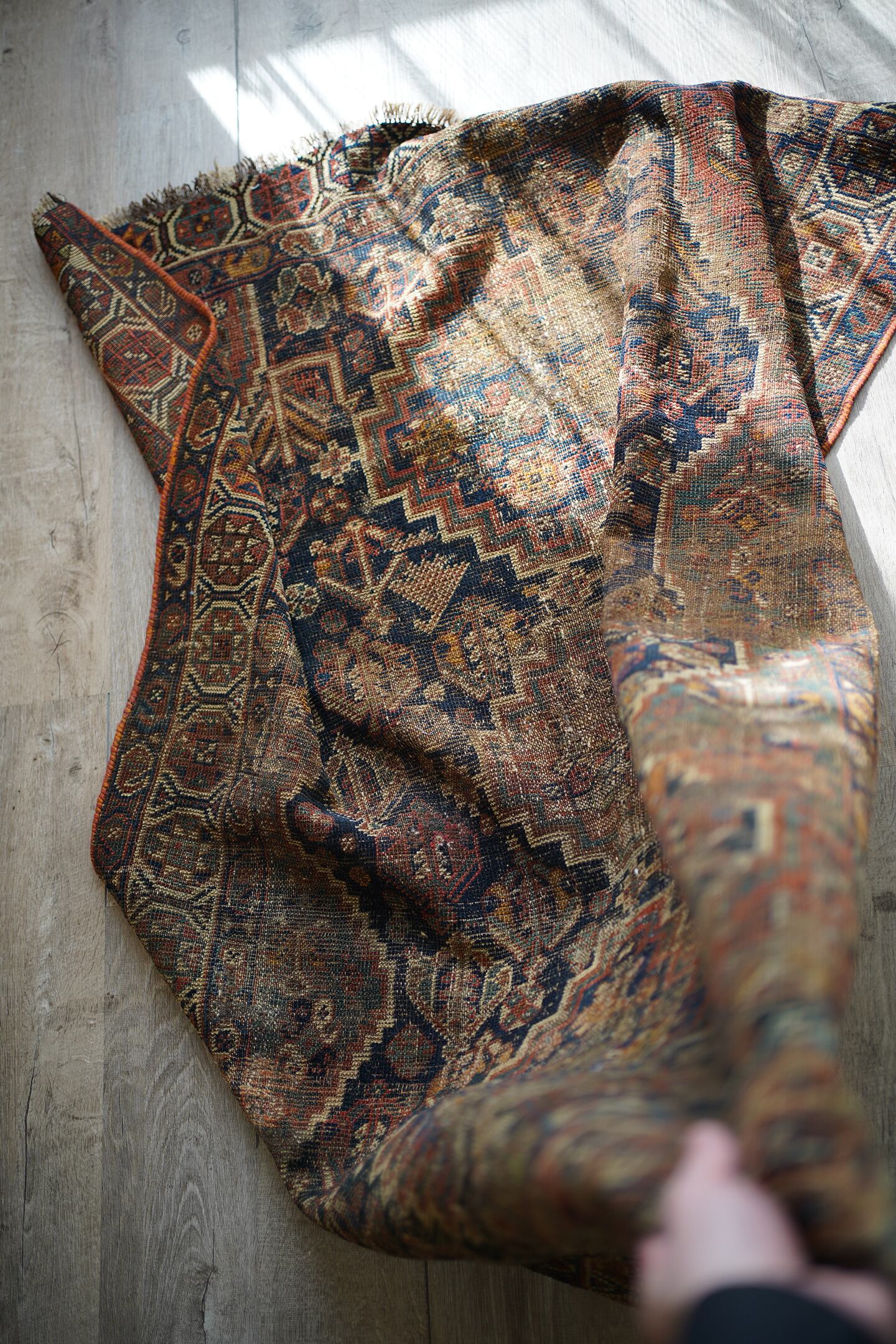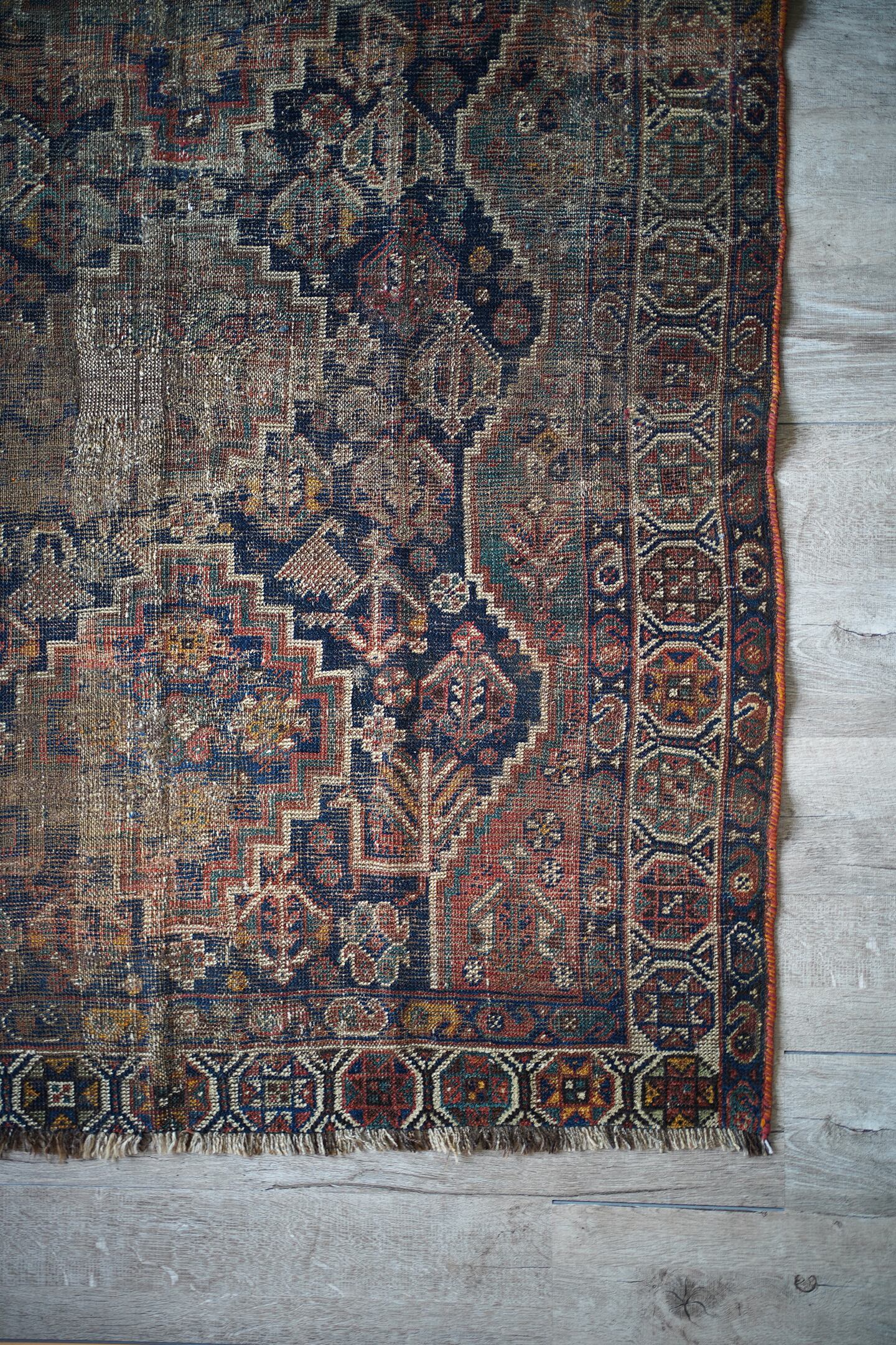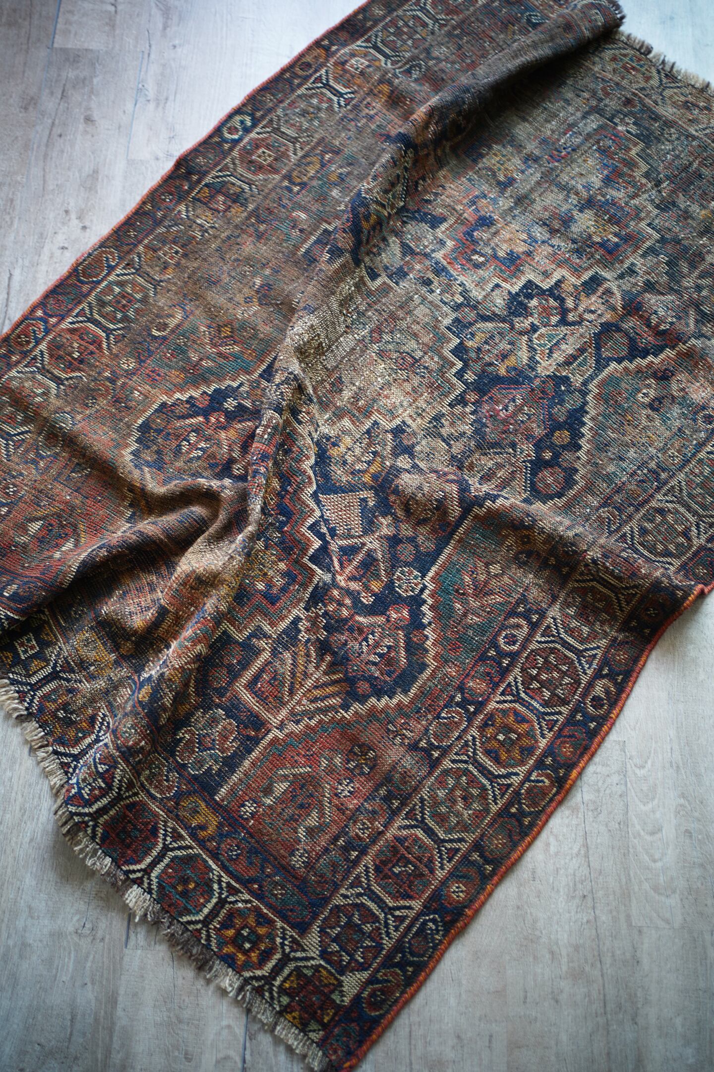 約1930年頃に織られたセミアンティークのイラン・シラーズ産のカシュガイラグ。経年による擦れと補修跡により、元のデザインがわからなくなってしまっているほどの状態ですが、それがまたアンティークとして美しく、素晴らしい風合いです。擦れの状態について現地のセラーに確認したところ、長い年月使い込まれていく中で自然とこの風合いとなった一枚だそうです。光にかざして裏面から透かしてみると、かなり薄くなっている部分が多々あります(お写真最後ご参照ください)。穴と呼べるようなところはありませんが、間隔が少し広くなっているところもございます(普段敷いて表面から見る分には全くわからないかと思います)。パイルもほとんど残っておらず、サラッと乾いた質感で3mm程度で非常に薄い質感です。歪み等含め、アンティークとしての状態にご理解いただける方にお譲りできればと思います。ご自宅はもちろん、スタジオやお店のエントランスなどにもオススメです。