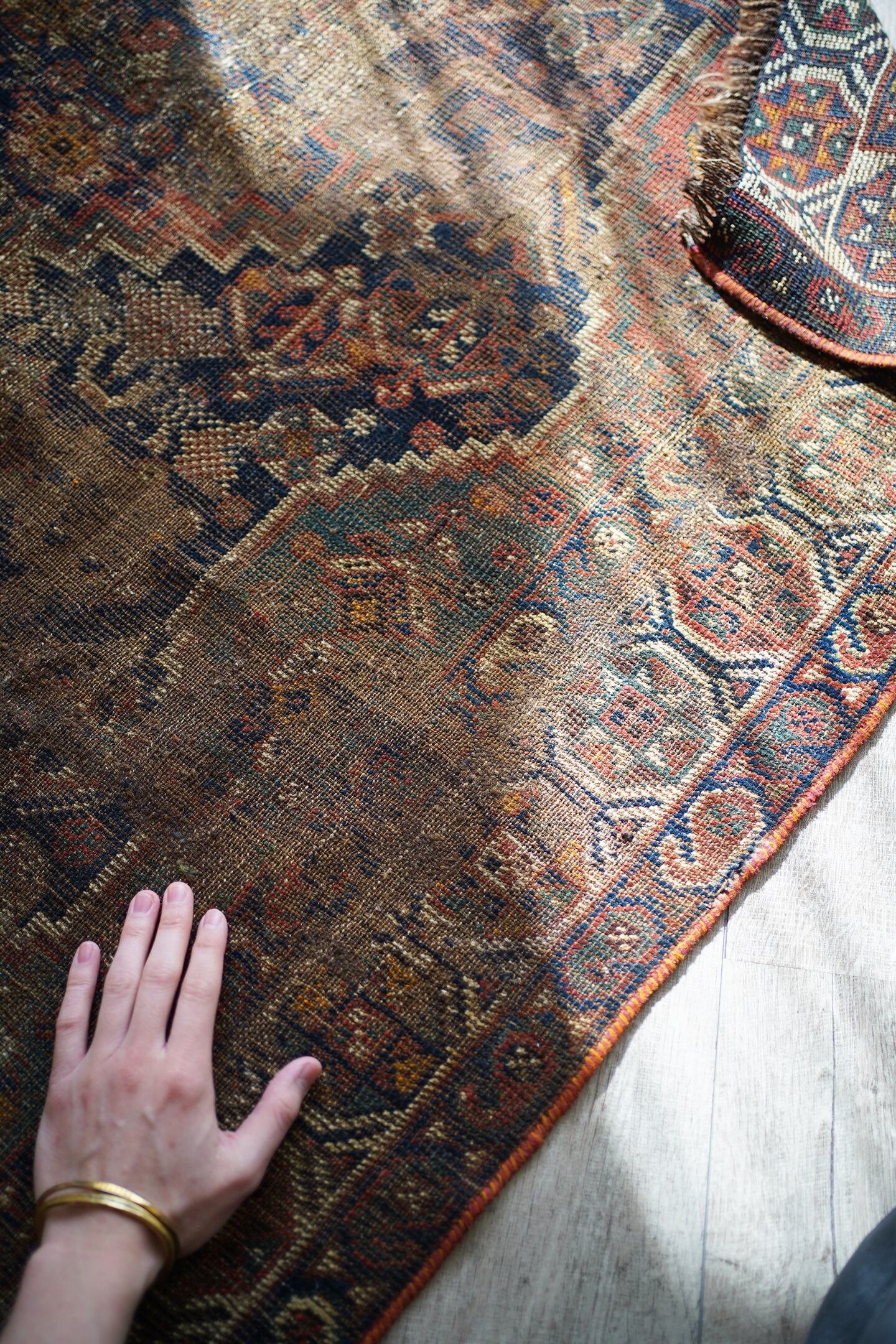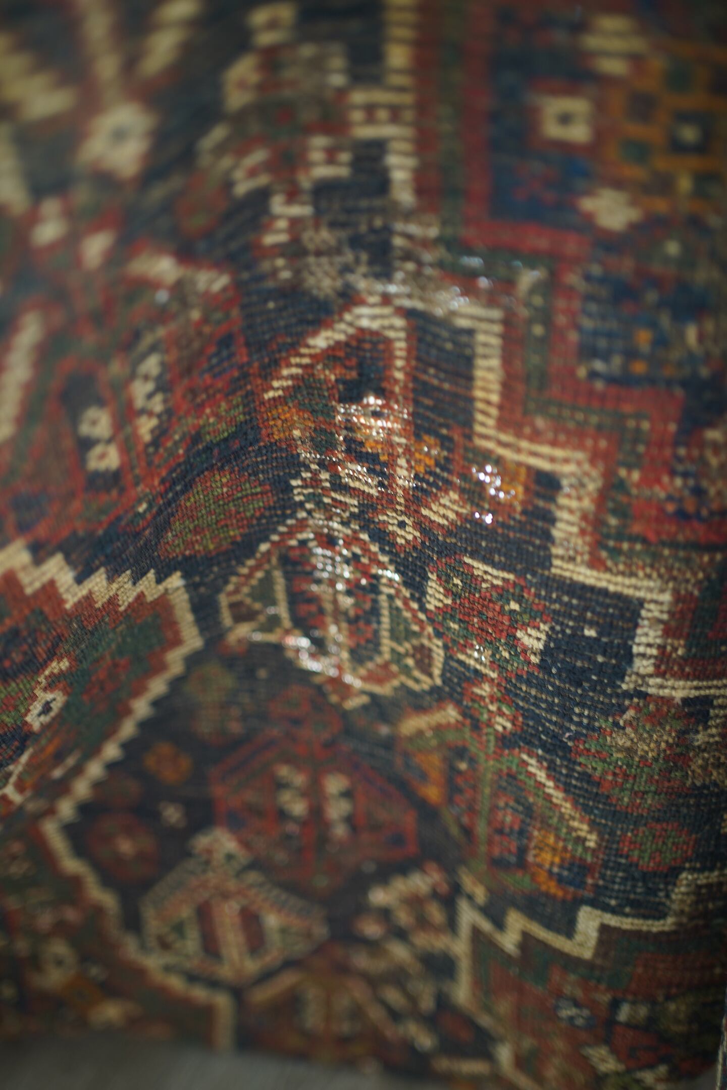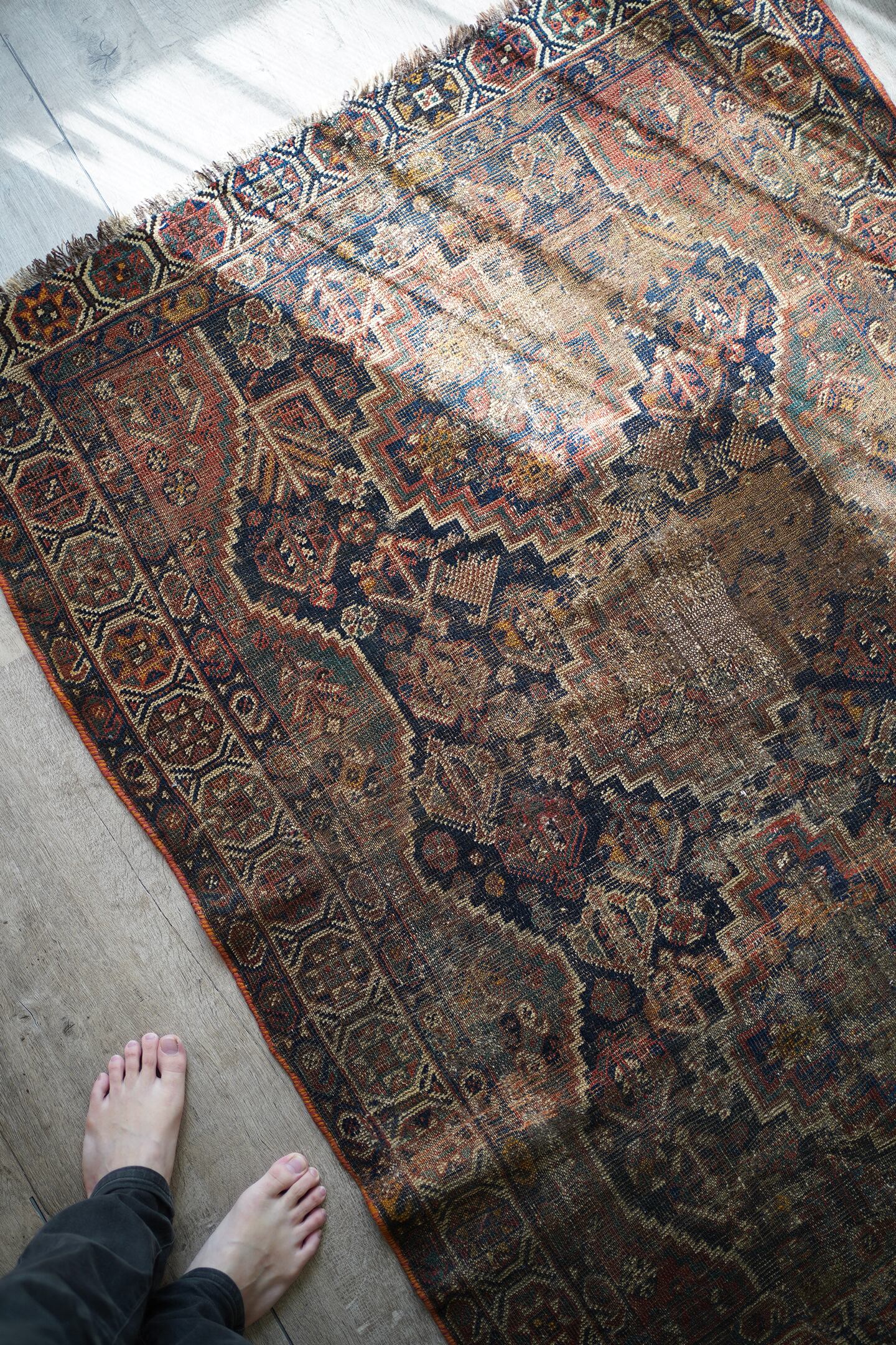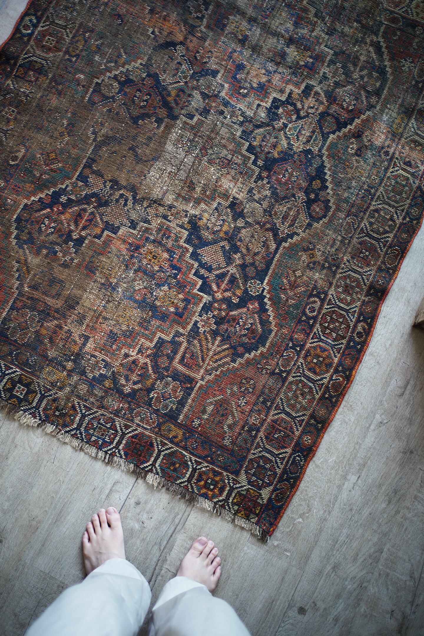 約1930年頃に織られたセミアンティークのイラン・シラーズ産のカシュガイラグ。経年による擦れと補修跡により、元のデザインがわからなくなってしまっているほどの状態ですが、それがまたアンティークとして美しく、素晴らしい風合いです。擦れの状態について現地のセラーに確認したところ、長い年月使い込まれていく中で自然とこの風合いとなった一枚だそうです。光にかざして裏面から透かしてみると、かなり薄くなっている部分が多々あります(お写真最後ご参照ください)。穴と呼べるようなところはありませんが、間隔が少し広くなっているところもございます(普段敷いて表面から見る分には全くわからないかと思います)。パイルもほとんど残っておらず、サラッと乾いた質感で3mm程度で非常に薄い質感です。歪み等含め、アンティークとしての状態にご理解いただける方にお譲りできればと思います。ご自宅はもちろん、スタジオやお店のエントランスなどにもオススメです。
