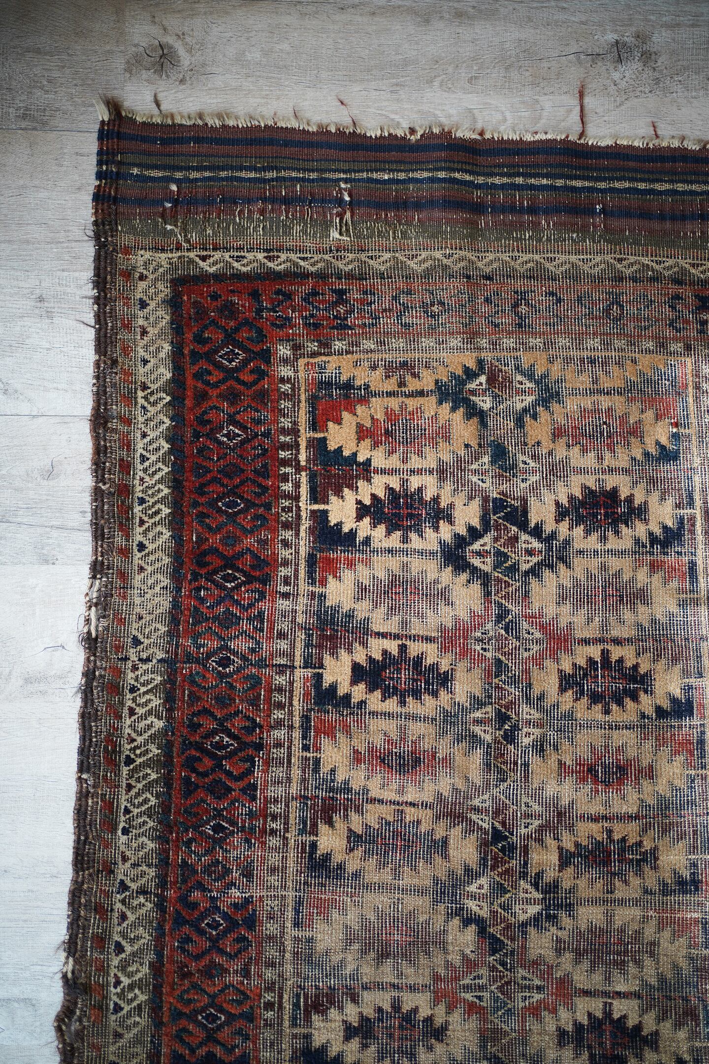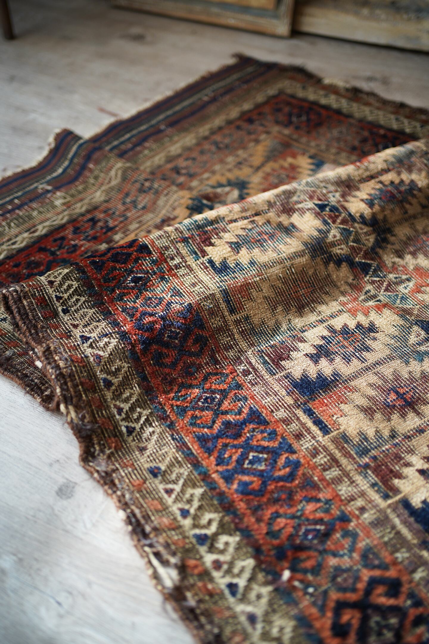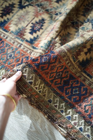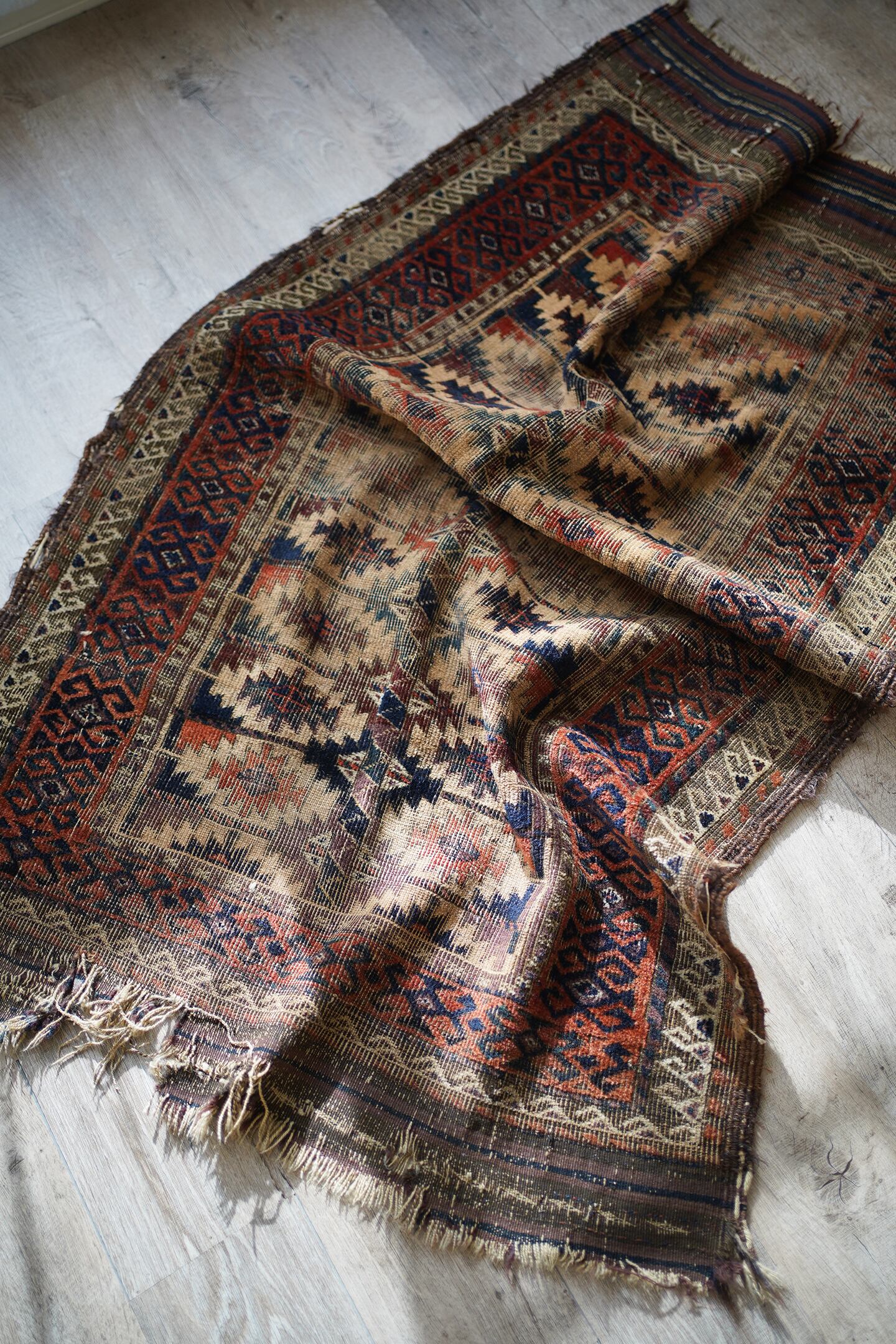 130年〜140年前のアンティークのバルーチラグ。フリンジとセルベッジの裂けやほつれもひどく、かなりのバッドコンディション。それでも愛おしい、この一枚。色味やデザインが程よく残りながらの風合いが素晴らしいです。正直店主のコレクションとして残しておきたいほどお気に入りのラグなのですが、もっと輝く場所があると思い販売いたします。サラッとした滑らかな肌触り、一部パイルが残っているところはふわっとしています。厚みは3mm〜4mm程度で、全体的にくたっとした質感です。アンティーク品の味わいとして、お品の状態にご理解のある方のみにお求めいただければと思います。カフェなどの店舗などに敷いても雰囲気がグッと素敵になりそうですね♫