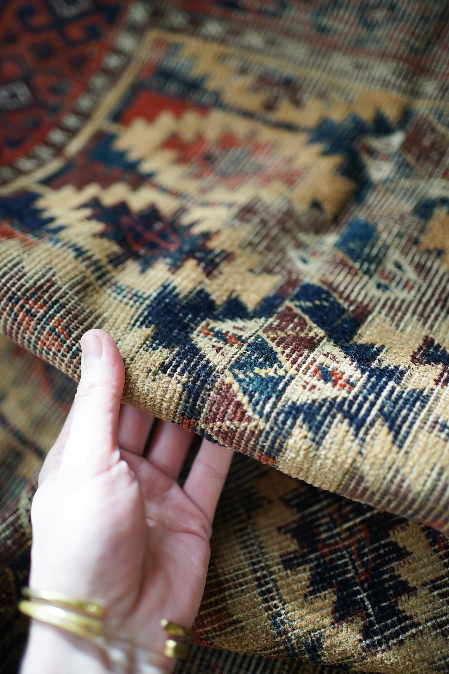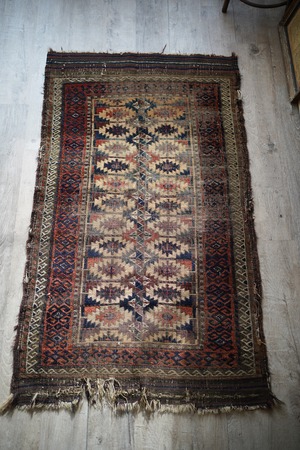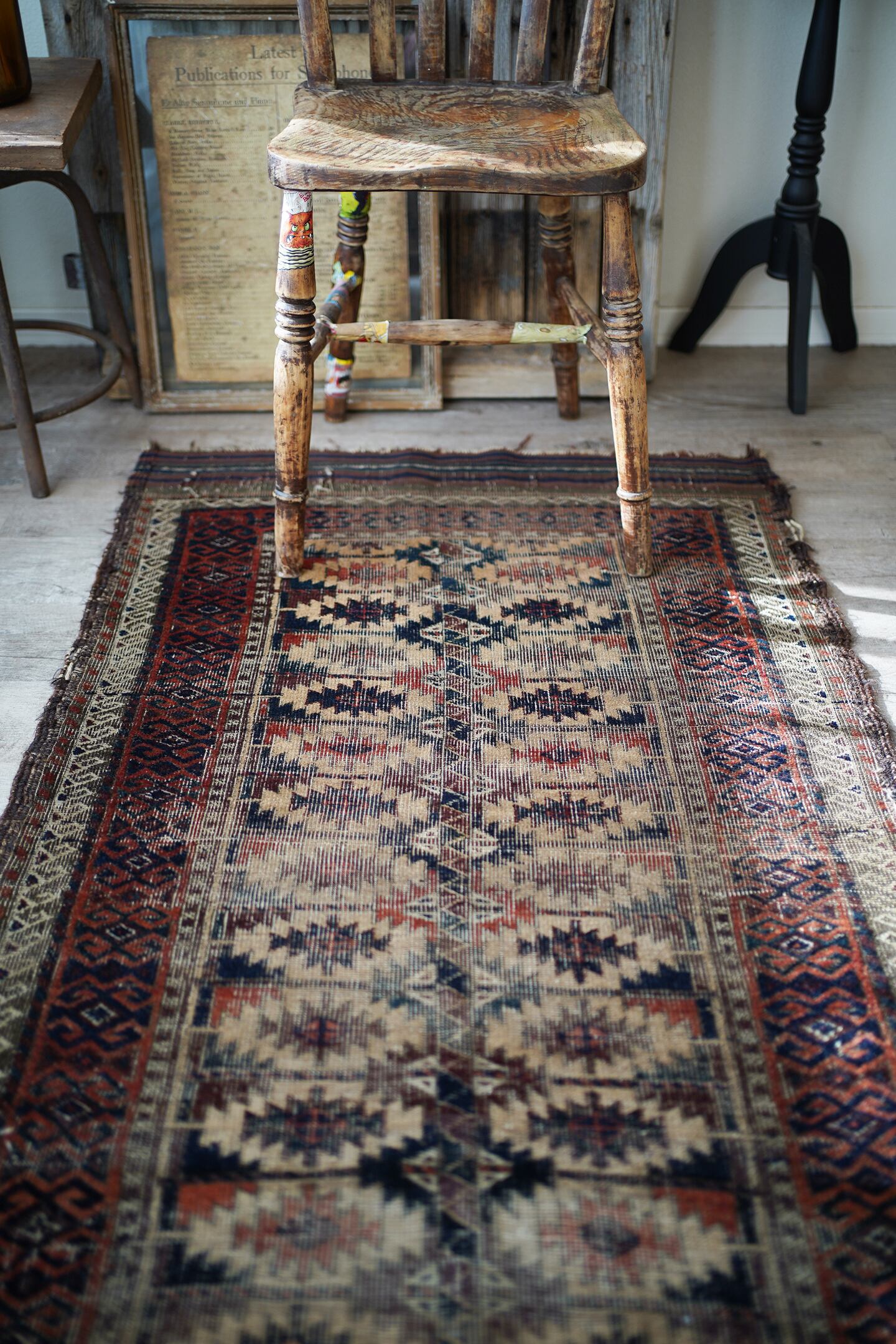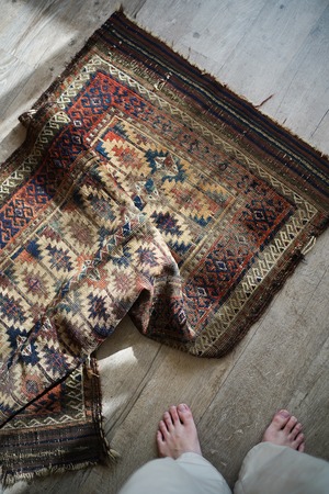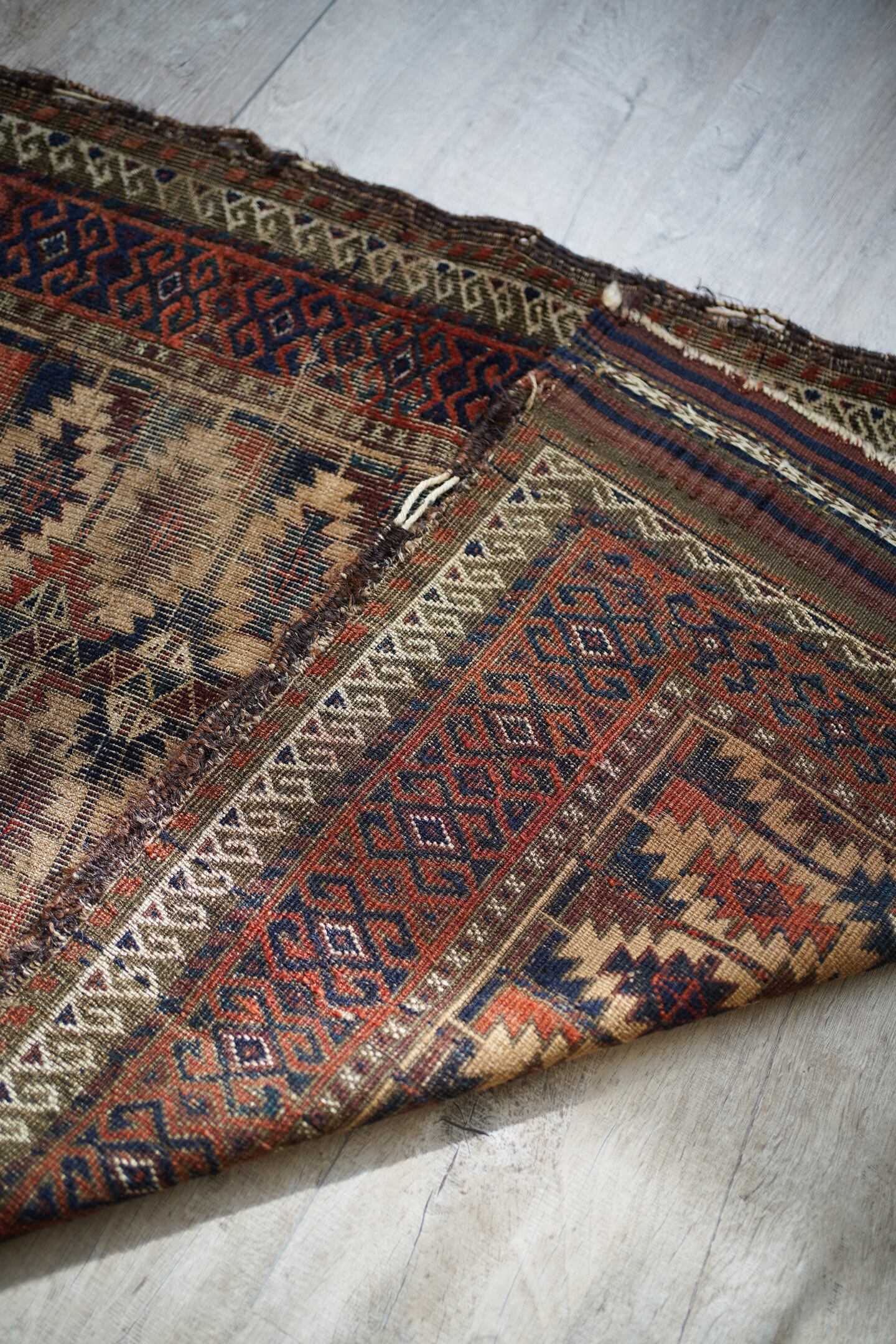130年〜140年前のアンティークのバルーチラグ。フリンジとセルベッジの裂けやほつれもひどく、かなりのバッドコンディション。それでも愛おしい、この一枚。色味やデザインが程よく残りながらの風合いが素晴らしいです。正直店主のコレクションとして残しておきたいほどお気に入りのラグなのですが、もっと輝く場所があると思い販売いたします。サラッとした滑らかな肌触り、一部パイルが残っているところはふわっとしています。厚みは3mm〜4mm程度で、全体的にくたっとした質感です。アンティーク品の味わいとして、お品の状態にご理解のある方のみにお求めいただければと思います。カフェなどの店舗などに敷いても雰囲気がグッと素敵になりそうですね♫