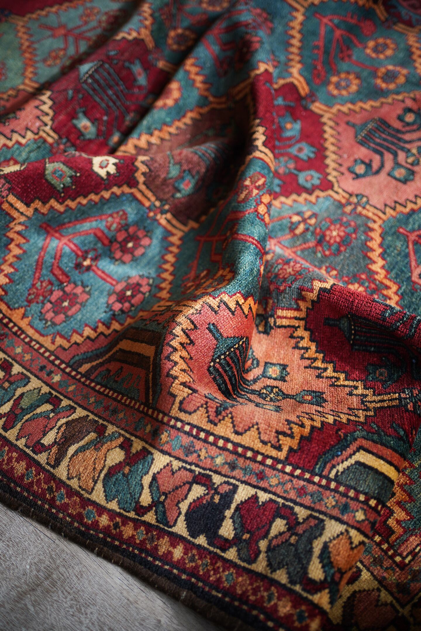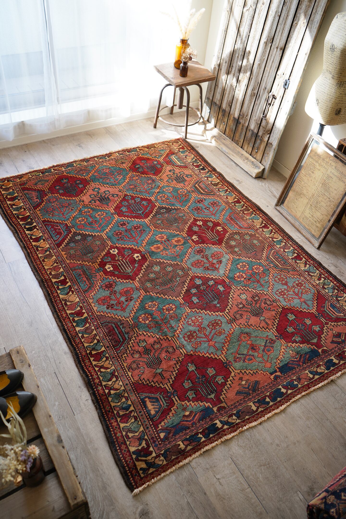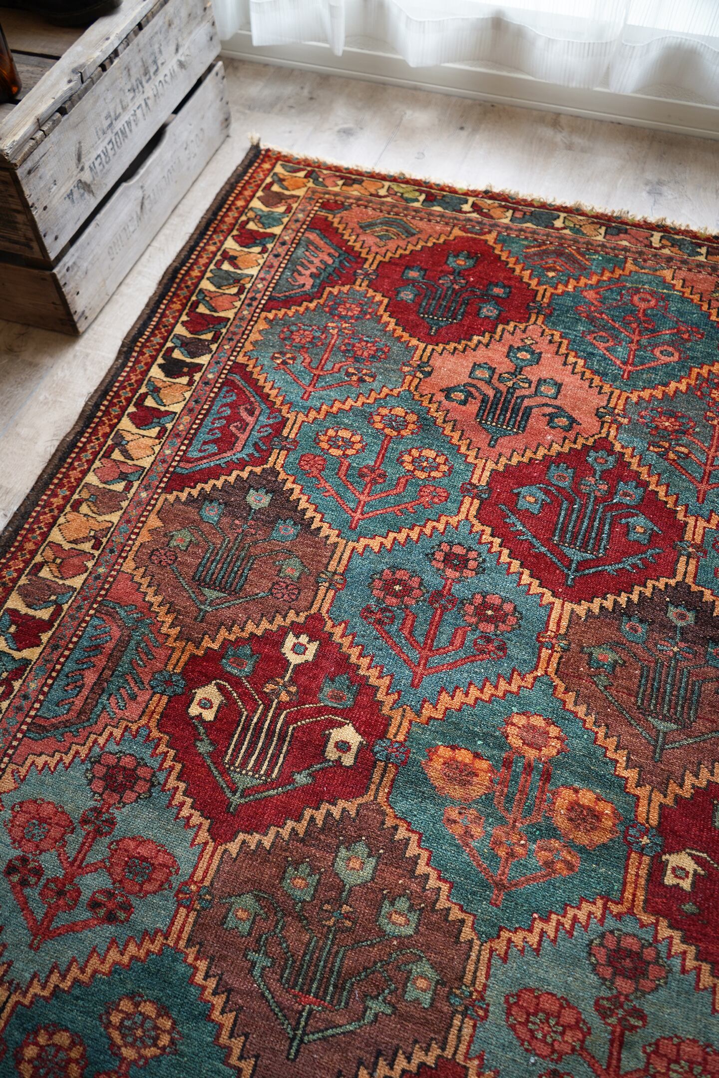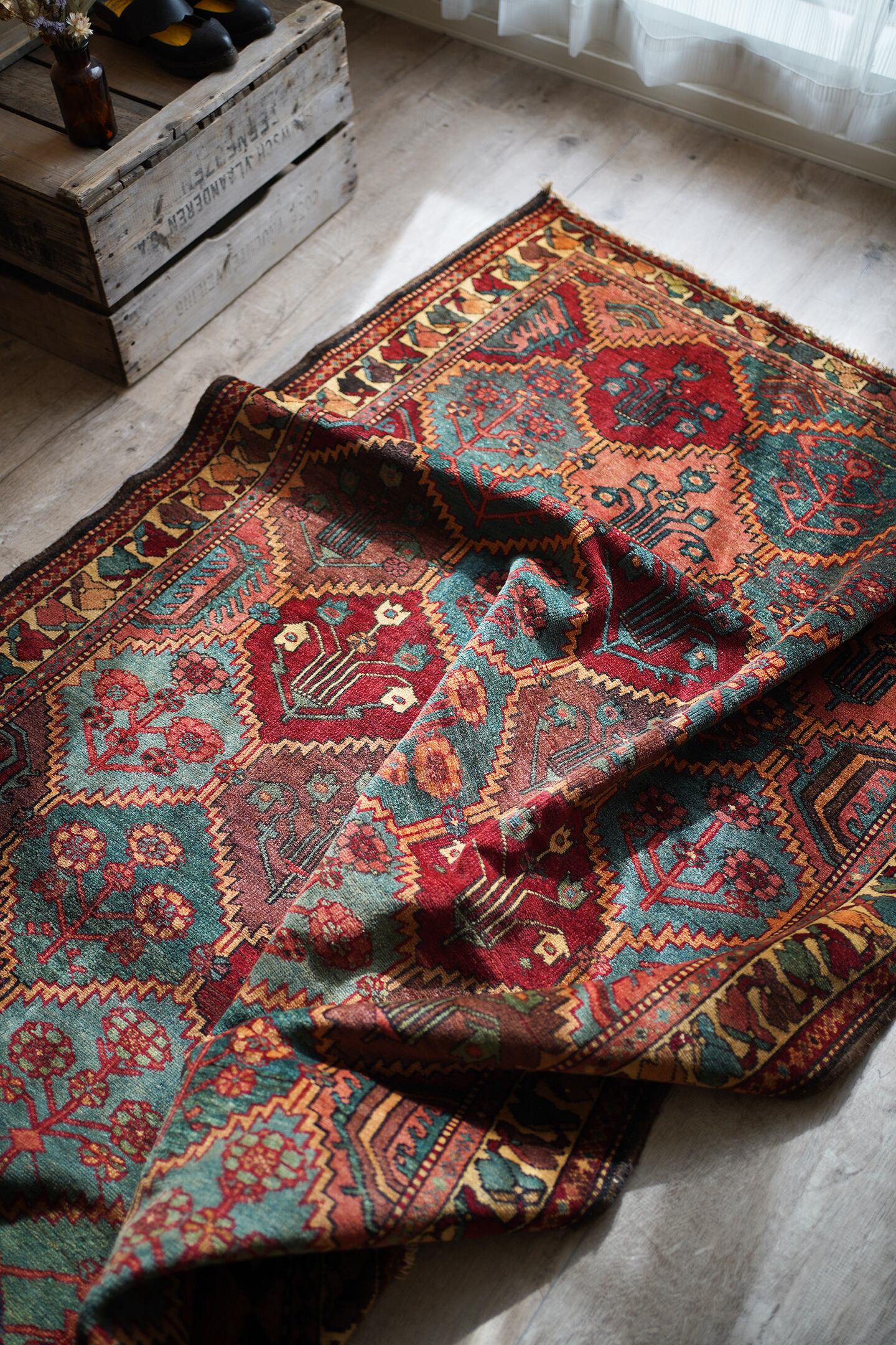 約70年前にイランのアフシャール族によって織られたラグ。赤紫、ブルーグリーン、ブラウン、サーモンピンクなどの素敵な配色に、たくさんの花紋様が綺麗に織り込まれています。パイルに光が差し込むと艶感が際立ち、大変美しいです。パイルの長さの均一感含め、状態も非常に良く上質な一枚。コンディションもパーフェクトです。サラッと滑らかで気持ちの良い肌触り、厚みは7mm前後となります。リビングを素敵に彩ってくれる主役級のラグ。店主イチオシです♫