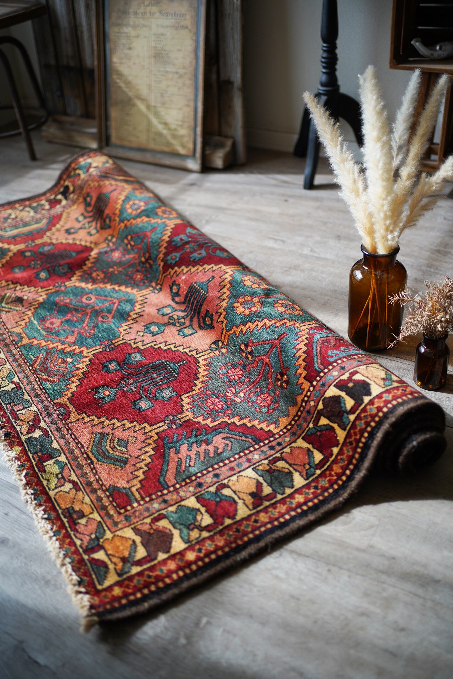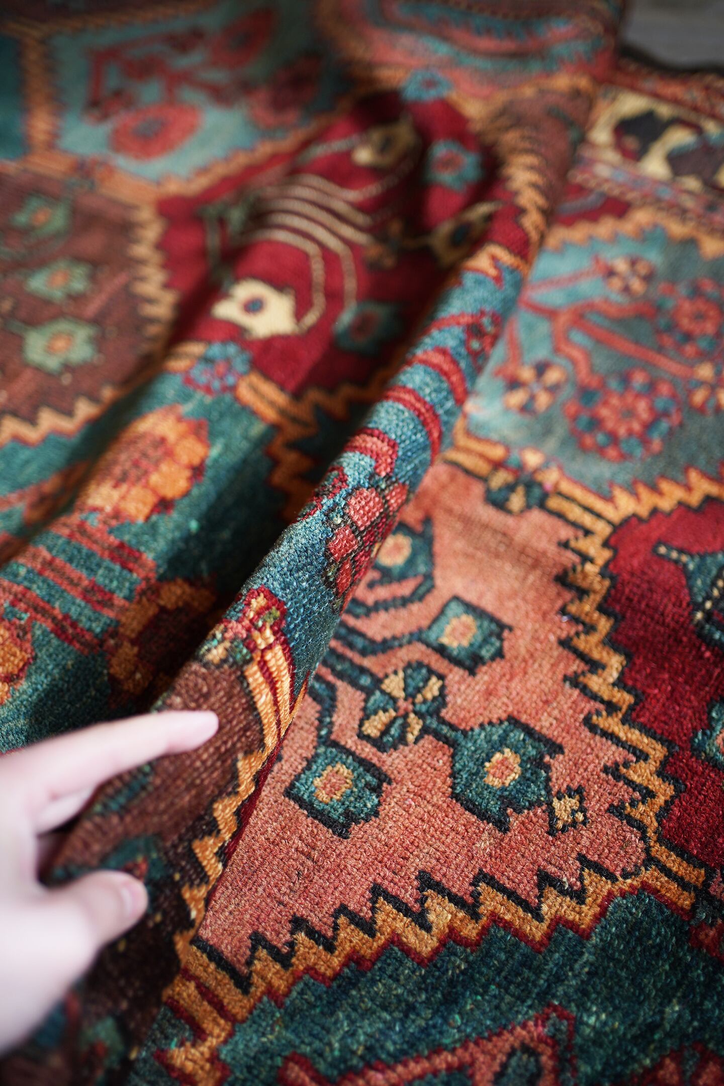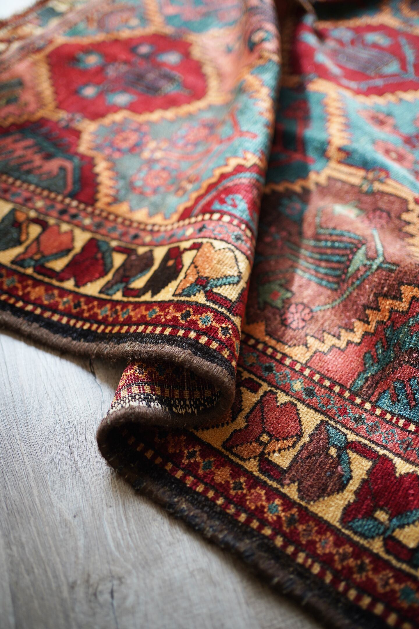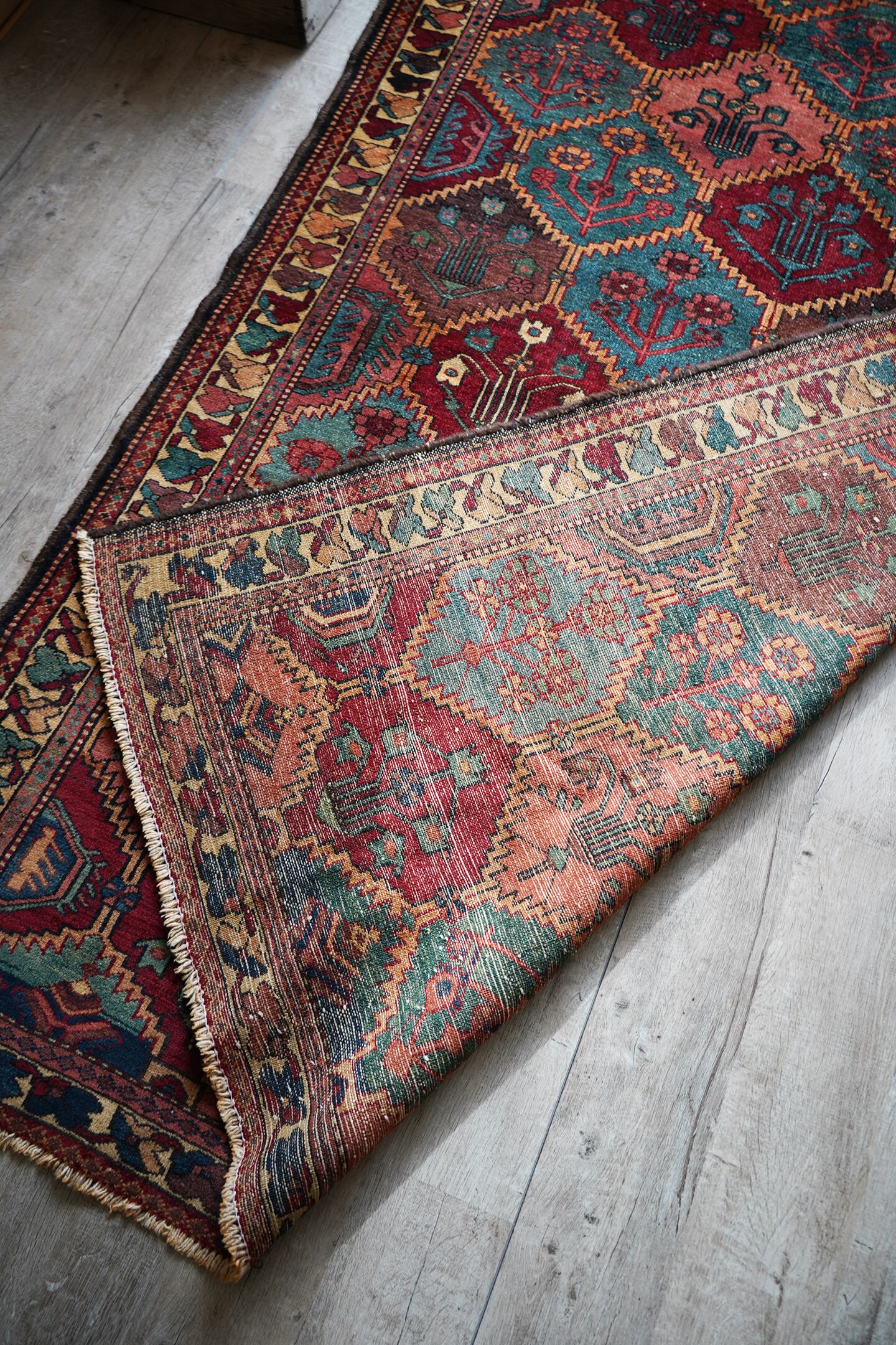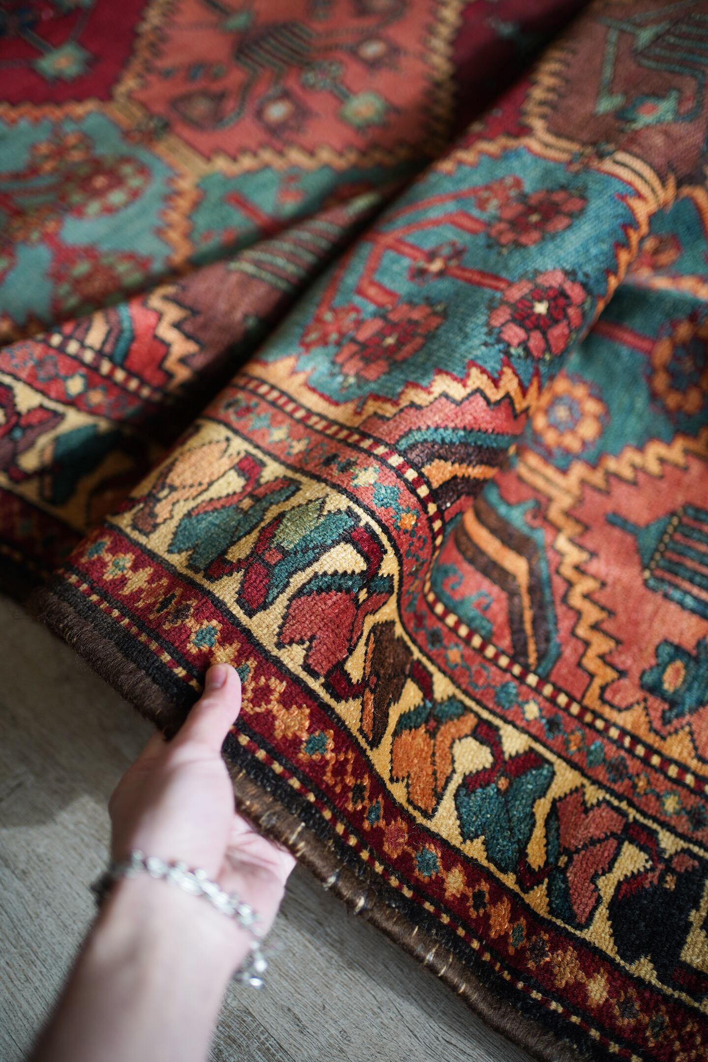 約70年前にイランのアフシャール族によって織られたラグ。赤紫、ブルーグリーン、ブラウン、サーモンピンクなどの素敵な配色に、たくさんの花紋様が綺麗に織り込まれています。パイルに光が差し込むと艶感が際立ち、大変美しいです。パイルの長さの均一感含め、状態も非常に良く上質な一枚。コンディションもパーフェクトです。サラッと滑らかで気持ちの良い肌触り、厚みは7mm前後となります。リビングを素敵に彩ってくれる主役級のラグ。店主イチオシです♫