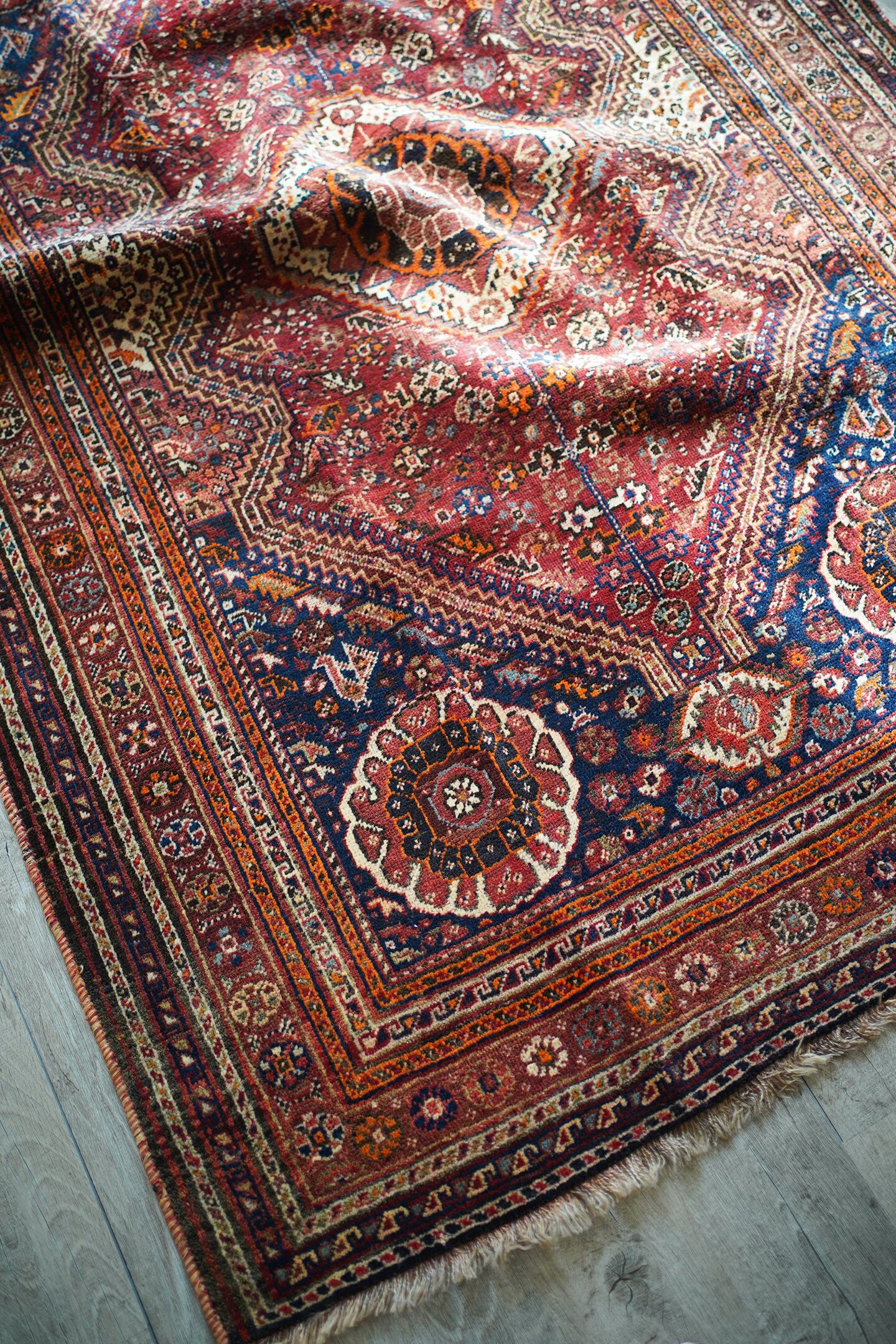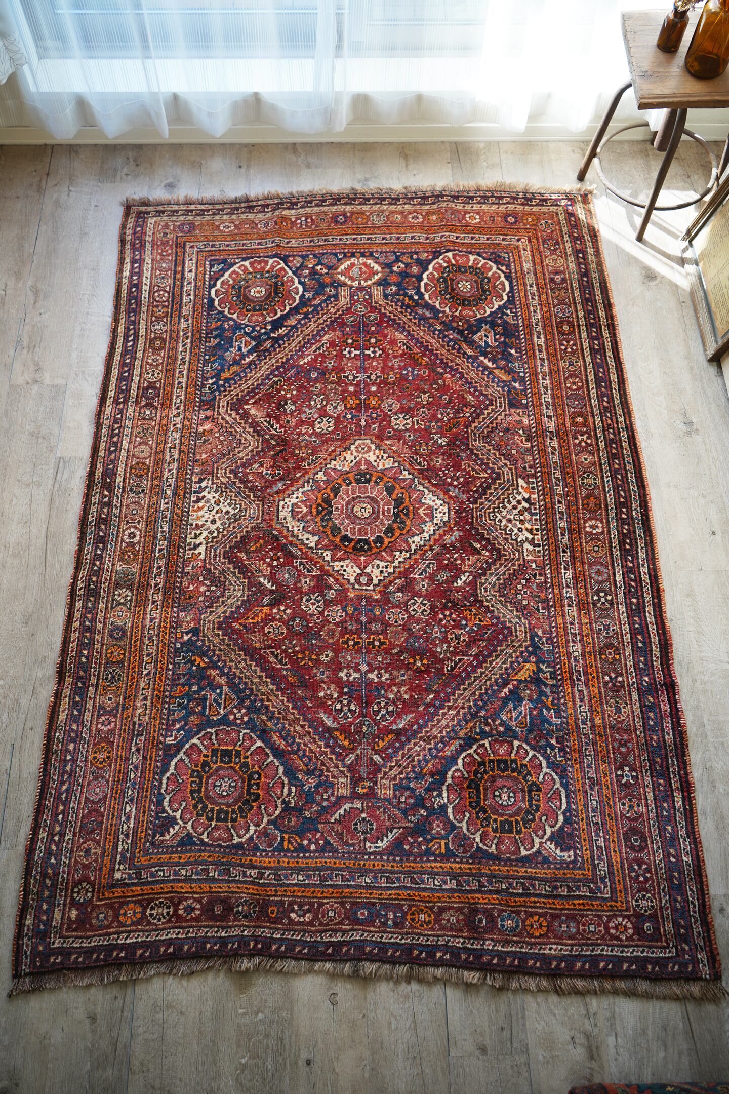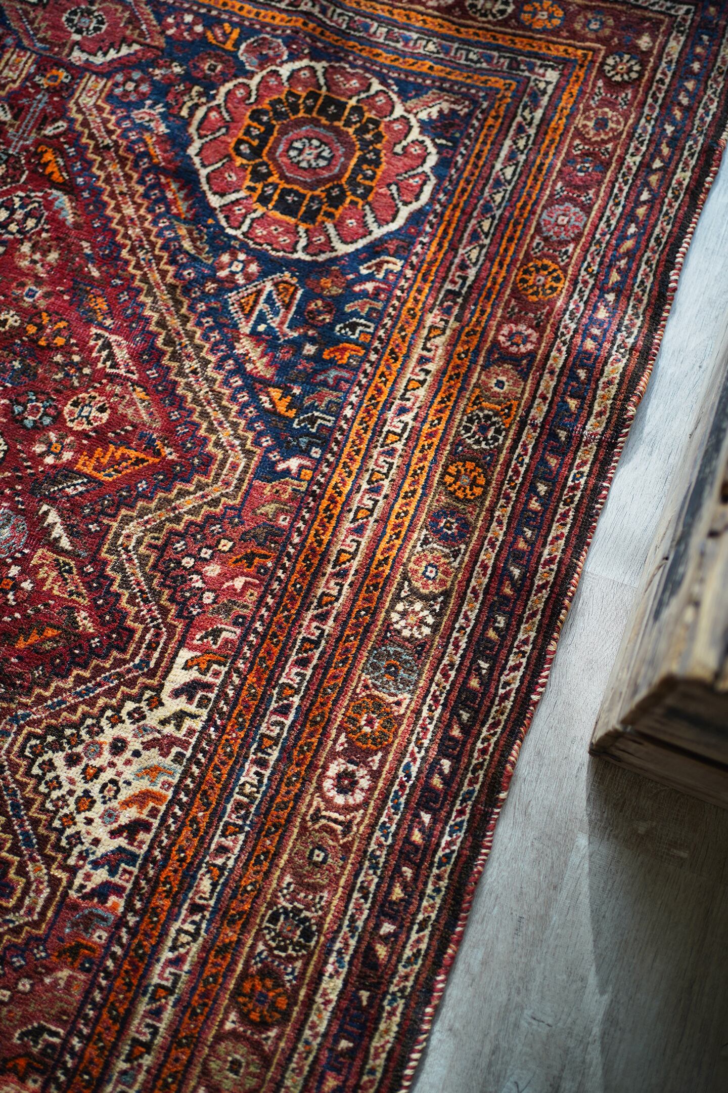 経年80年のイラン・シラーズ産カシュガイラグ。メダリオン部分や四角のコーナーの花紋様が特徴的で、鳥紋様や魔除けの意味を持つ狼の足跡などが多く織り込まれています。配色は深い赤とネイビーをベースにオレンジやホワイトの差し色が使用されています。光に当たると艶も出て、大変美しい一枚です。ふわサラッとした滑らかで気持ちの良い肌触り、厚みは7mm程度となります。一部目立たない補修跡がございます(お写真最後ご参照ください)。またあまり気にならない程度かと思いますが、若干手織り特有の歪みもございます(お写真最後から2番目の俯瞰写真をご参照ください)。リビングでソファ前に敷いて寛いだり、ダイニングテーブル下などお気に入りのスペースにぜひ敷いてみてください♫