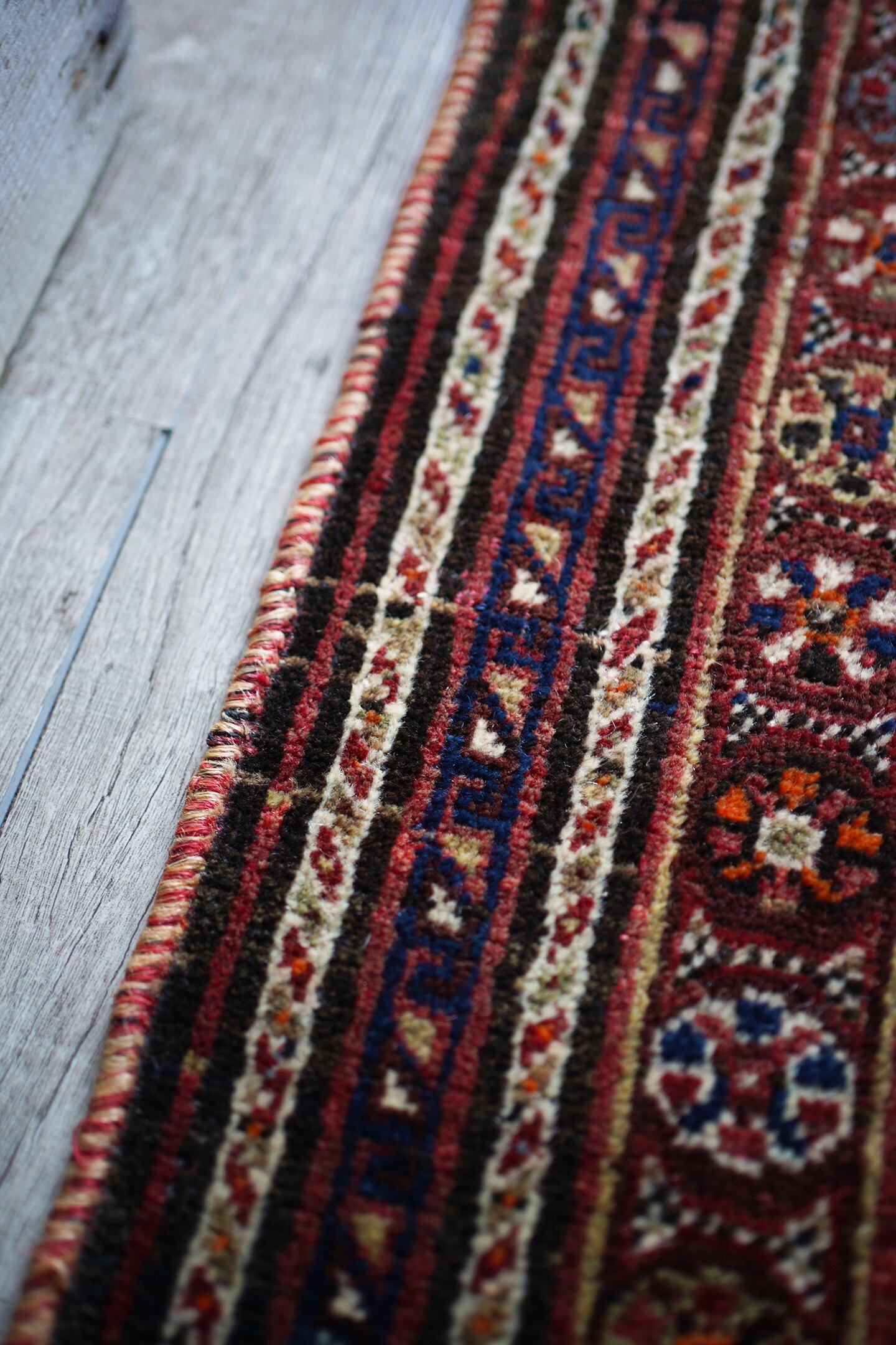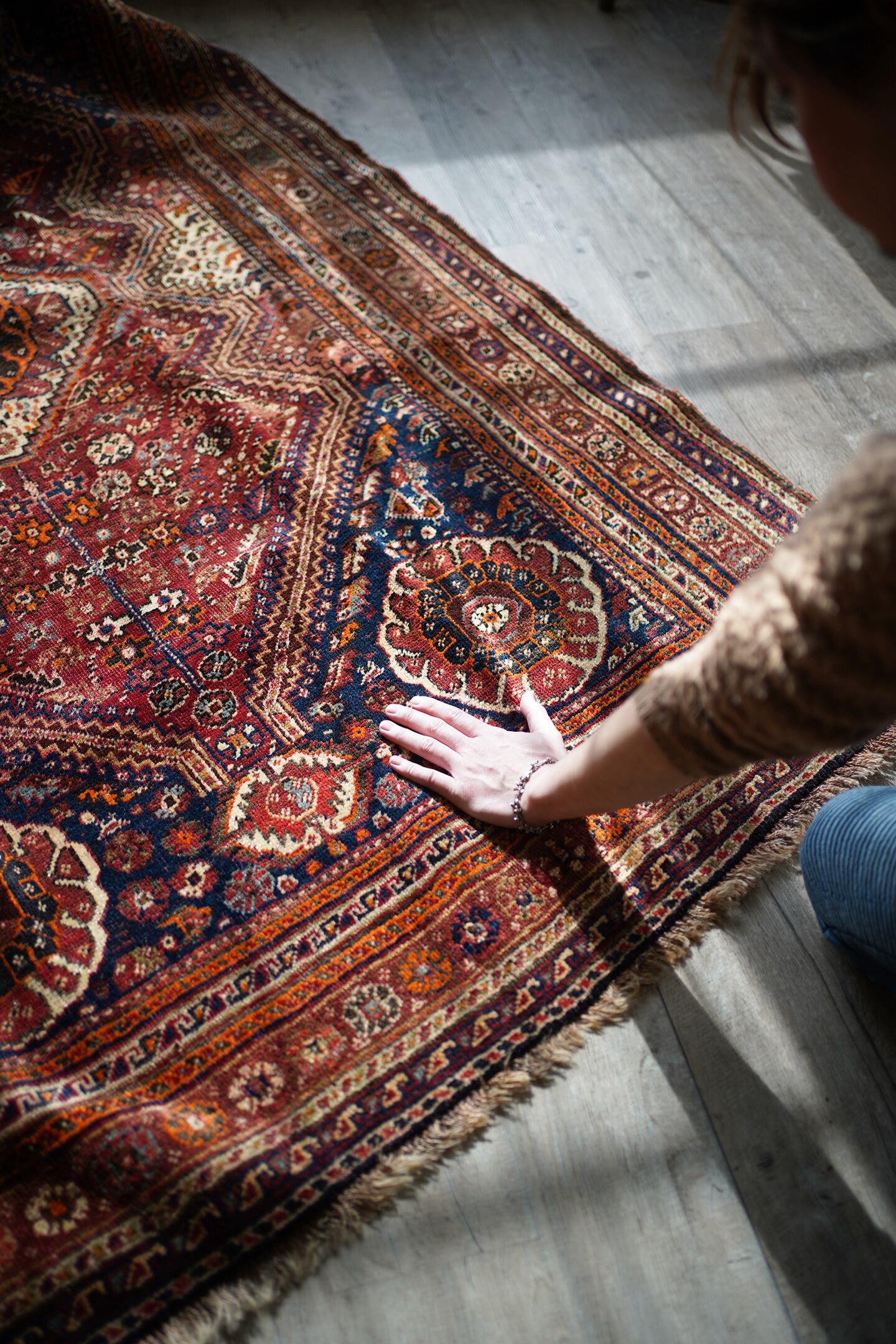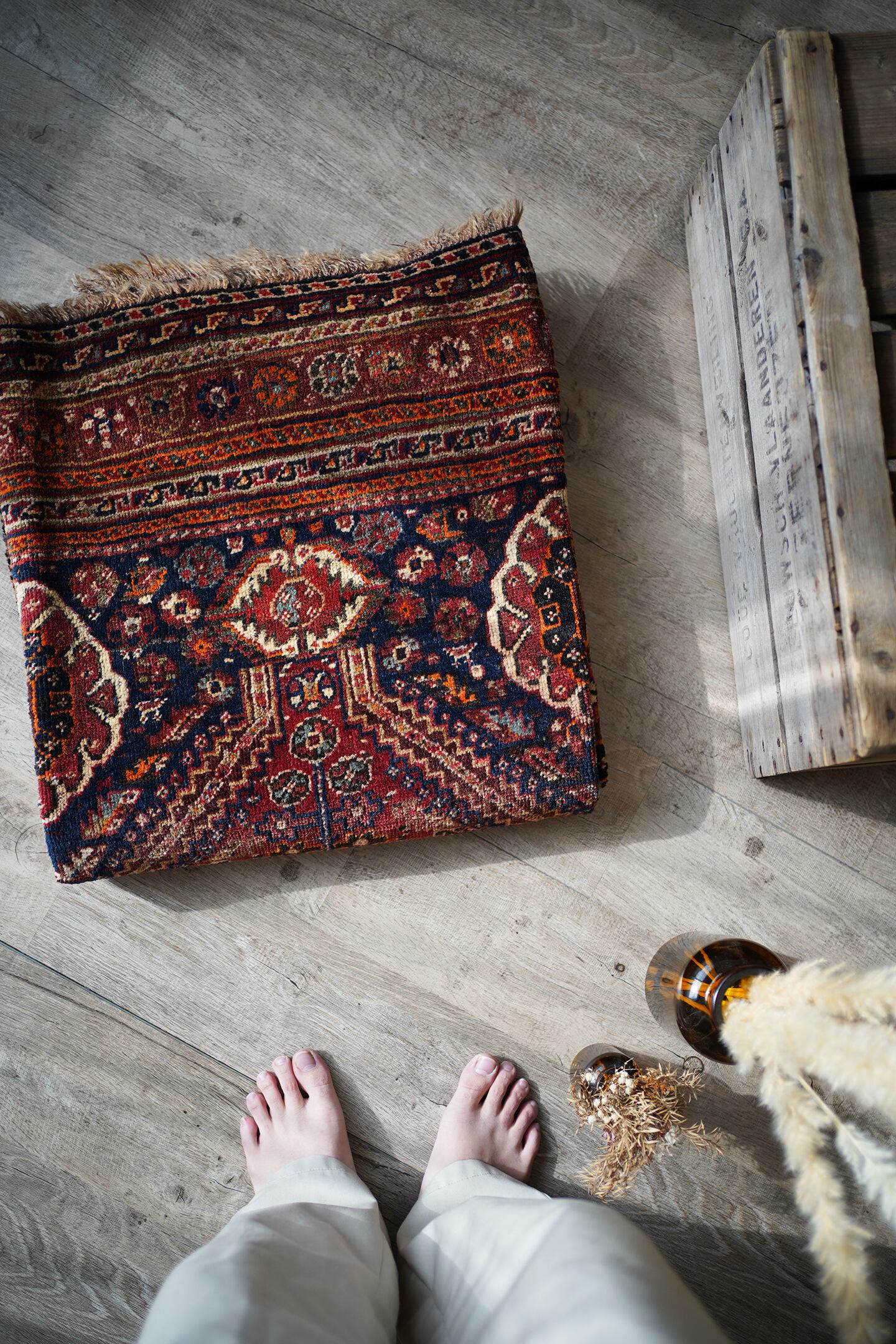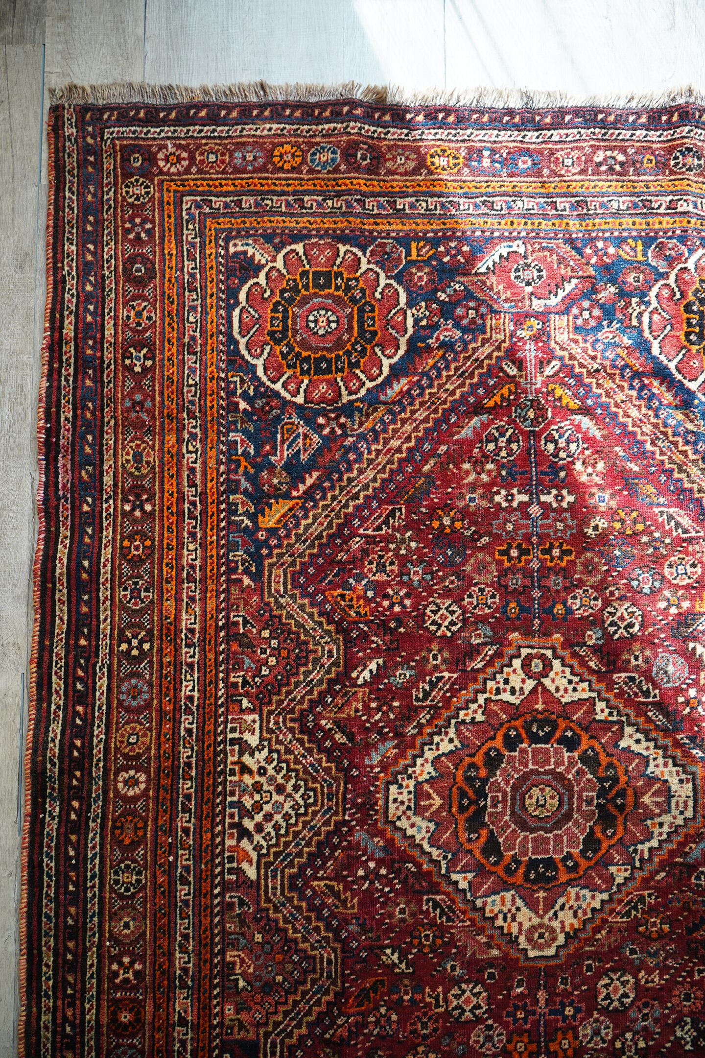 経年80年のイラン・シラーズ産カシュガイラグ。メダリオン部分や四角のコーナーの花紋様が特徴的で、鳥紋様や魔除けの意味を持つ狼の足跡などが多く織り込まれています。配色は深い赤とネイビーをベースにオレンジやホワイトの差し色が使用されています。光に当たると艶も出て、大変美しい一枚です。ふわサラッとした滑らかで気持ちの良い肌触り、厚みは7mm程度となります。一部目立たない補修跡がございます(お写真最後ご参照ください)。またあまり気にならない程度かと思いますが、若干手織り特有の歪みもございます(お写真最後から2番目の俯瞰写真をご参照ください)。リビングでソファ前に敷いて寛いだり、ダイニングテーブル下などお気に入りのスペースにぜひ敷いてみてください♫