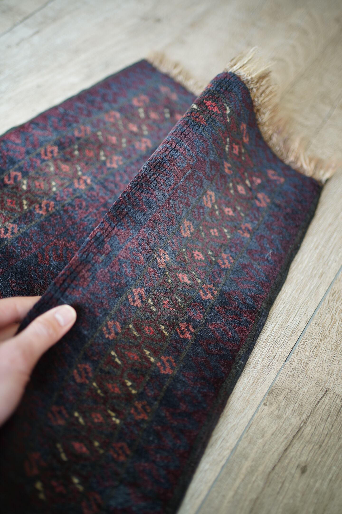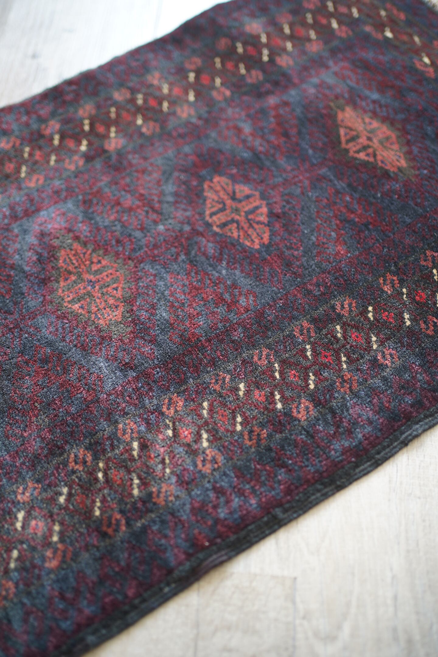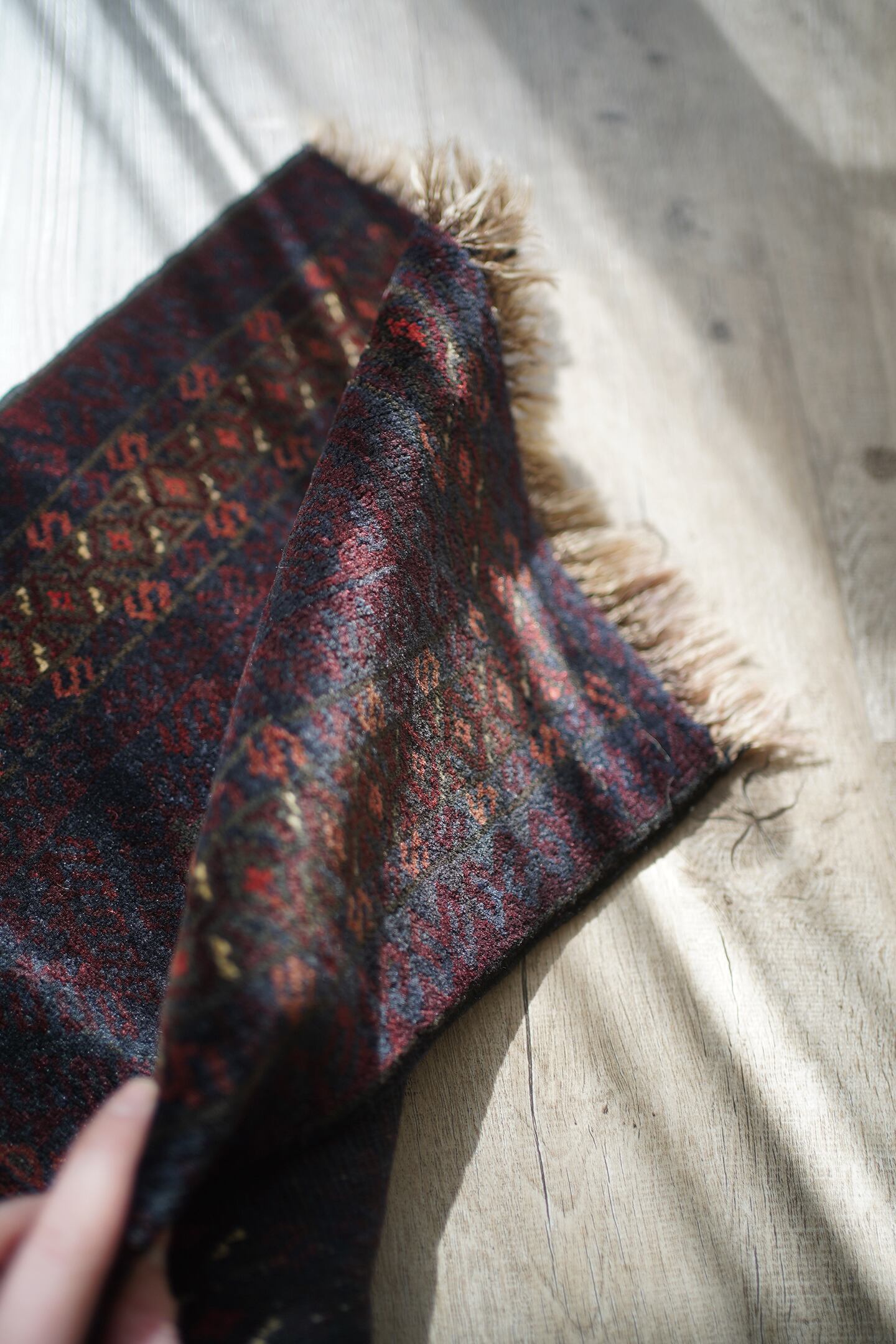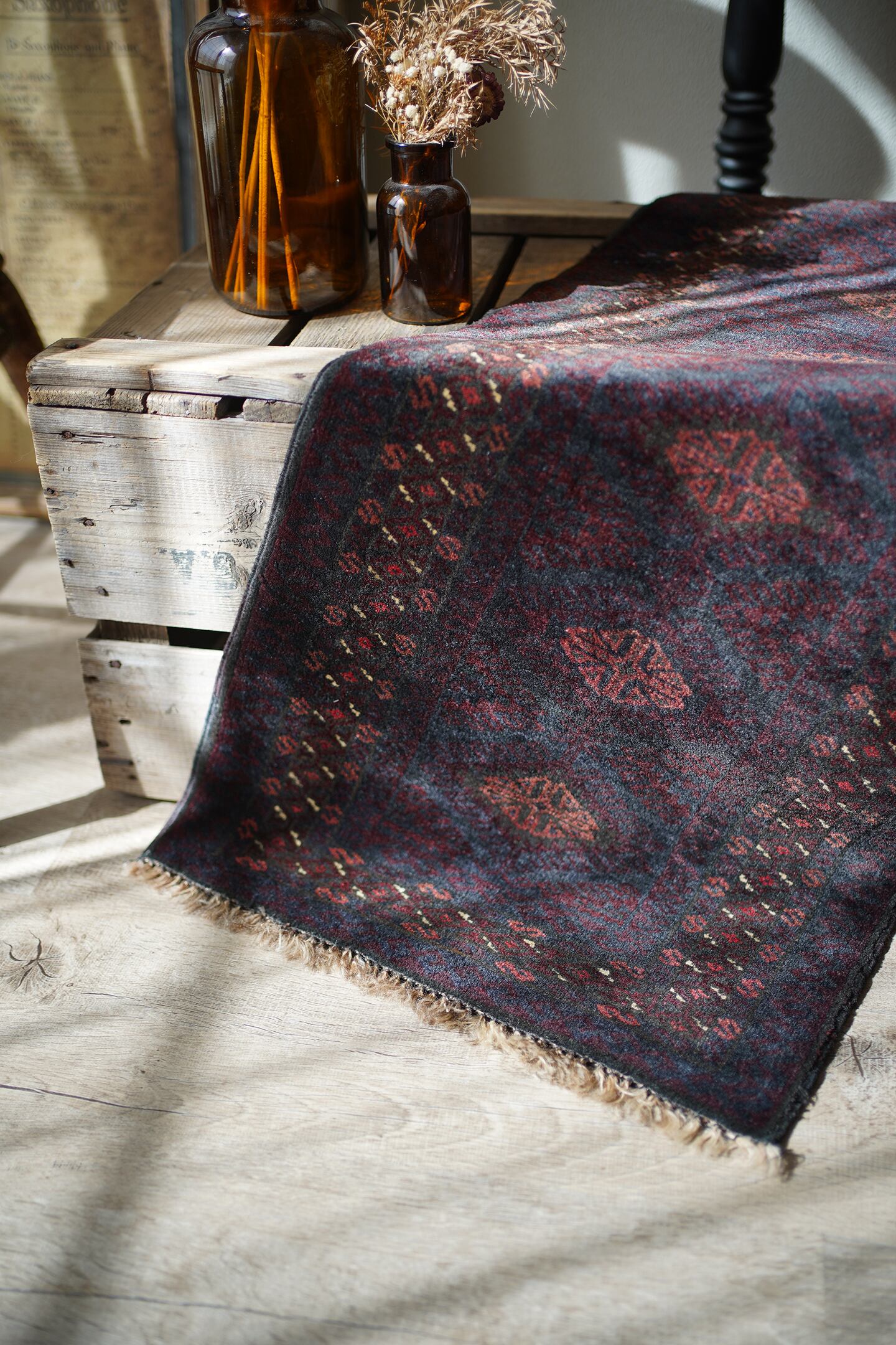ベルベットもしくはベロアを彷彿とさせるほどの艶が美しいバルーチラグ。かなり暗めの濃紺と紫の配色で、気品溢れる雰囲気が素敵です。経年80年のセミアンティークとは思えないほど状態と質感が素晴らしい一枚。サラッと柔らかく滑らかな気持ちの良い肌触り、厚みは6mm程度となります。コンディションも大変良好です。