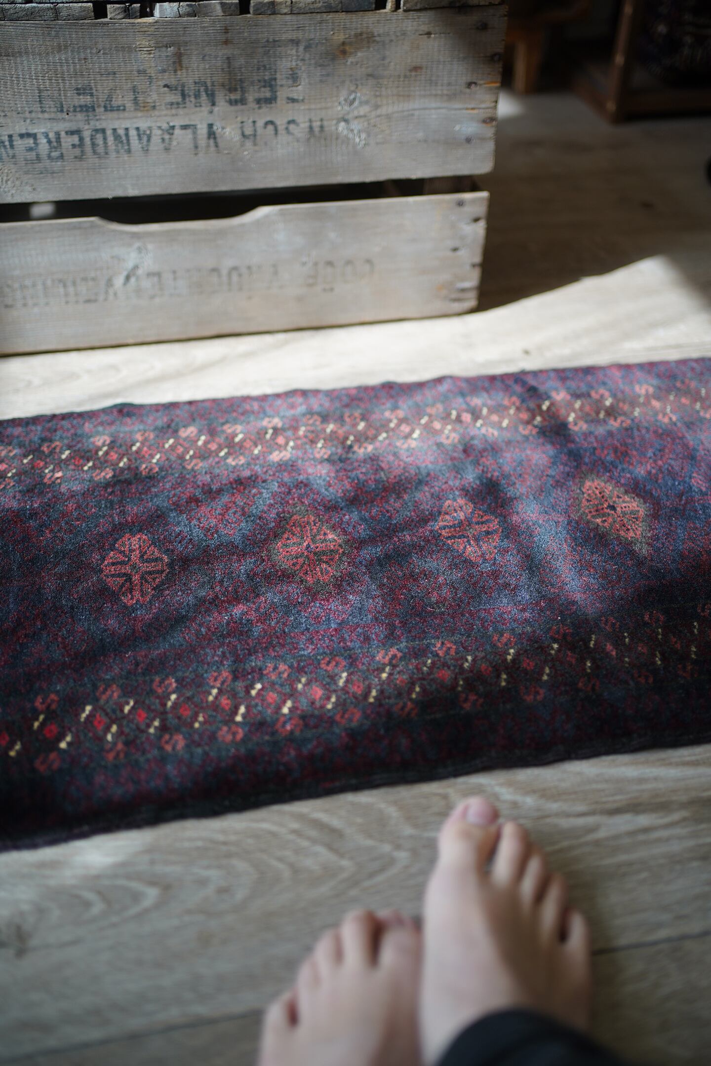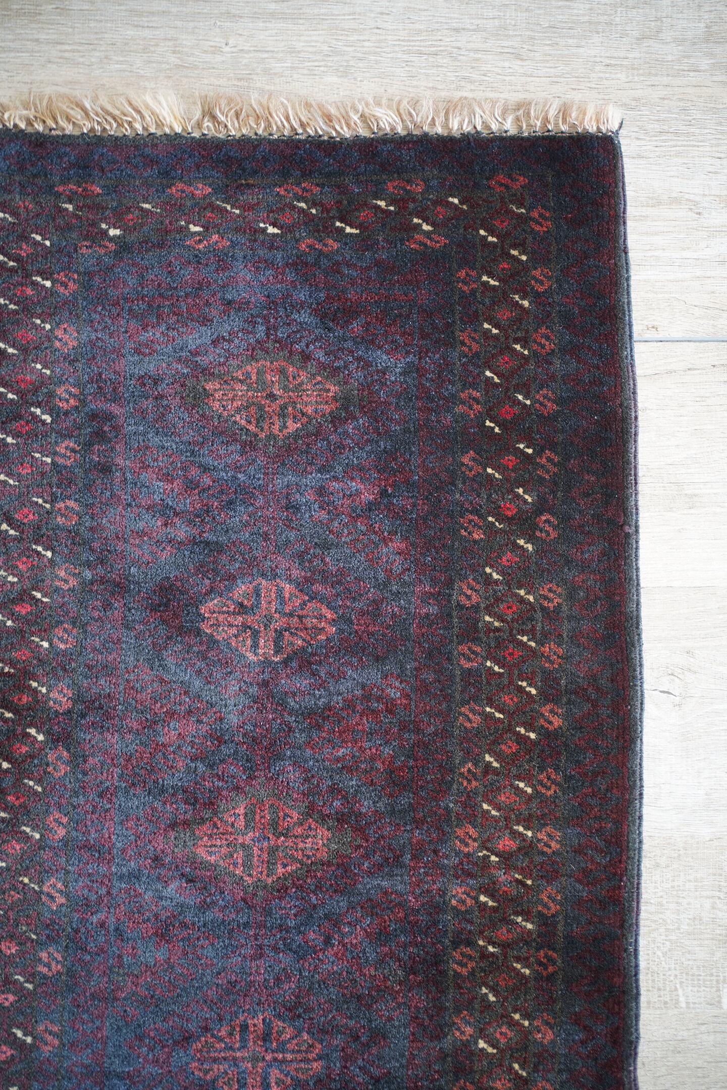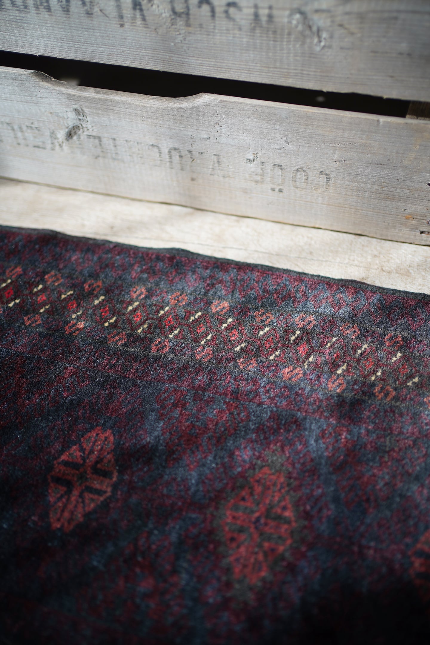 ベルベットもしくはベロアを彷彿とさせるほどの艶が美しいバルーチラグ。かなり暗めの濃紺と紫の配色で、気品溢れる雰囲気が素敵です。経年80年のセミアンティークとは思えないほど状態と質感が素晴らしい一枚。サラッと柔らかく滑らかな気持ちの良い肌触り、厚みは6mm程度となります。コンディションも大変良好です。