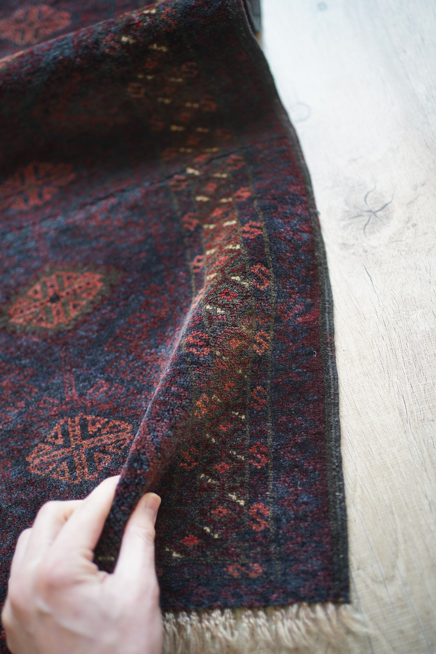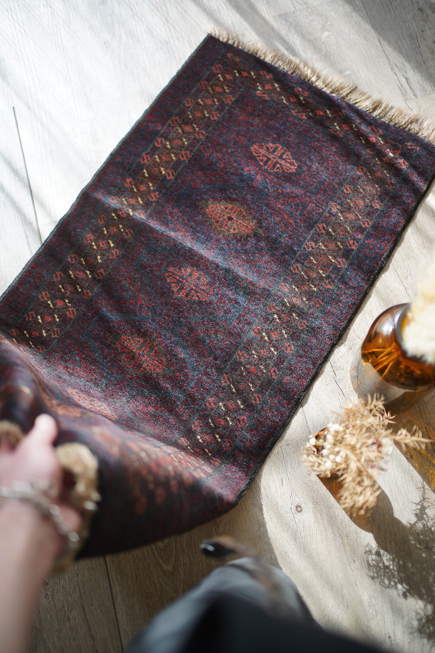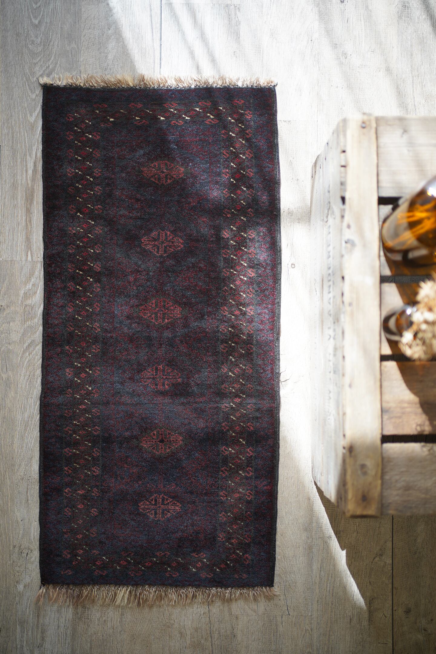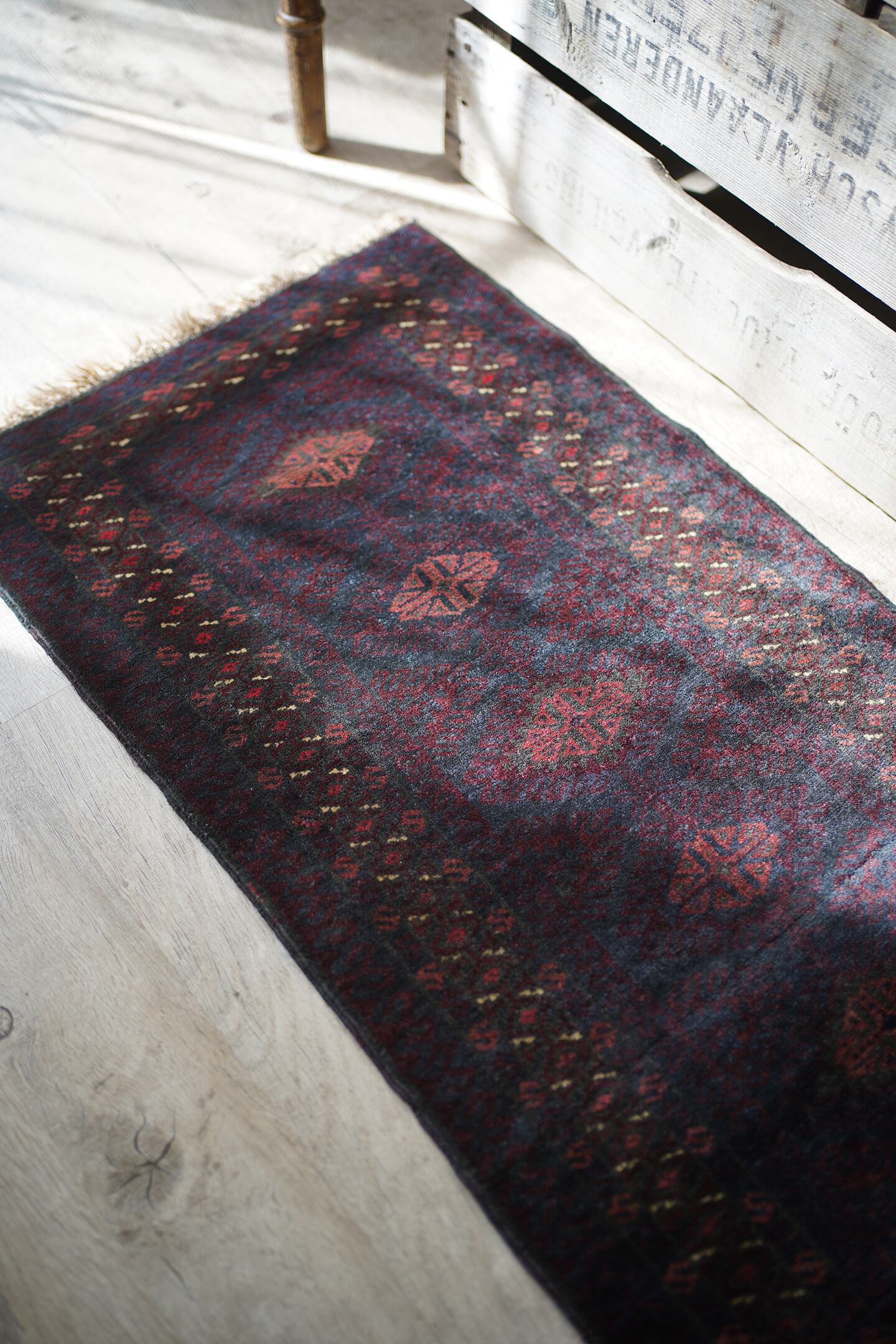 ベルベットもしくはベロアを彷彿とさせるほどの艶が美しいバルーチラグ。かなり暗めの濃紺と紫の配色で、気品溢れる雰囲気が素敵です。経年80年のセミアンティークとは思えないほど状態と質感が素晴らしい一枚。サラッと柔らかく滑らかな気持ちの良い肌触り、厚みは6mm程度となります。コンディションも大変良好です。