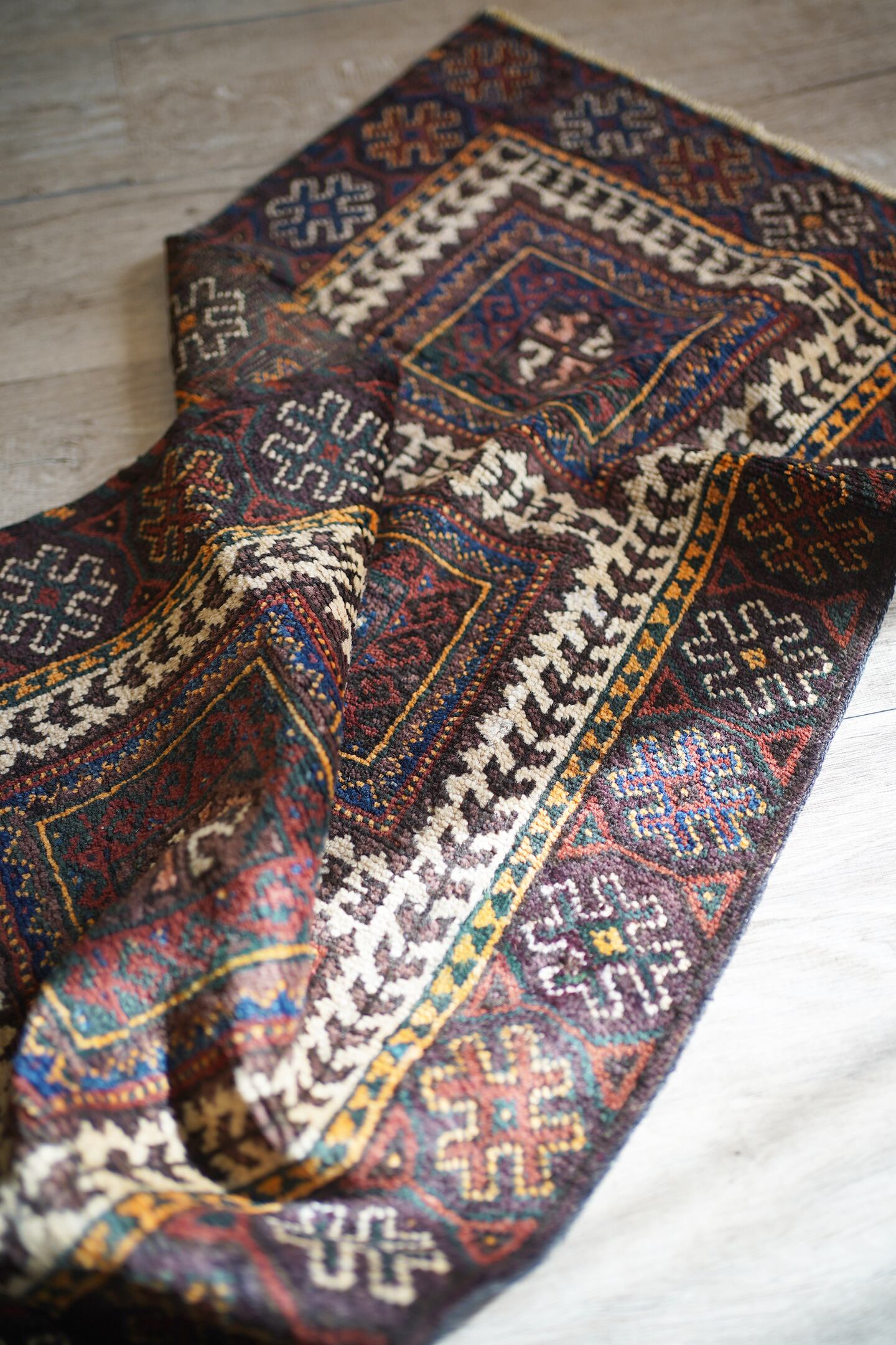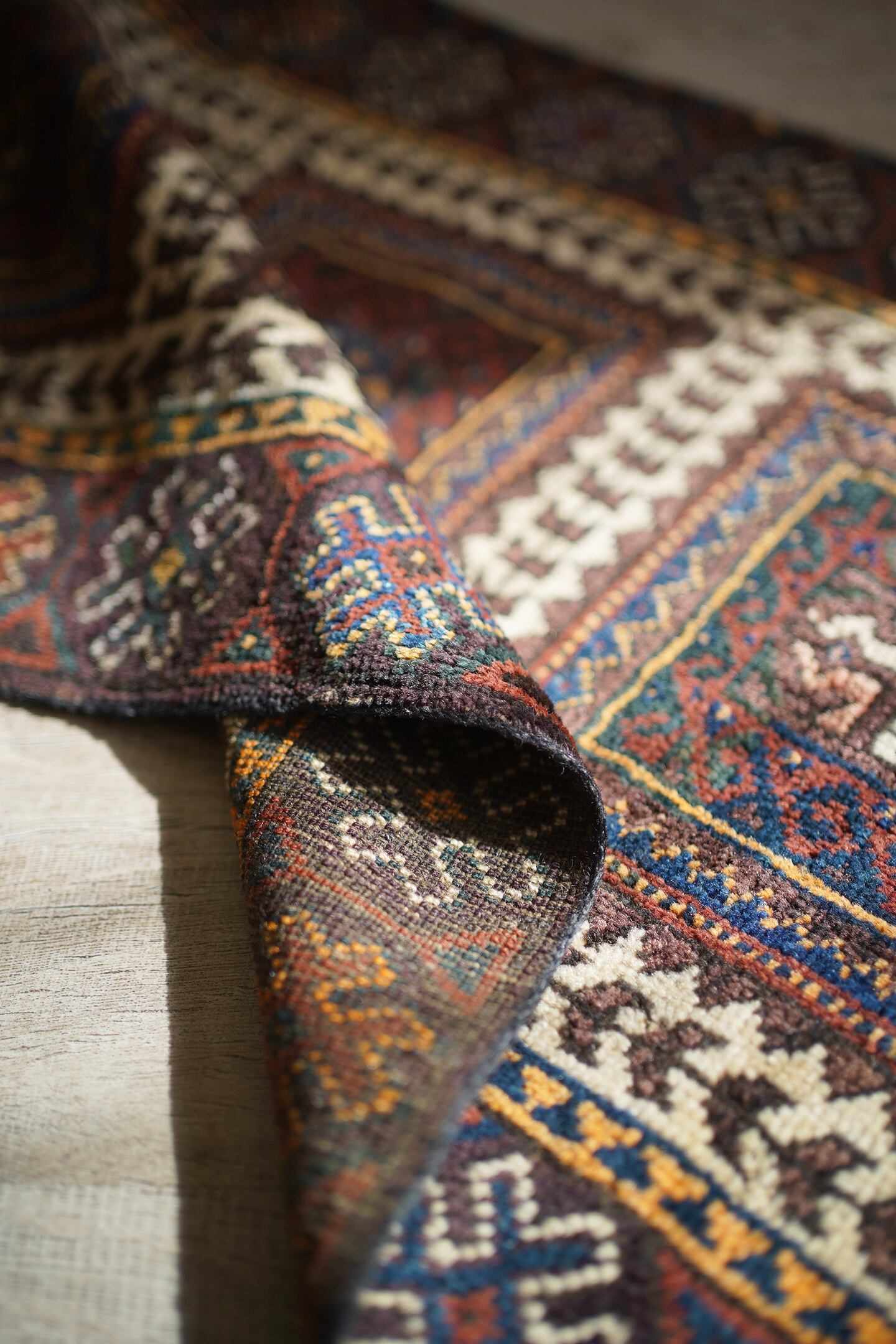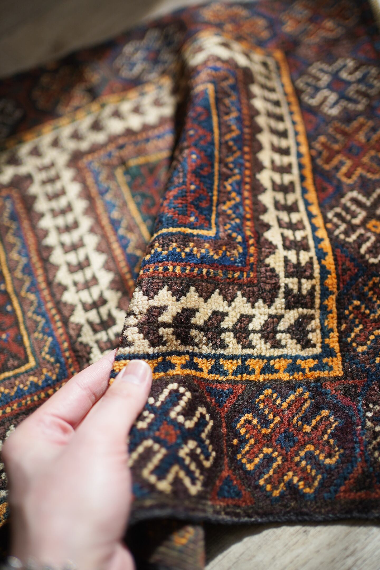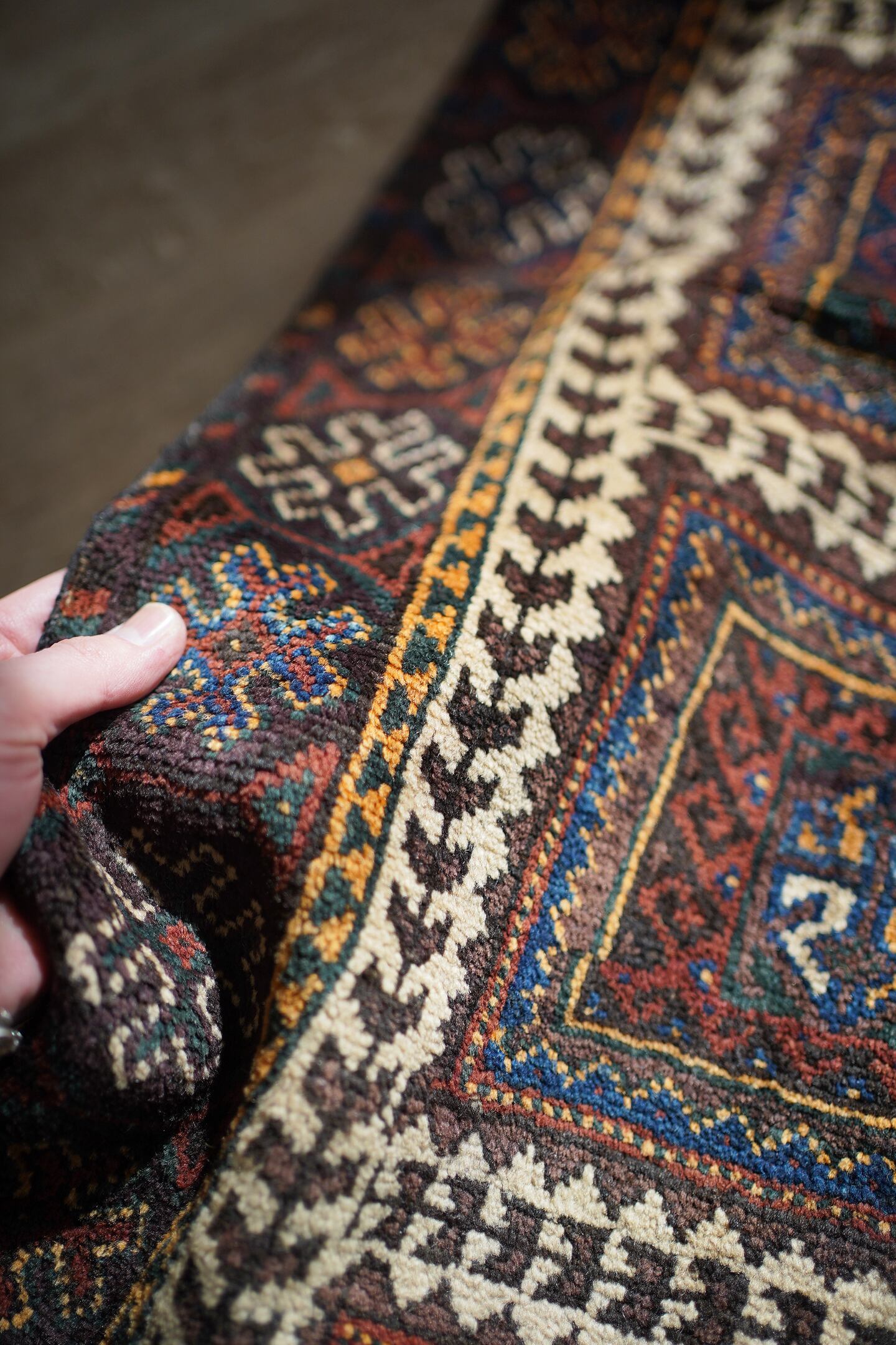 80年ほど前にシスターン地方(イラン東部~アフガニスタン西部)で織られたセミアンティークのバルーチ。ブラウンベースとベージュをベースにした配色にブルーの差し色が使用されています。クタっとした質感で、表面はサラッと滑らかな肌触り。厚みは3mm〜4mm程なので、かなり薄めのラグとなります。補修跡もなくコンディションも大変良好です。玄関や棚の前に敷いたり、薄手なのでタペストリーにもオススメ♫