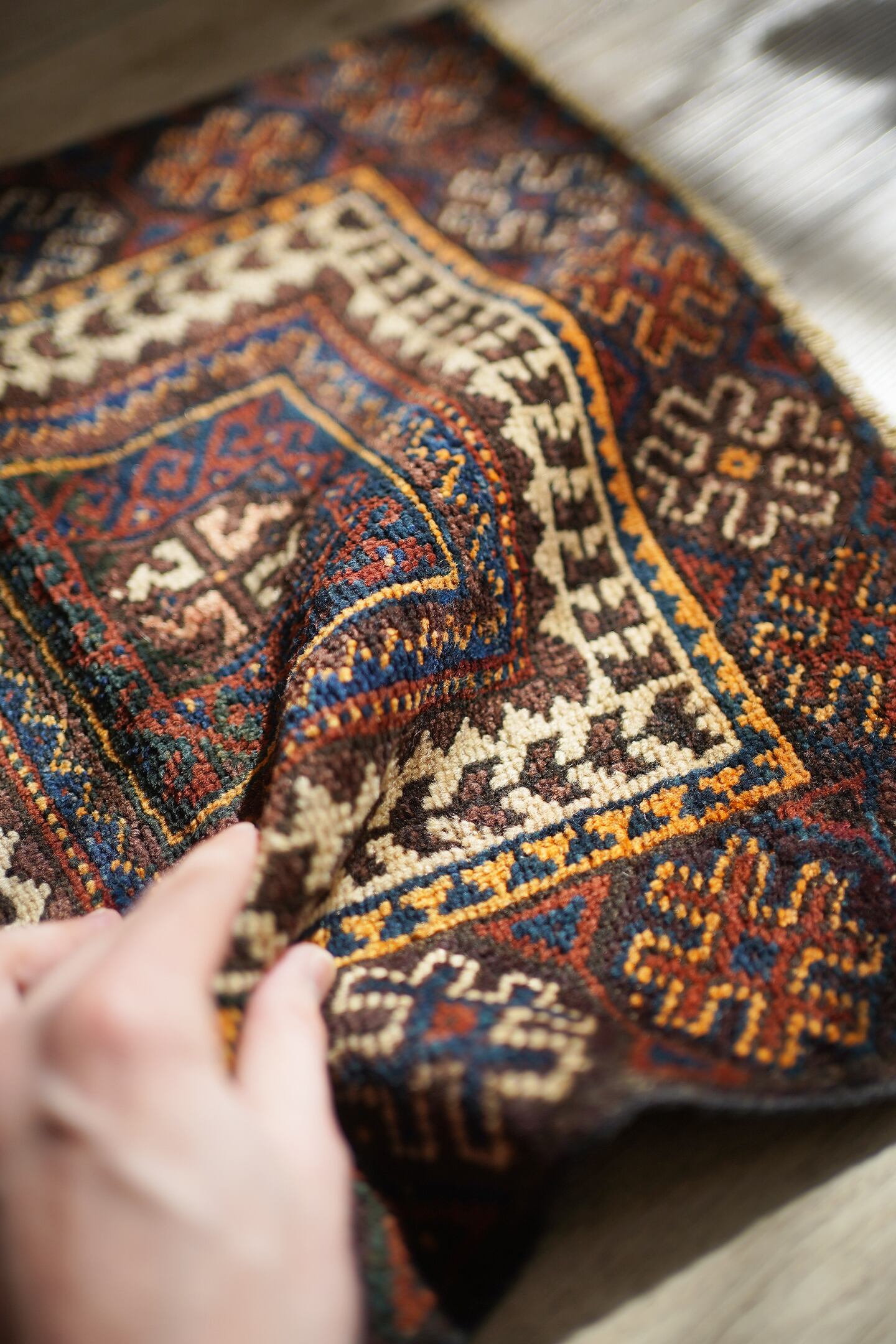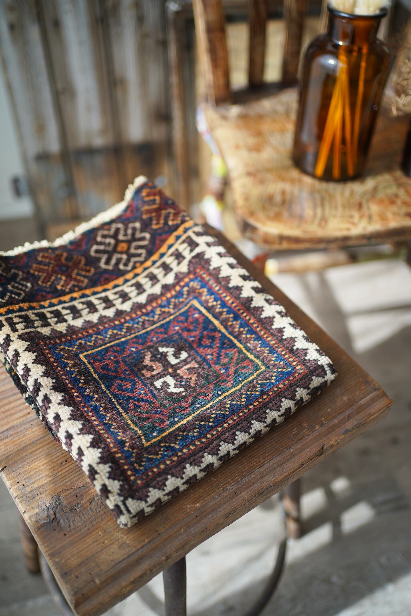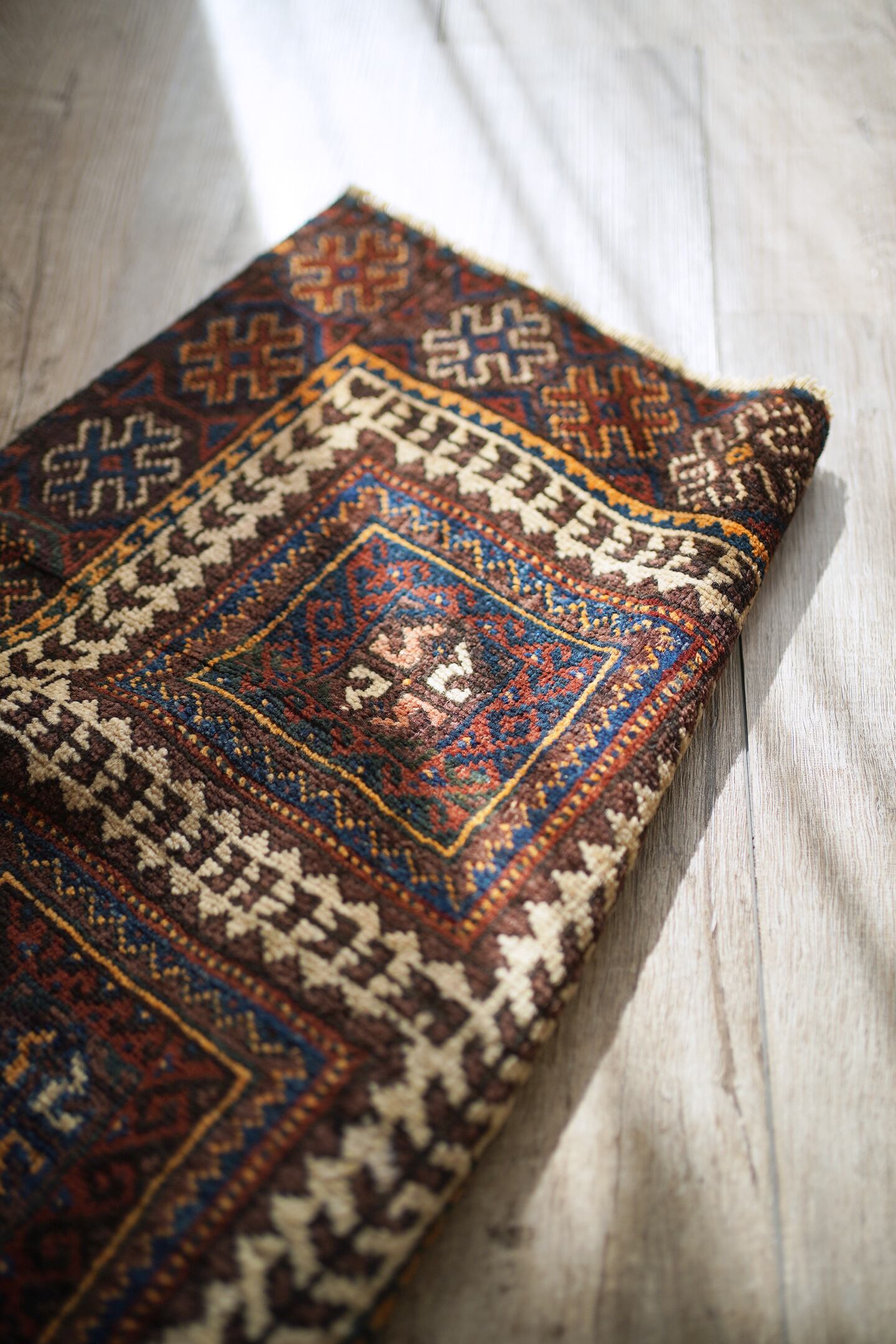 80年ほど前にシスターン地方(イラン東部~アフガニスタン西部)で織られたセミアンティークのバルーチ。ブラウンベースとベージュをベースにした配色にブルーの差し色が使用されています。クタっとした質感で、表面はサラッと滑らかな肌触り。厚みは3mm〜4mm程なので、かなり薄めのラグとなります。補修跡もなくコンディションも大変良好です。玄関や棚の前に敷いたり、薄手なのでタペストリーにもオススメ♫