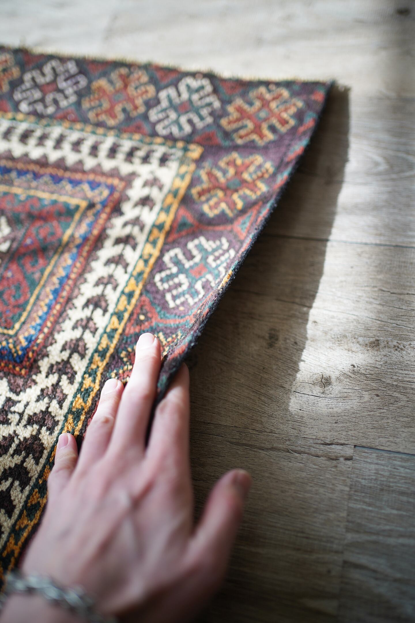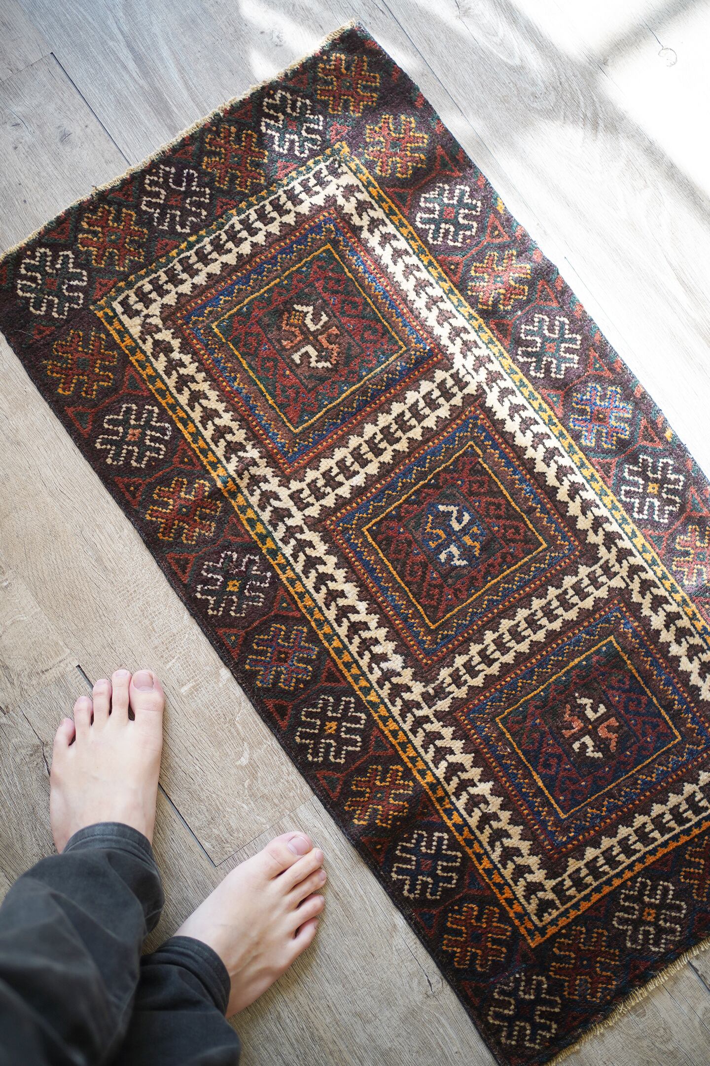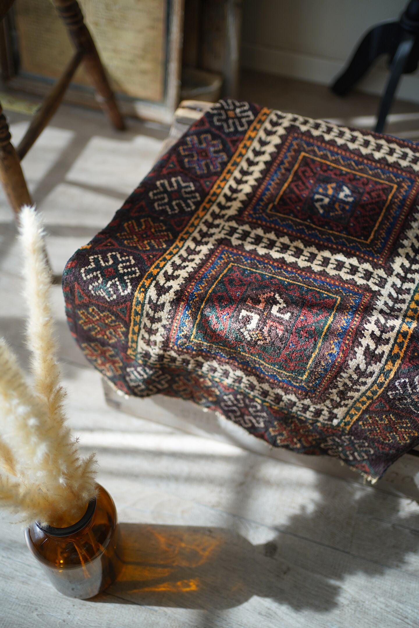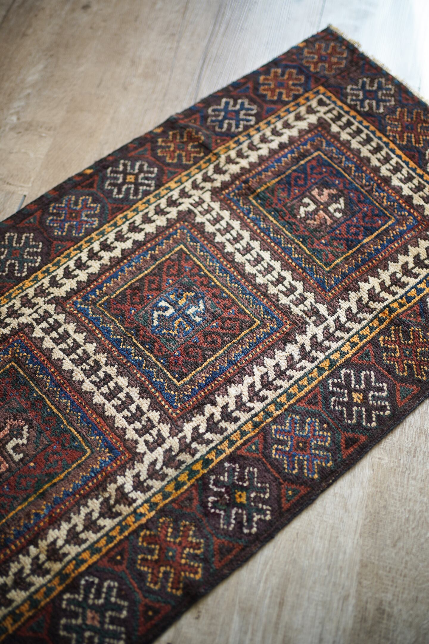 80年ほど前にシスターン地方(イラン東部~アフガニスタン西部)で織られたセミアンティークのバルーチ。ブラウンベースとベージュをベースにした配色にブルーの差し色が使用されています。クタっとした質感で、表面はサラッと滑らかな肌触り。厚みは3mm〜4mm程なので、かなり薄めのラグとなります。補修跡もなくコンディションも大変良好です。玄関や棚の前に敷いたり、薄手なのでタペストリーにもオススメ♫