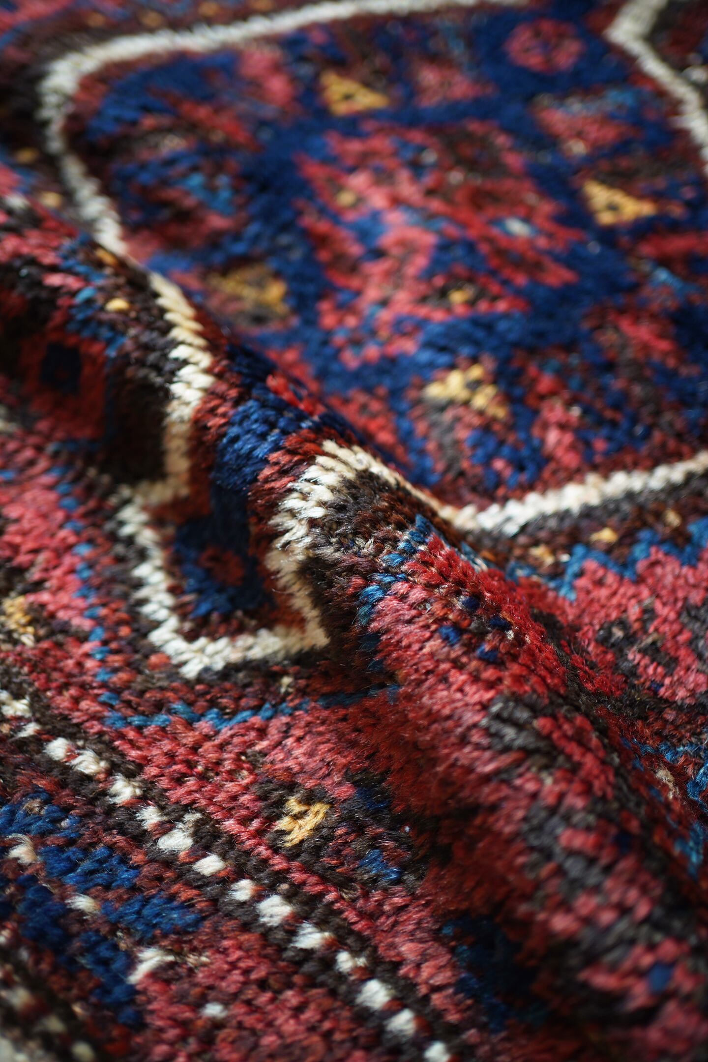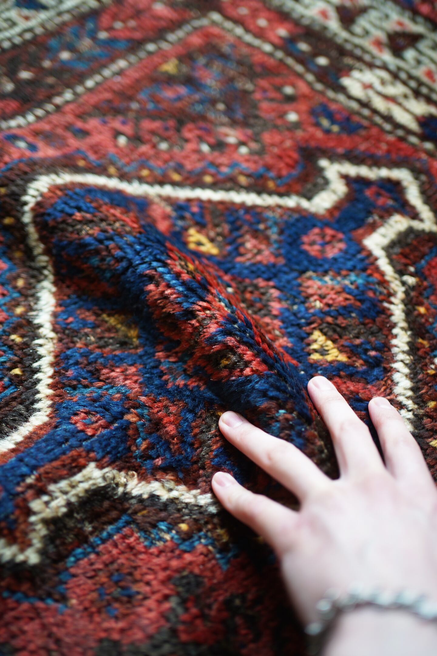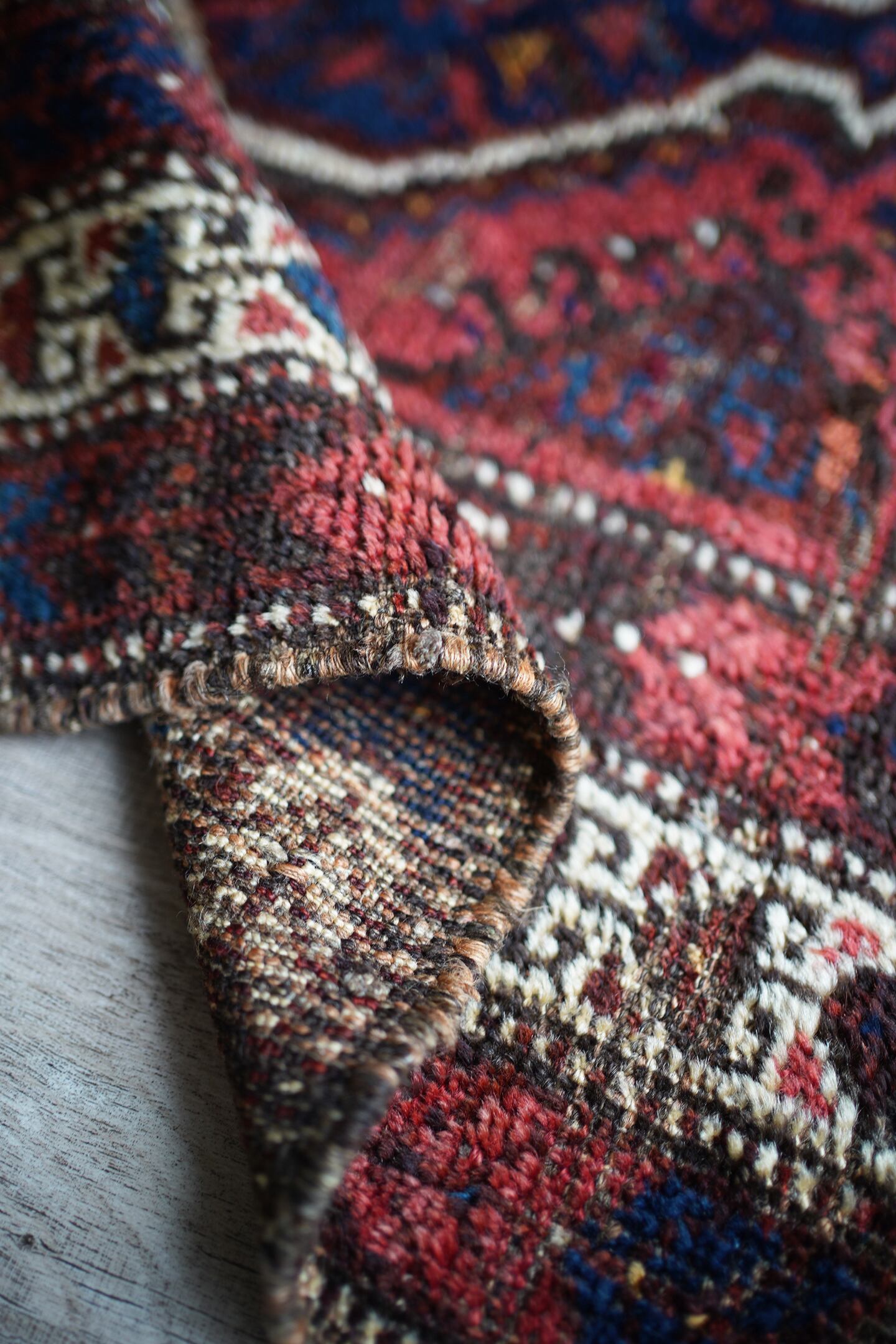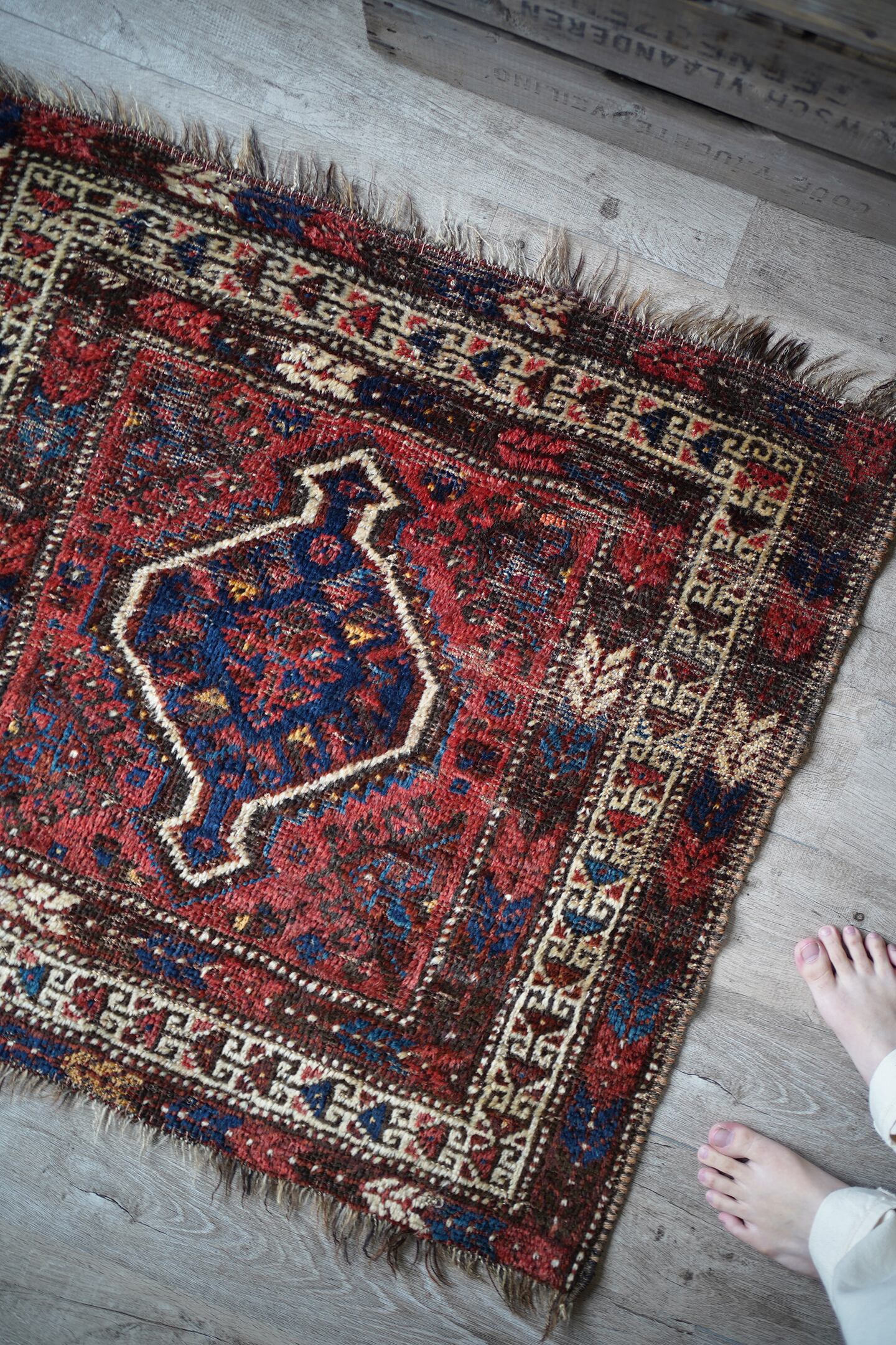 美しい艶を持ち合わせるセミアンティークのカシュガイラグです。レッド、ネイビー、ブラウン、ベージュのバランスの取れた配色で、経年による擦れもまた素敵な味わいを感じさせます。サラふわで、つるっとした滑らかな触り心地、厚みは6mm前後となります。補修跡とパイルがすり減ってなくなっている箇所がございます(お写真最後の2枚をご参照ください)。また、フリンジは専門的にふさ止め処理が施されています。スクエアタイプなので、玄関やヒーターの下、お気に入りのスペースにいかがでしょうか♪