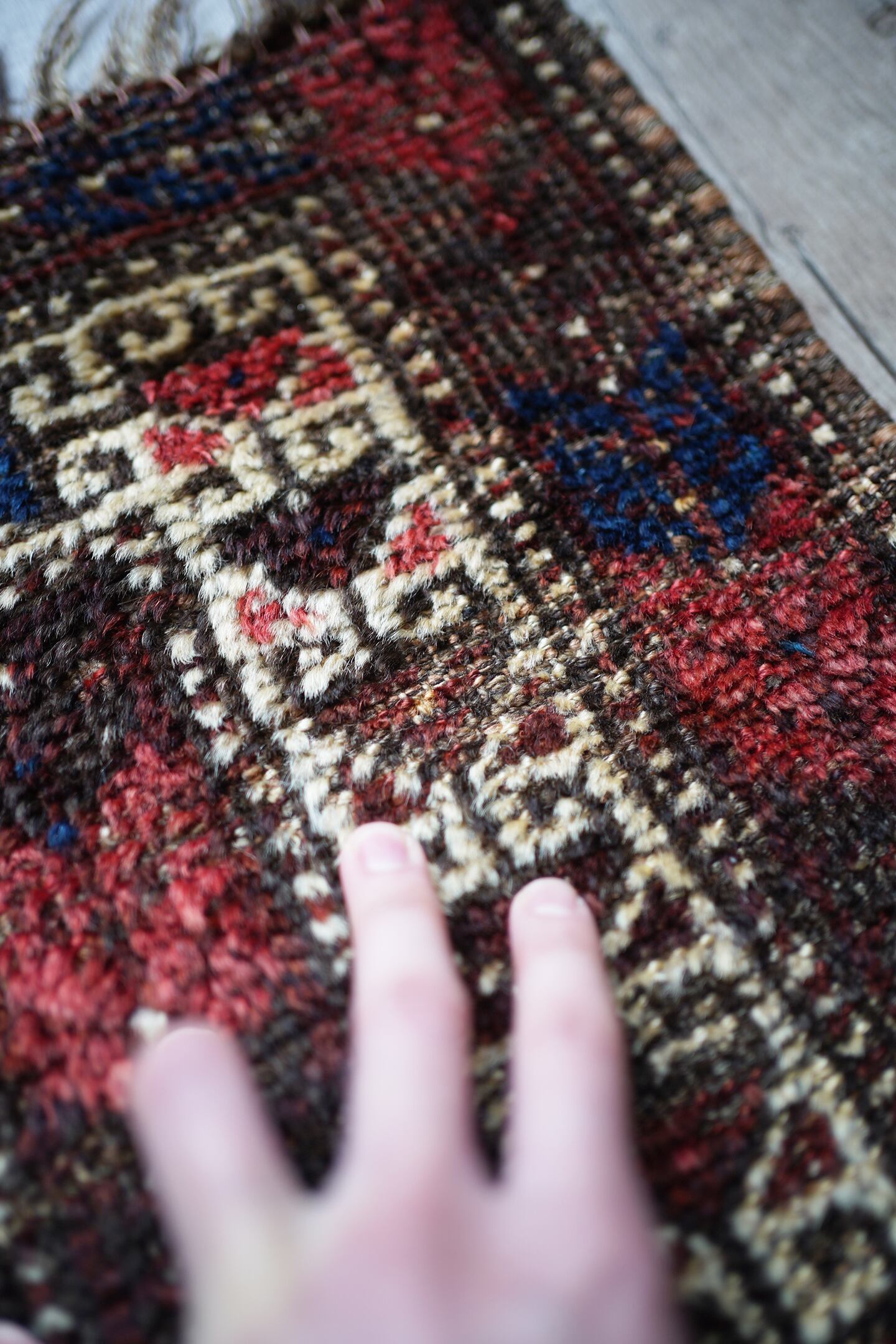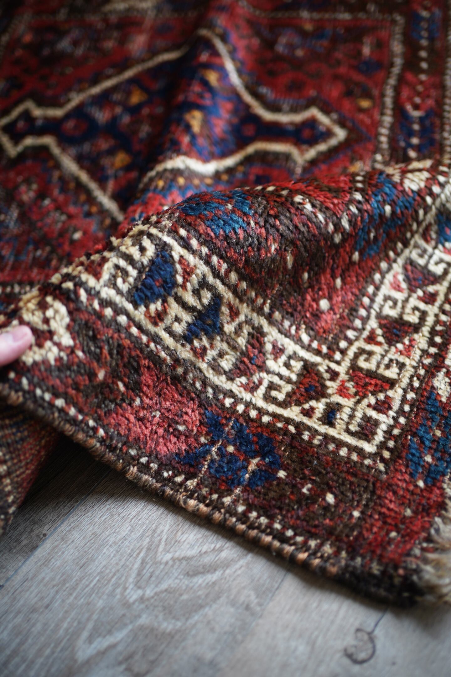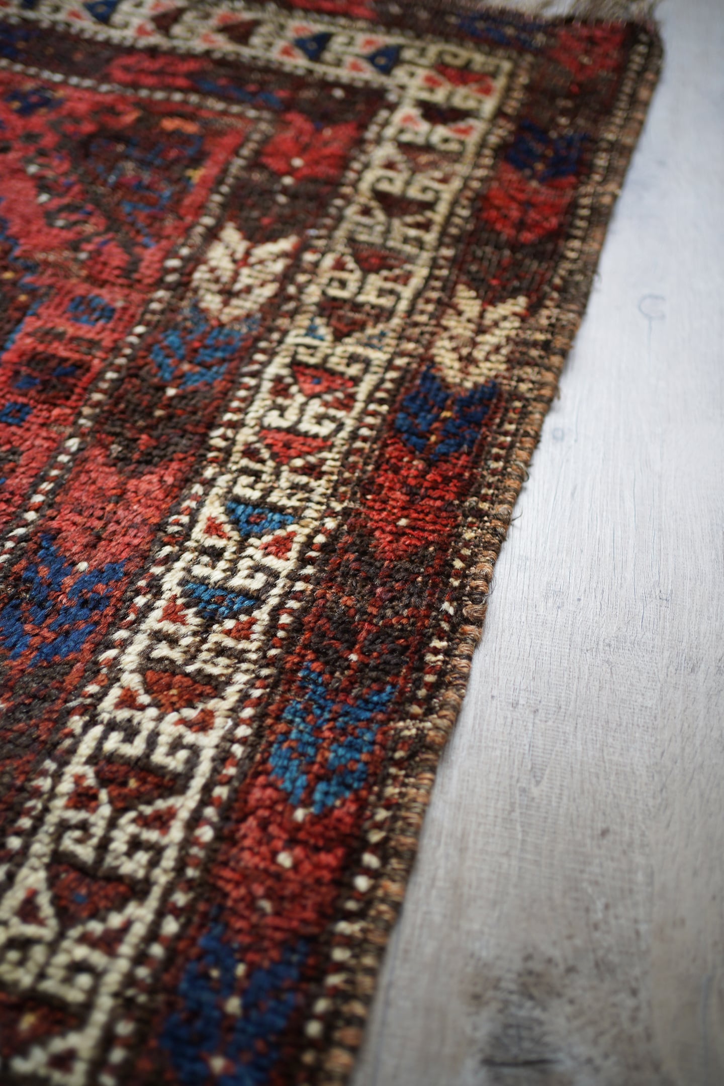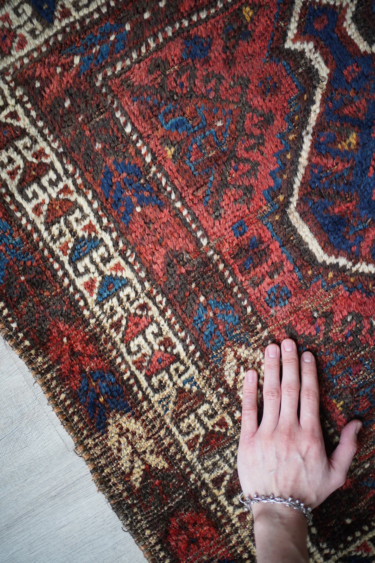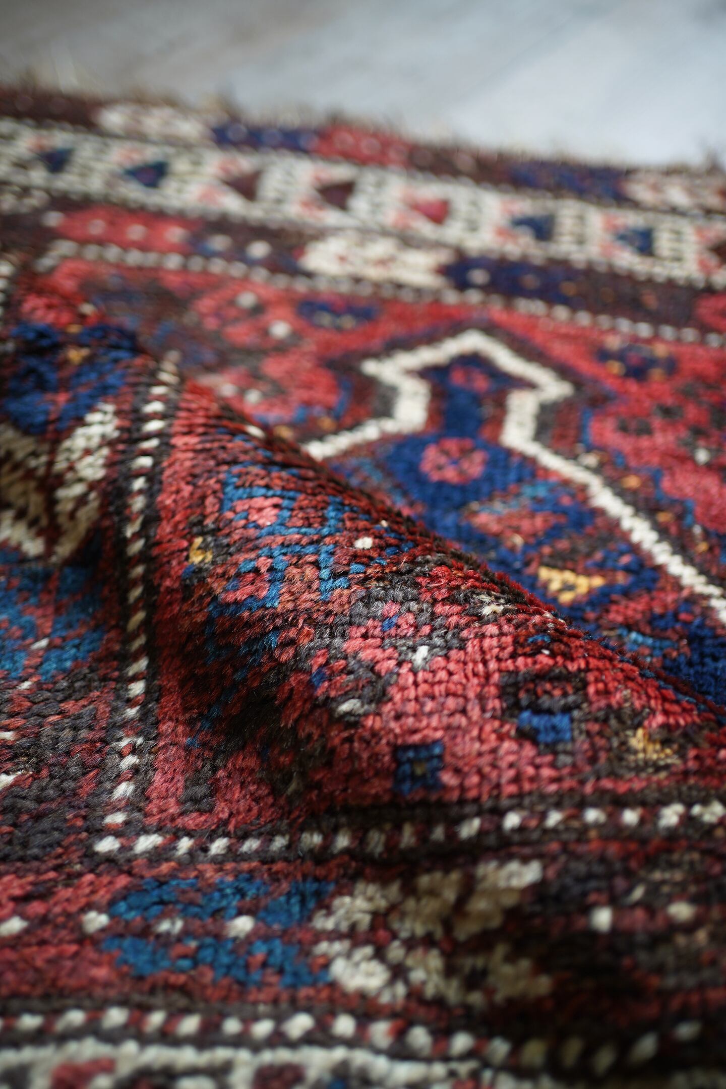 美しい艶を持ち合わせるセミアンティークのカシュガイラグです。レッド、ネイビー、ブラウン、ベージュのバランスの取れた配色で、経年による擦れもまた素敵な味わいを感じさせます。サラふわで、つるっとした滑らかな触り心地、厚みは6mm前後となります。補修跡とパイルがすり減ってなくなっている箇所がございます(お写真最後の2枚をご参照ください)。また、フリンジは専門的にふさ止め処理が施されています。スクエアタイプなので、玄関やヒーターの下、お気に入りのスペースにいかがでしょうか♪