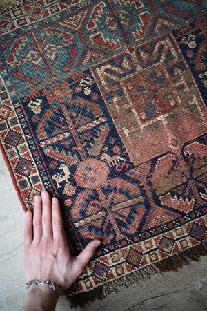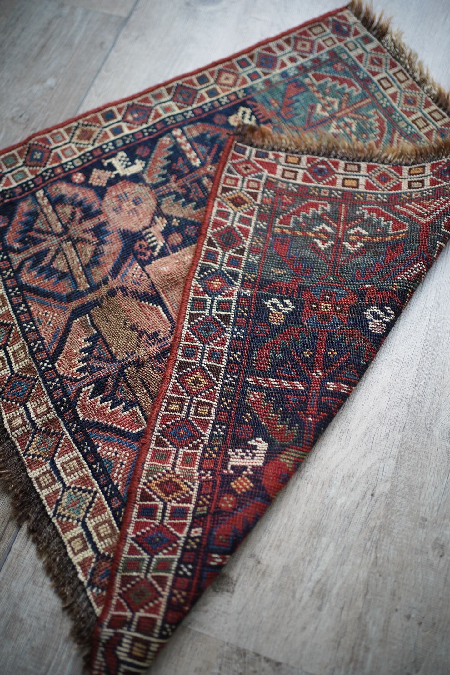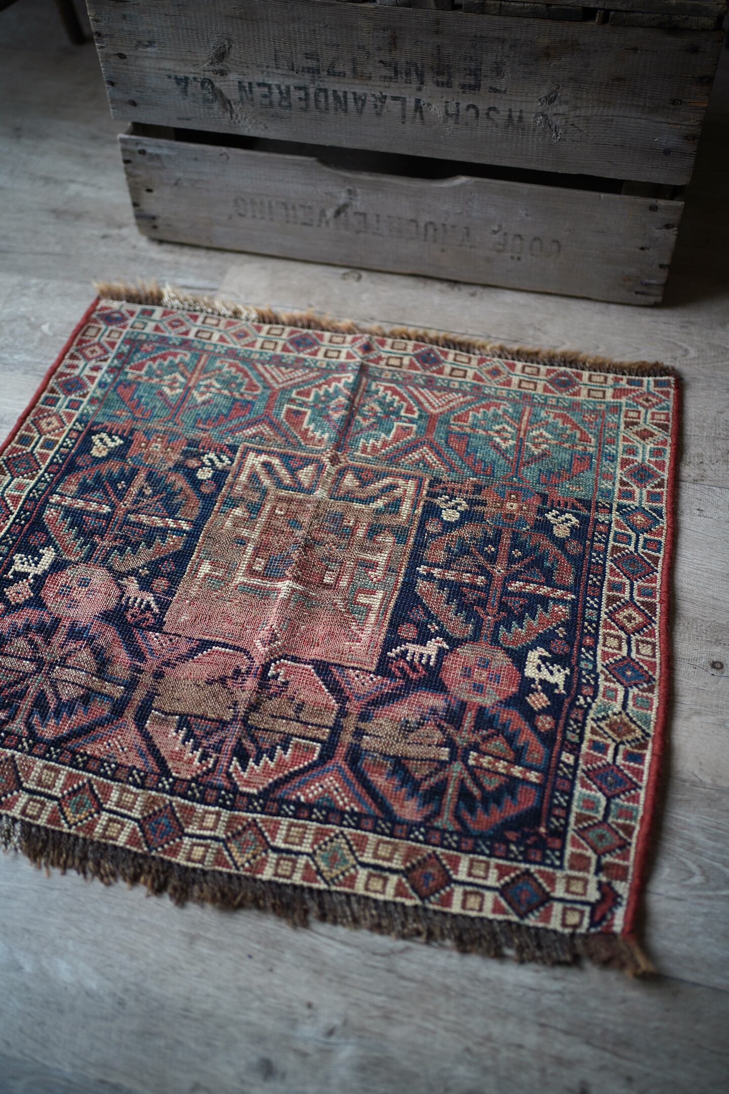 ※こちらは元々、遊牧民が移動する際に家畜のロバや馬の背中に掛けて移動用の袋として利用していたサドルバッグの表面を切り取って作られたラグとなります。