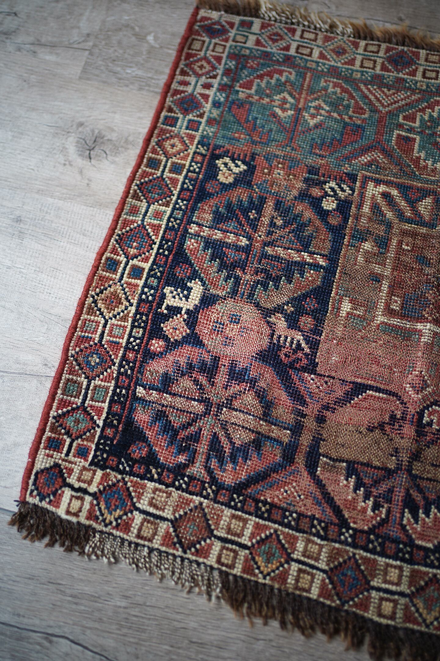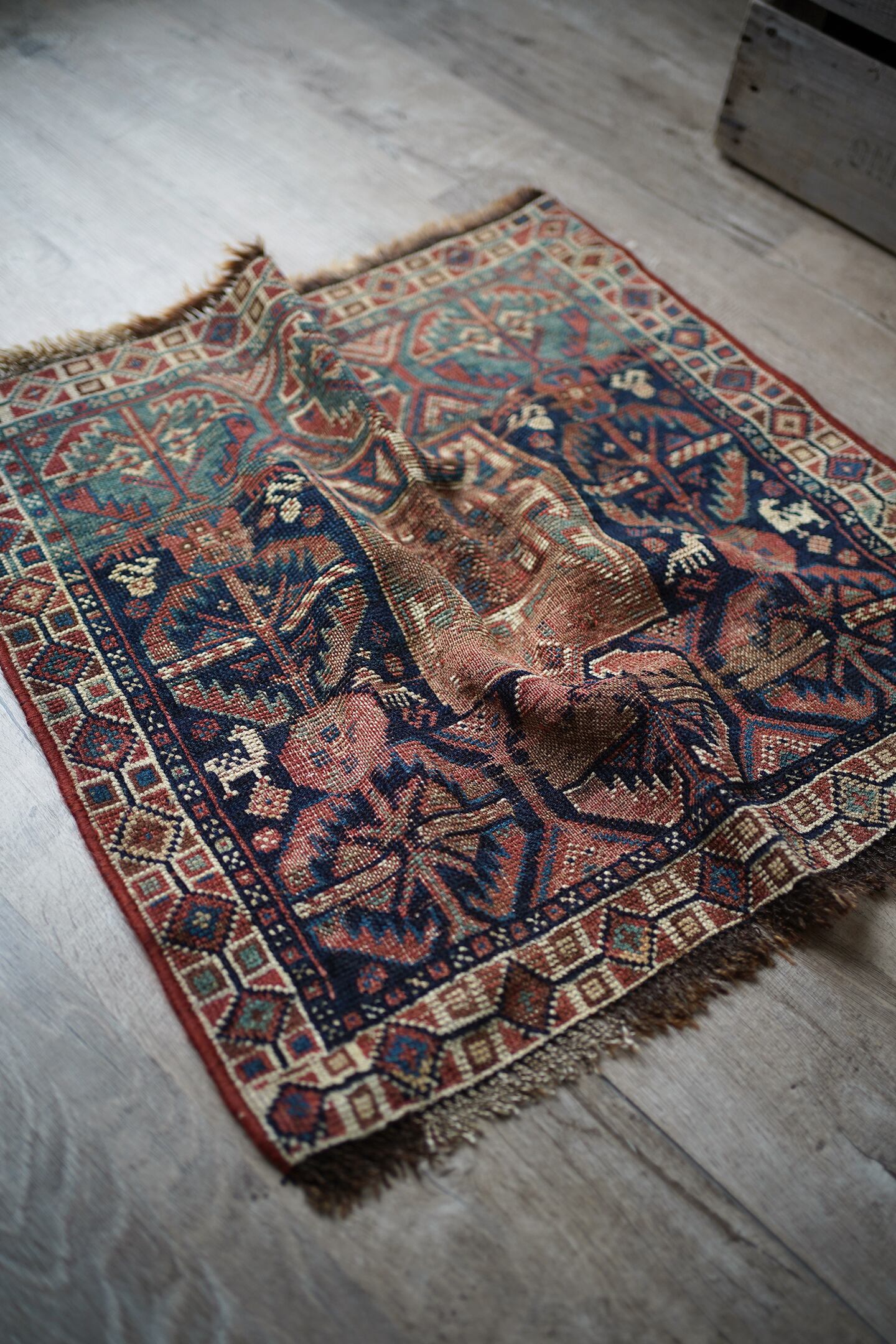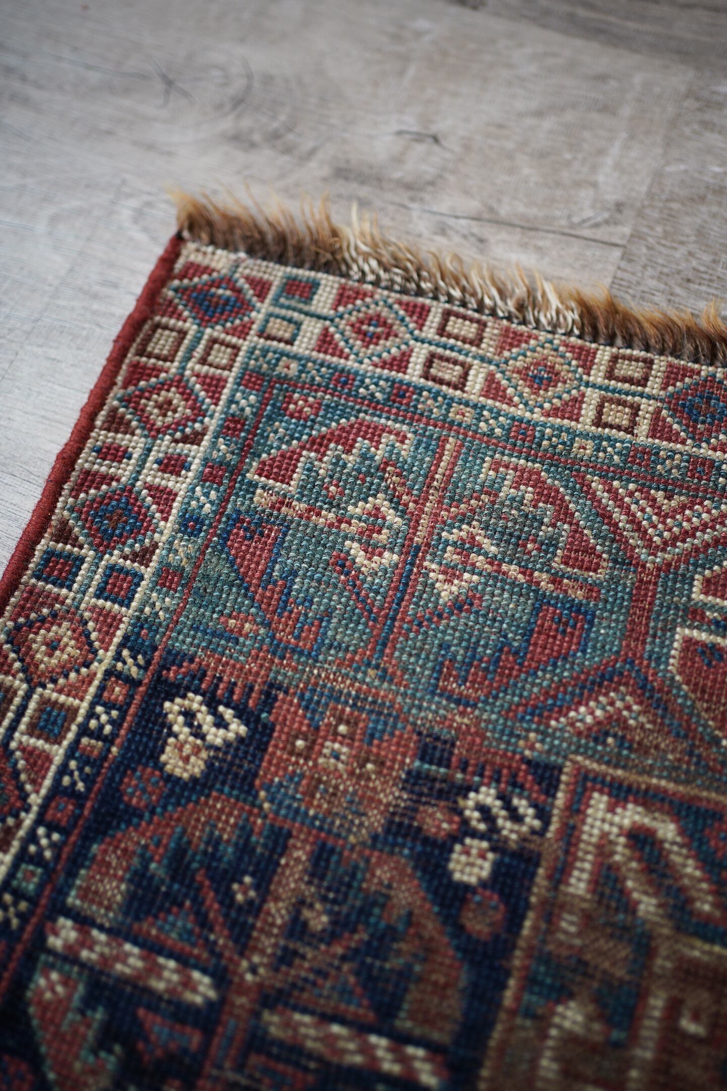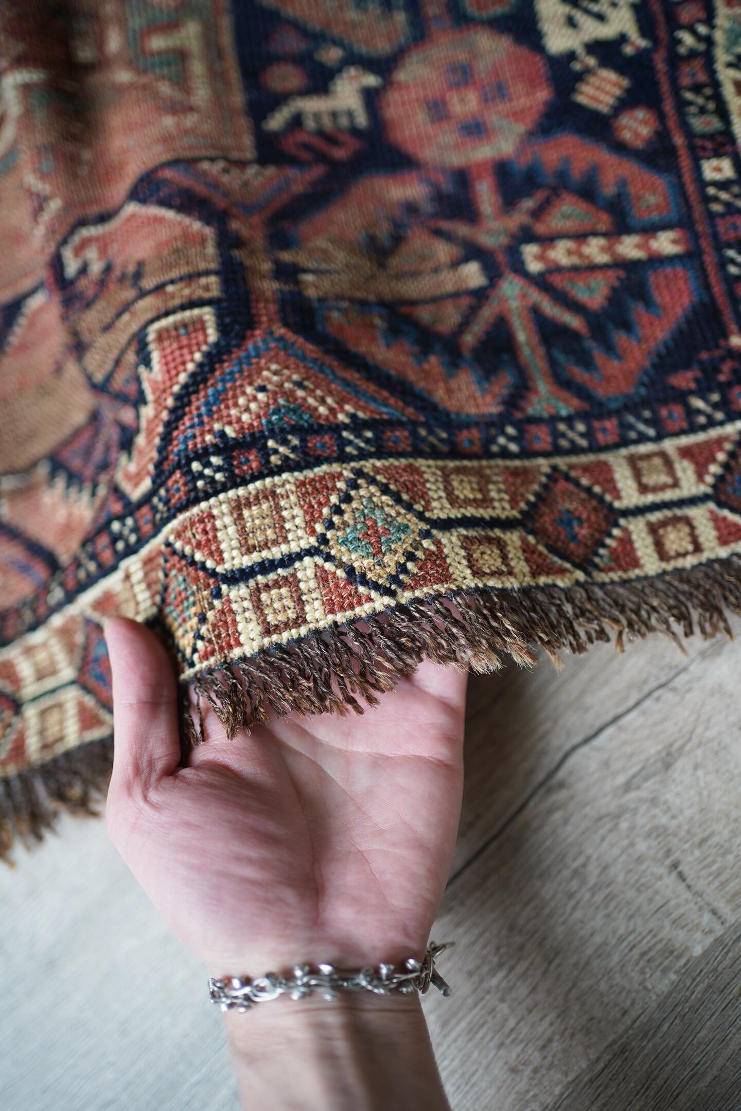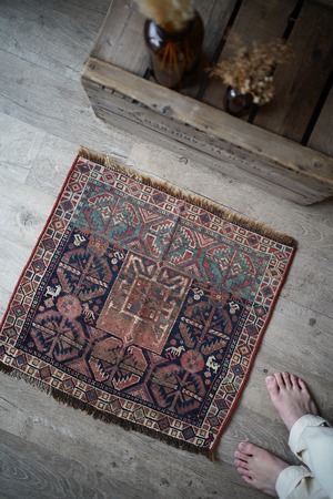 約120年〜140年前に織られたハムセ連合のラグです。100年以上前の歴史を感じさせる褪色具合が非常にカッコよく、小さいサイズながらとても存在感のある一枚です。トゲのある葉文様のデザインで、よく見ると小さく動物も織り込まれおり、渋さの中にもほっこりする一面も垣間見えます。上部の1/3が異なる毛糸を使用しているのも面白いポイントです。パイルはほとんど残っておらず、厚みは3.5mm程度。かなり薄くクタっとした質感のため、タペストリーとして壁に飾るのがオススメです。壁に飾ったハムセのラグを眺めながらコーヒーや紅茶を飲むひととき、想像しただけで最高ではないでしょうか♪