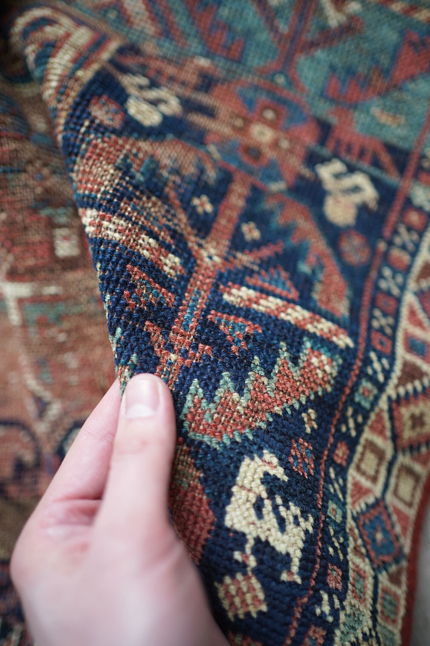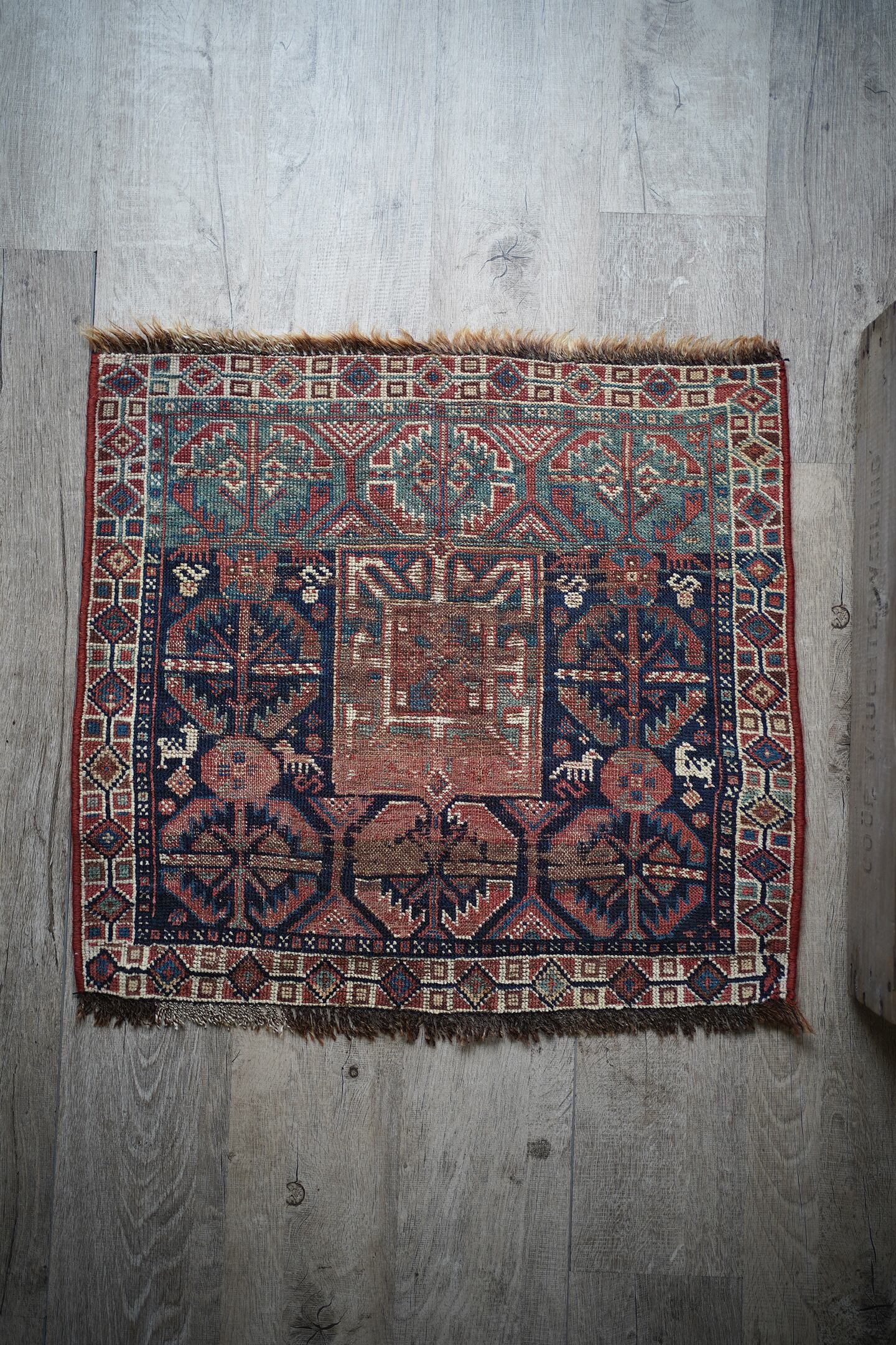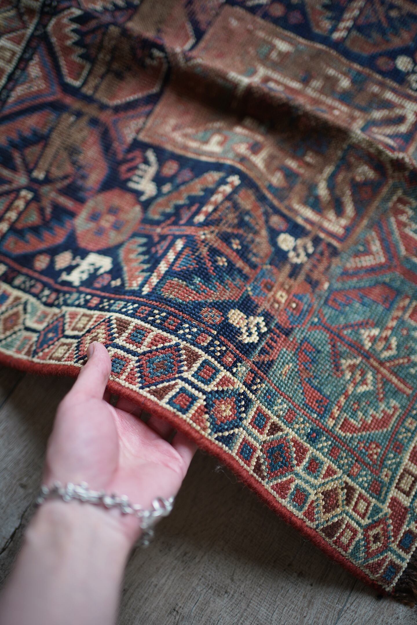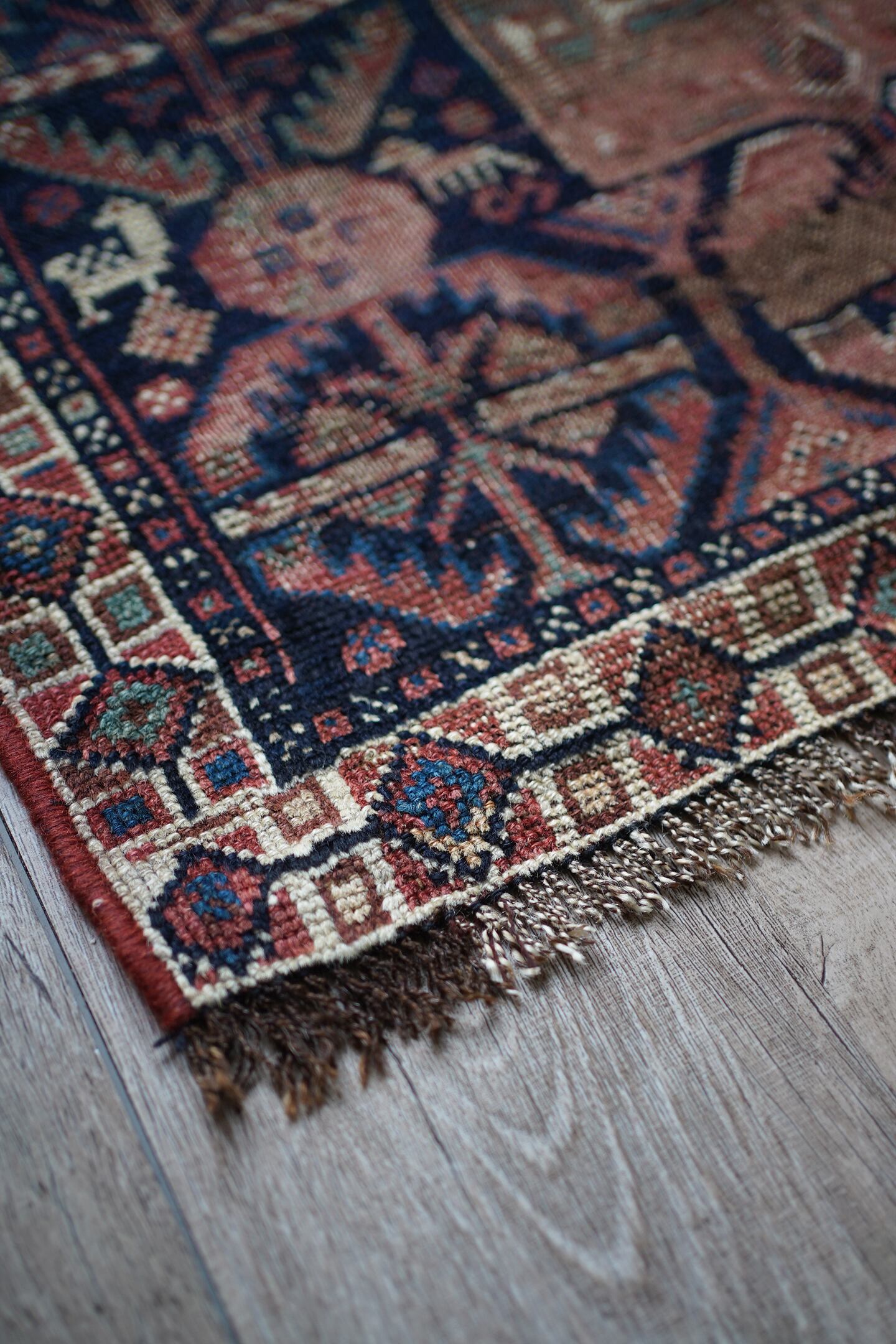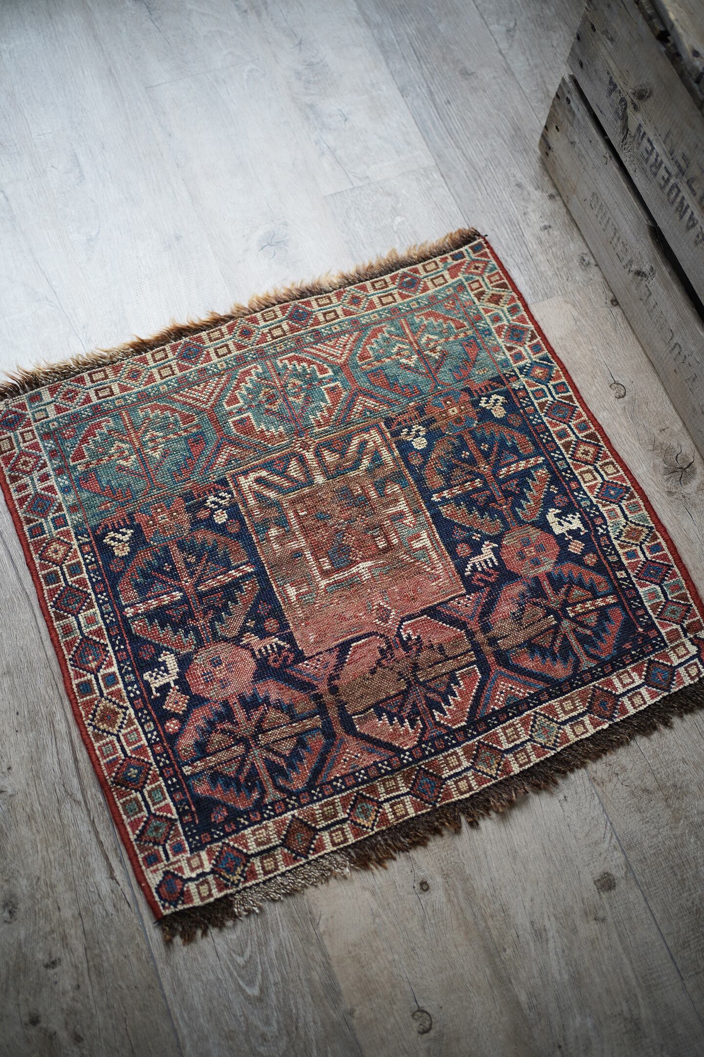 約120年〜140年前に織られたハムセ連合のラグです。100年以上前の歴史を感じさせる褪色具合が非常にカッコよく、小さいサイズながらとても存在感のある一枚です。トゲのある葉文様のデザインで、よく見ると小さく動物も織り込まれおり、渋さの中にもほっこりする一面も垣間見えます。上部の1/3が異なる毛糸を使用しているのも面白いポイントです。パイルはほとんど残っておらず、厚みは3.5mm程度。かなり薄くクタっとした質感のため、タペストリーとして壁に飾るのがオススメです。壁に飾ったハムセのラグを眺めながらコーヒーや紅茶を飲むひととき、想像しただけで最高ではないでしょうか♪