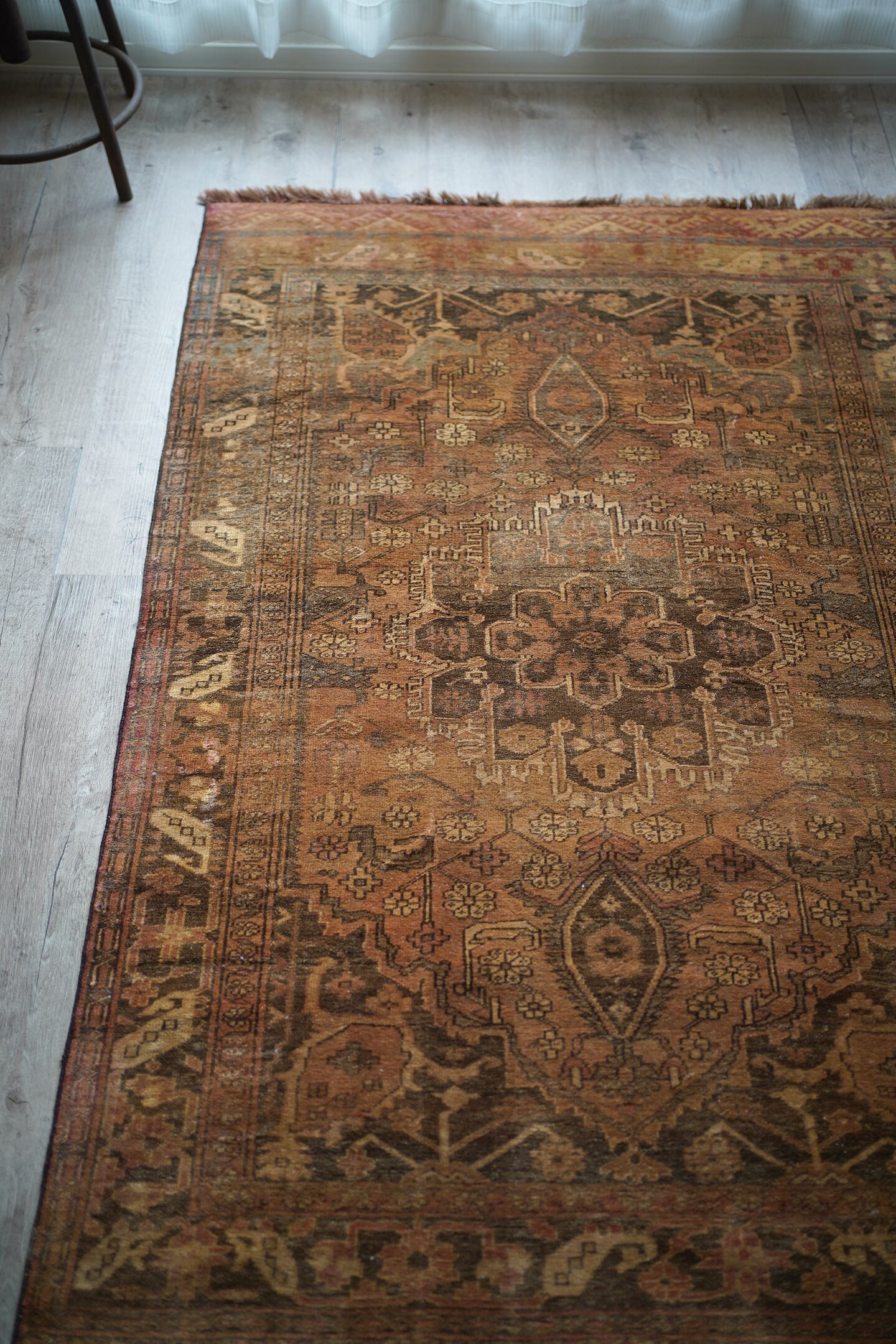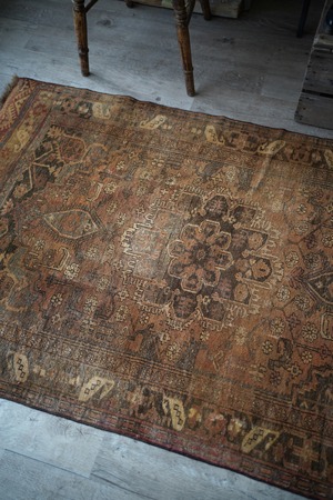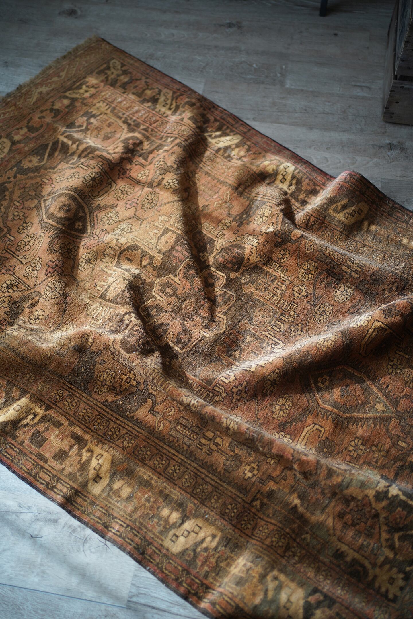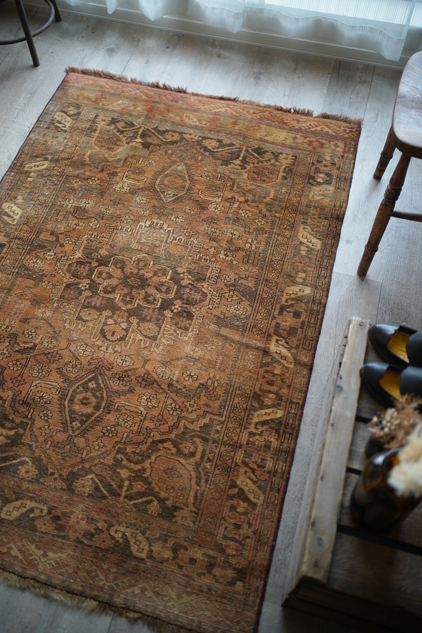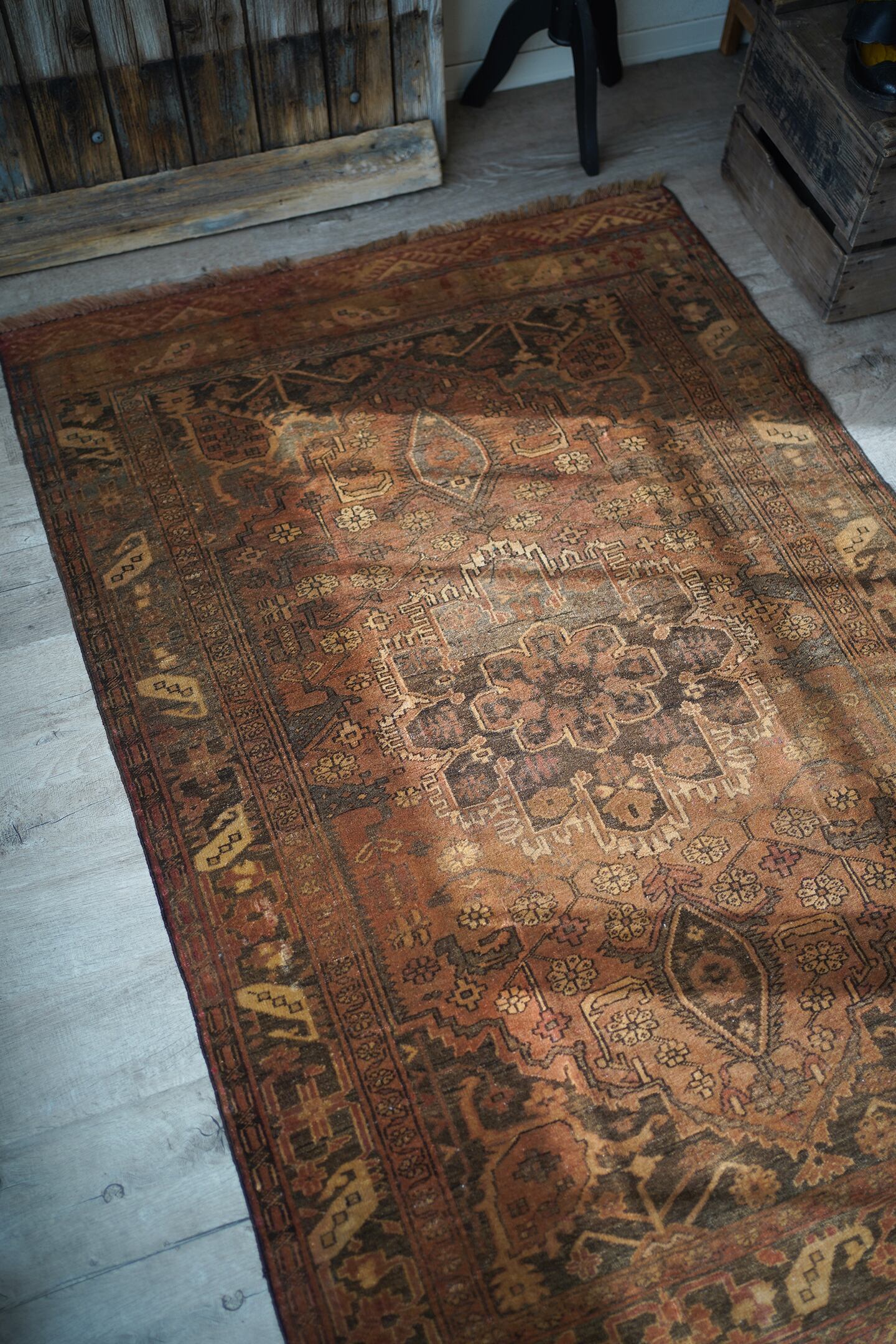 アフガニスタン北西部のカラエナウで織られた経年60年のヴィンテージラグです。こちらのラグはウォッシュ加工により元々発色が強めの赤色だったラグをブラウンのカラーに変色させた一枚です(化学薬品は使用していないため、ラグを傷めることなく変色しております)。当店ではあまり扱わないタイプのラグですが、全体的なカラーリングとデザインに惹かれて今回仕入れてみました。サラサラとした滑らかな肌触り、厚みは5mm程度となります。目立った補修跡もなくコンディションも良好です。落ち着いた色味のラグなので、場所を問わずいろんな場所に馴染んでくれそうです♫