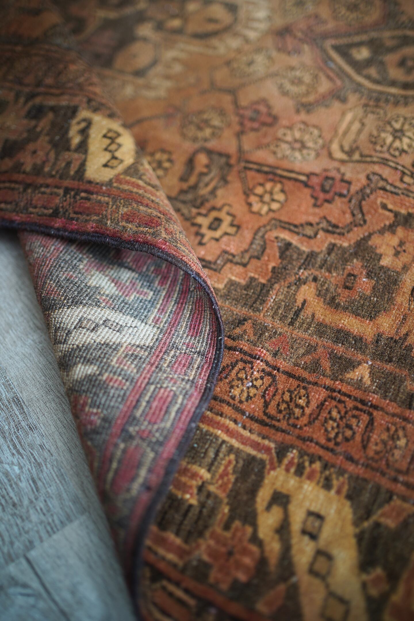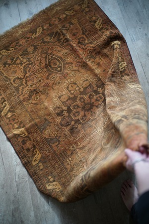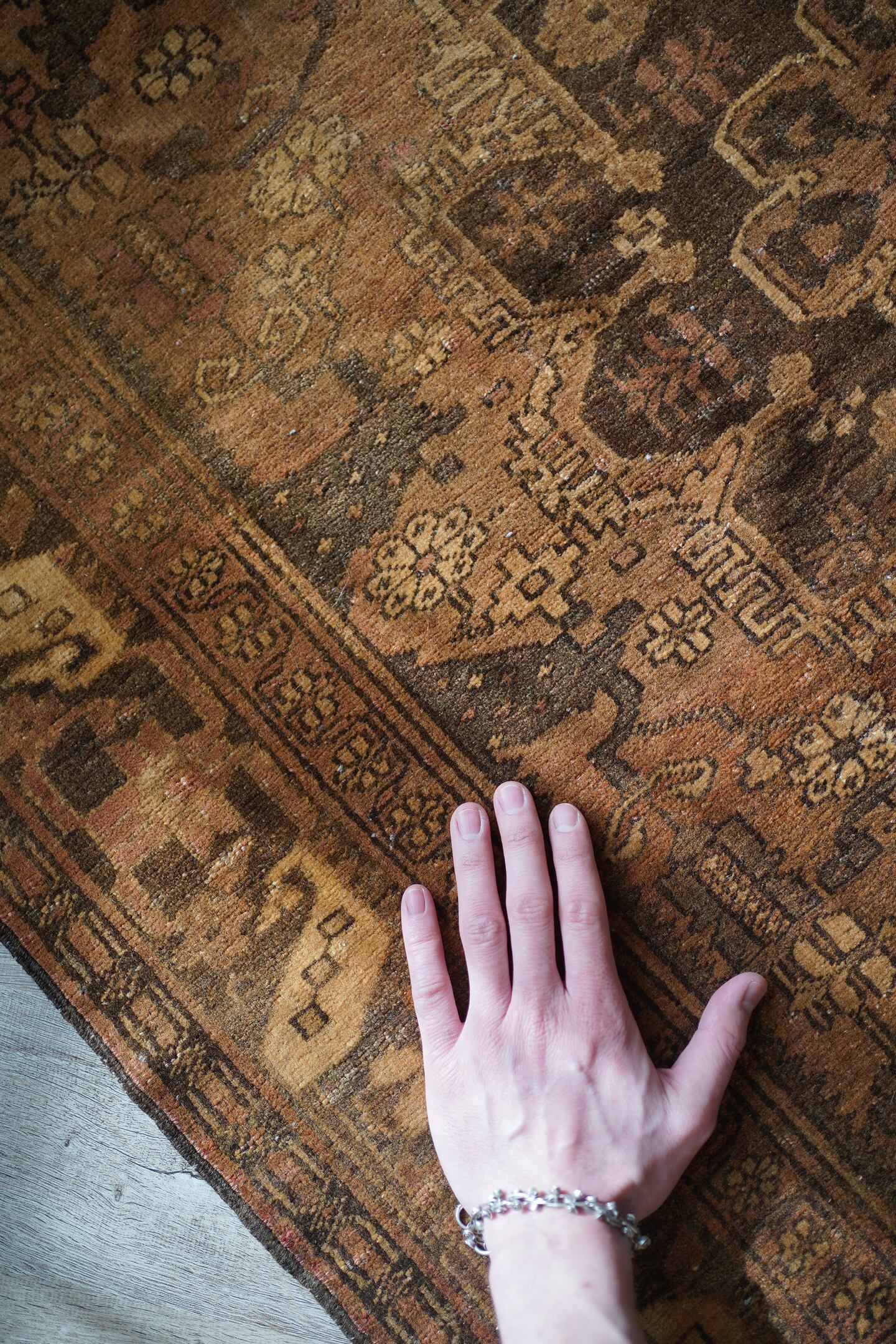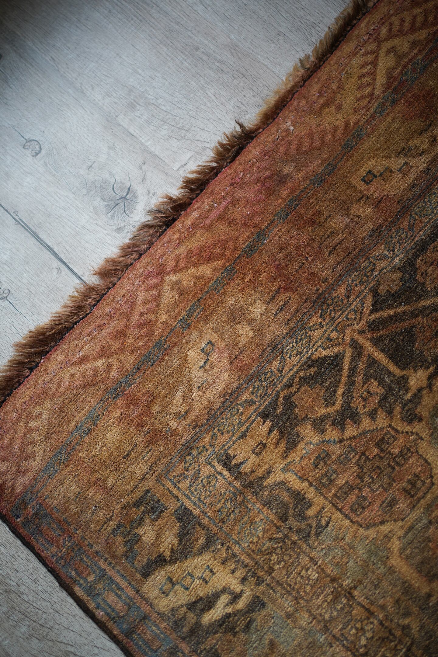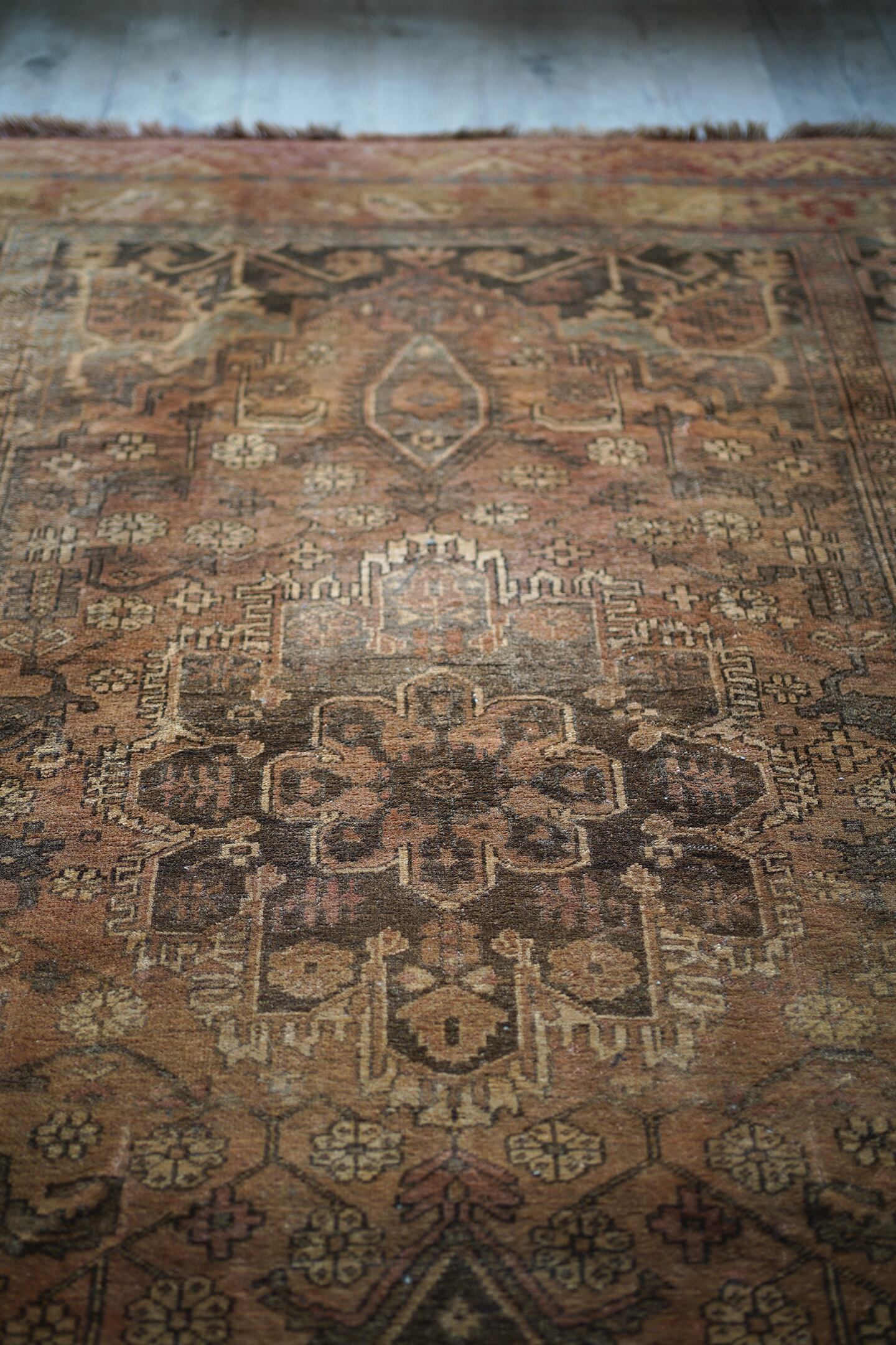 アフガニスタン北西部のカラエナウで織られた経年60年のヴィンテージラグです。こちらのラグはウォッシュ加工により元々発色が強めの赤色だったラグをブラウンのカラーに変色させた一枚です(化学薬品は使用していないため、ラグを傷めることなく変色しております)。当店ではあまり扱わないタイプのラグですが、全体的なカラーリングとデザインに惹かれて今回仕入れてみました。サラサラとした滑らかな肌触り、厚みは5mm程度となります。目立った補修跡もなくコンディションも良好です。落ち着いた色味のラグなので、場所を問わずいろんな場所に馴染んでくれそうです♫