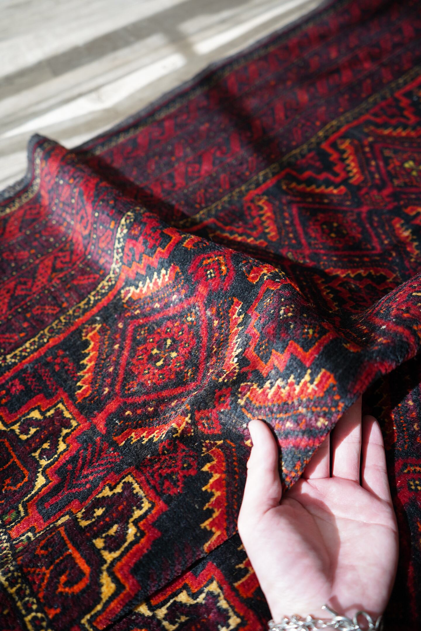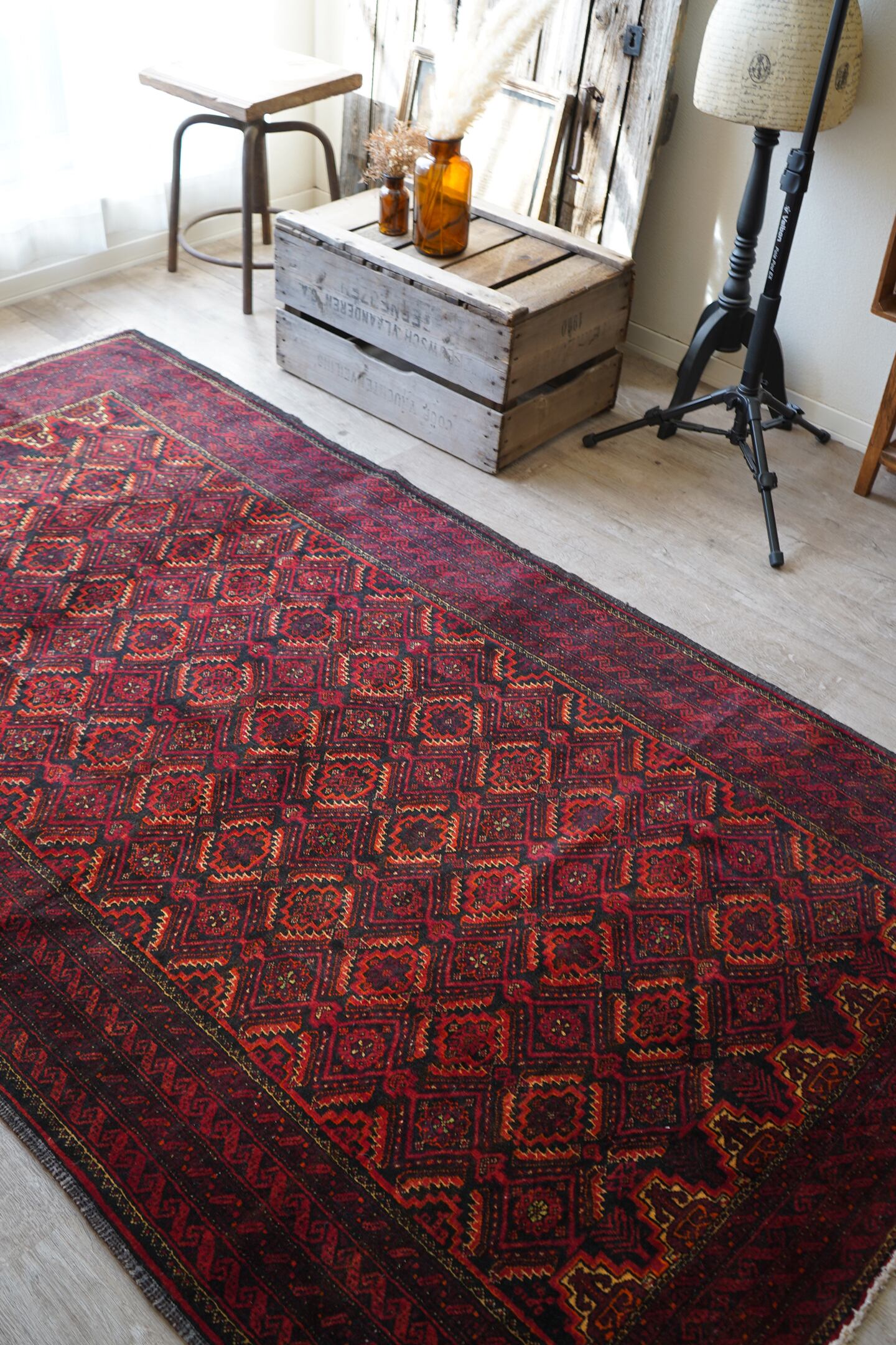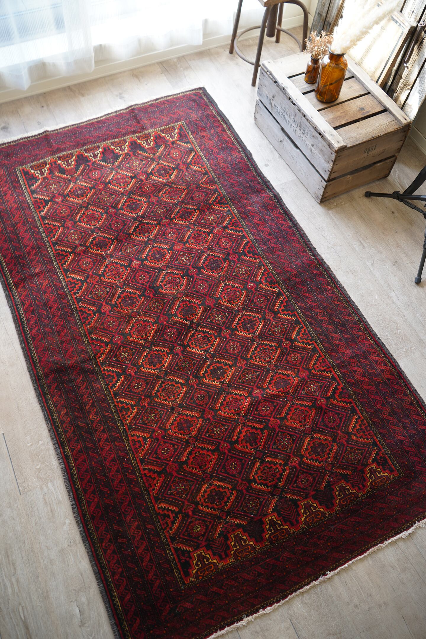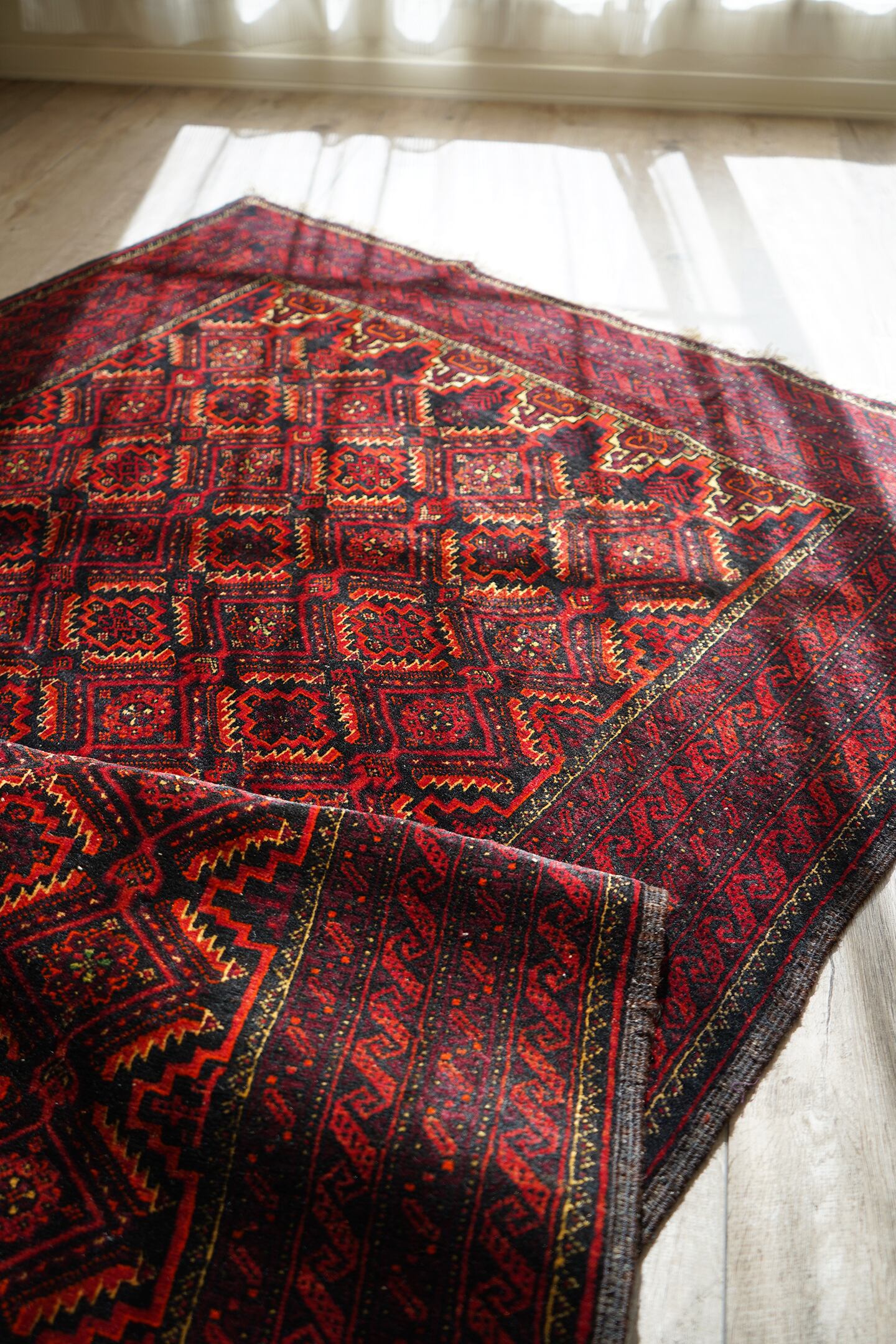 経年約60年ほどのイラン産バルーチラグ。光沢感あふれる艶がラグ全体に見える大変美しい一枚です。赤と黒をベースカラーにしたシックな配色に、綺麗な配列で統一された紋様がお家のインテリアにも取り入れやすいデザインでオススメです。引きのお写真では赤寄りの色味のラグに見えますが、肉眼では黒が強めで見える印象がございます。コンディションとしては目立った補修跡などなく状態良好ですが、一部フリンジの長さが短くなっている箇所があります(お写真最後をご参照ください)。表面の毛並みはサラッと滑らかで気持ちの良い肌触り、厚みは5mm程になります。ラグの艶がお好きな方、いかがでしょうか?