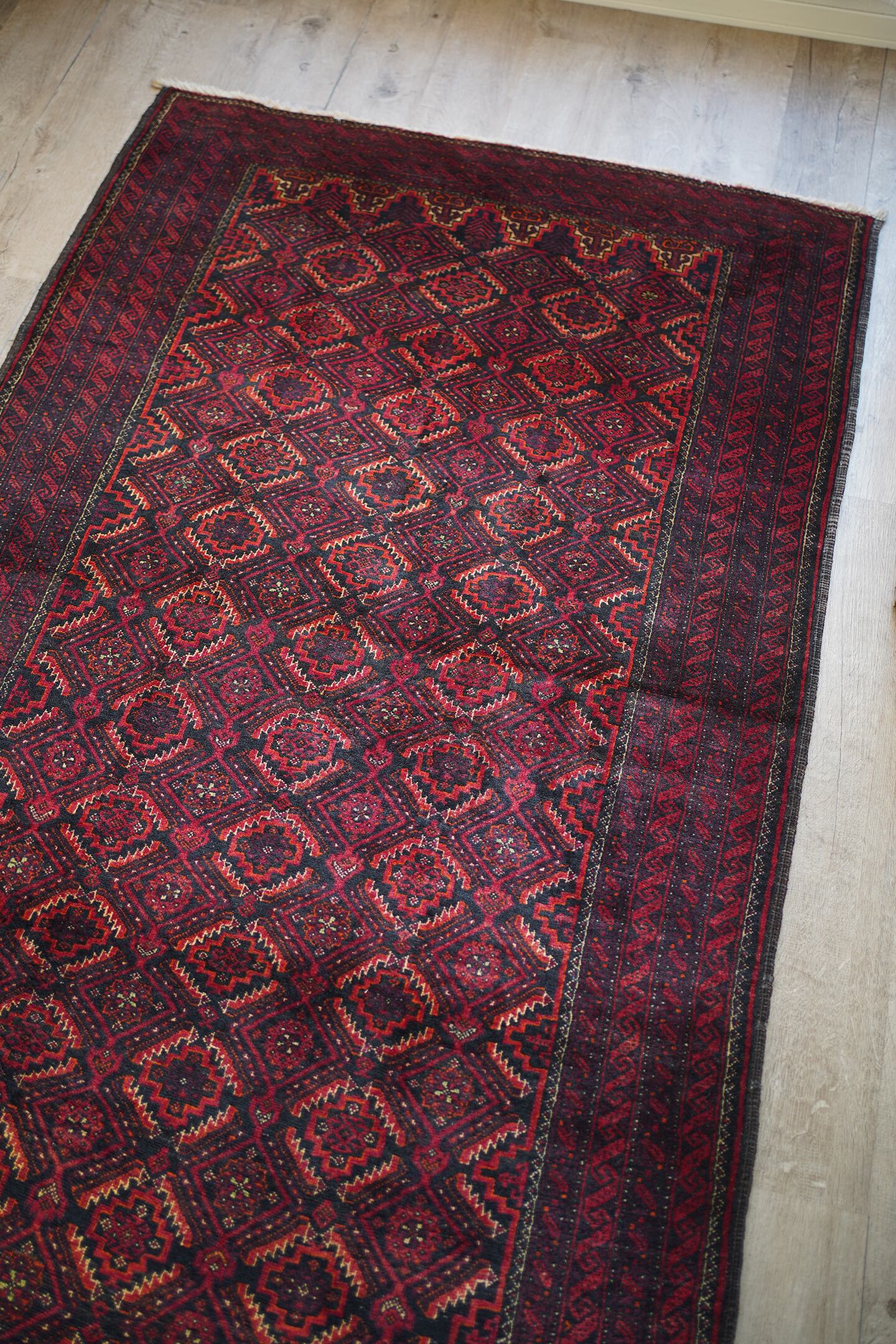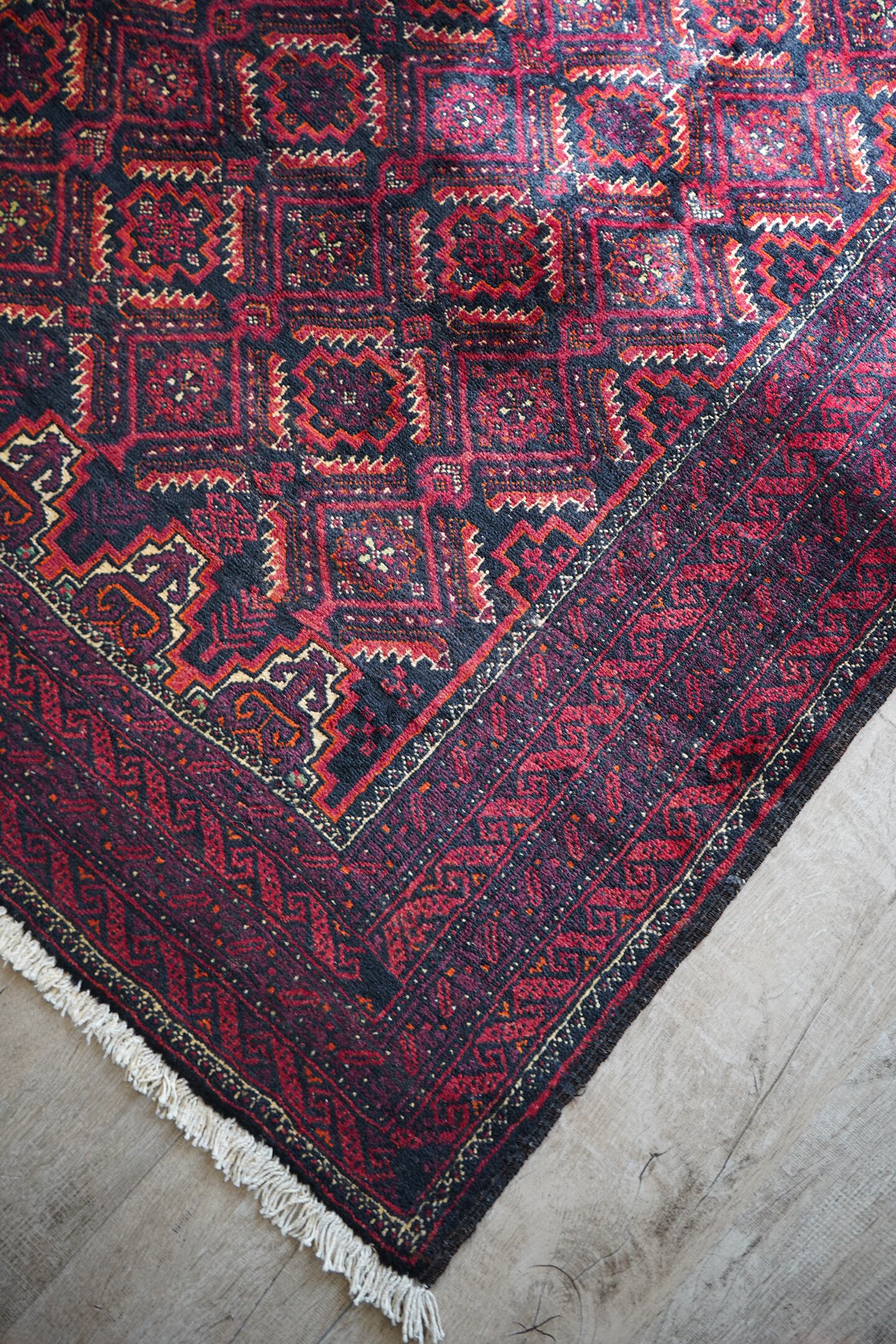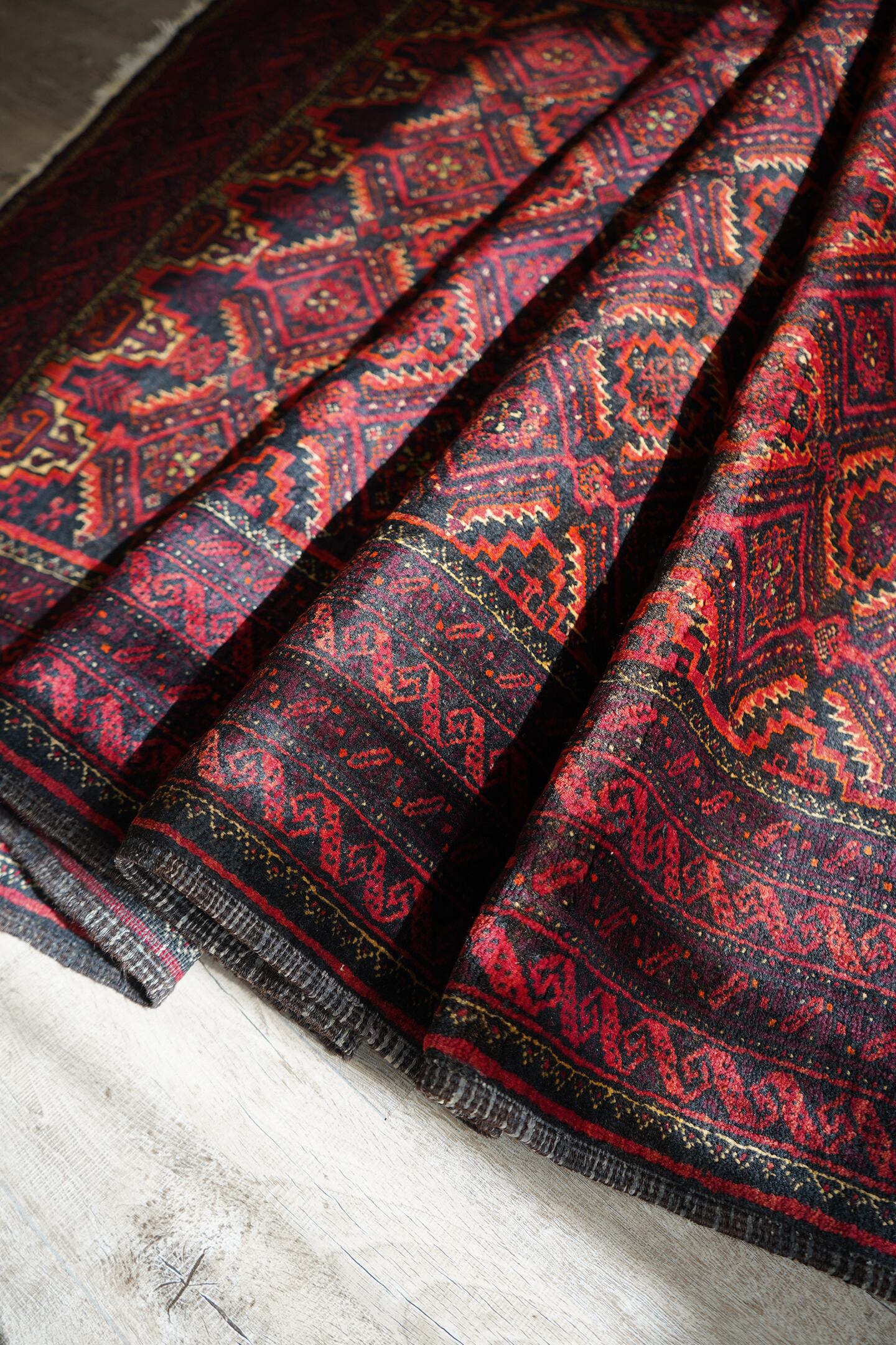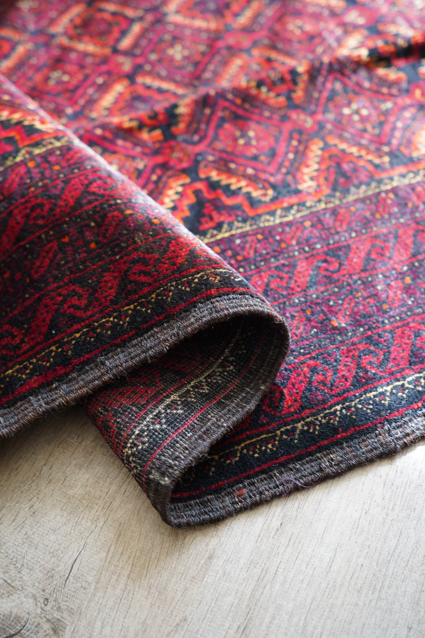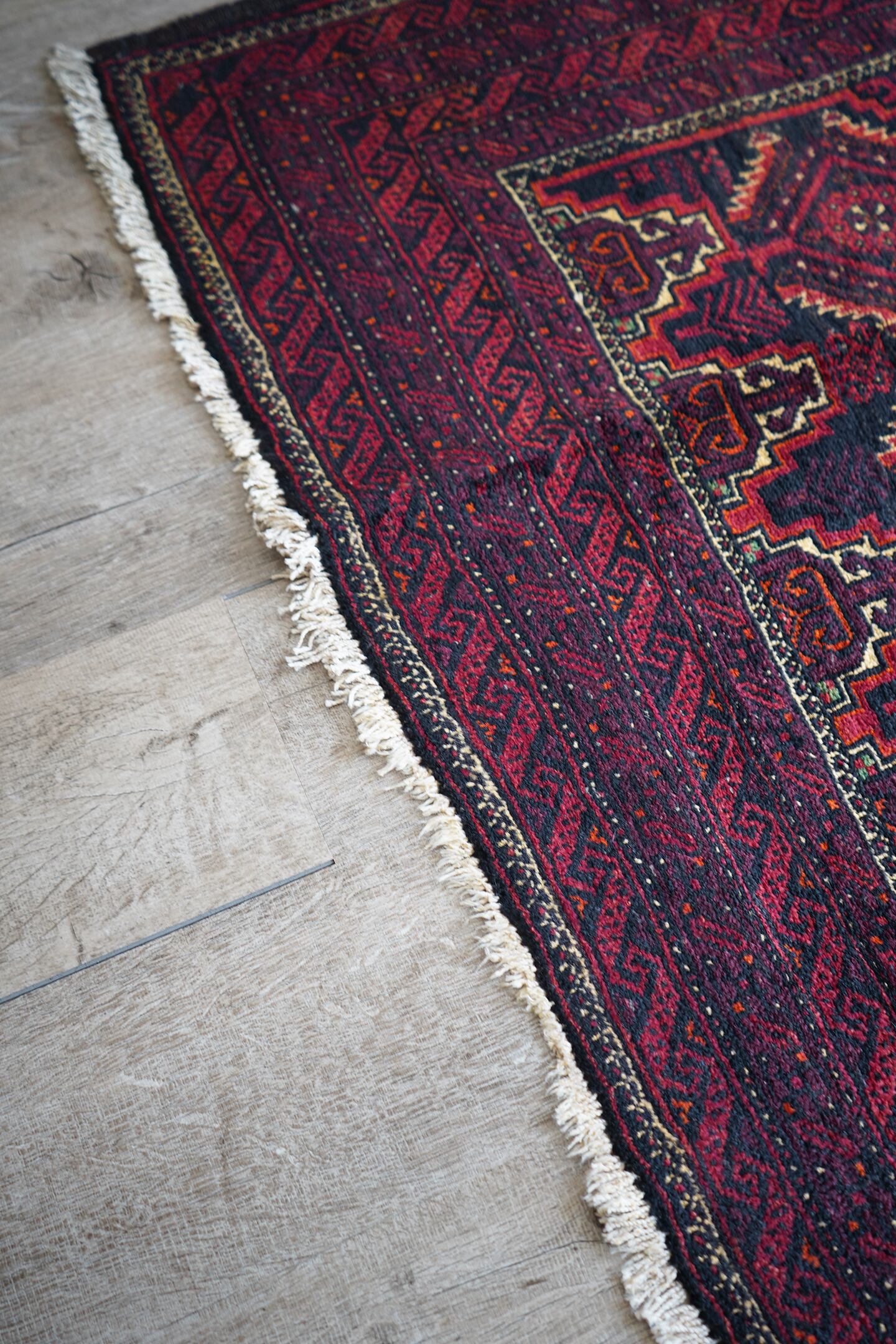 経年約60年ほどのイラン産バルーチラグ。光沢感あふれる艶がラグ全体に見える大変美しい一枚です。赤と黒をベースカラーにしたシックな配色に、綺麗な配列で統一された紋様がお家のインテリアにも取り入れやすいデザインでオススメです。引きのお写真では赤寄りの色味のラグに見えますが、肉眼では黒が強めで見える印象がございます。コンディションとしては目立った補修跡などなく状態良好ですが、一部フリンジの長さが短くなっている箇所があります(お写真最後をご参照ください)。表面の毛並みはサラッと滑らかで気持ちの良い肌触り、厚みは5mm程になります。ラグの艶がお好きな方、いかがでしょうか?