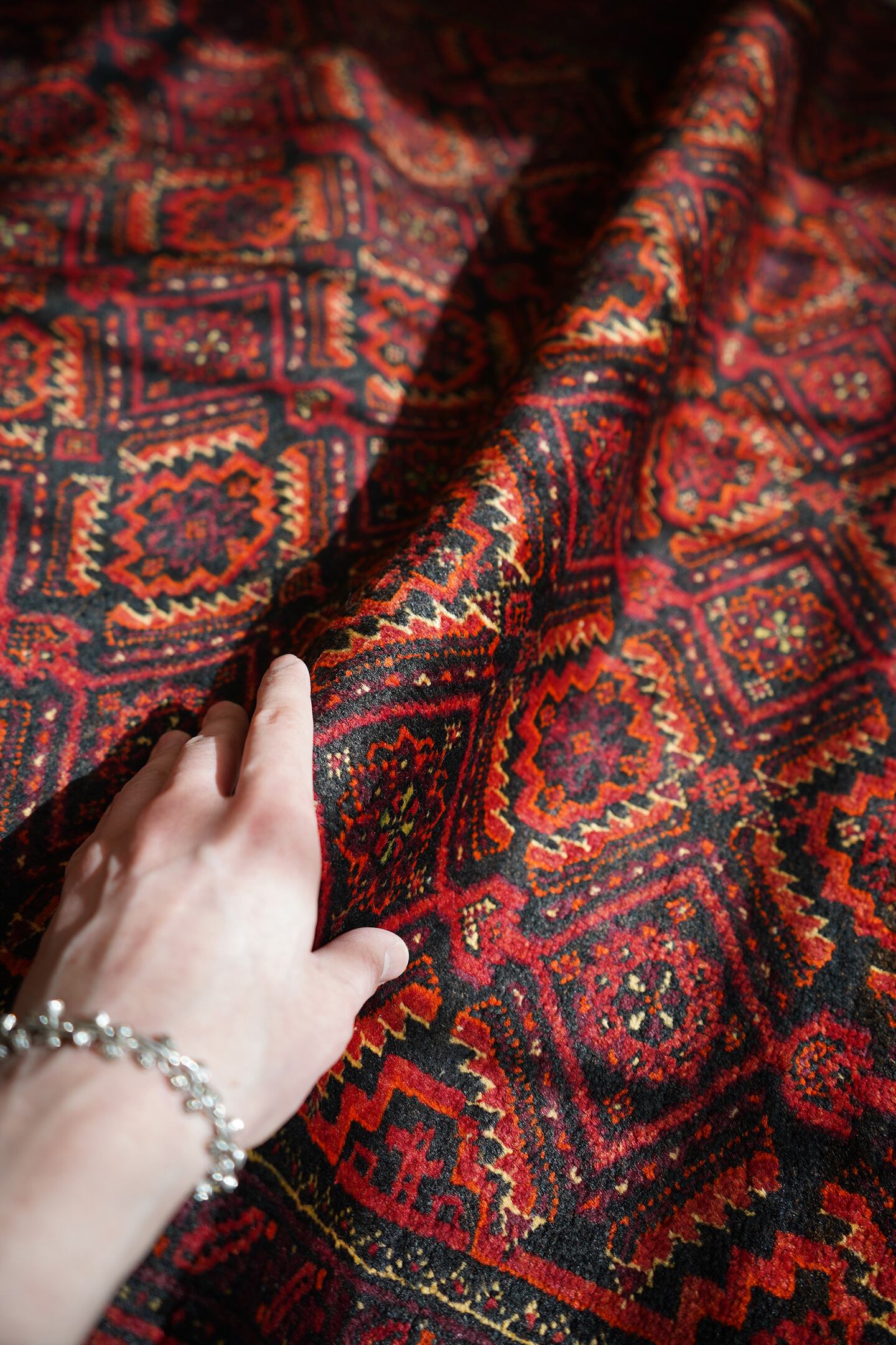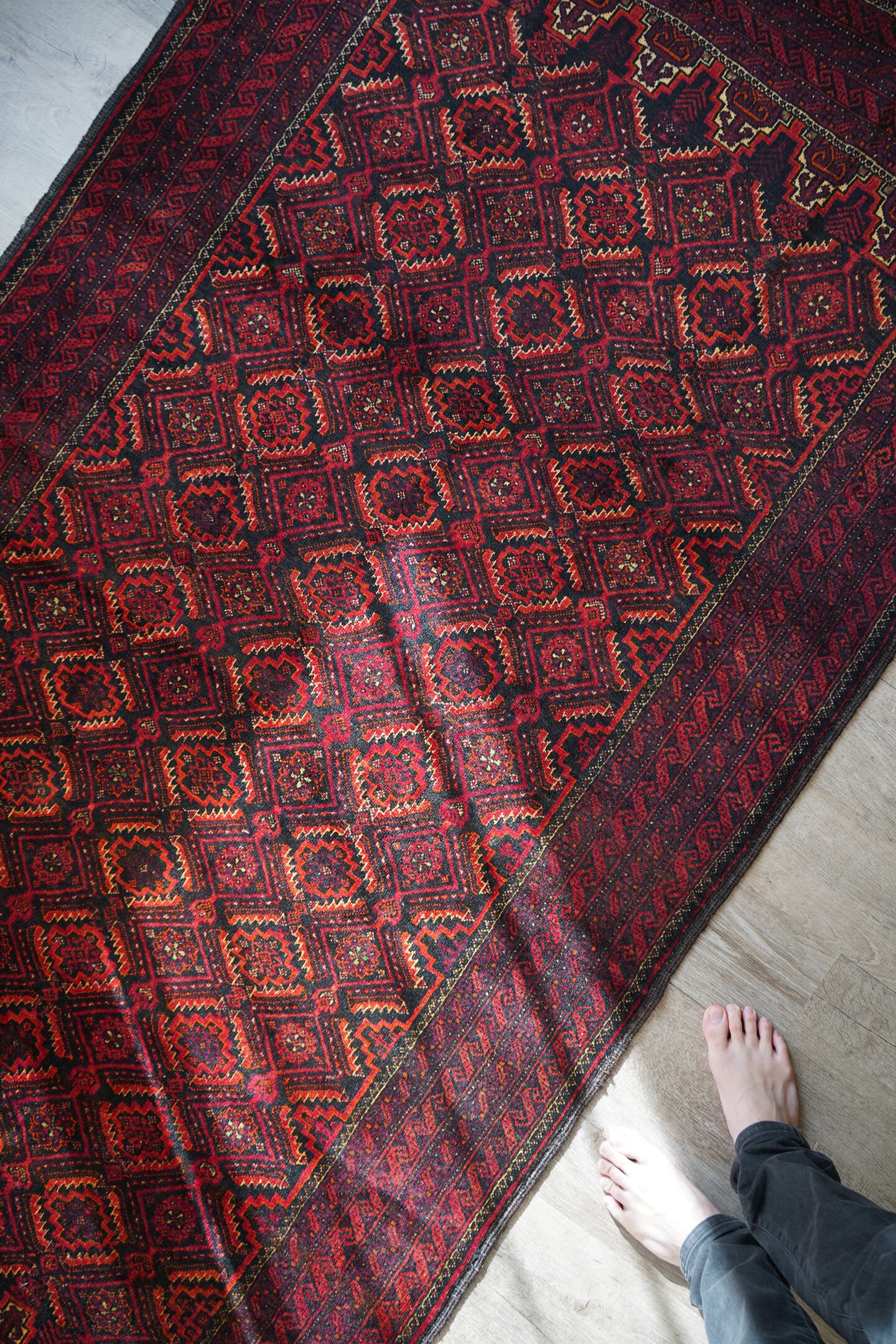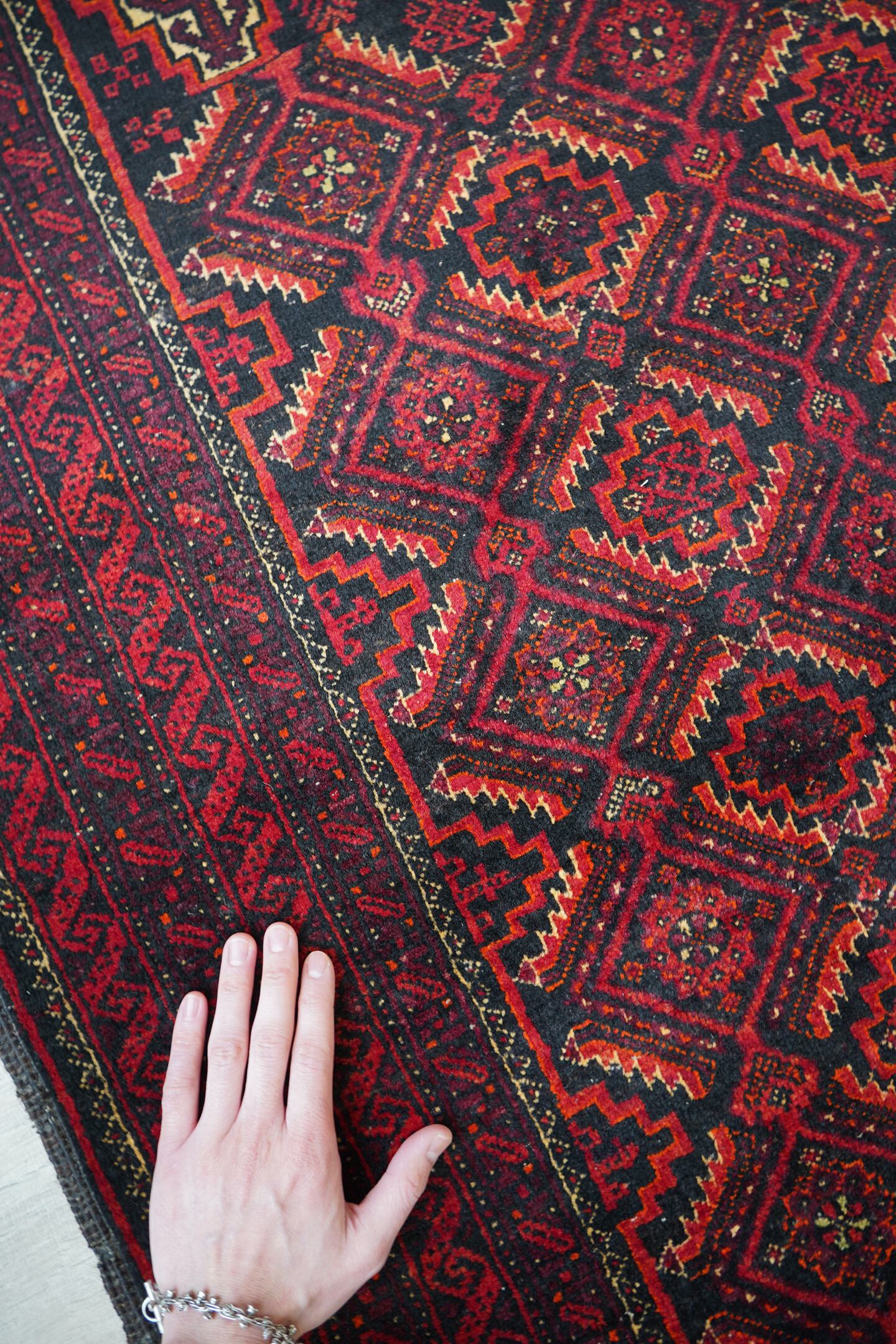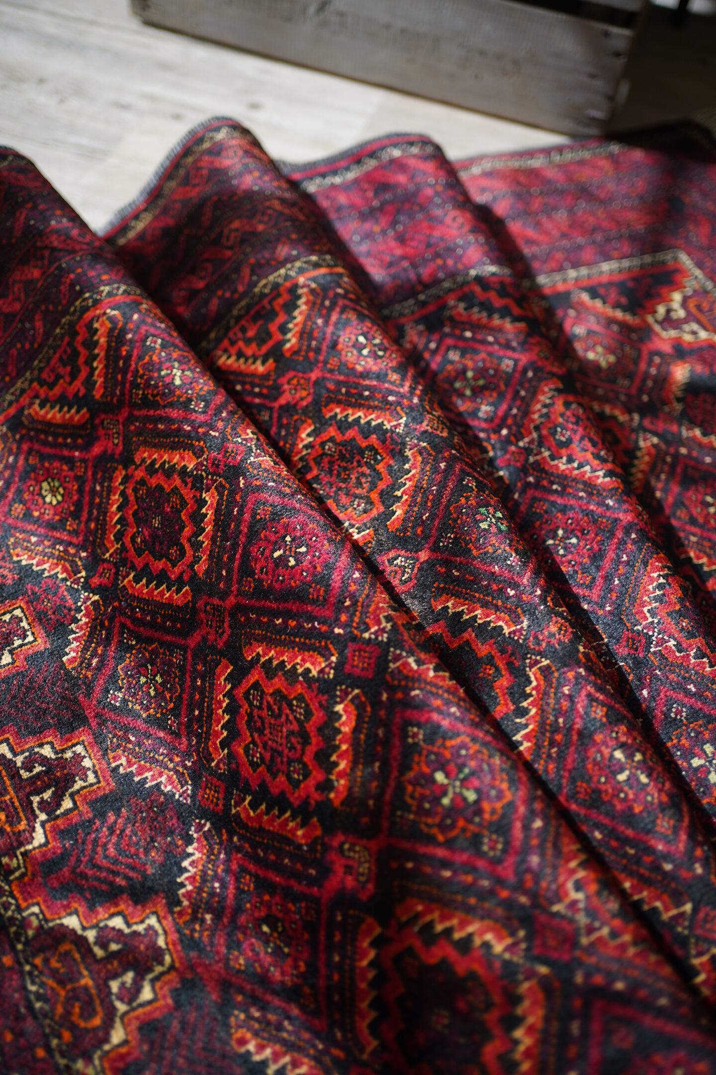 経年約60年ほどのイラン産バルーチラグ。光沢感あふれる艶がラグ全体に見える大変美しい一枚です。赤と黒をベースカラーにしたシックな配色に、綺麗な配列で統一された紋様がお家のインテリアにも取り入れやすいデザインでオススメです。引きのお写真では赤寄りの色味のラグに見えますが、肉眼では黒が強めで見える印象がございます。コンディションとしては目立った補修跡などなく状態良好ですが、一部フリンジの長さが短くなっている箇所があります(お写真最後をご参照ください)。表面の毛並みはサラッと滑らかで気持ちの良い肌触り、厚みは5mm程になります。ラグの艶がお好きな方、いかがでしょうか?