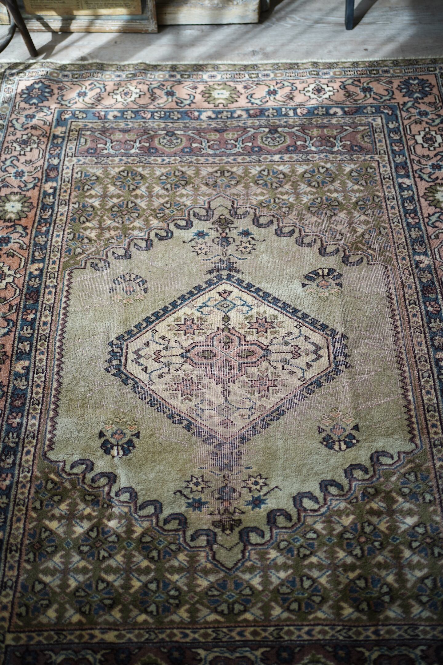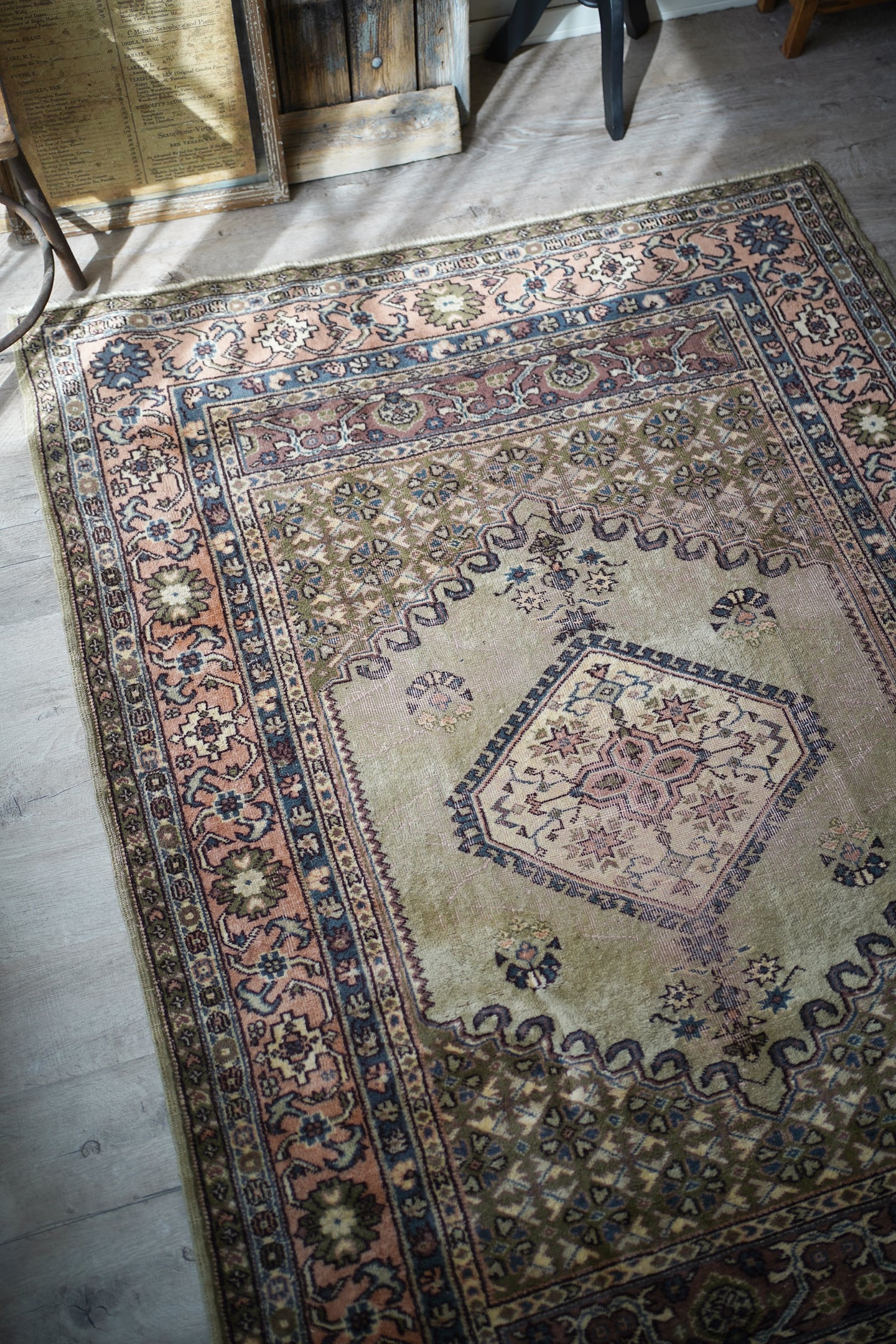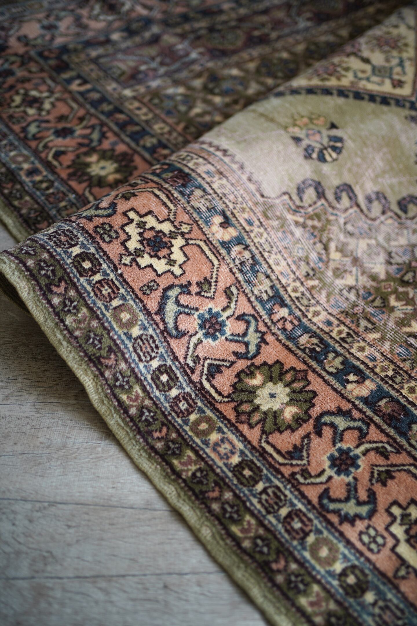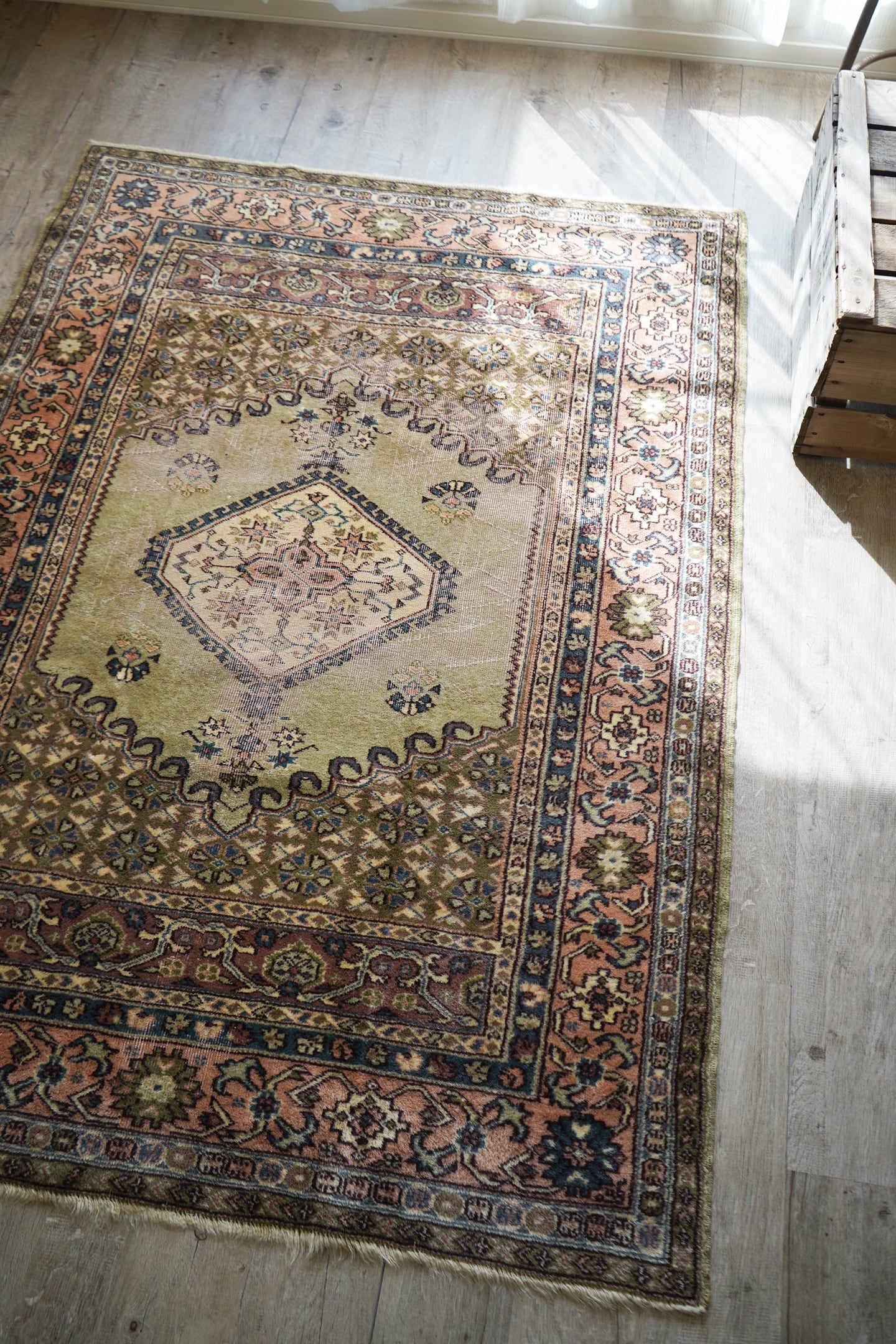 経年約80年ほどのトルコ産のセミアンティークラグ。ウグイス色をベースにサーモンピンク、濃いブルーグリーン、薄いブラウンの珍しい配色です。表面のパイルは中央のメダリオン付近は薄くなっておりサラサラとした質感、ボーダー部分は程よく残っておりフワさらっとした質感となります。厚みとしては6mm程度です。中央のメダリオン辺りに擦れと補修跡が数カ所ございます(お写真最後の2枚をご参照ください)。擦れ感や補修跡含めてアンティークの風合いがお好きな方にオススメな一枚。落ち着いた色味なので様々な家具とも相性がよく、自然と馴染んでくれそうです♪