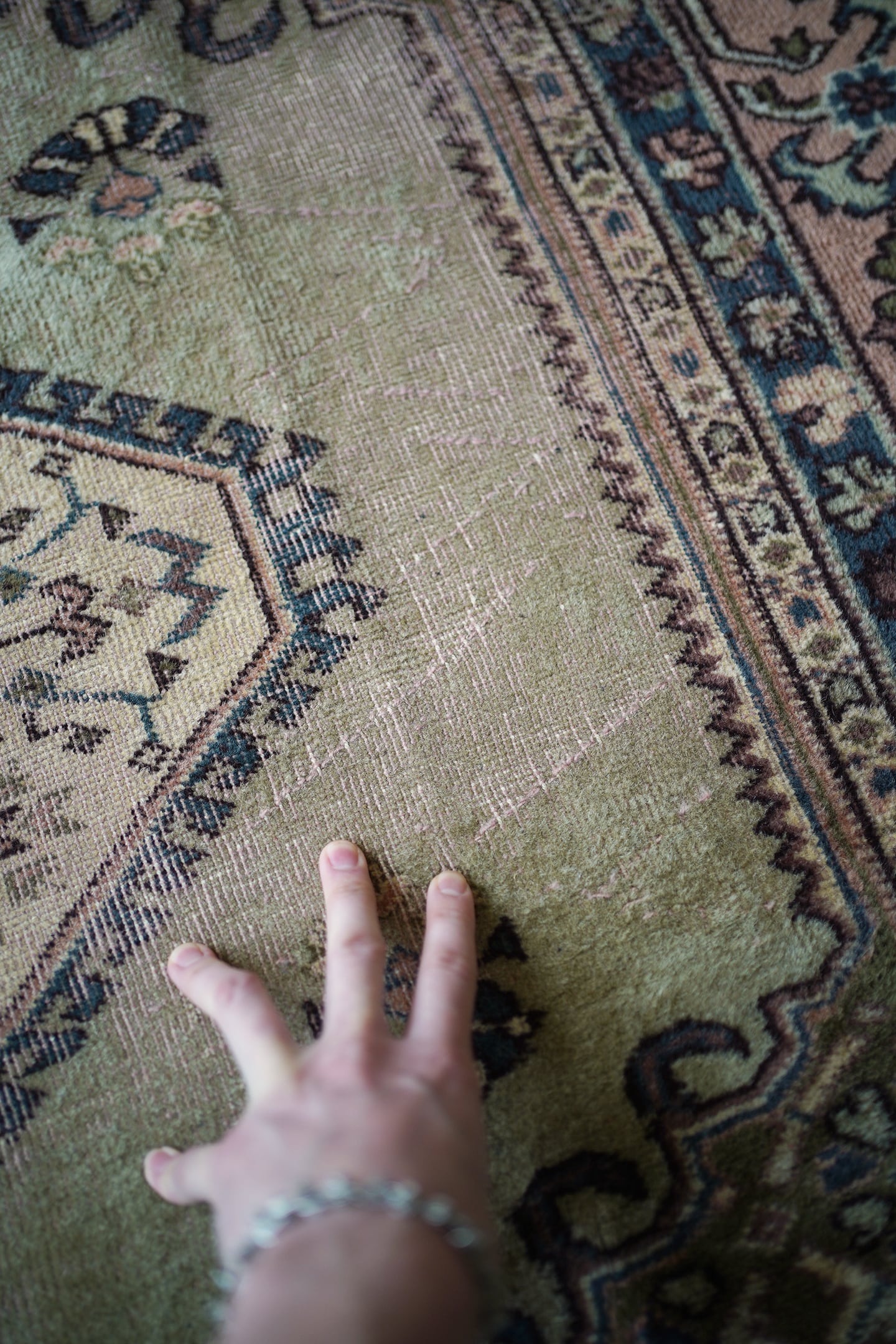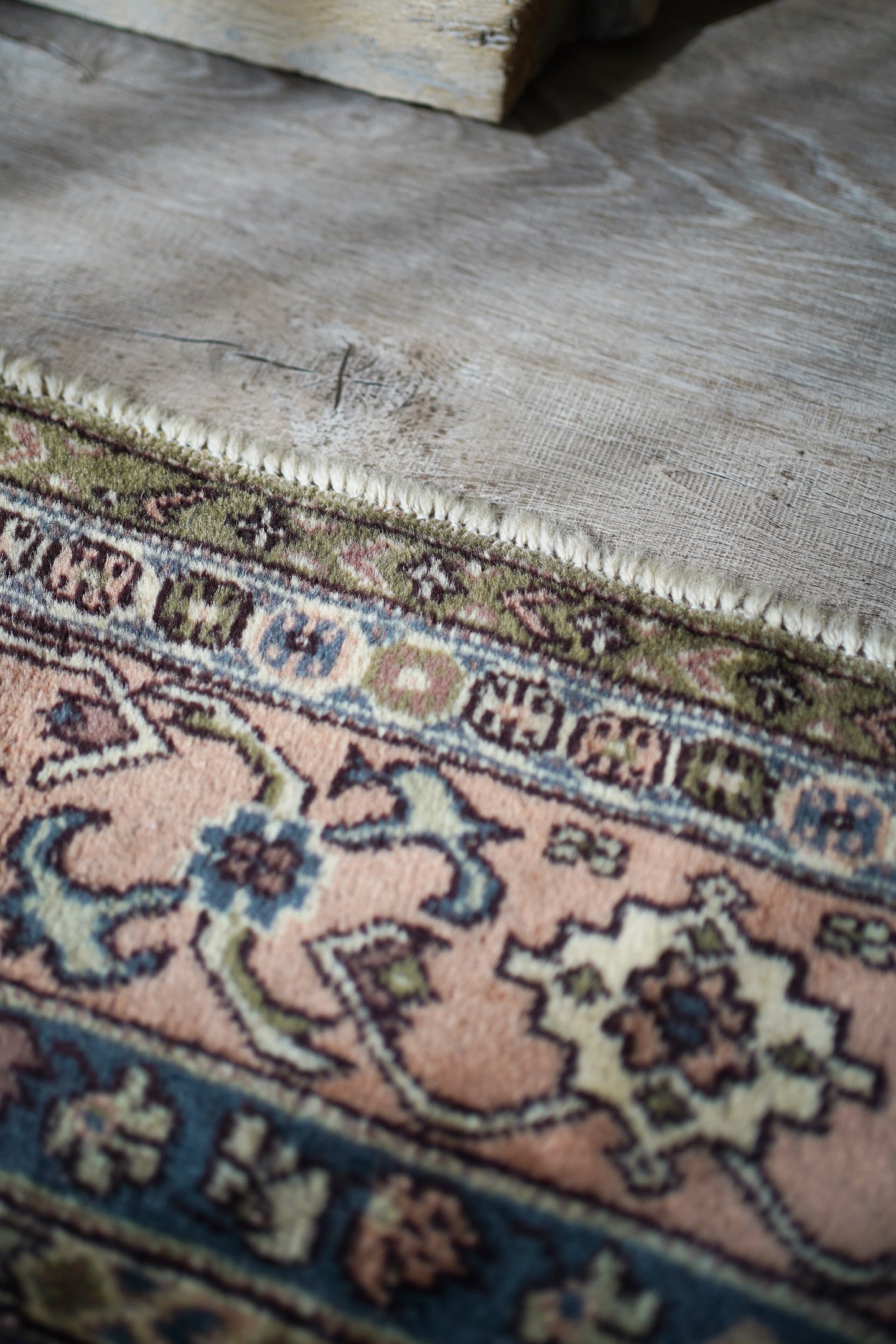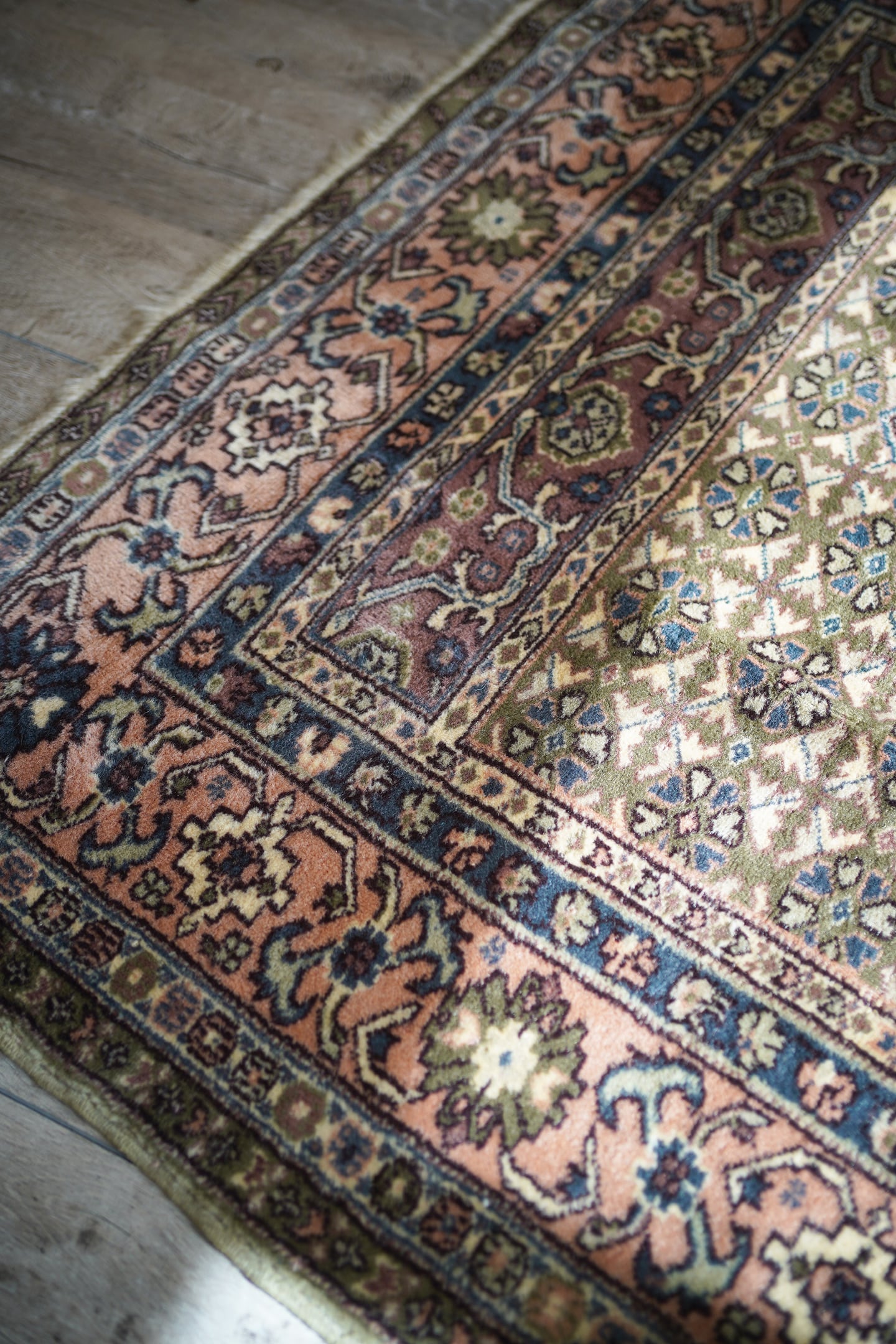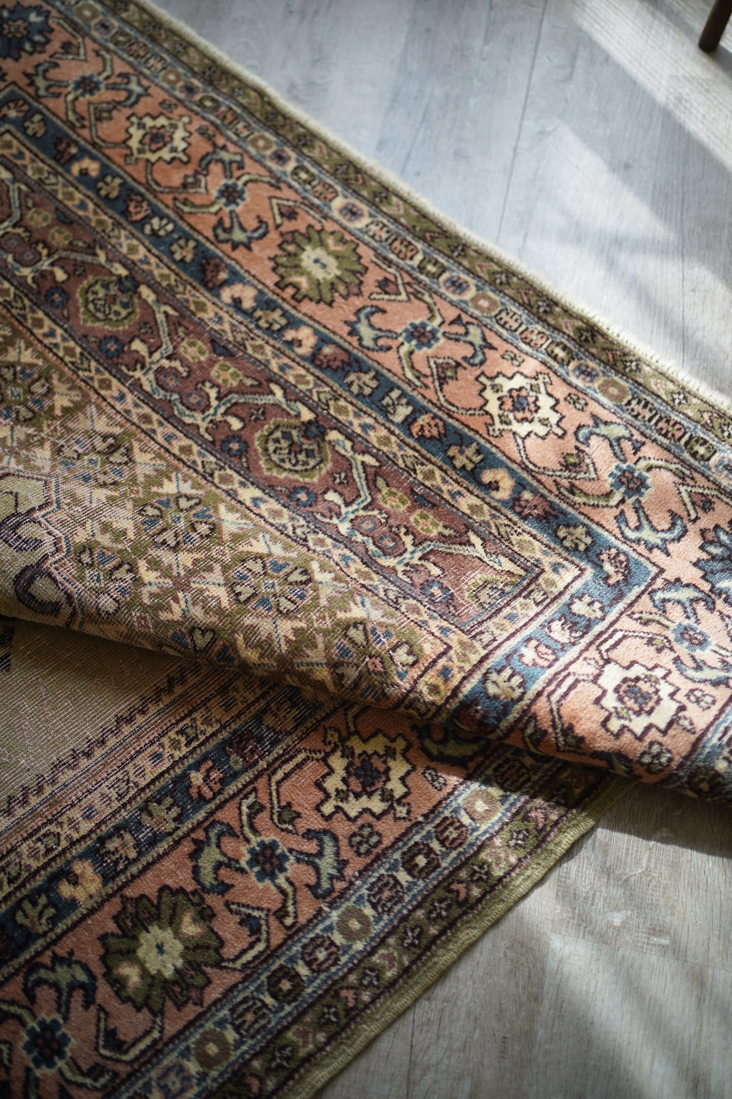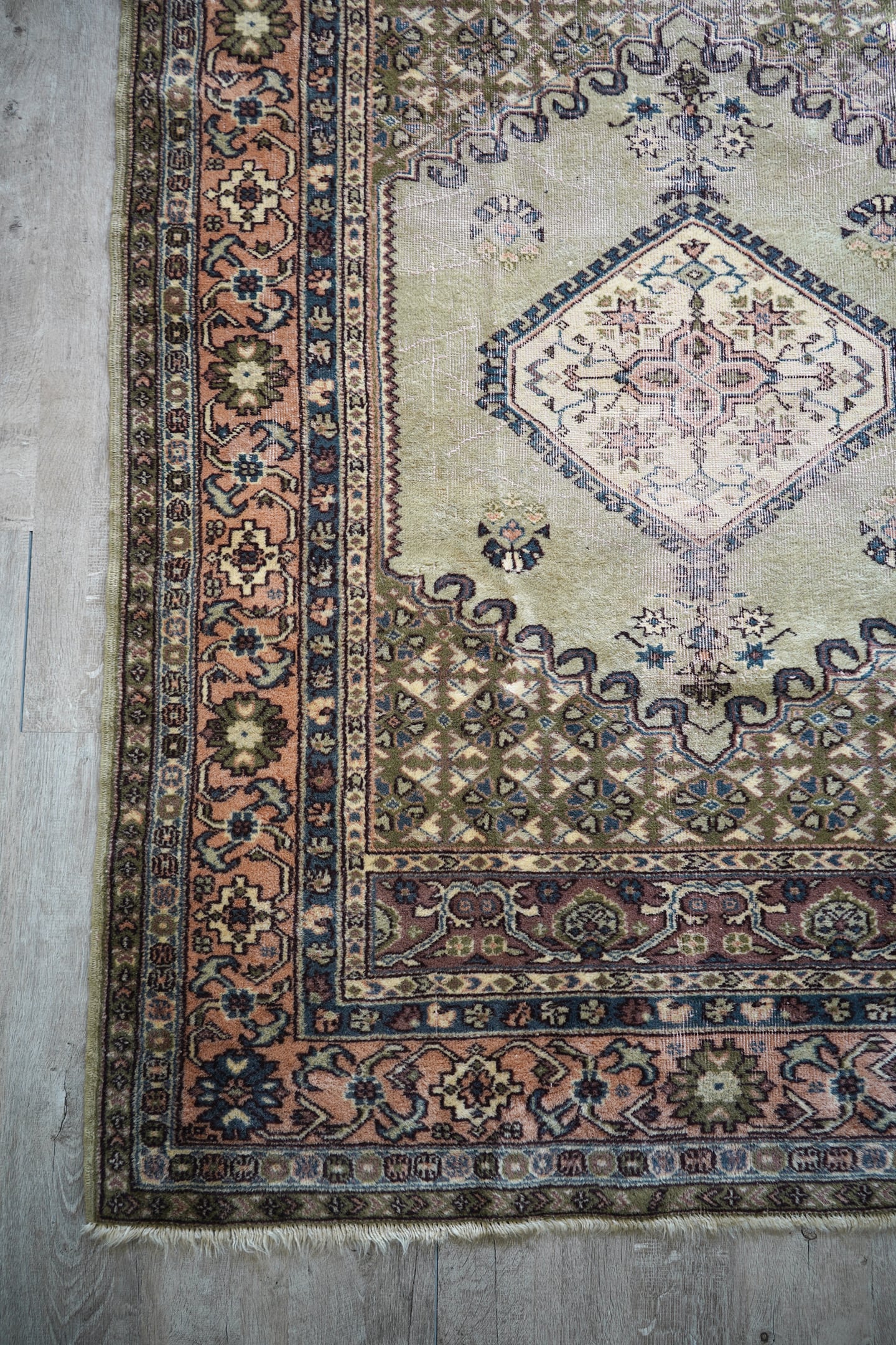 経年約80年ほどのトルコ産のセミアンティークラグ。ウグイス色をベースにサーモンピンク、濃いブルーグリーン、薄いブラウンの珍しい配色です。表面のパイルは中央のメダリオン付近は薄くなっておりサラサラとした質感、ボーダー部分は程よく残っておりフワさらっとした質感となります。厚みとしては6mm程度です。中央のメダリオン辺りに擦れと補修跡が数カ所ございます(お写真最後の2枚をご参照ください)。擦れ感や補修跡含めてアンティークの風合いがお好きな方にオススメな一枚。落ち着いた色味なので様々な家具とも相性がよく、自然と馴染んでくれそうです♪