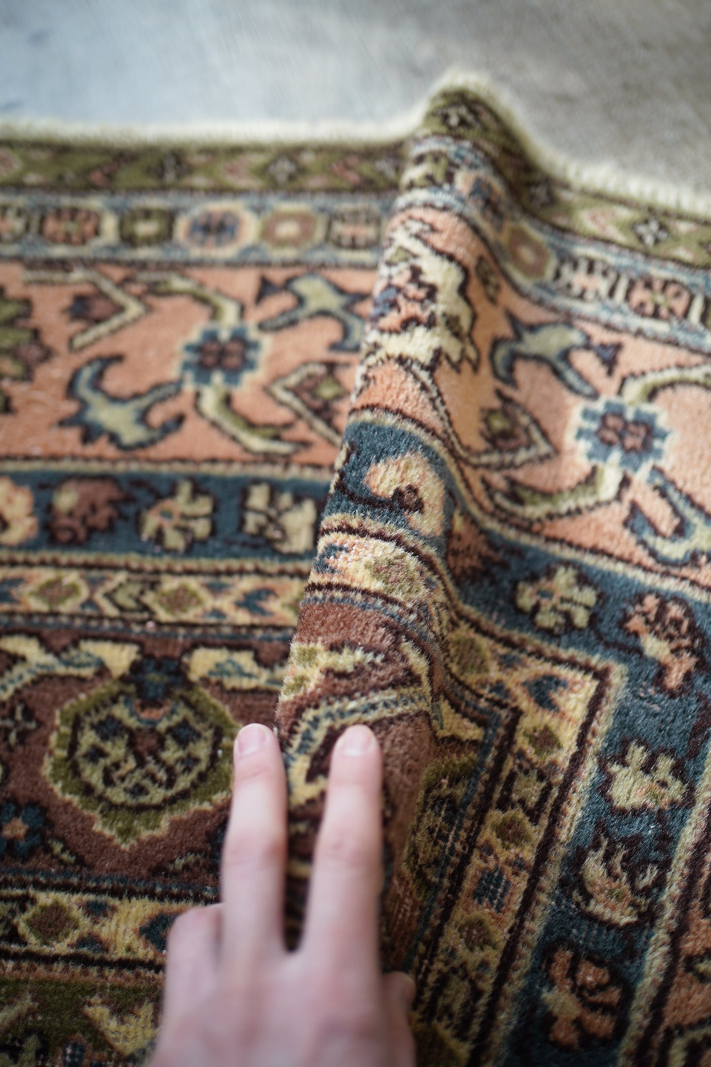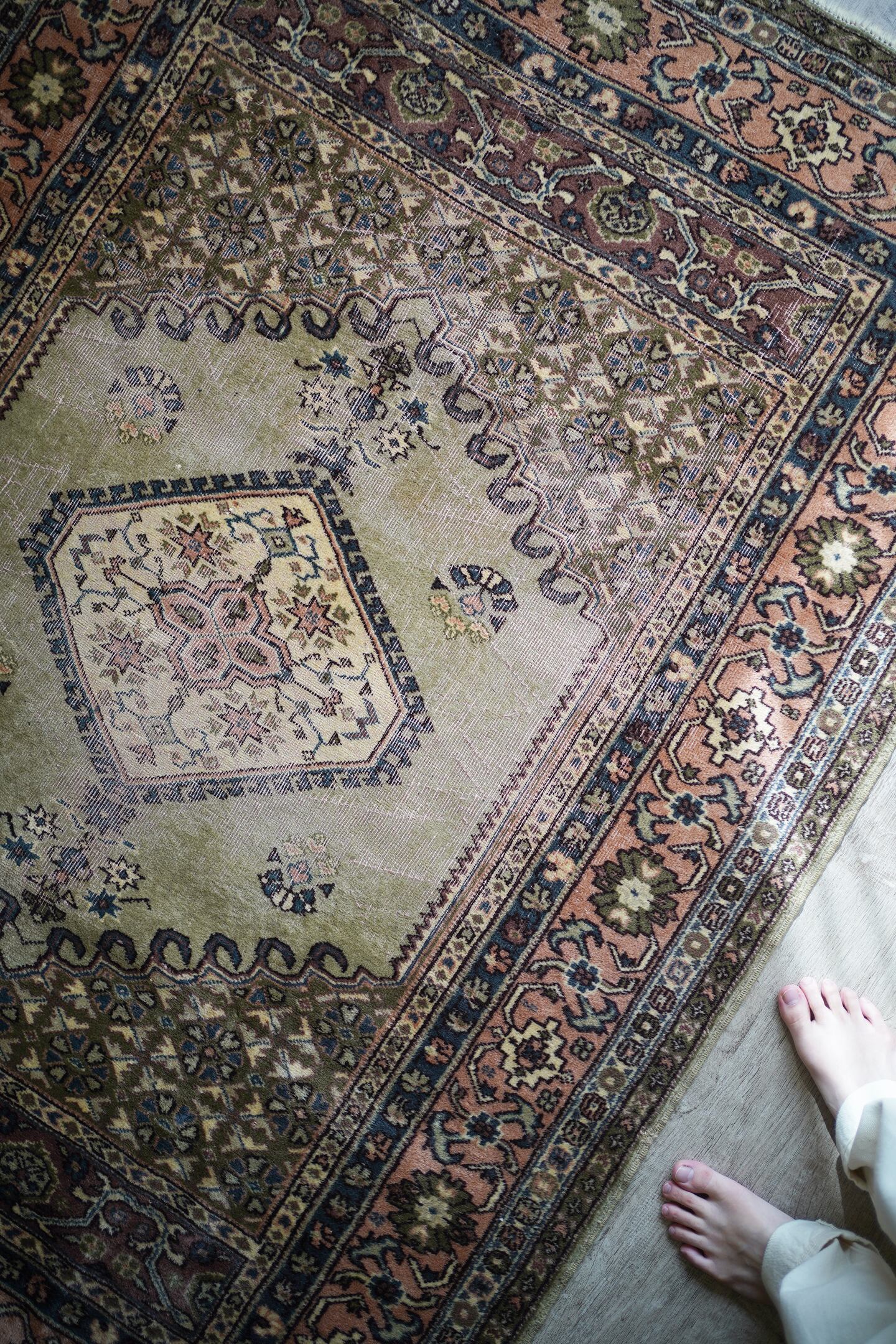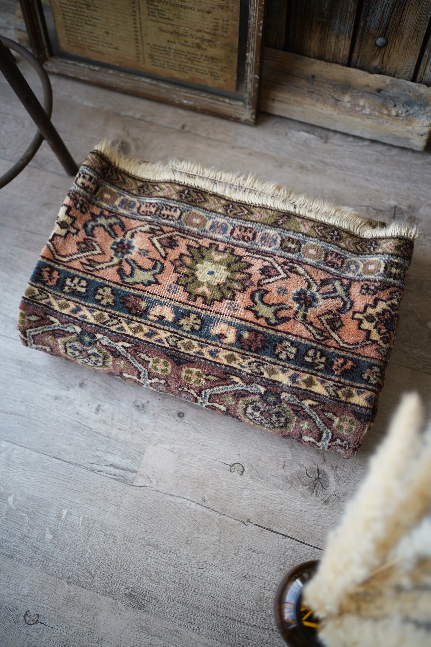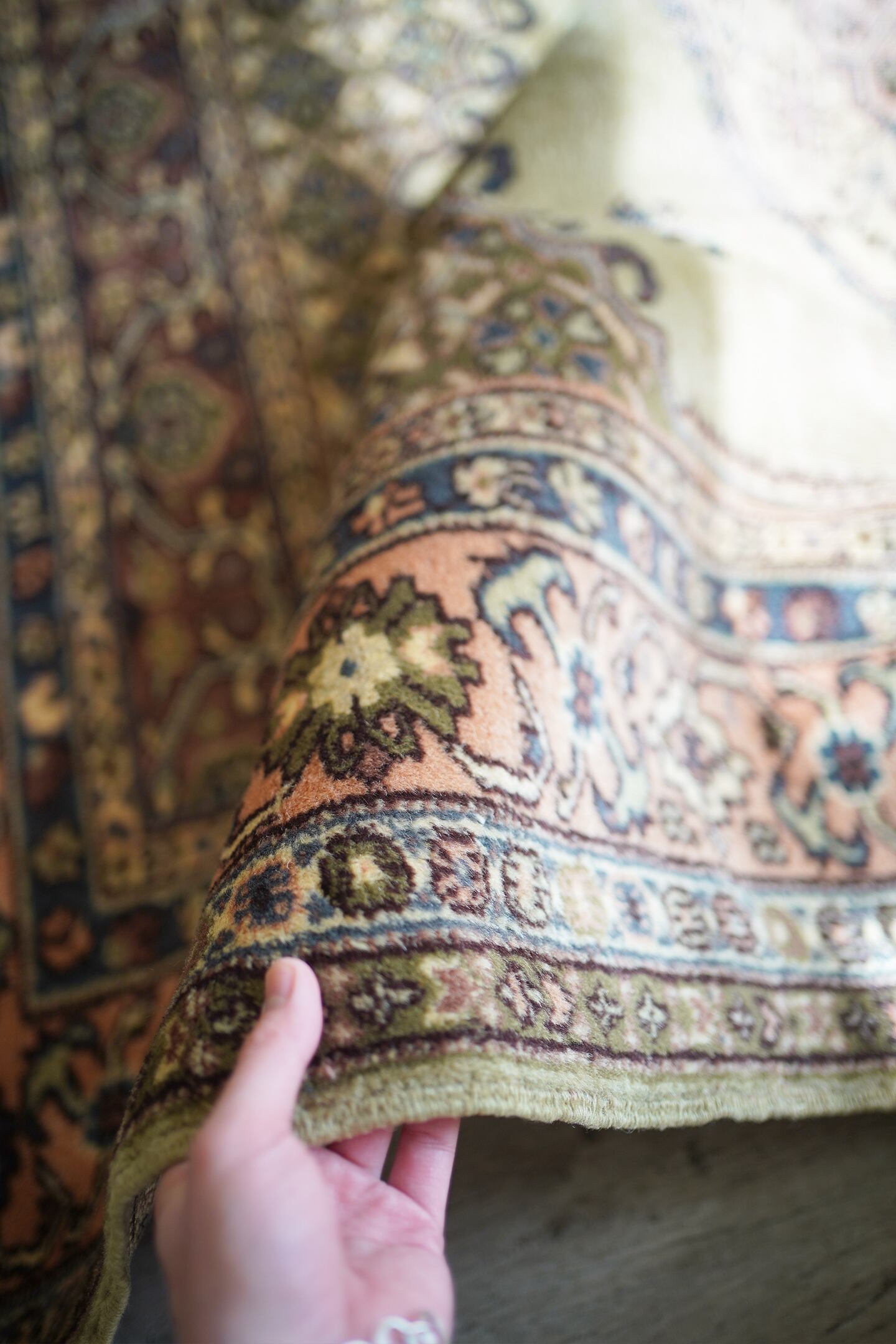 経年約80年ほどのトルコ産のセミアンティークラグ。ウグイス色をベースにサーモンピンク、濃いブルーグリーン、薄いブラウンの珍しい配色です。表面のパイルは中央のメダリオン付近は薄くなっておりサラサラとした質感、ボーダー部分は程よく残っておりフワさらっとした質感となります。厚みとしては6mm程度です。中央のメダリオン辺りに擦れと補修跡が数カ所ございます(お写真最後の2枚をご参照ください)。擦れ感や補修跡含めてアンティークの風合いがお好きな方にオススメな一枚。落ち着いた色味なので様々な家具とも相性がよく、自然と馴染んでくれそうです♪