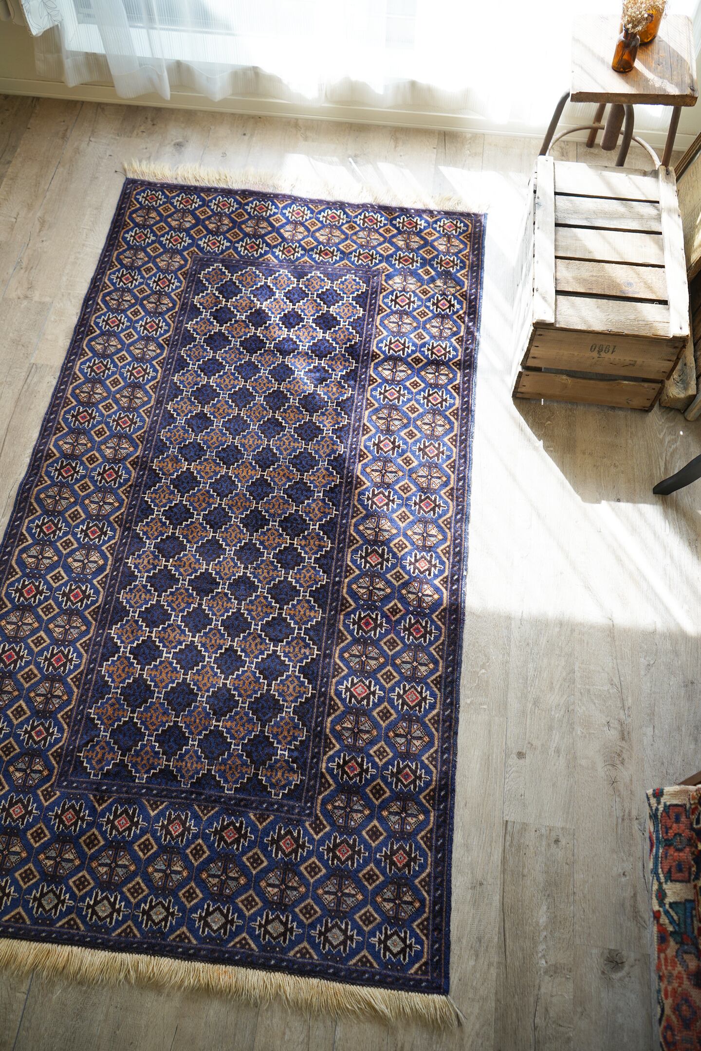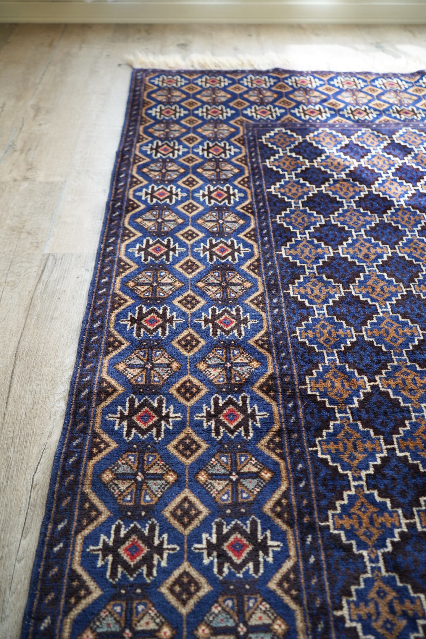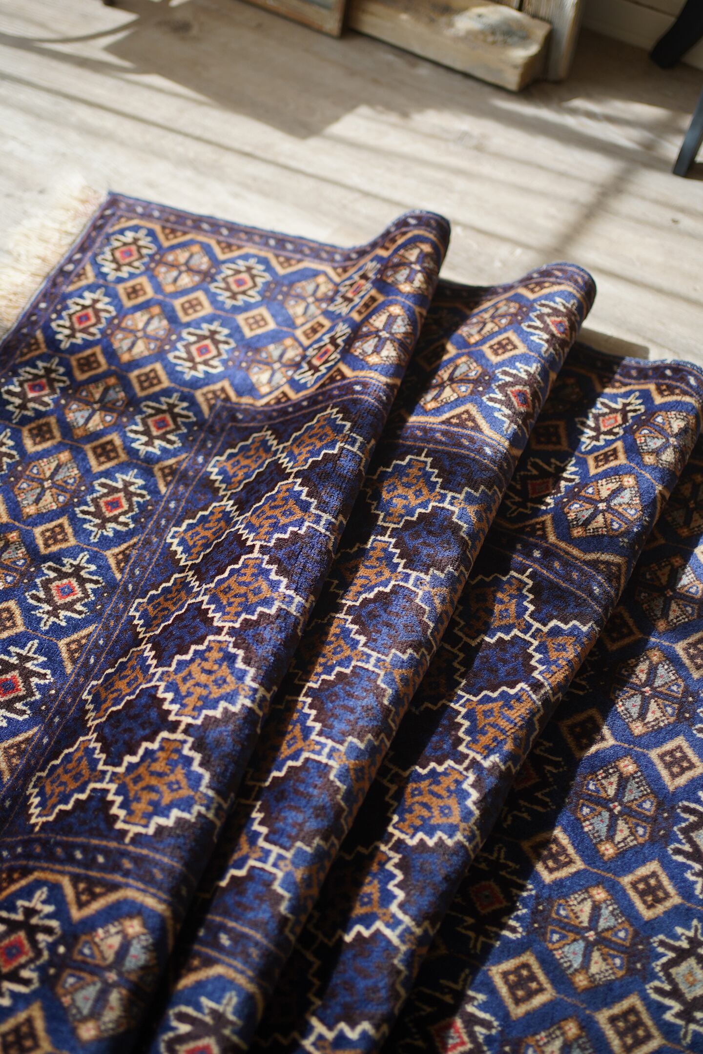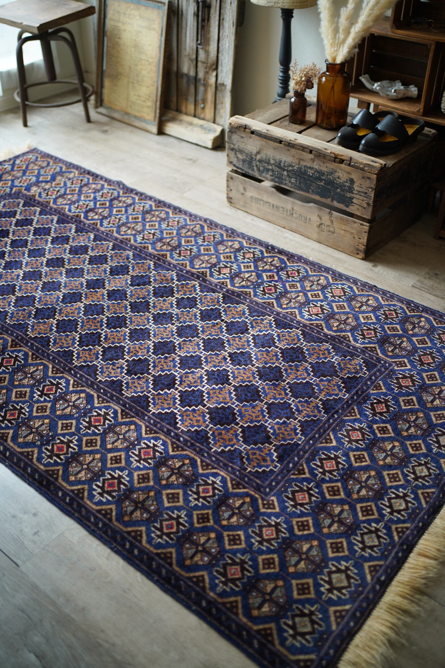 経年30年ほどのアフガニスタン産のバルーチラグ。まるでタイルのように綺麗に配列した紋様がフィールドとボーターに織り込まれた美しい一枚。ネイビー、ブルー、ブラウンの配色に差し色で細かく赤色が使用されています。パイルに光が差し込むと艶感が際立ち大変美しいです。全体的に状態と仕立てが良く、パイルの長さの均一感含めて上質感があります。コンディションとしては片方のフリンジと1箇所、色移りしているところがございますが、その他は補修跡などなく大変良好です(お写真最後の2枚をご参照ください)。サラふわっとした滑らかな肌触りで、厚みは7mm程度。リビングをはじめ、ベッドサイドやお気に入りの場所に♫