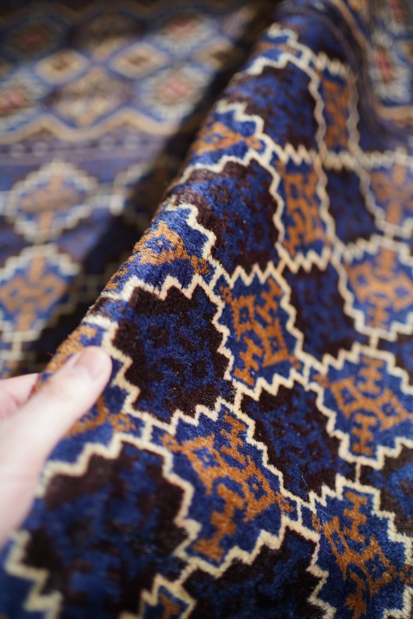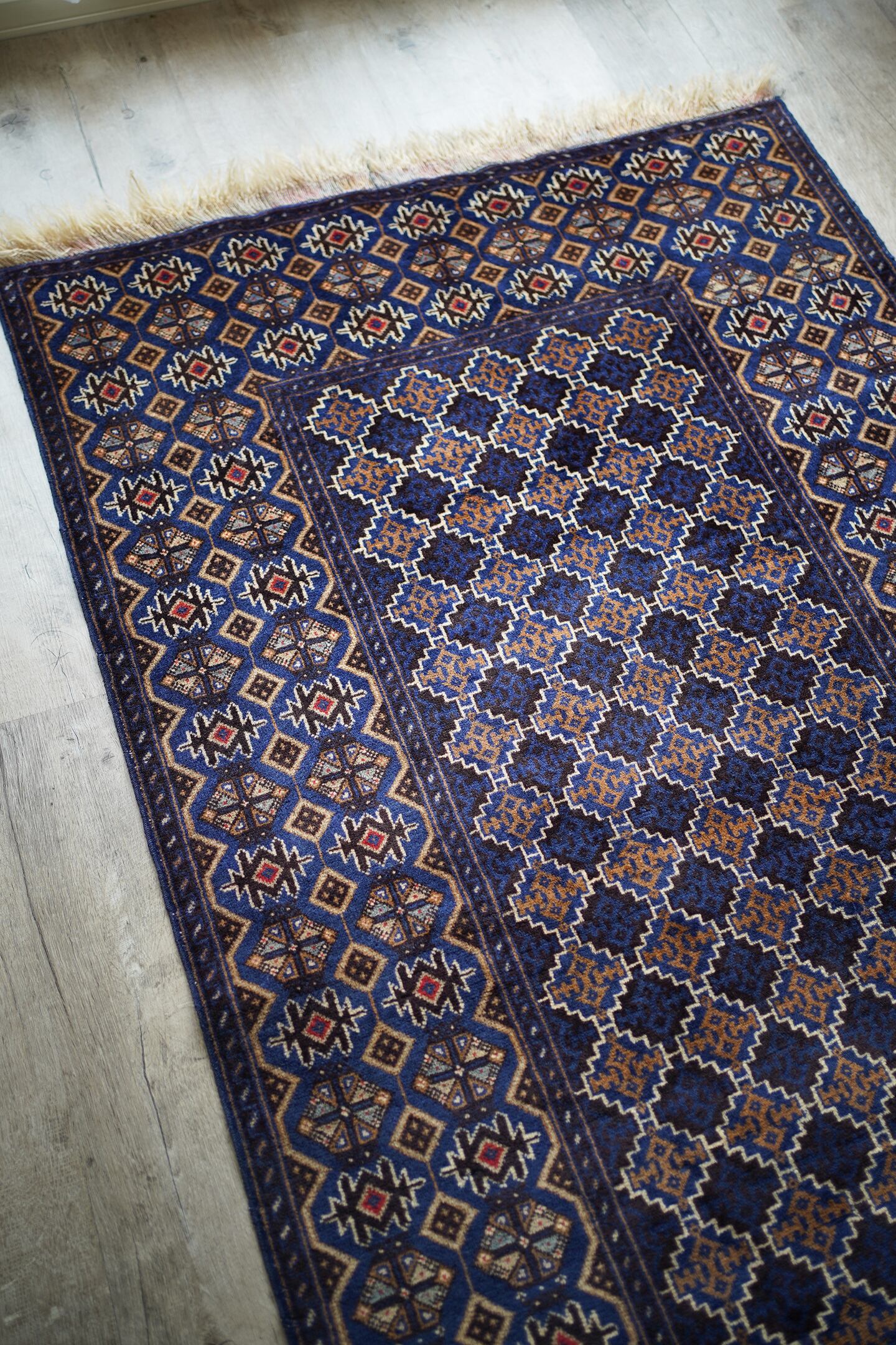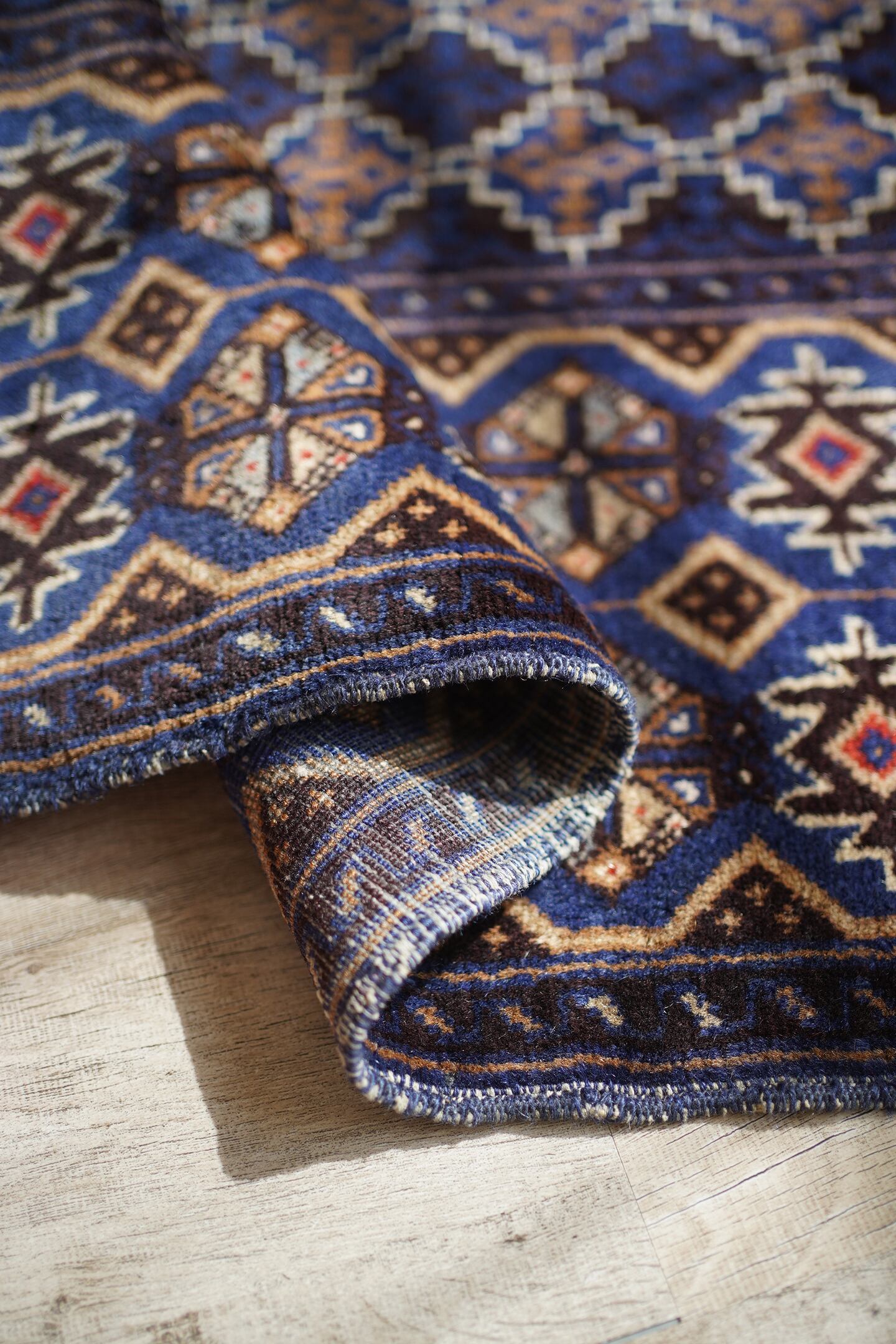 経年30年ほどのアフガニスタン産のバルーチラグ。まるでタイルのように綺麗に配列した紋様がフィールドとボーターに織り込まれた美しい一枚。ネイビー、ブルー、ブラウンの配色に差し色で細かく赤色が使用されています。パイルに光が差し込むと艶感が際立ち大変美しいです。全体的に状態と仕立てが良く、パイルの長さの均一感含めて上質感があります。コンディションとしては片方のフリンジと1箇所、色移りしているところがございますが、その他は補修跡などなく大変良好です(お写真最後の2枚をご参照ください)。サラふわっとした滑らかな肌触りで、厚みは7mm程度。リビングをはじめ、ベッドサイドやお気に入りの場所に♫